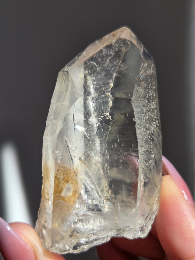 スターブラリークォーツ ブラジル ミナスジェライス州産 スターブラリークォーツ(スターシード)は、柱面に「グリフ」と呼ばれる特殊な幾何学模様や条線を持つ水晶で、まるで流れ星の痕ような刻印を持つ希少な水晶です。 宇宙の記憶や叡智を宿す「星の図書館」とされ、レムリアンシードよりもさらに高次の情報を持つパワーストーンとして人気があります。 レムリアンシードが太古の人々の記憶を宿すのに対して、スターブラリークォーツはそれ以前の宇宙からやってきたソウル(魂)の記憶を宿しているといわれています。 宇宙の英知や過去生の情報を宿すとされ、スターブラリーは表面の干渉は辞書のように記号化されているとされています。 それらの記号が脳に強く刺激するといわれています。 宇宙的な知性を知りたい、自己の魂の起源を知りたい人にとって、【星のデータベース】のような石として認知されています。 スターブラリークォーツは、宇宙レベルの情報を持ち、精神的な成長、直感力向上、潜在意識の活性化、過去生のアクセスをサポートするといわれています。 size59.2mm×30.8mm×21.3mm