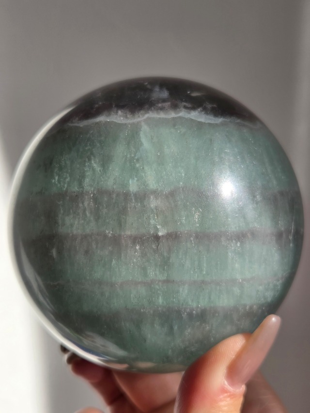 フローライト×デンドリ×マイカスフィア マイカの煌めきや、グリーンフローライトの層も美しいです。所々入り込んだデンドリも可愛いらしいビックサイズの迫力あるスフィアです。 フローライトはトルマリンに次いで豊富なカラーバリエーションを持ち、緑色や紫色を中心に様々な色合いのグラデーションを楽しめる天然石です。 「天才の石」とも呼ばれ、明晰な思考力を引き出し記憶力、集中力を高めるとされています。 また、抑圧された感情を解放し、心身を癒すヒーリングストーンとしても効果的です。 size:88.8mm