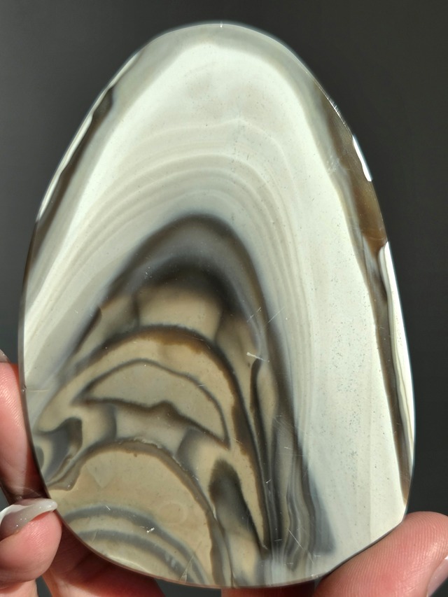 バンデッドフリントスラブ バンデッドフリント(Banded Flint)は、主にポーランドで産出する、グレージュ・ブラウン・ホワイトの美しい縞模様(バンデッド)が特徴の天然石です。別名「ストライプフリント」や「モカラインシリカ」とも呼ばれます。 「自然が描く絵画」や「風景石(ランドスケープ)」とも表現される、一つひとつ異なる縞模様が魅力です。 フリントストーンは、魔除けや厄除けに効果が期待できる石です。 悪いものから身を守ったり、悪いものを遮断したい方にはおすすめです。 フリントストーンは、持ち主の活力を強くし、行動力や実行力を高めるパワーがあるといわれています。 周りの影響から持ち主を守り、軸がぶれないようサポートしてくれるといわれています。 size90.1mm×58.3mm×6.5mm