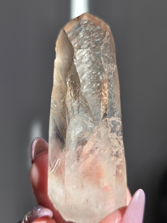 スターブラリークォーツ ブラジル ミナスジェライス州産 スターブラリークォーツ(スターシード)は、柱面に「グリフ」と呼ばれる特殊な幾何学模様や条線を持つ水晶で、まるで流れ星の痕ような刻印を持つ希少な水晶です。 宇宙の記憶や叡智を宿す「星の図書館」とされ、レムリアンシードよりもさらに高次の情報を持つパワーストーンとして人気があります。 レムリアンシードが太古の人々の記憶を宿すのに対して、スターブラリークォーツはそれ以前の宇宙からやってきたソウル(魂)の記憶を宿しているといわれています。 宇宙の英知や過去生の情報を宿すとされ、スターブラリーは表面の干渉は辞書のように記号化されているとされています。 それらの記号が脳に強く刺激するといわれています。 宇宙的な知性を知りたい、自己の魂の起源を知りたい人にとって、【星のデータベース】のような石として認知されています。 スターブラリークォーツは、宇宙レベルの情報を持ち、精神的な成長、直感力向上、潜在意識の活性化、過去生のアクセスをサポートするといわれています。 size97.3mm×38.3mm×67.7mm