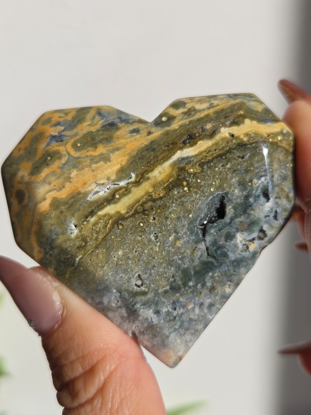 8th veinオーシャンジャスパーハートです。 8th veinオーシャンジャスパー特有の独特な模様と、ザクザクキラキラクォーツとがとても素敵です。 8th veinオーシャンジャスパーは、マダガスカルで8番目に見つかったオーシャンジャスパーの鉱脈で採れる天然石です。 鉱脈が非常に狭い(細い)為、すぐに採りつくされてしまうと言われており、今後の採掘量が不明という事もあり、世界的に人気で価格が高騰している天然石です。 特徴的なお花模様もチャームポイントの1つです。 オーシャンジャスパーには高いヒーリング効果があると言われ、精神的な安心感や安定感をもたらし、悩みや問題などの解決へと導いてくれます。 包容力や奉仕の精神を養ってくれる石でもあります。 また、隠れた魅力・才能を引き出してくれる石でもあります。 size:53.3mm×58.7mm×21.4mm