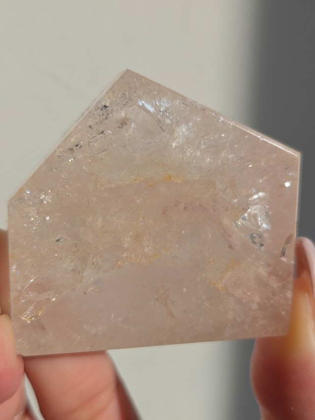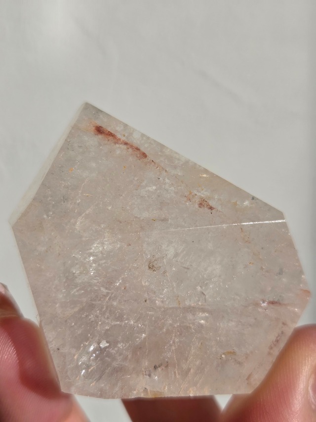 ピンククリアクォーツフリーフォーム ほんのりピンクに色づいた、虹が煌めくフリーフォームです。 入荷ときから小さな石目があります。 画像をご確認の上お迎えお願いいたします。 柔らかな雰囲気もありつつ、虹の煌めきが美しいフリーカットです。 ピンク色は、ヘマタイトの影響でこのように色づいてます。 size49mm×43.7mm×30.5 mm