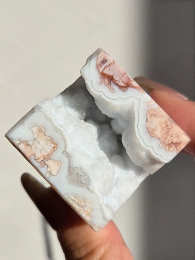 ピンクアゲートキューブオブジェ サーモンピンクカラーの瑪瑙に、キラキラのジオード部分が素敵なキューブ形オブジェです。 ピンクアゲートは、恋愛運をはじめとした人間関係に関するパワーを持っています。 心に優しさと明るさをもたらすといわれており、人間的な魅力を引き出してくれます。 石言葉は、「対人関係」「精神安定」「安眠」「浄化」。 size34.6mm×34.5mm