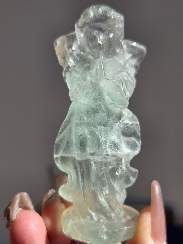 フローライトエンジェルカービング こちらの子は、右羽部分うっすら手で触ると分かるくらいの欠けがある為お値段調整しています。画像をご確認の上お迎えいただきますよう、よろしくお願いします。 淡いエメラルドグリーンのフローライトに、リモナイトが入り込んでいます。 柔らかい雰囲気が、素敵な天使です。 size80.2mm×32mm×25.5mm