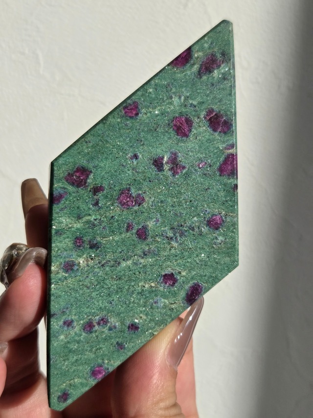 インド産ルビーインフックサイトダイヤ形 スタンド付き ルビーインフックサイトは、情熱のルビーと癒やしのフックサイト(緑色の雲母)が共生する天然石で、強いヒーリング効果と活力を同時に与え、精神的疲労や落ち込みから立ち直らせ、自己肯定感を高め、困難に打ち勝つ勇気と意欲をサポートするとされています。 石size:115.6mm×59.1mm×11.6mm