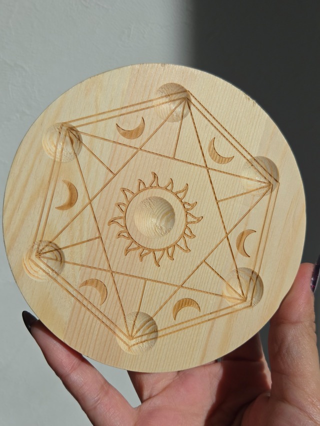 七星陣ウッドスタンド 七星陣が描かれた木製スタンドです。 それぞれにスフィアを置いたり、タンブルやクリスタルを置いてオリジナルグリッドも組めます。 size120mm×120mm×18mm