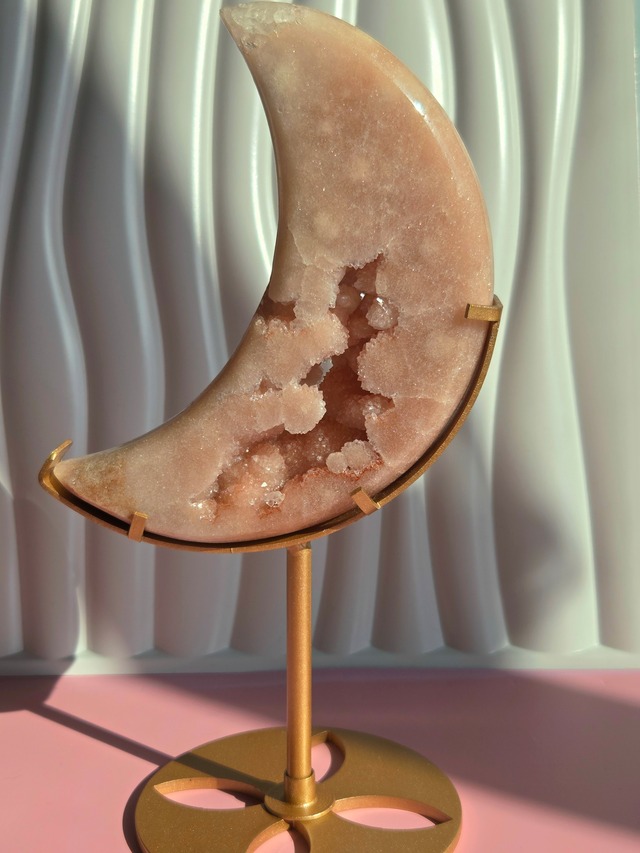 ピンクアメジストムーンフォームになります。専用スタンドも付いているので、そのままインテリアしてください。 ピンクアメジストに、ざっくざくの結晶もキラキラしており、圧巻の美しさです。側面もラメをふりかけたように煌めきが見え、シュガージオード部分も素敵です。 アメジストの主な効果は、ストレスを和らげ心を落ち着かせる精神安定効果と、直感力や洞察力を高めることです。また、ネガティブなエネルギーを浄化し、真実の愛を引き寄せる魔除けやお守りとしての力も持つとされています。特に不眠や悪夢に悩む人の安眠を促進する効果も期待できるといわれています。 石size:高さ148.8mm×横90.5mm×厚み29.6mm スタンド込size:高さ240mm×横136.5mm×奥行99.2mm