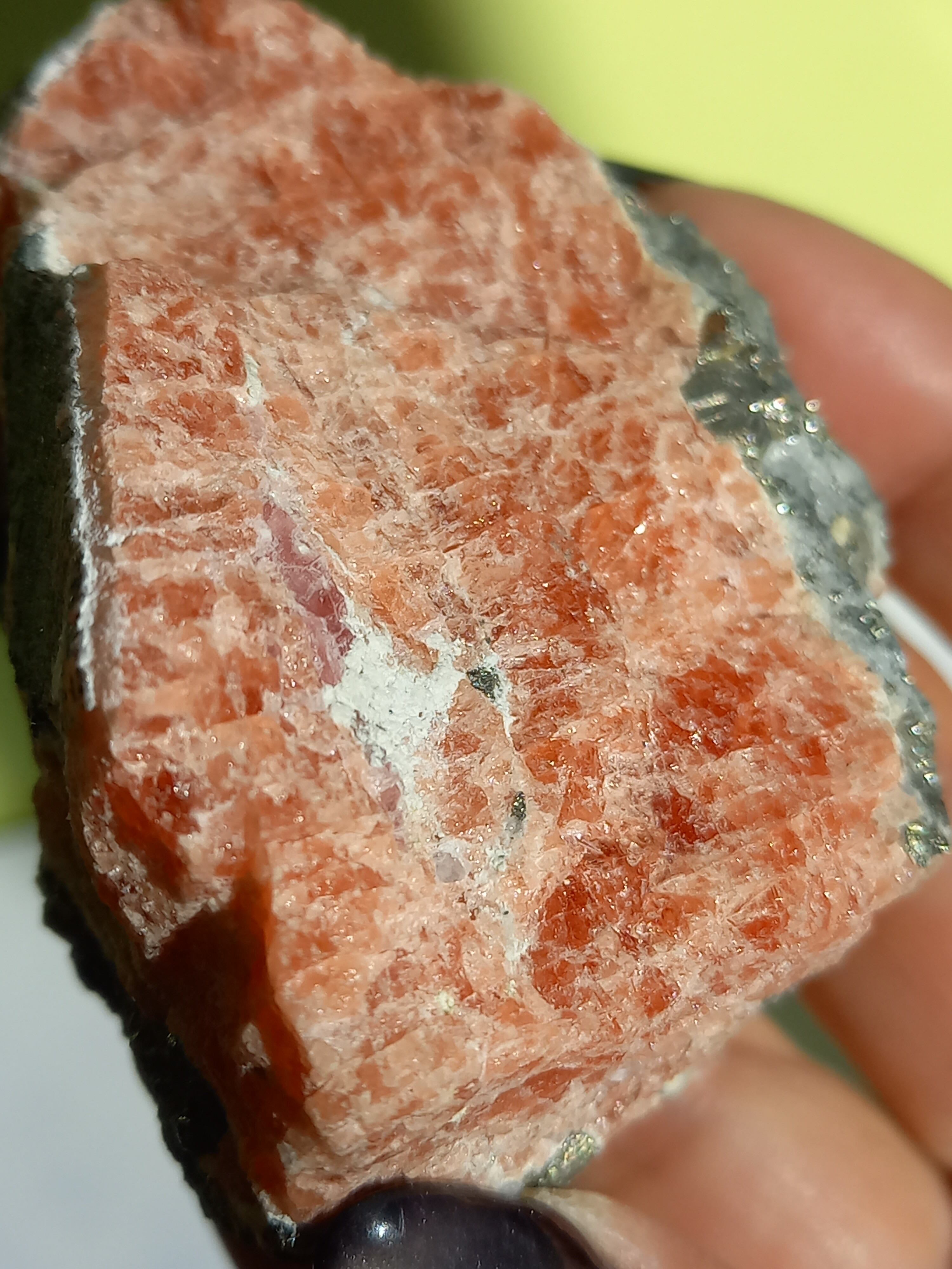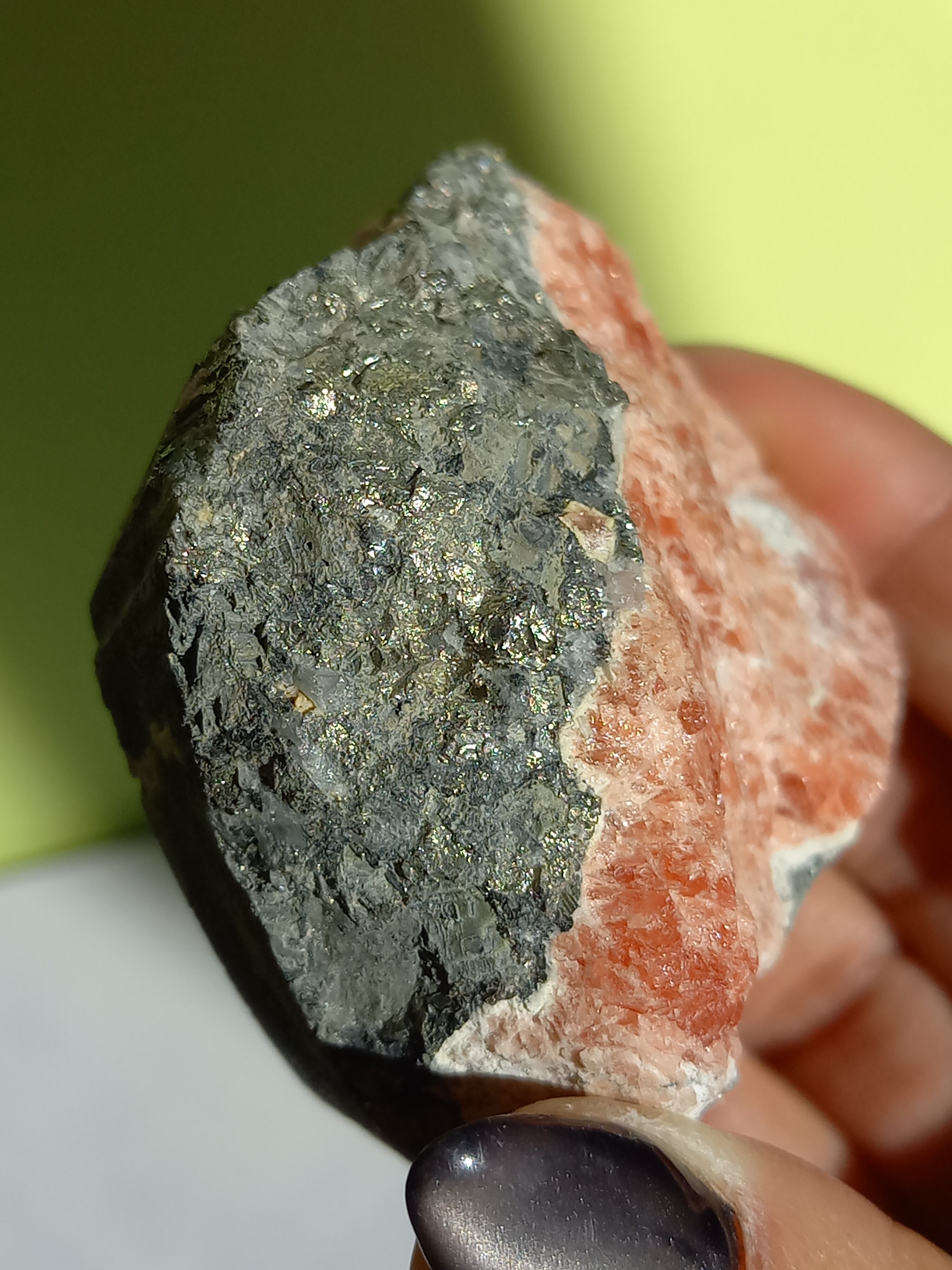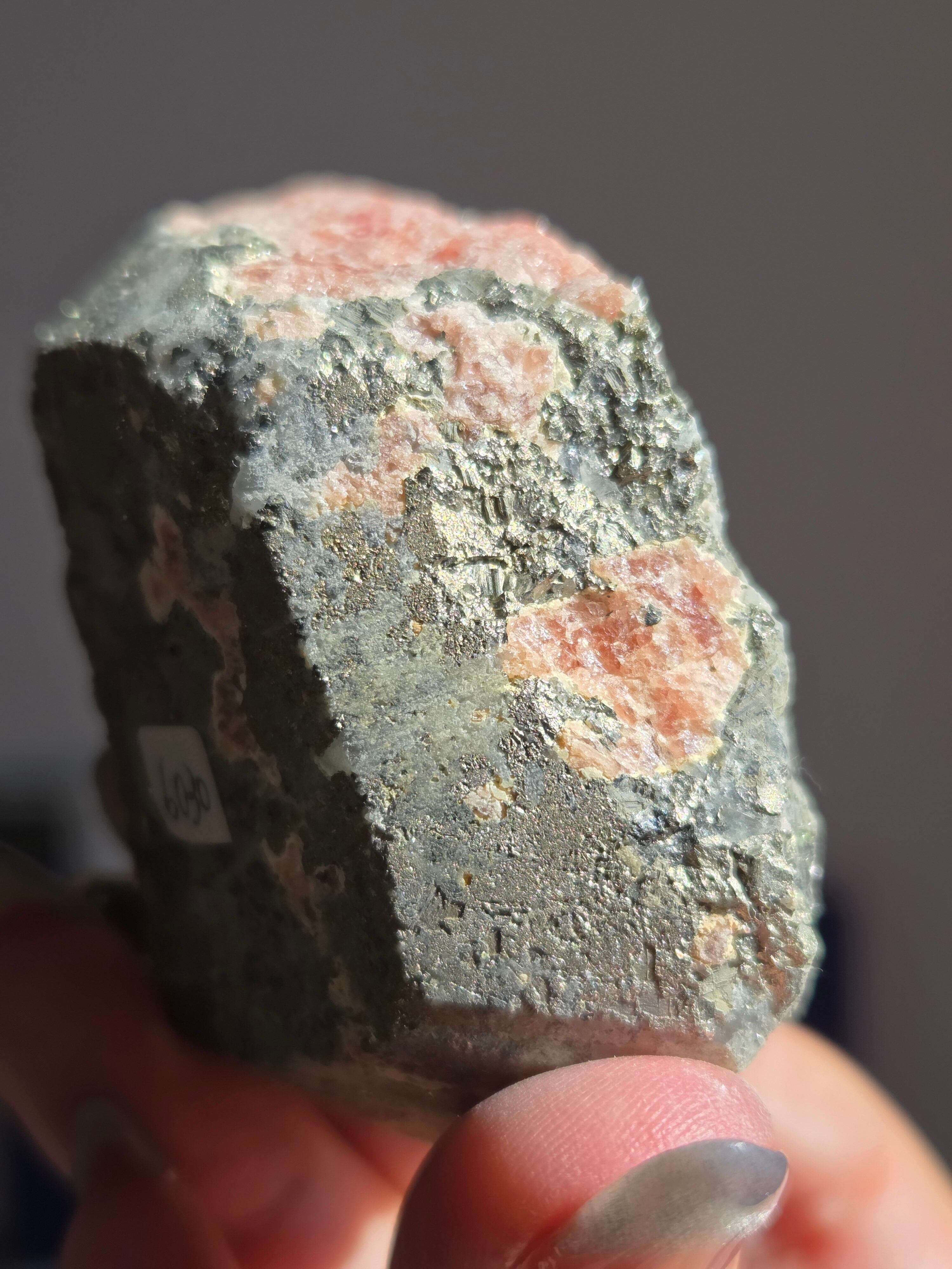 ピンクカラーのインカローズに、パイライトが沢山の、ずっしり素敵な原石です。