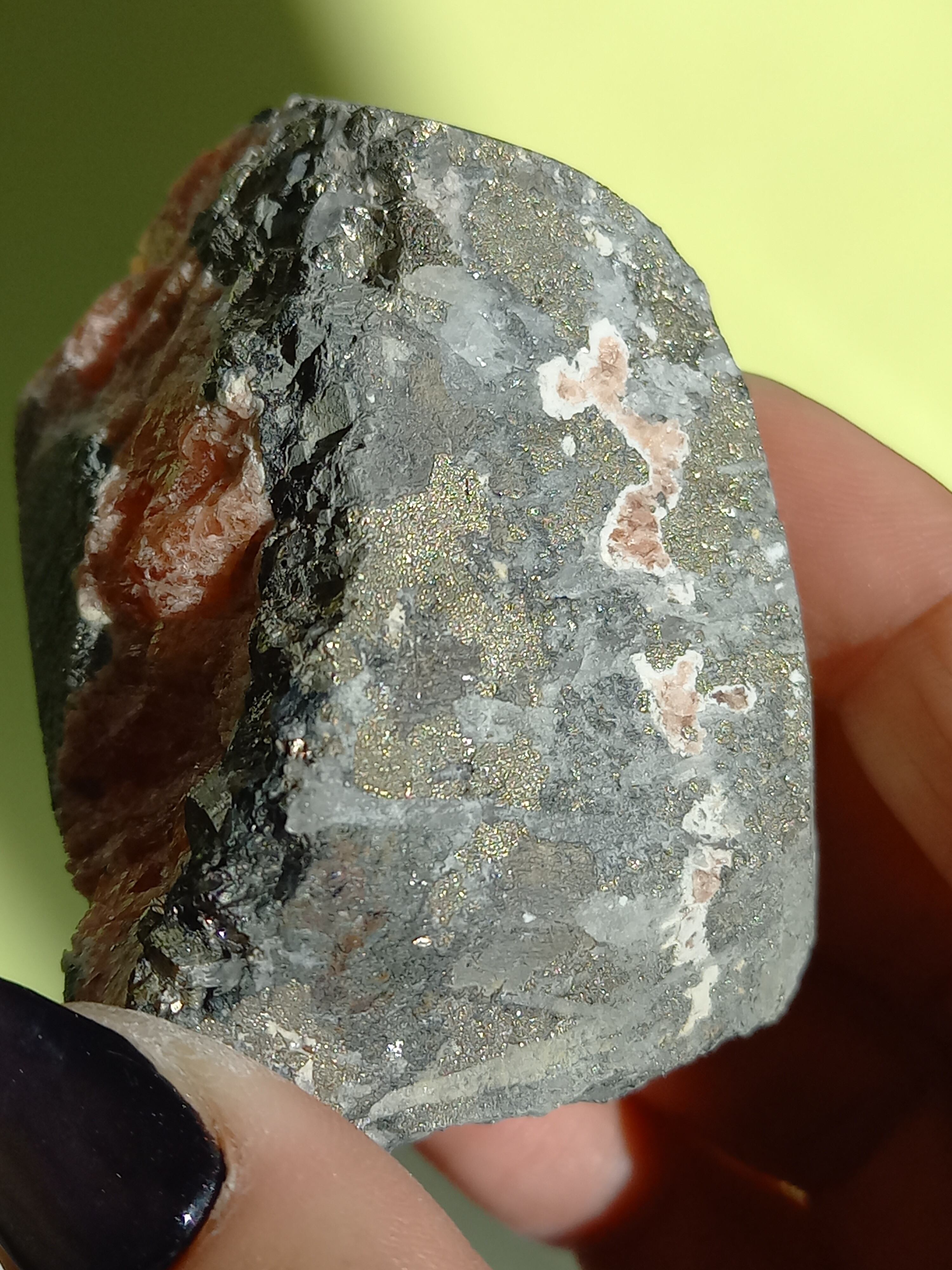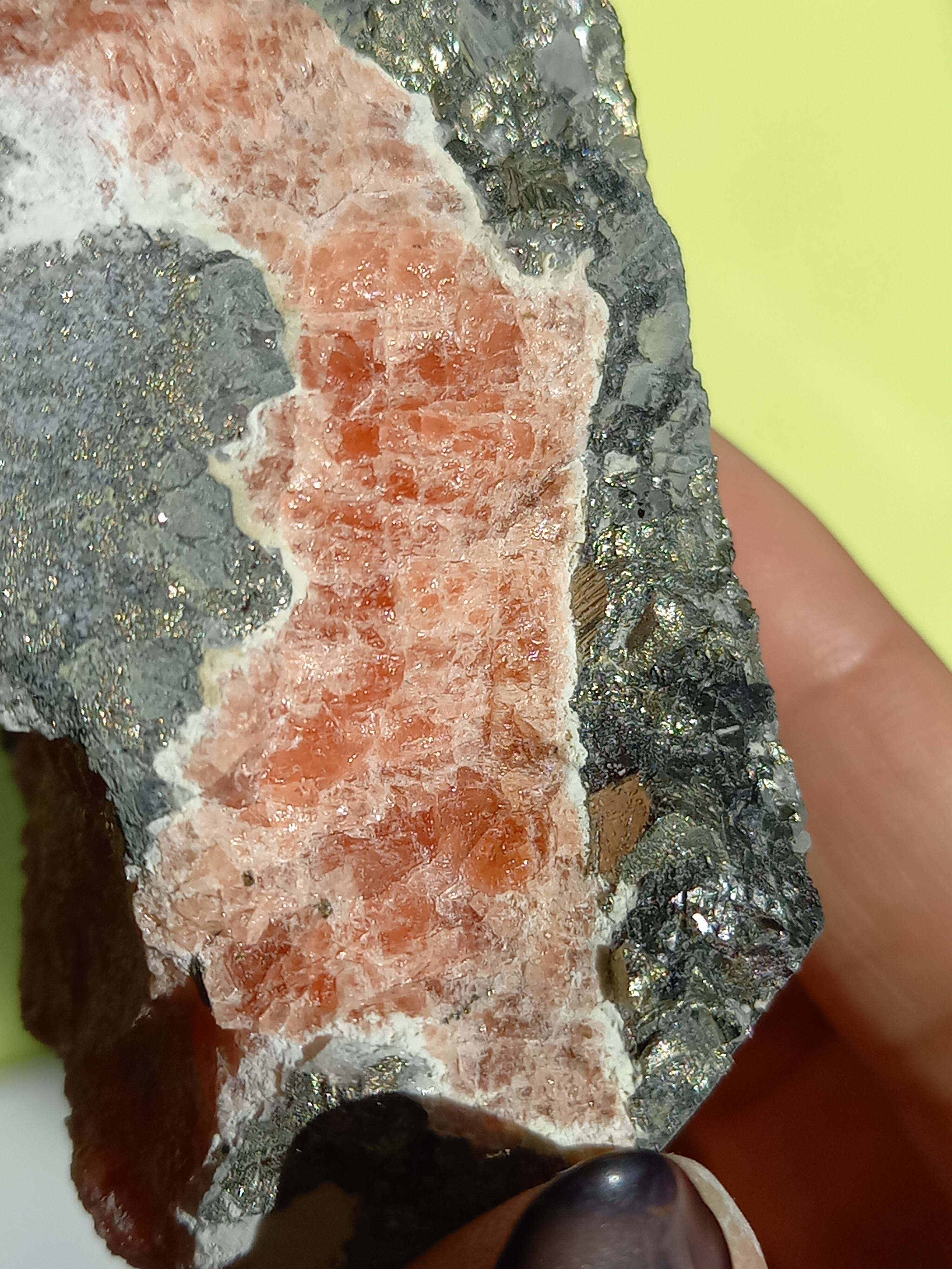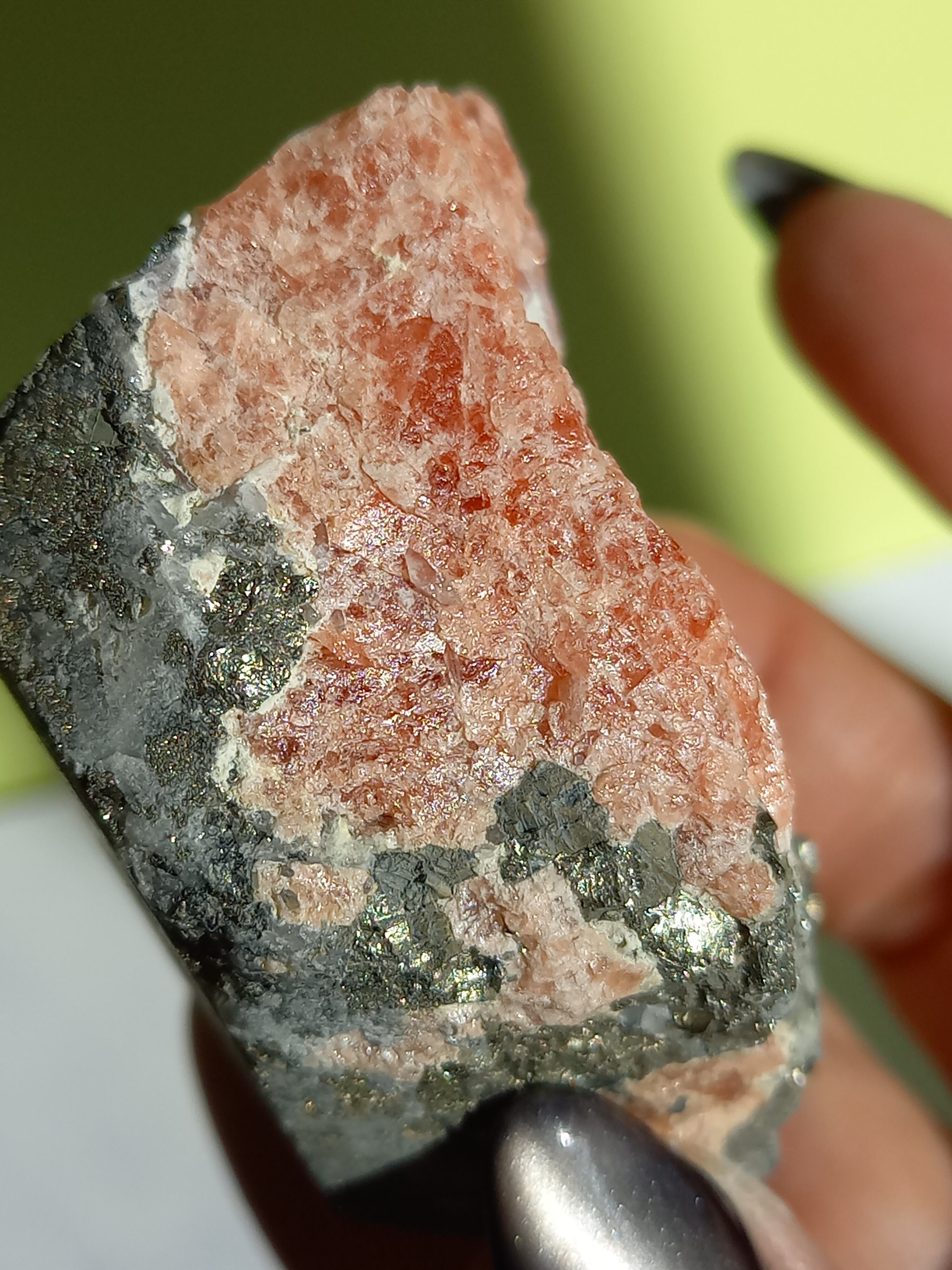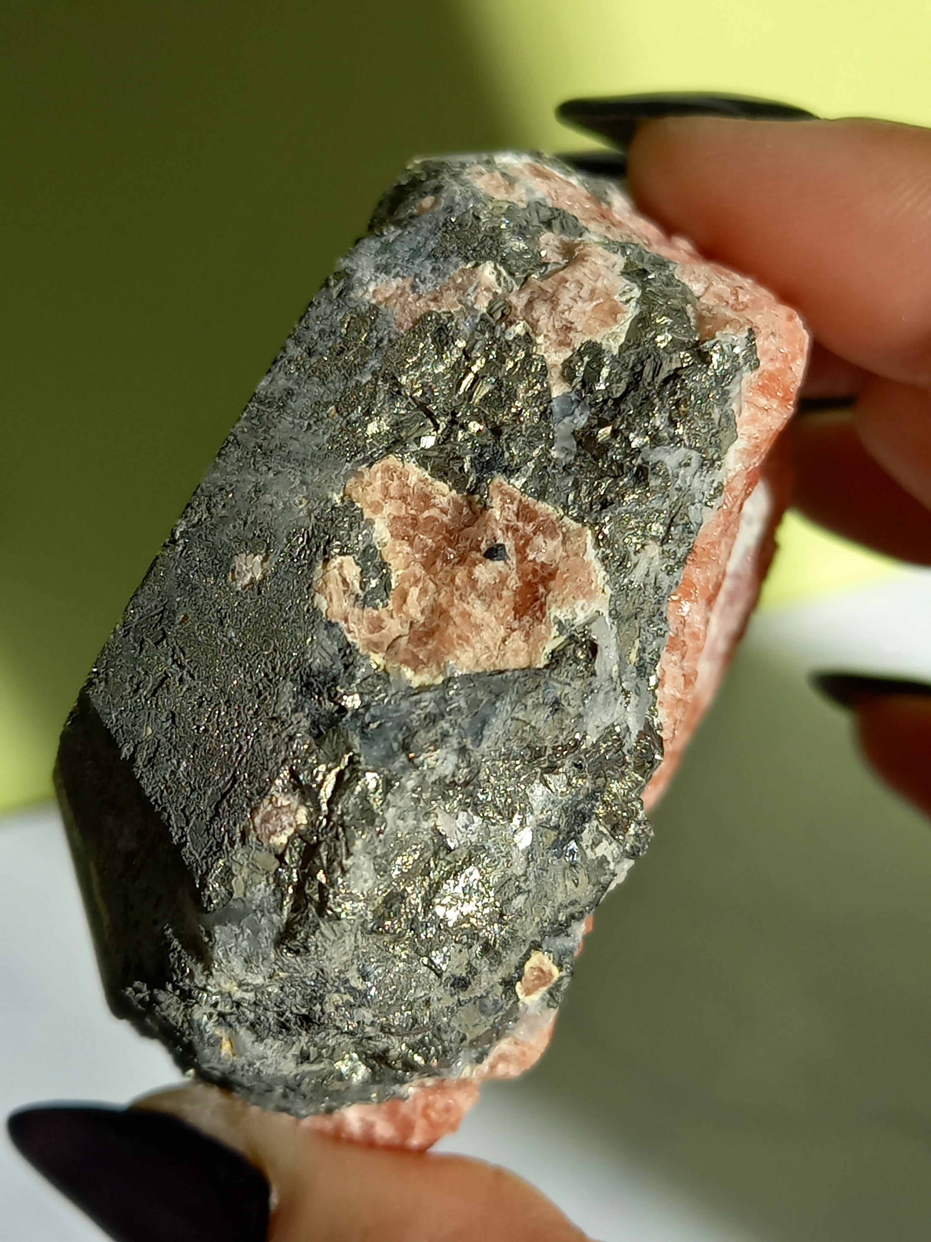 ピンクカラーのインカローズに、パイライトが沢山の、ずっしり素敵な原石です。