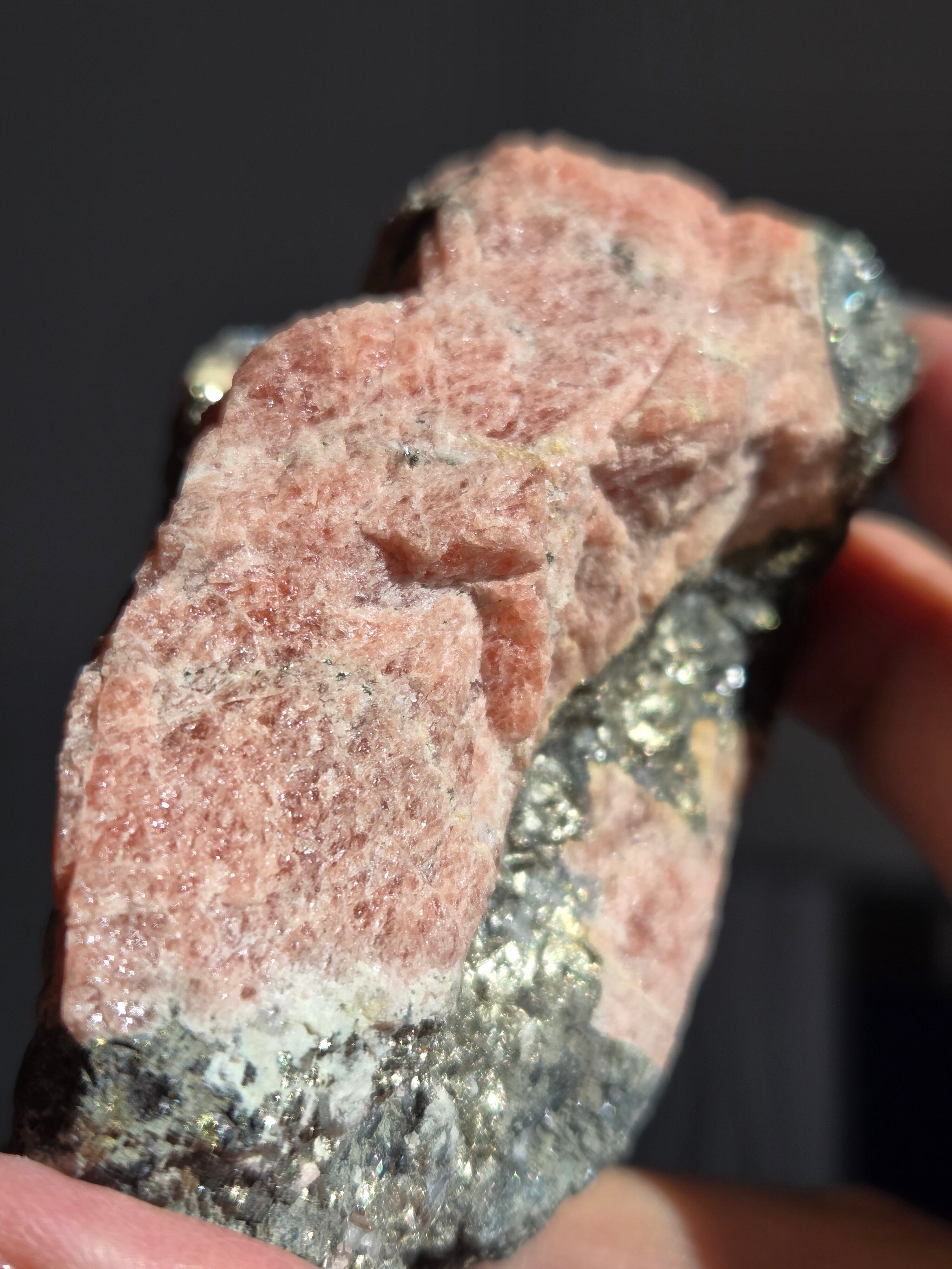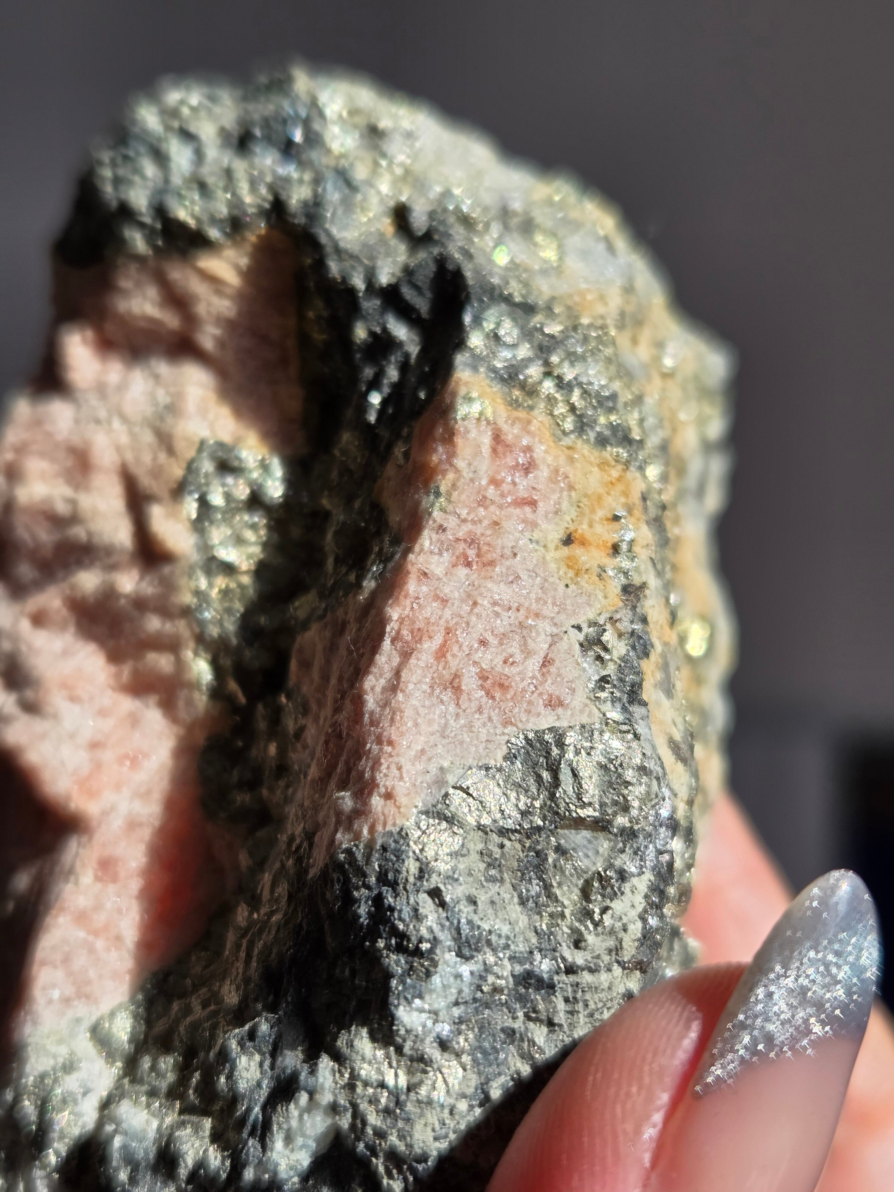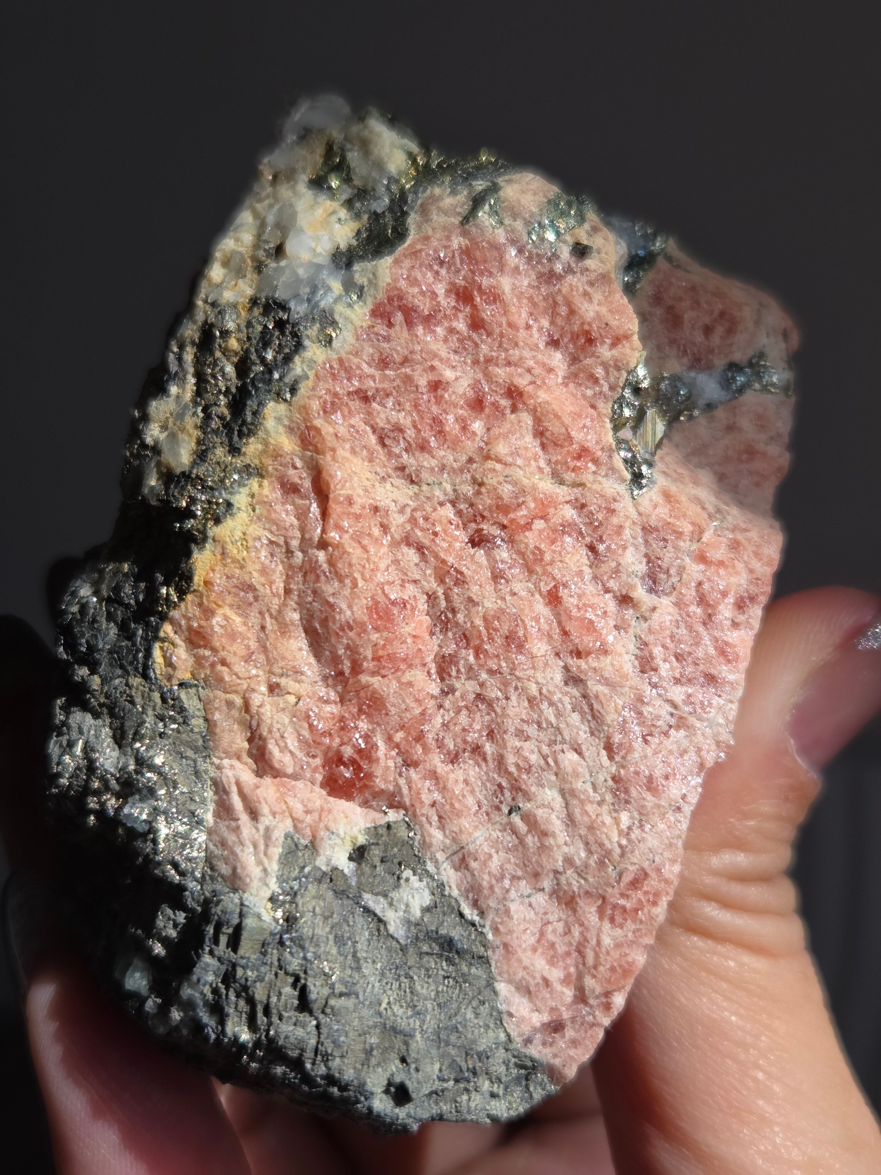 ピンクカラーのインカローズに、パイライトが沢山の、ずっしり素敵な原石です。