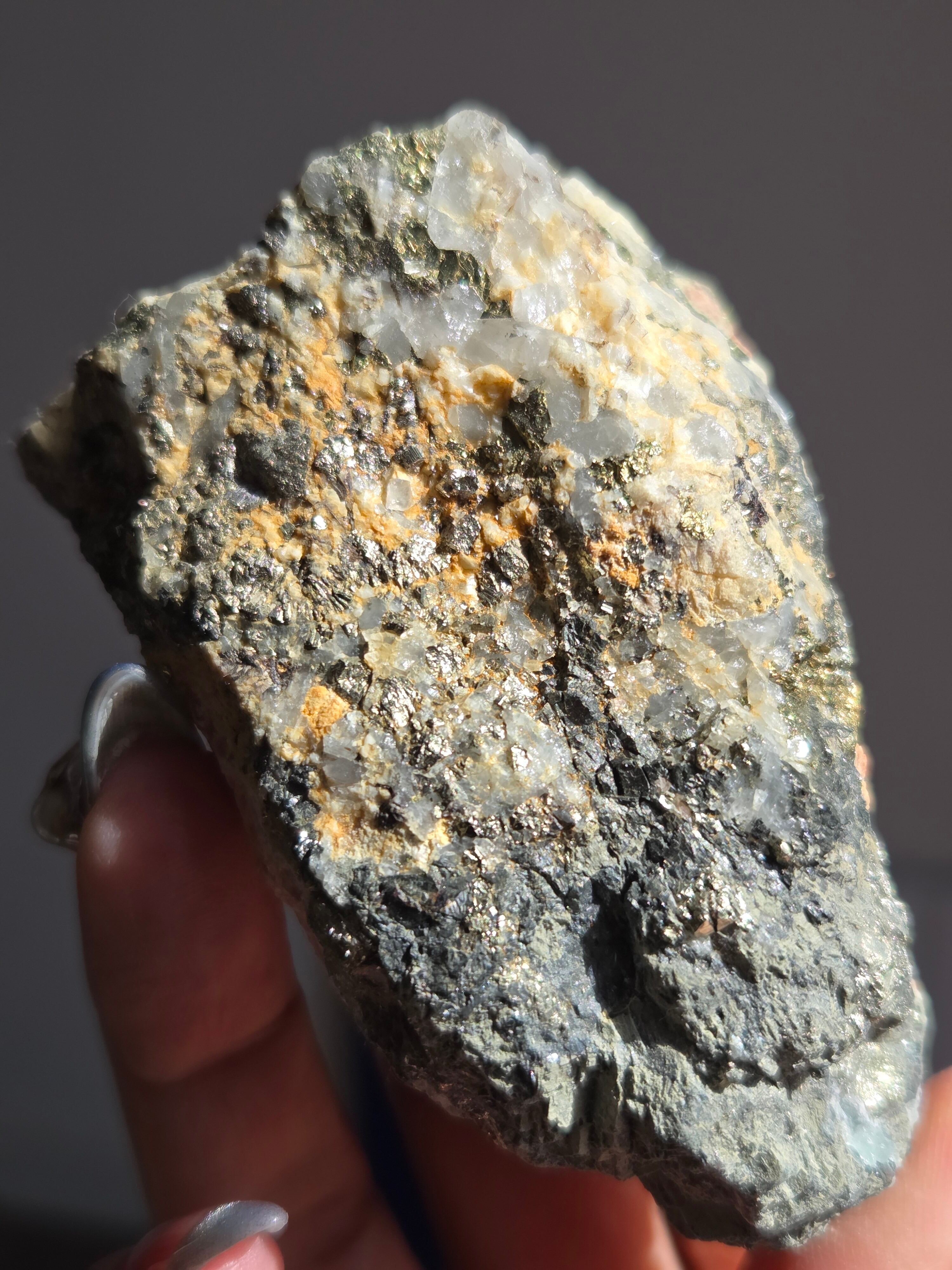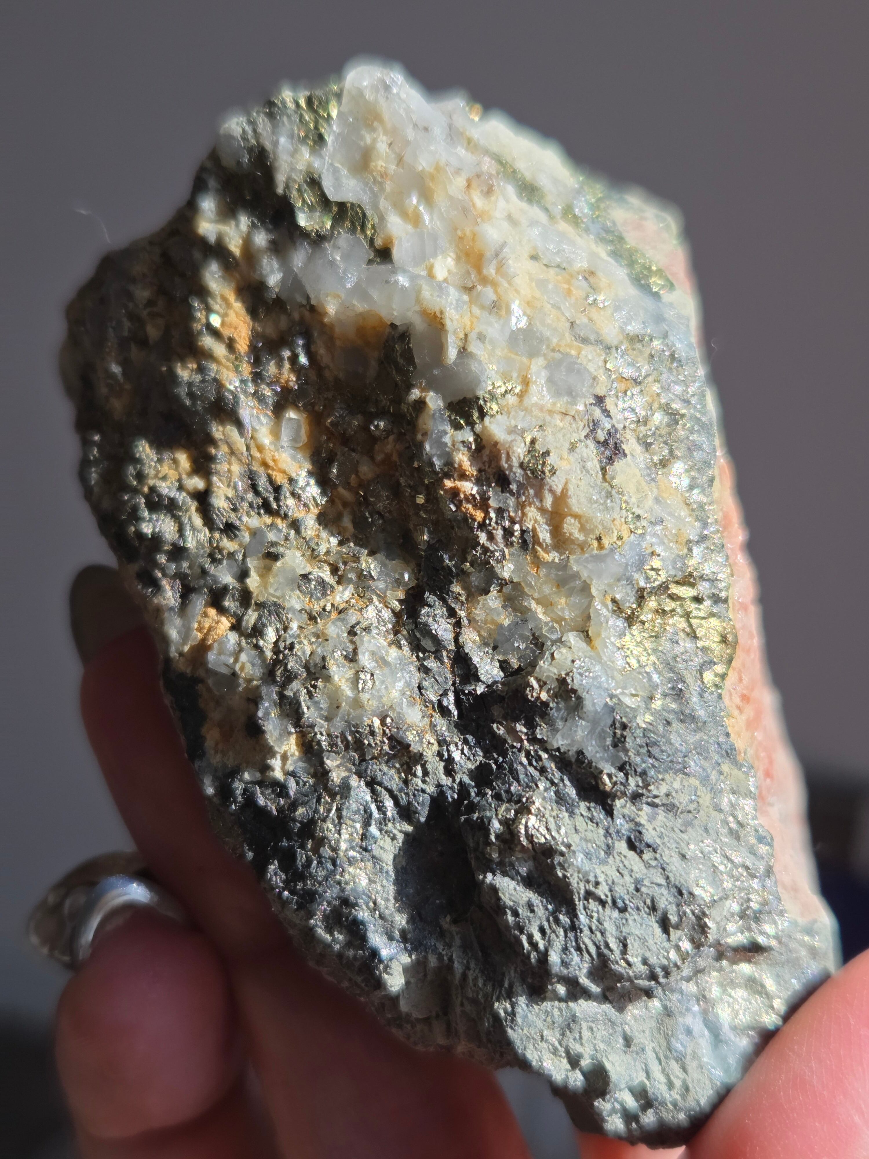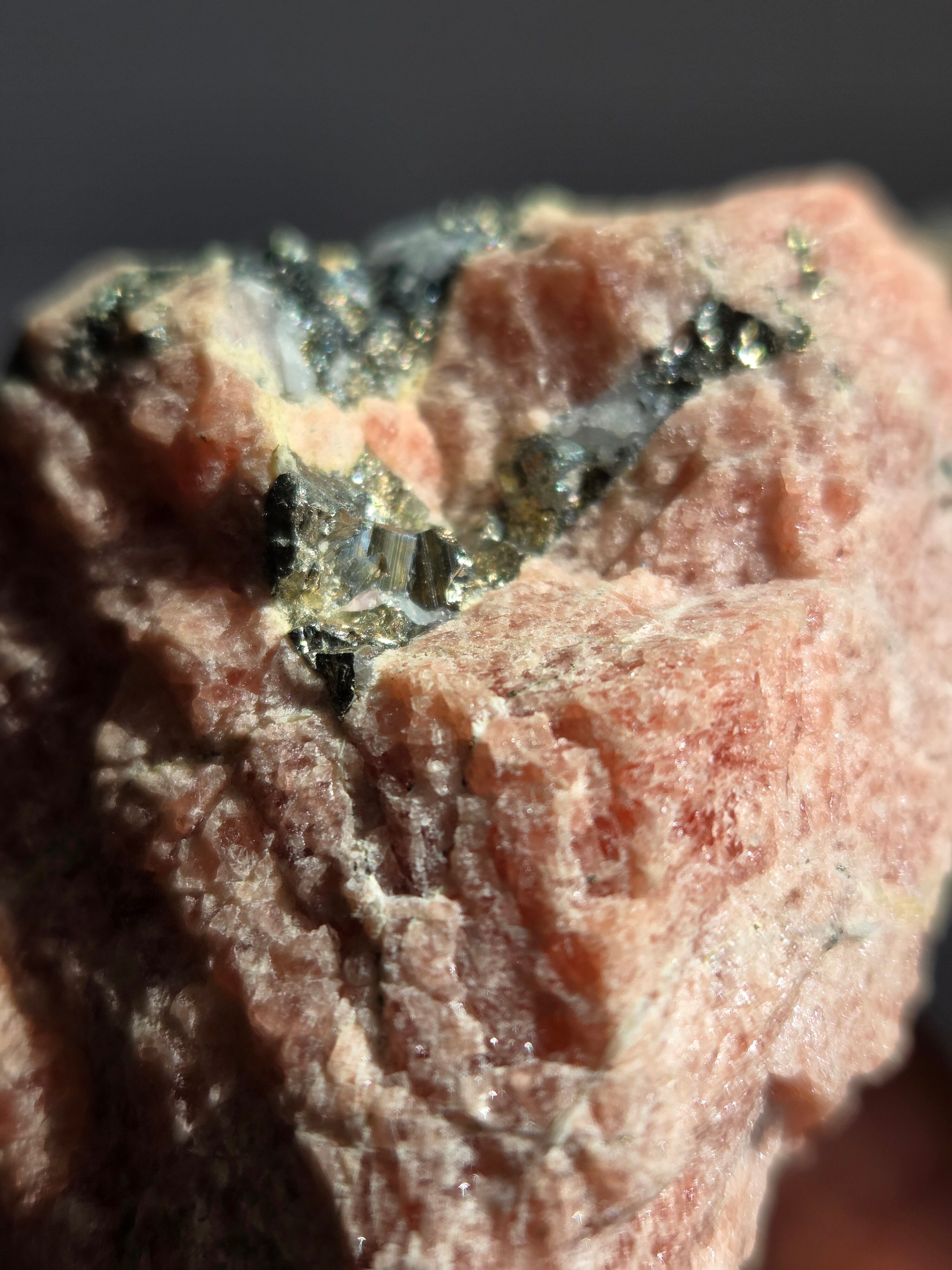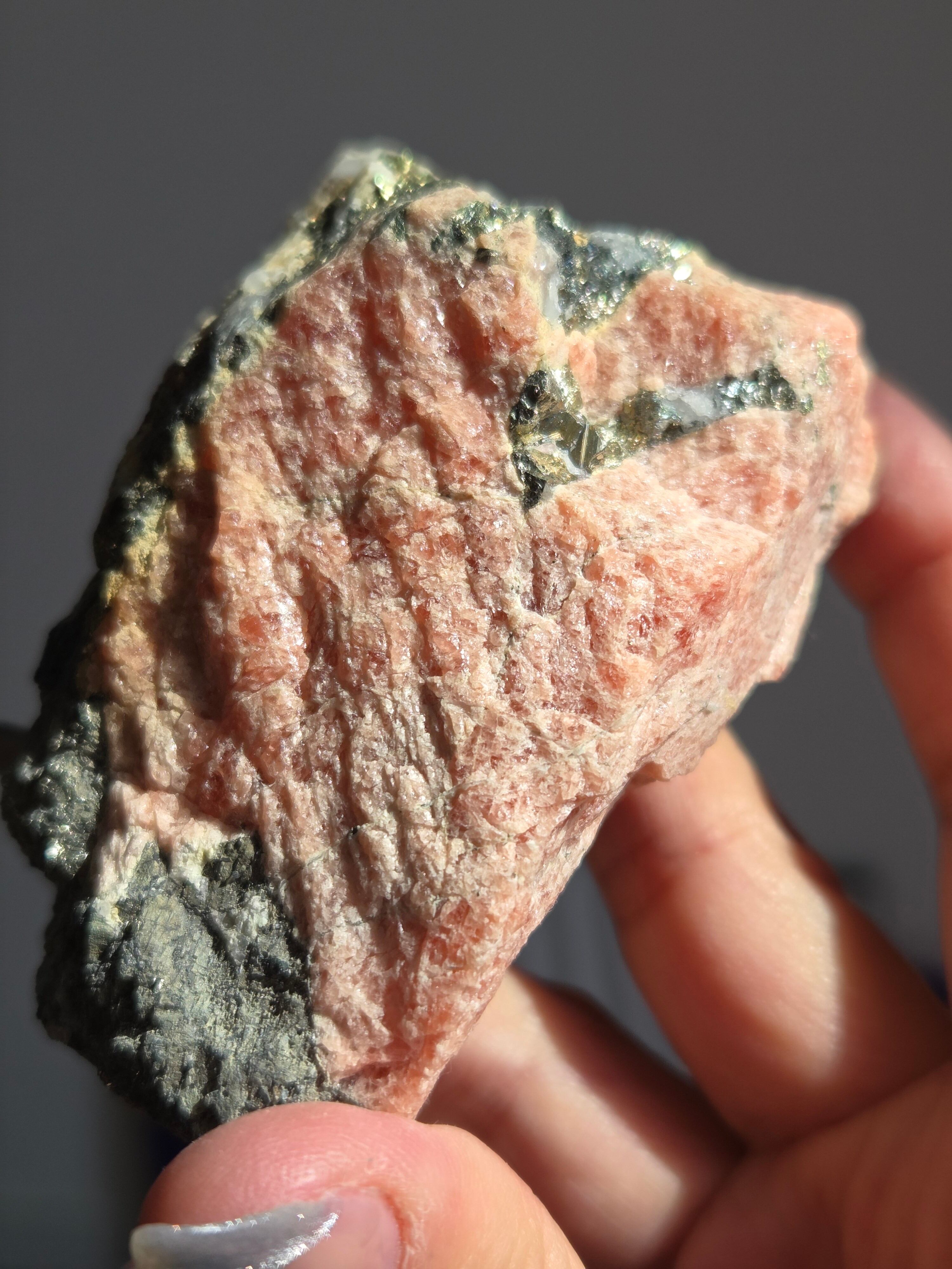 ピンクカラーのインカローズに、パイライトが沢山の、ずっしり素敵な原石です。