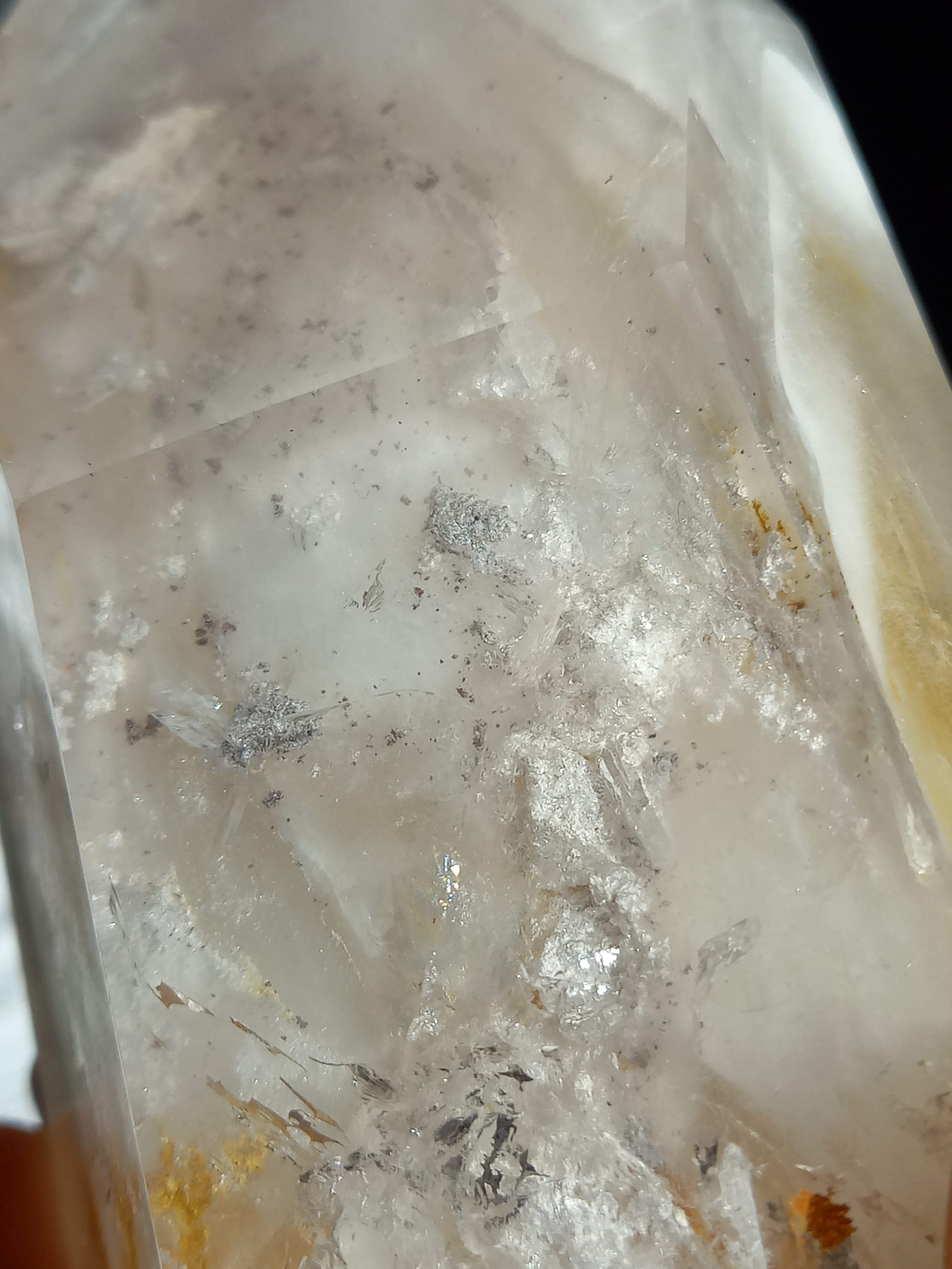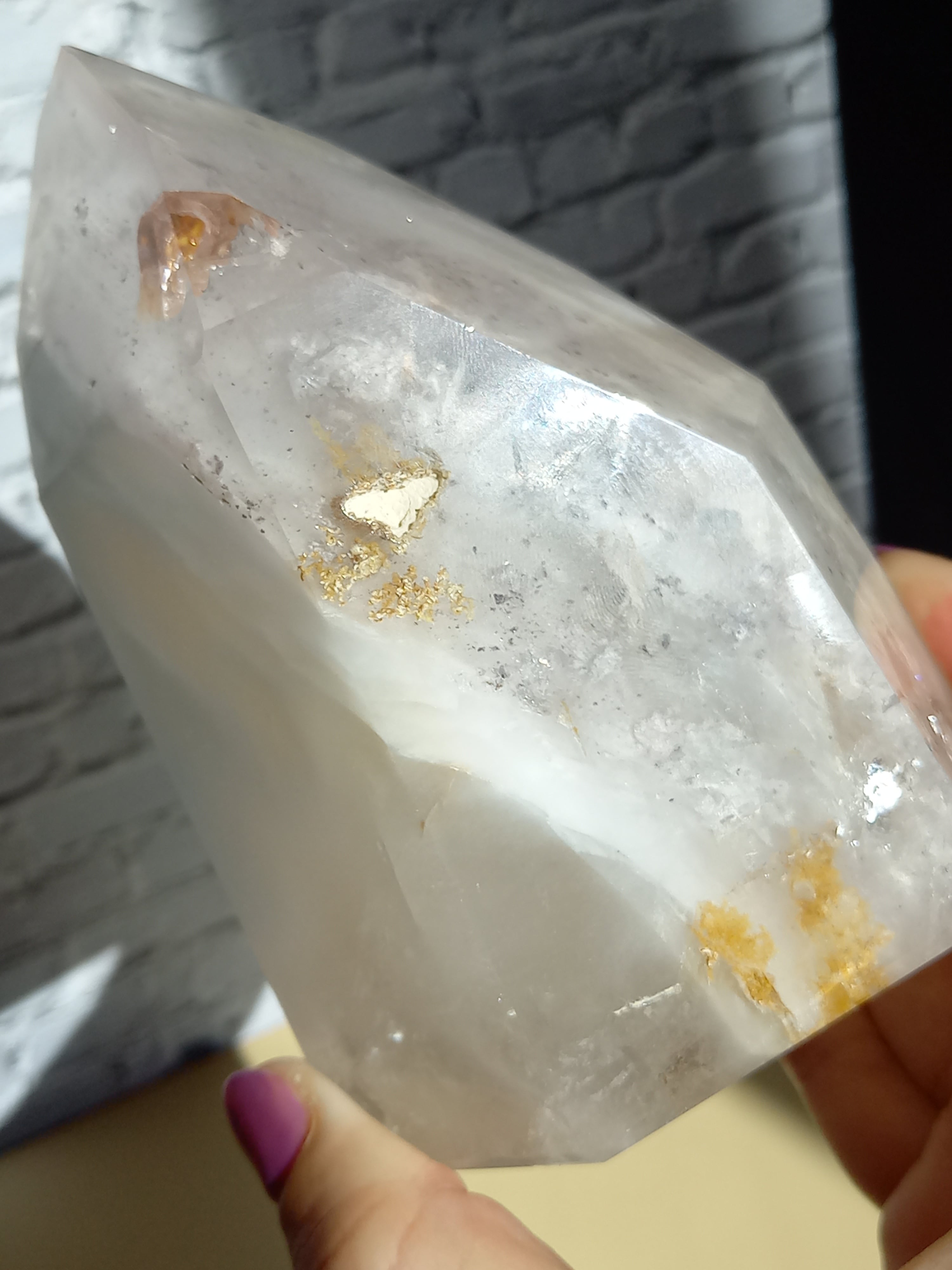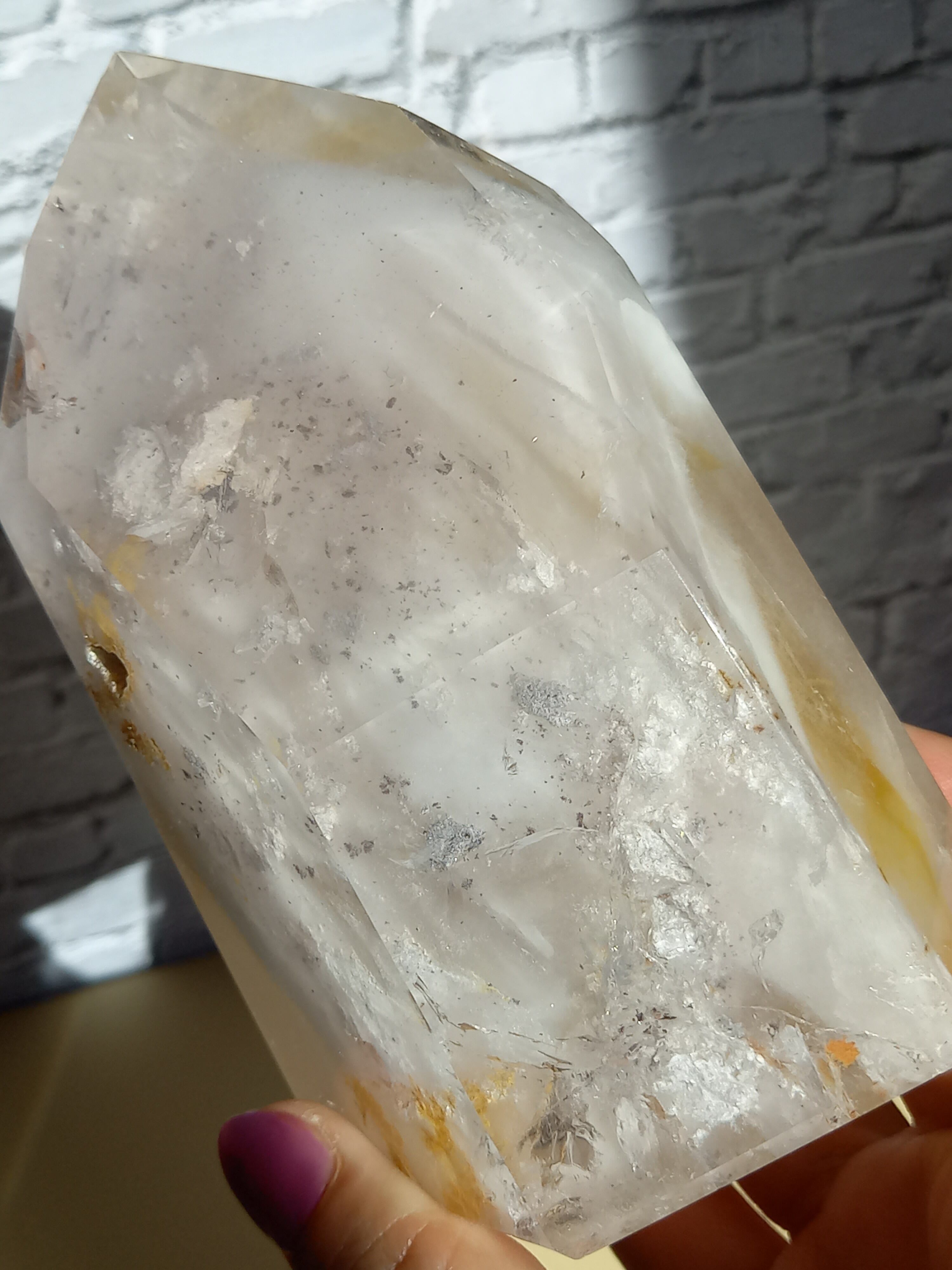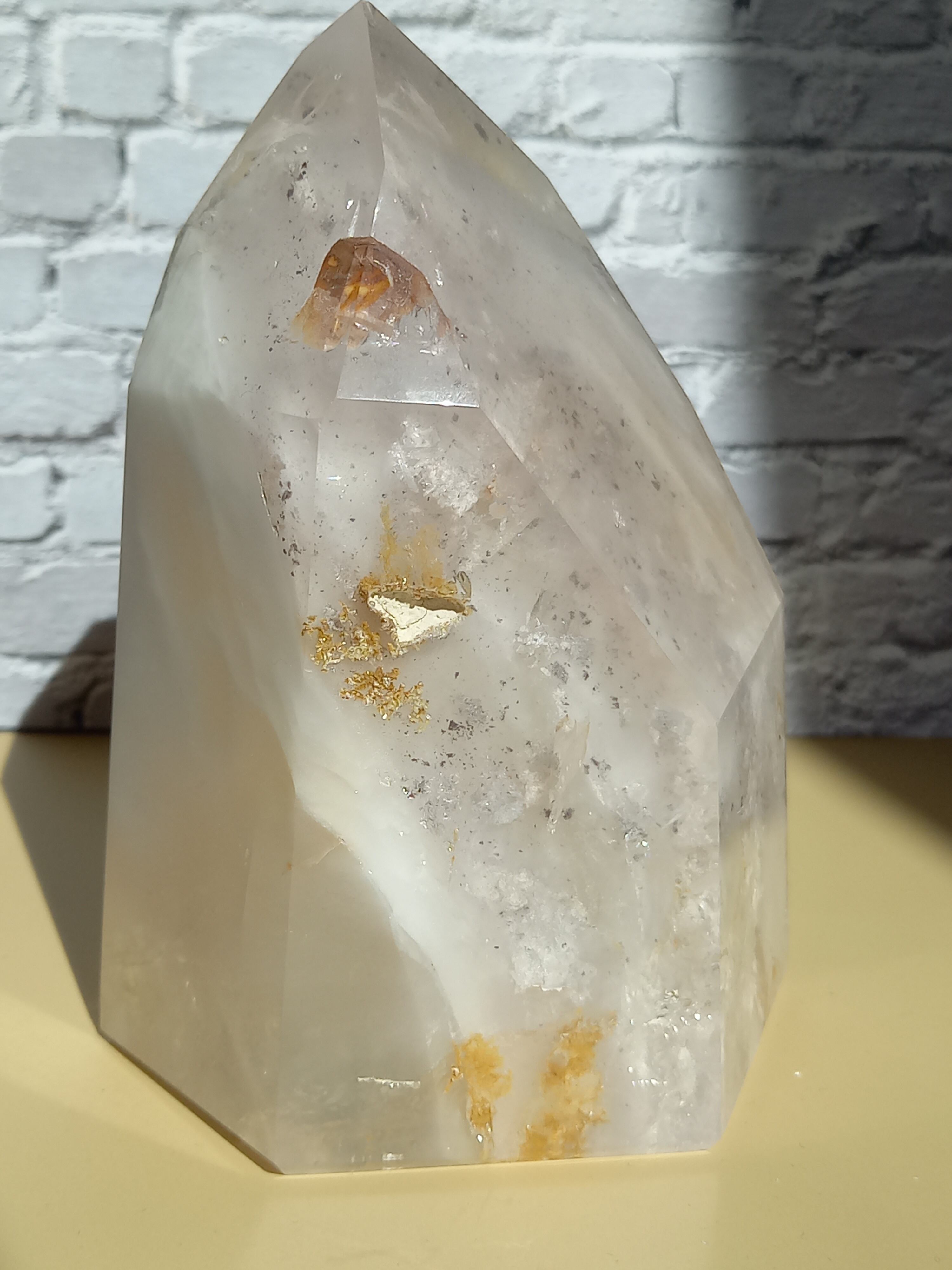 渦巻いたような模様や、フワフワした部分や、透明感あるクォーツから見えるライモナイト等など見どころたっぷりのビックタワーです。存在感も抜群です。