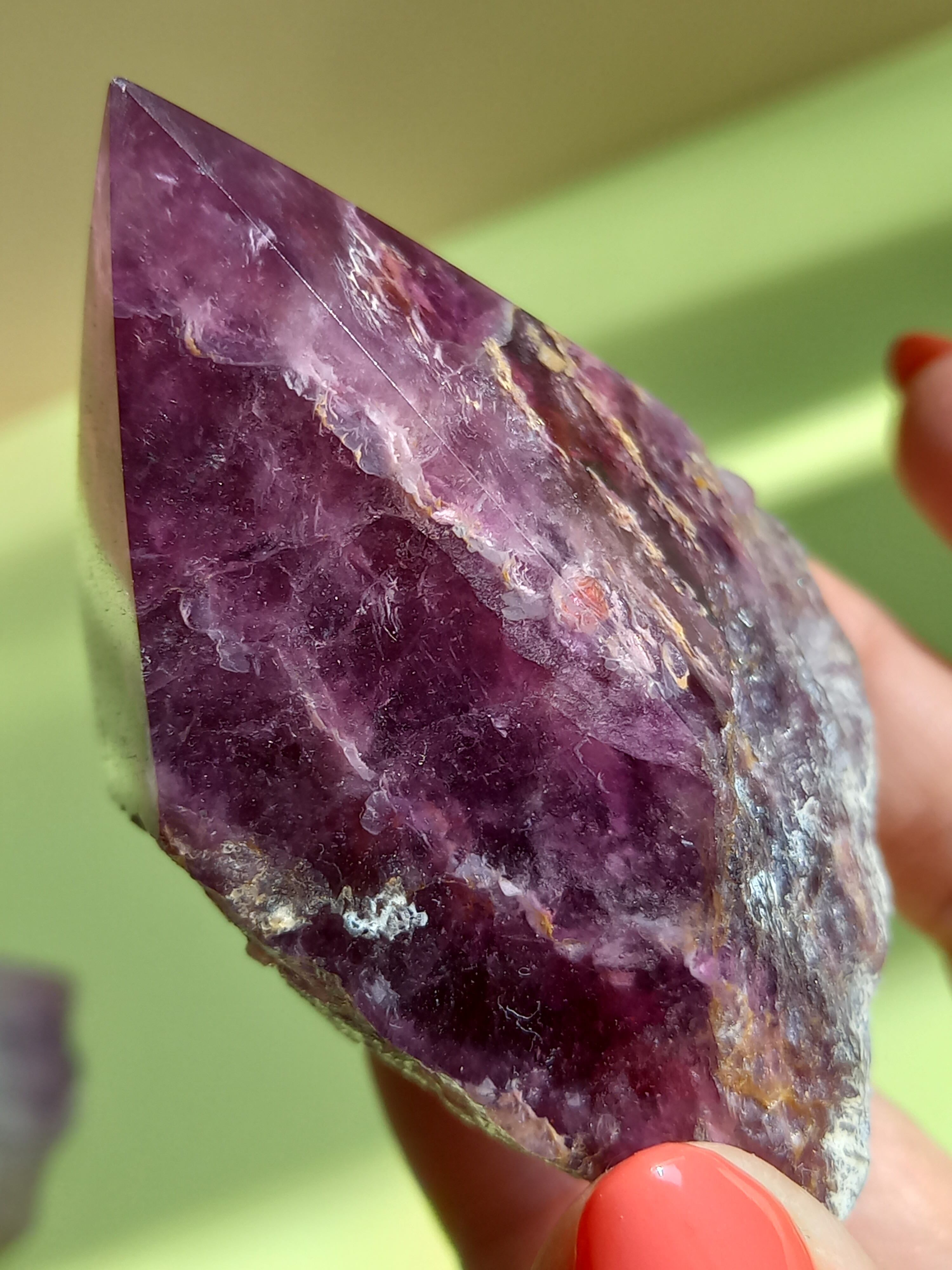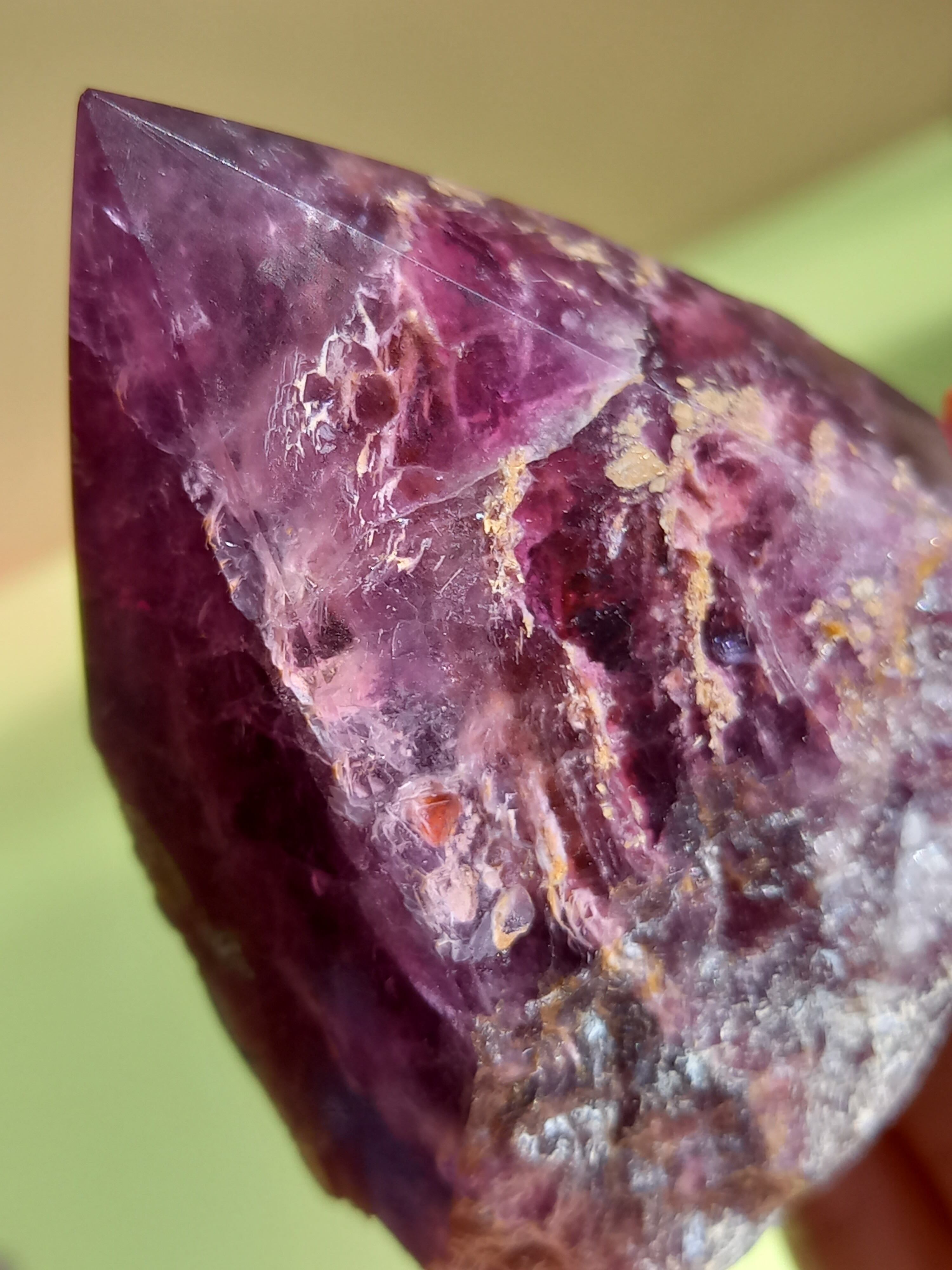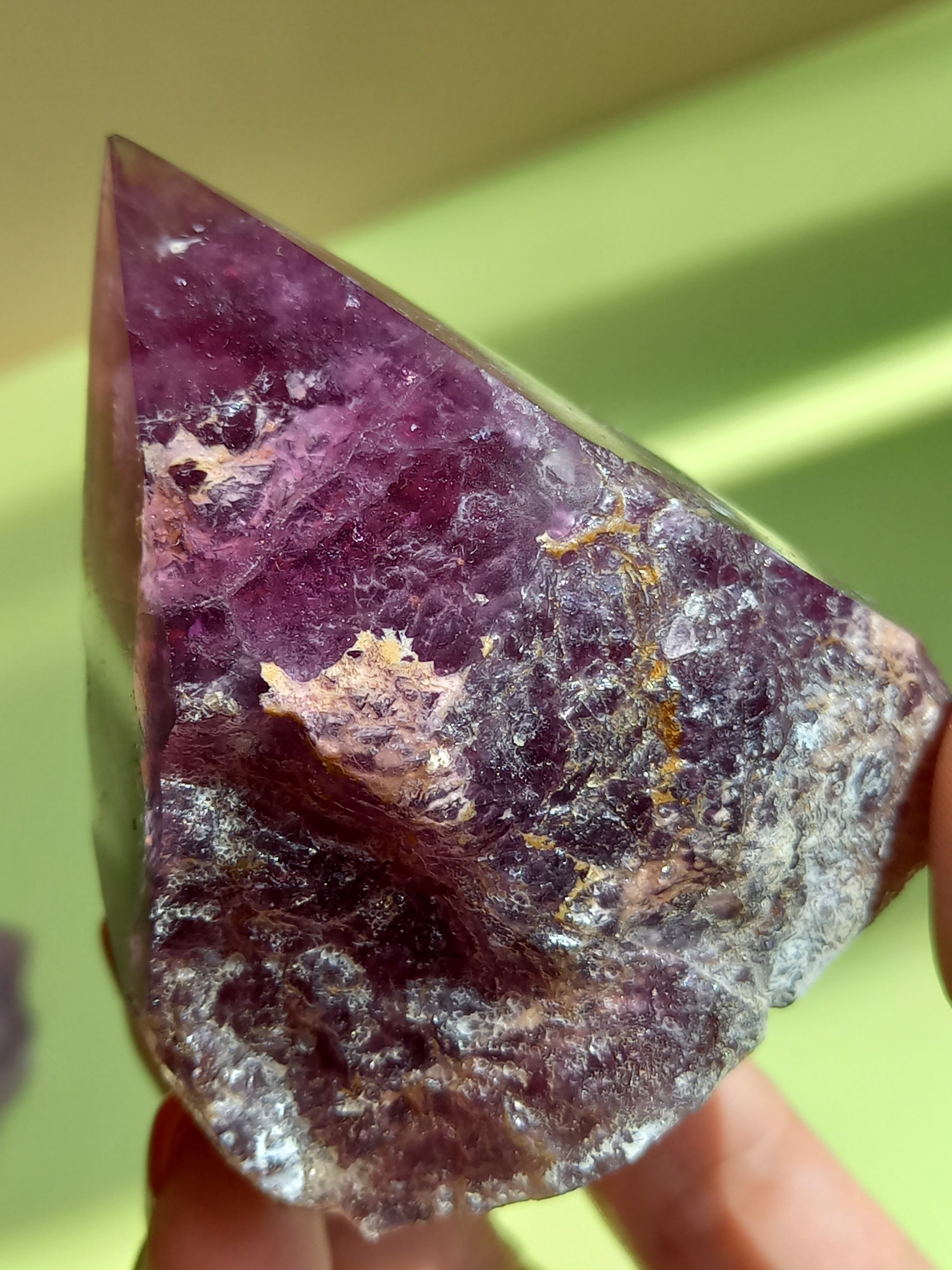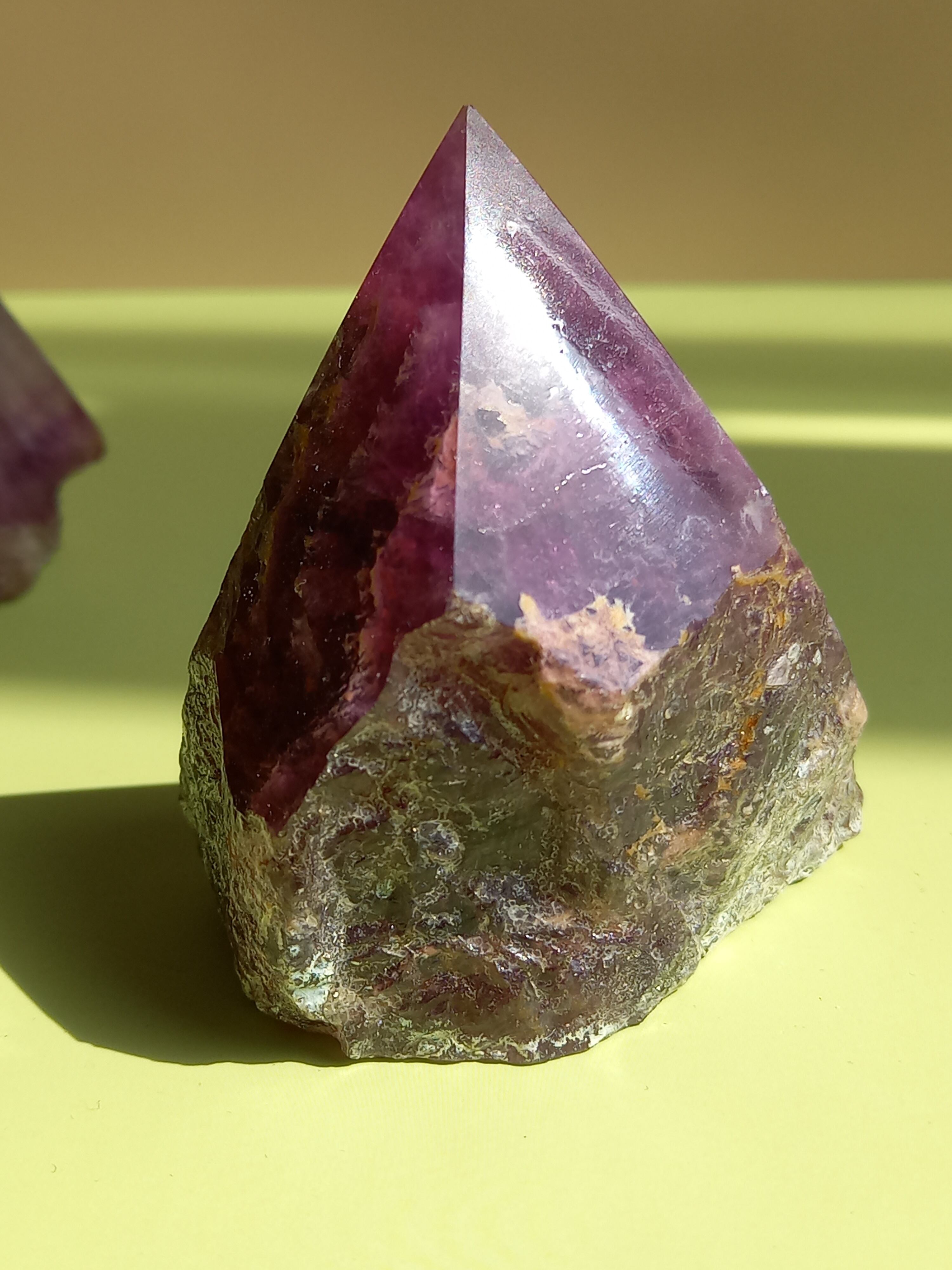 フローライトの原石をダイヤ形にカットしてます。上部はポリッシュし、下の方はナチュラルです。