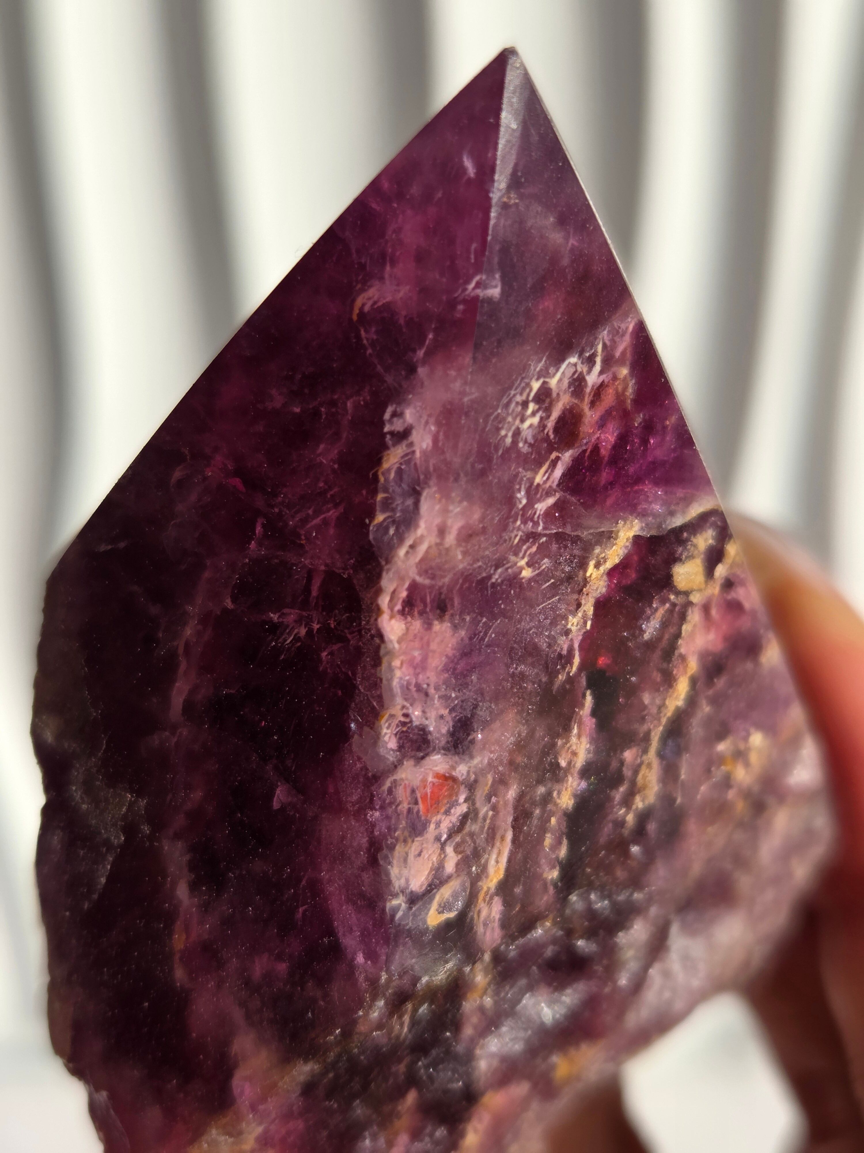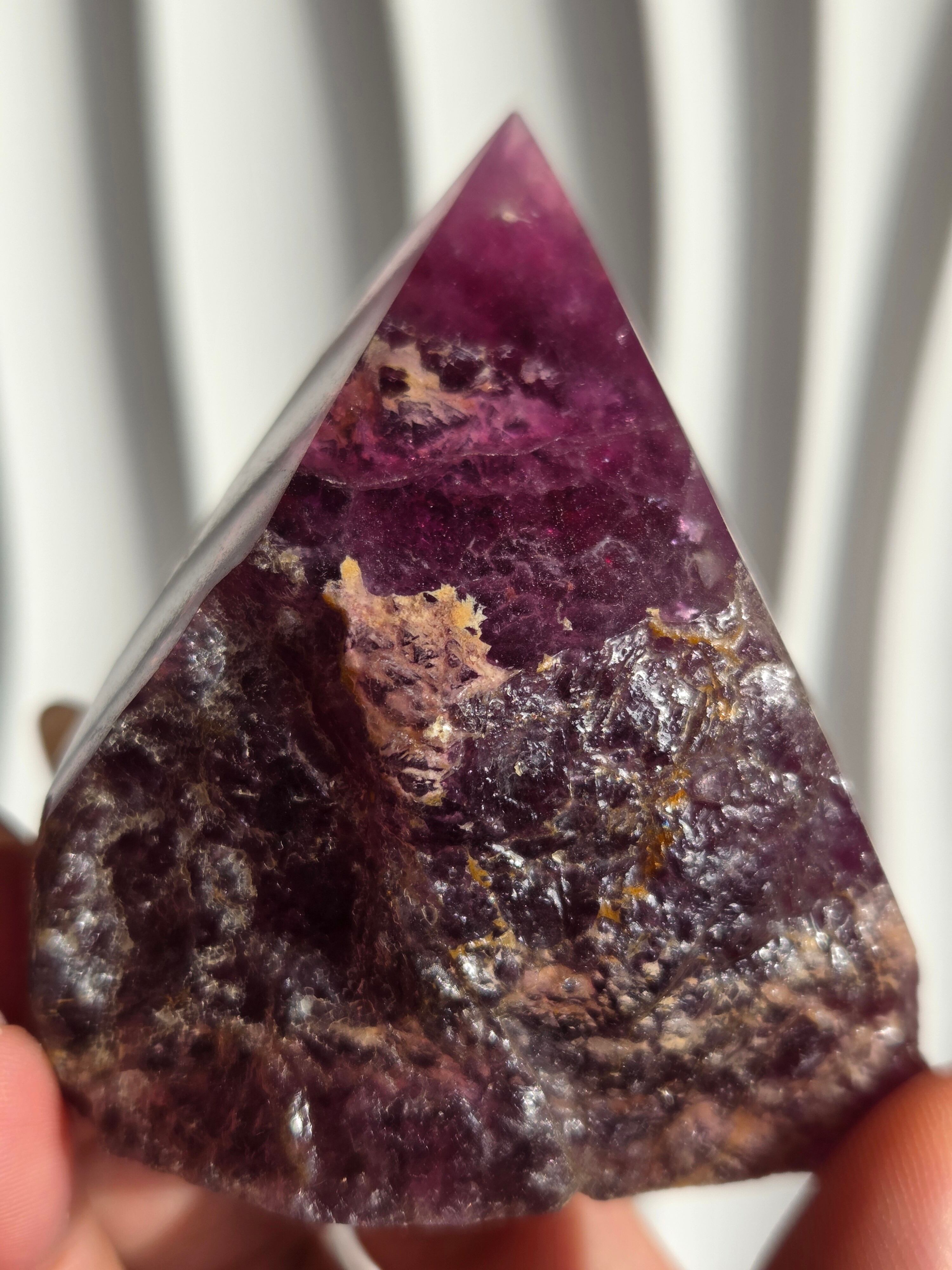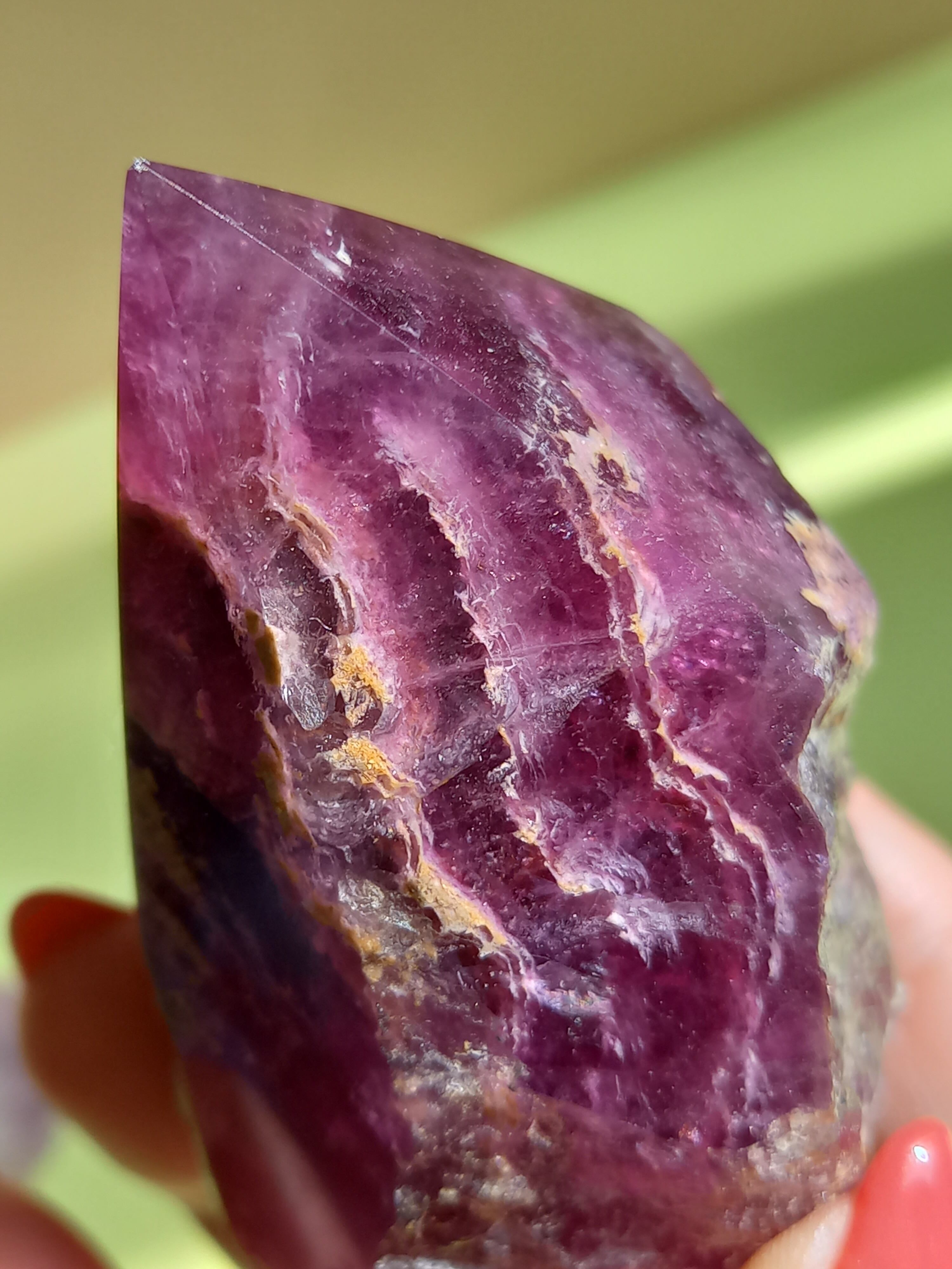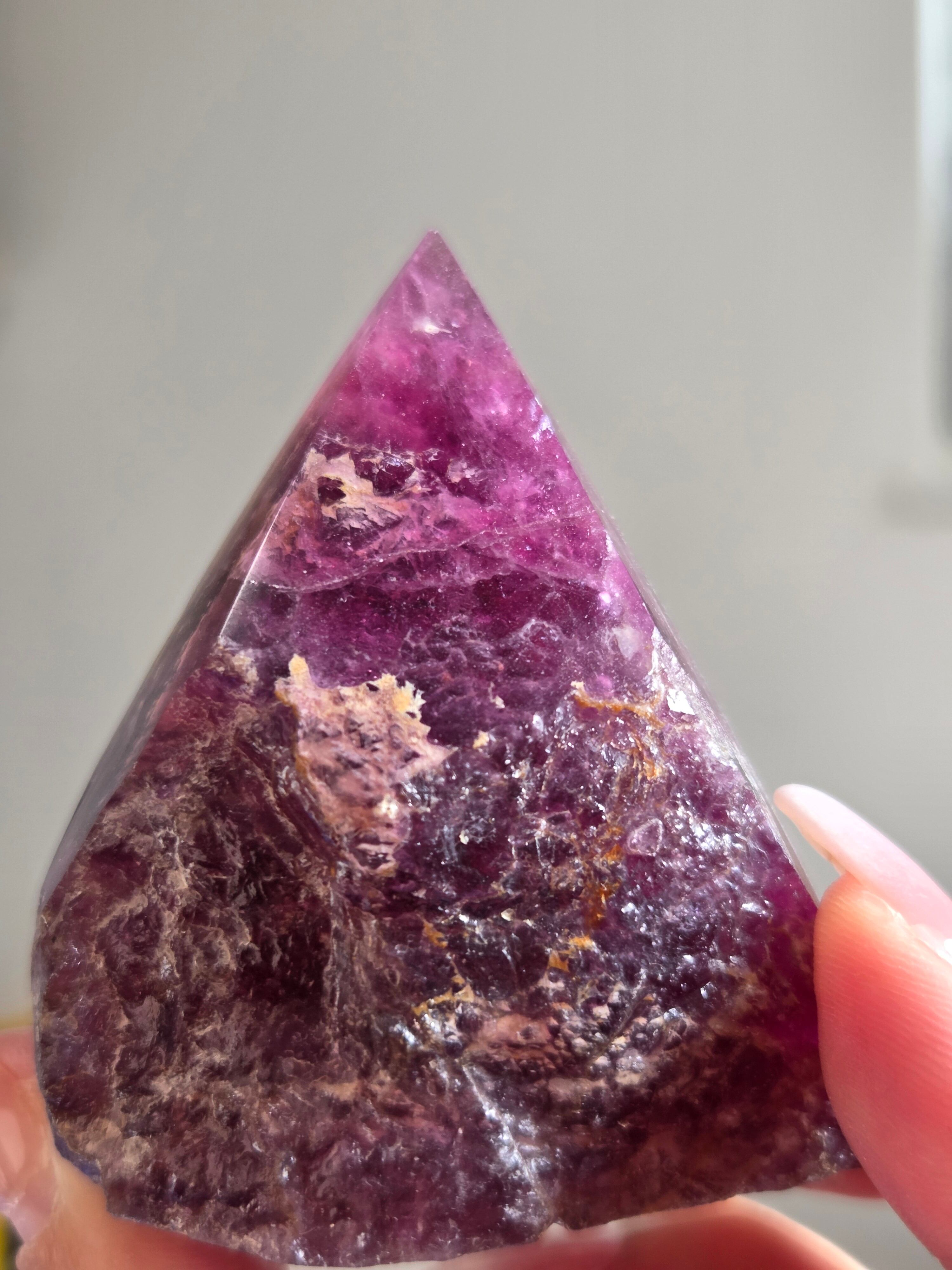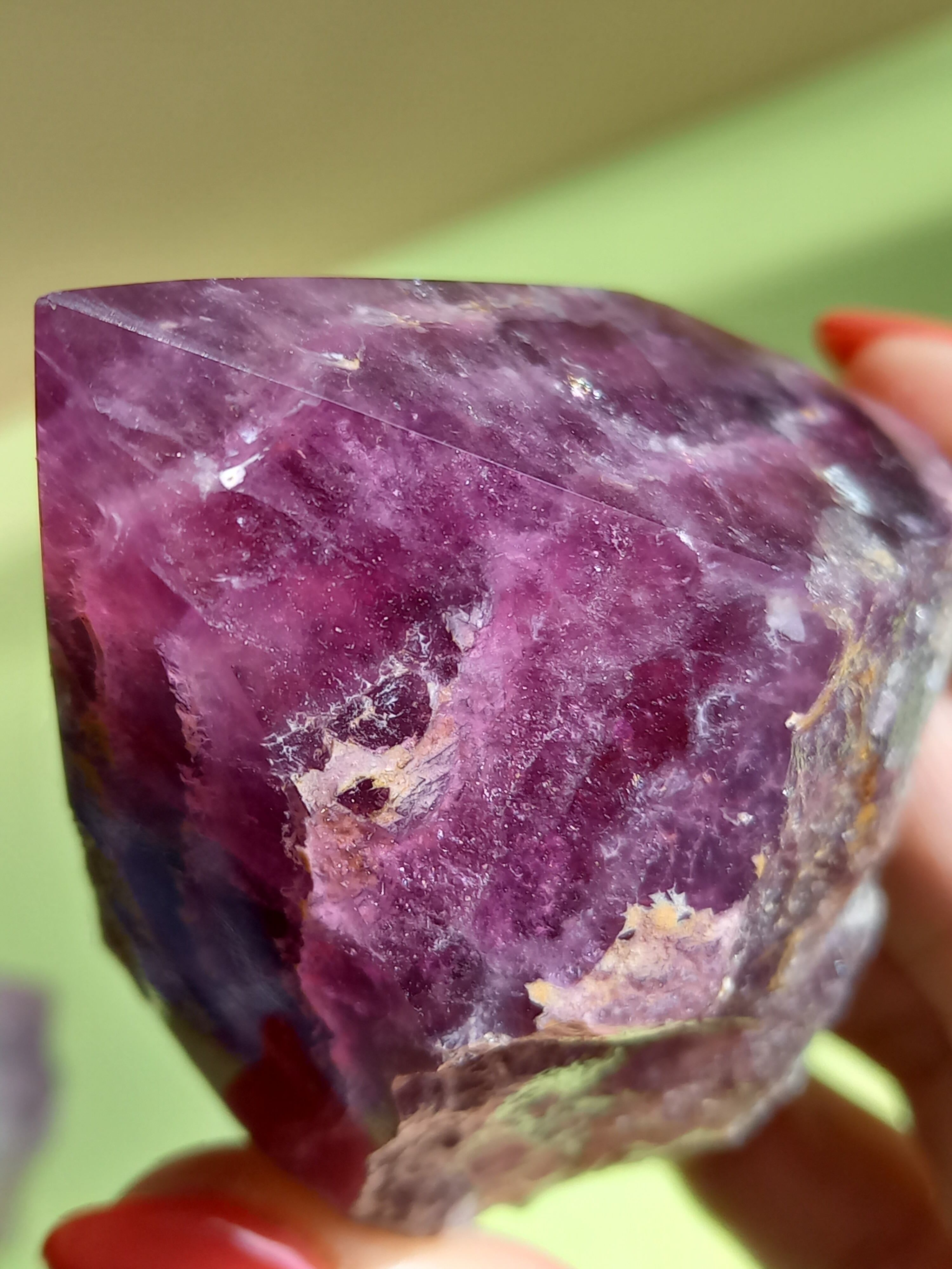フローライトの原石をダイヤ形にカットしてます。上部はポリッシュし、下の方はナチュラルです。