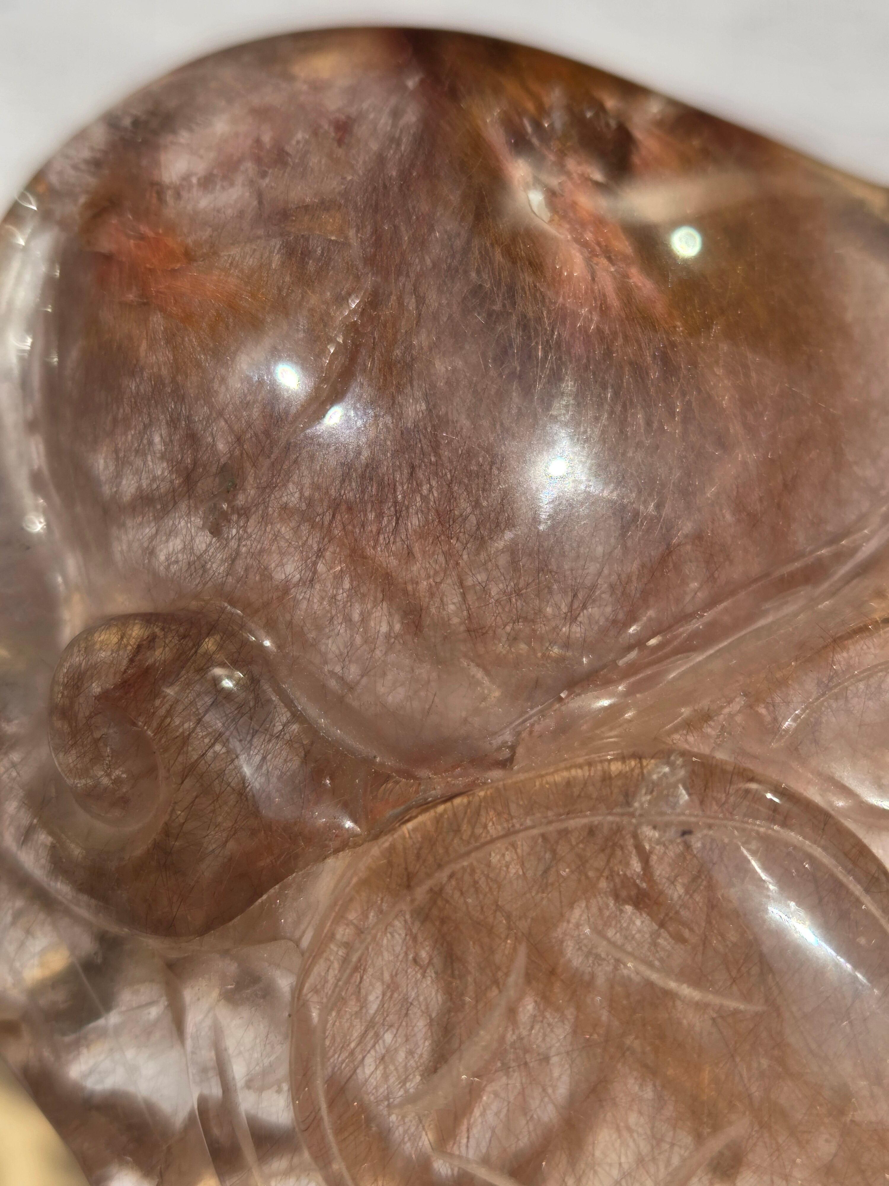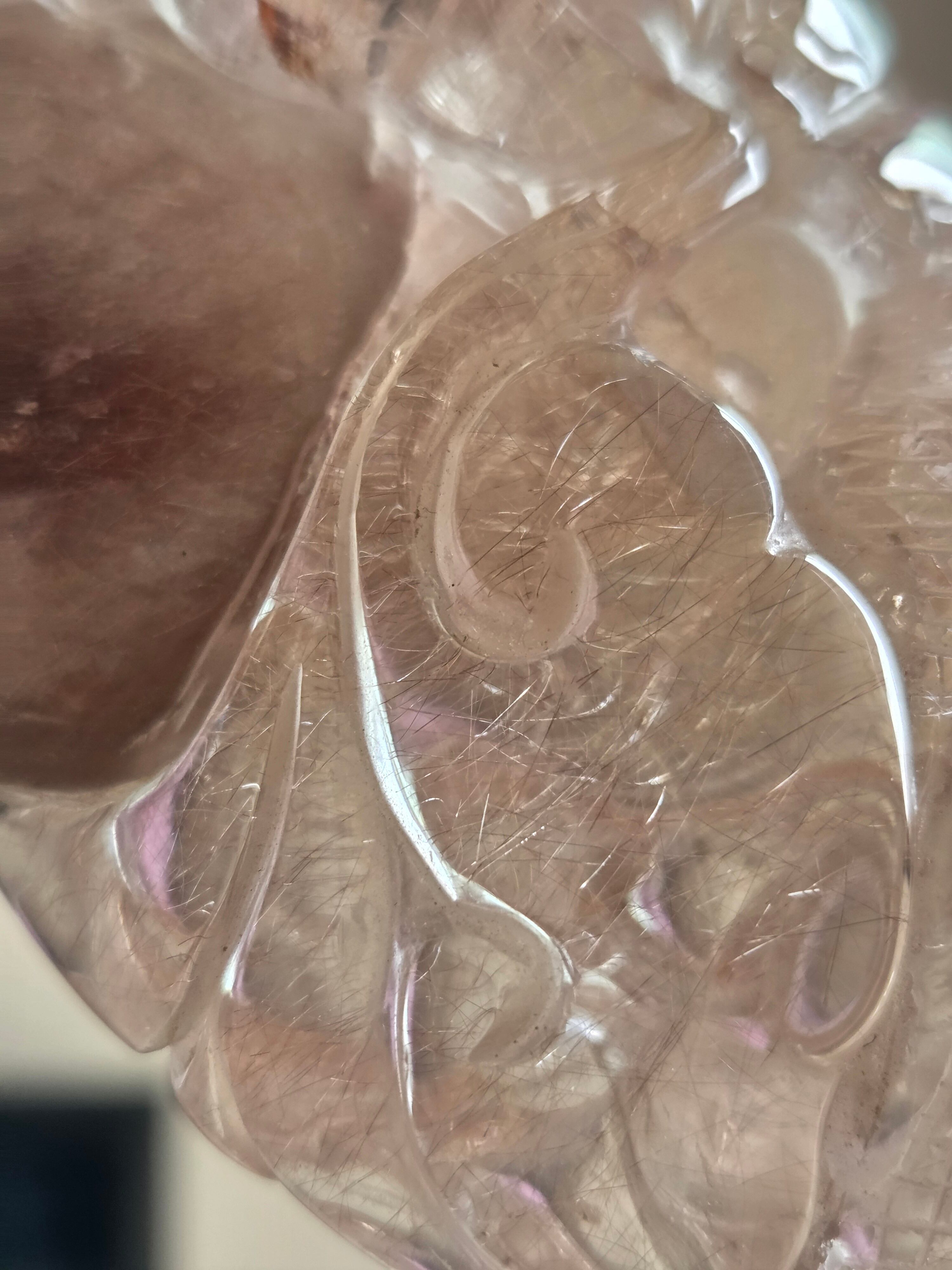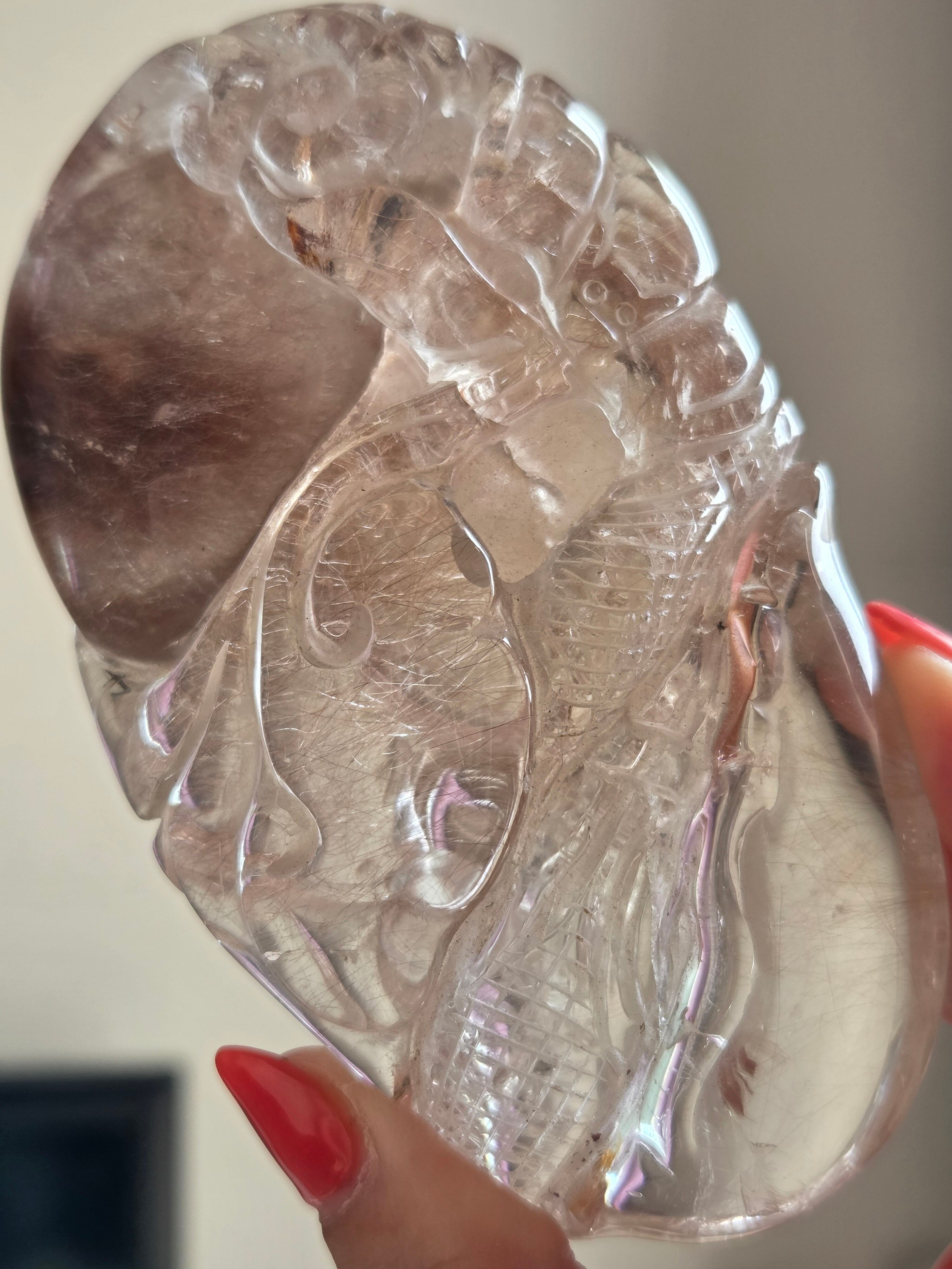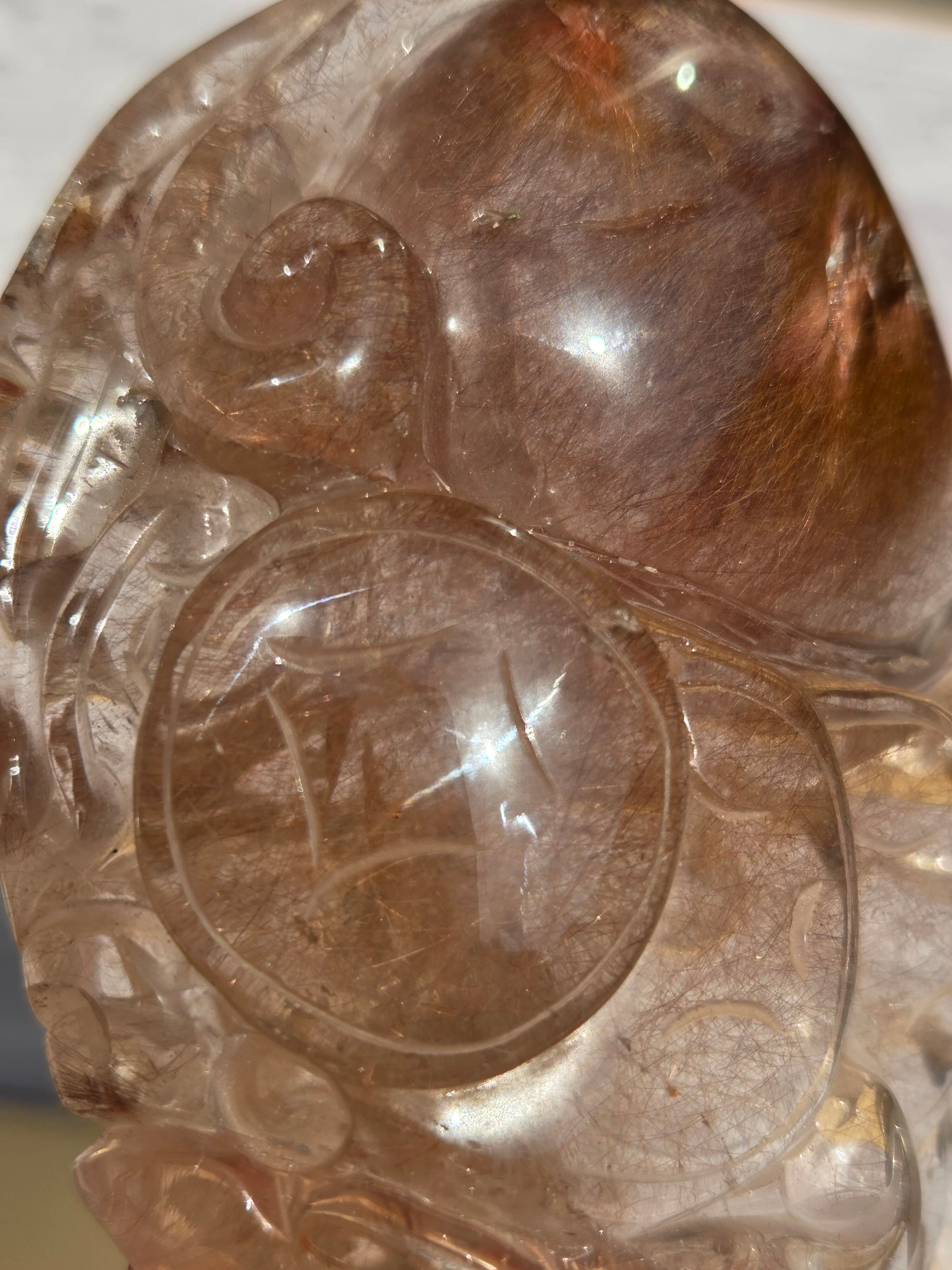 ピンクのふわふわラビットファールチルクォーツに、龍亀のイメージ彫をしてある置物です。