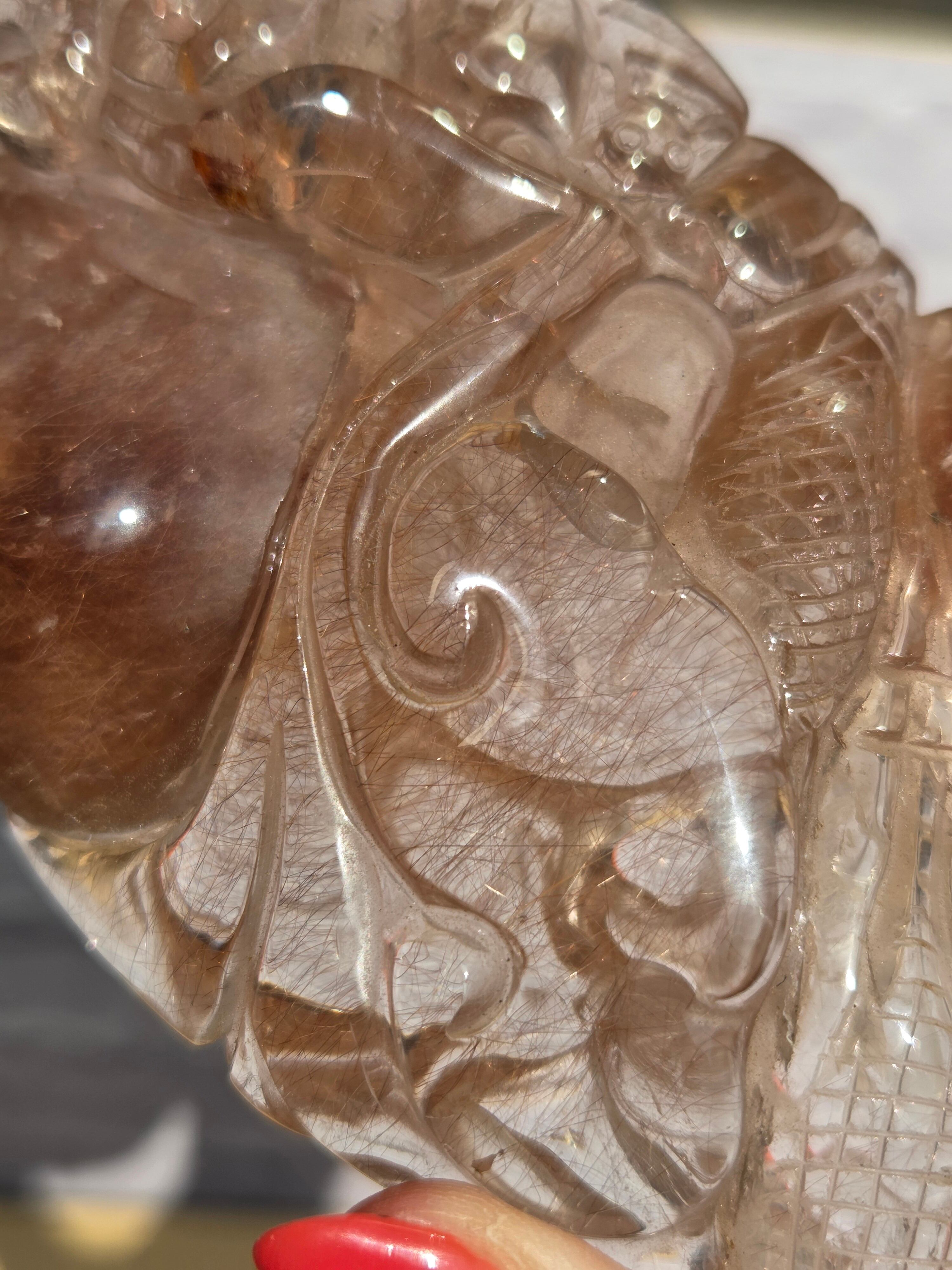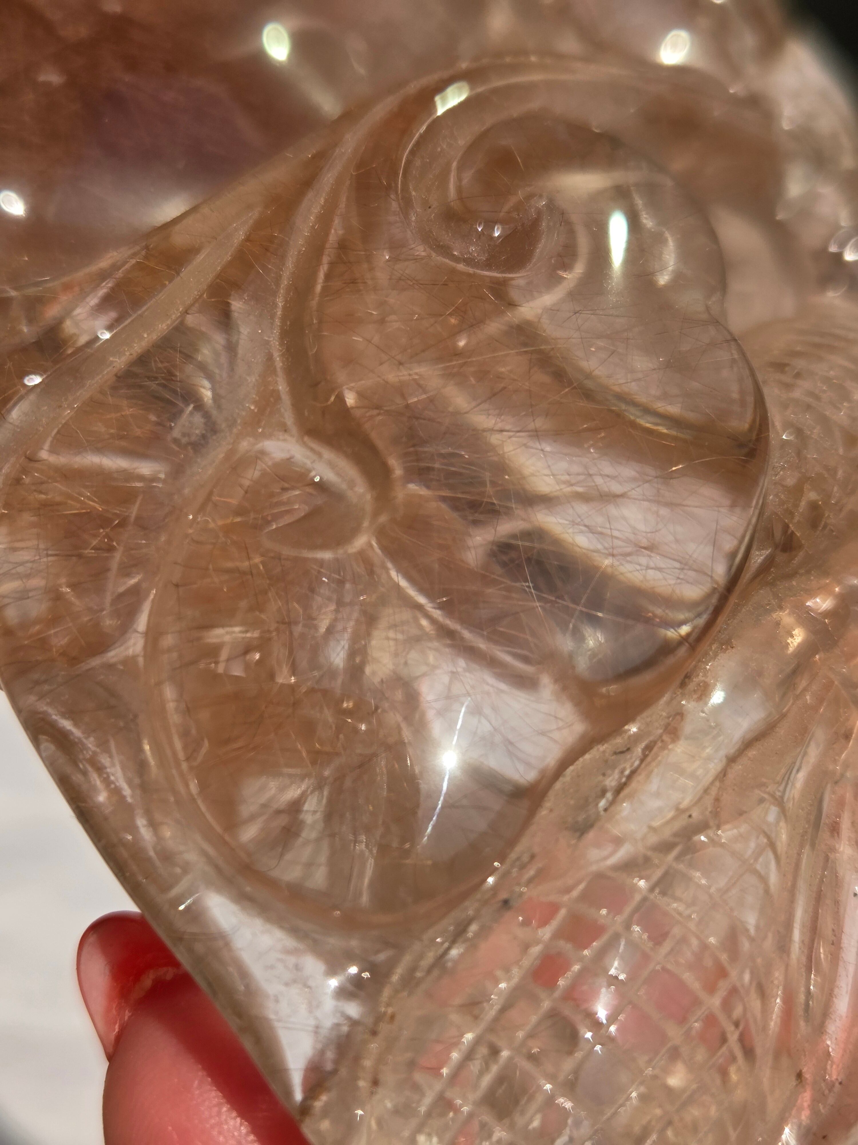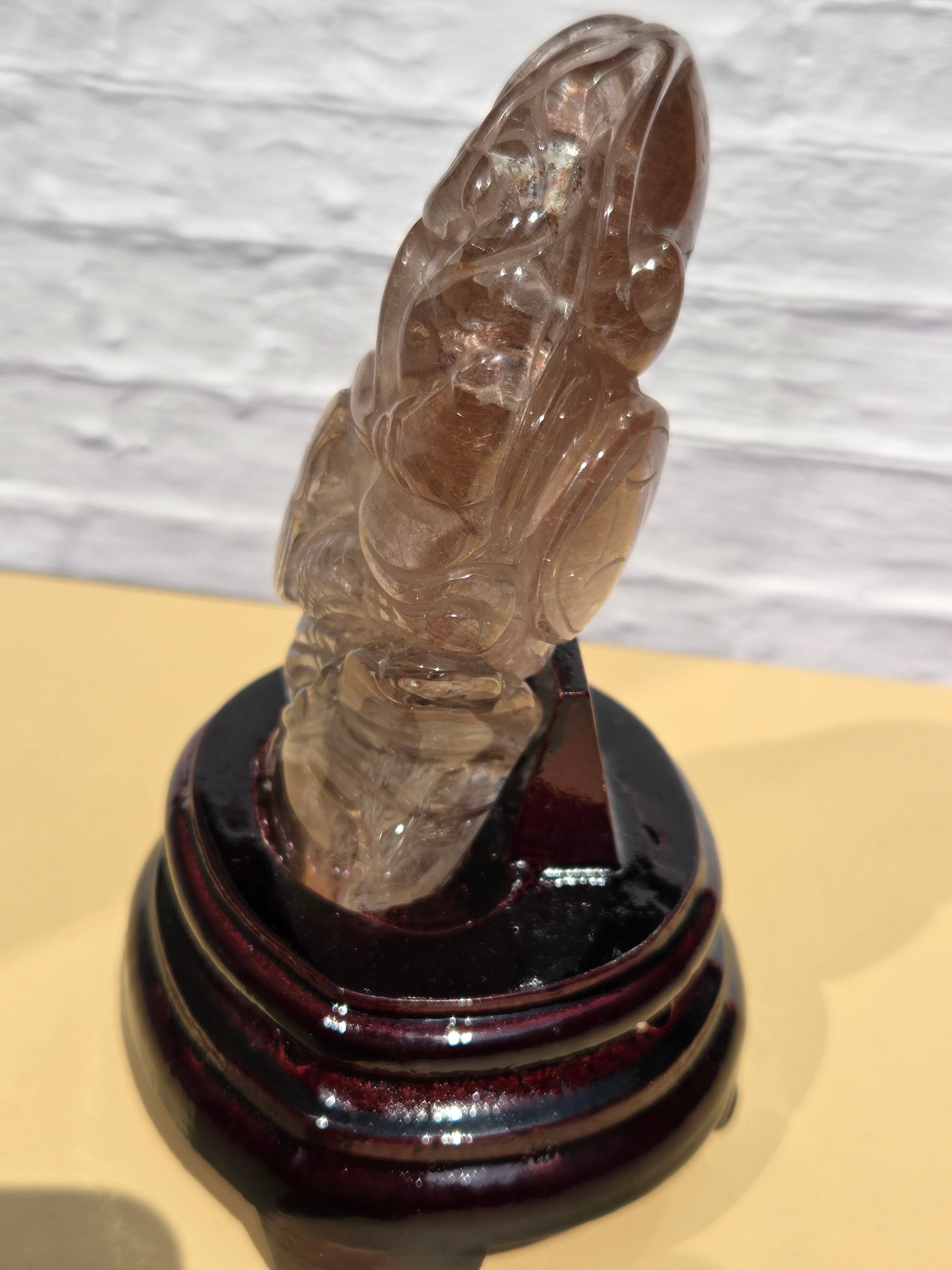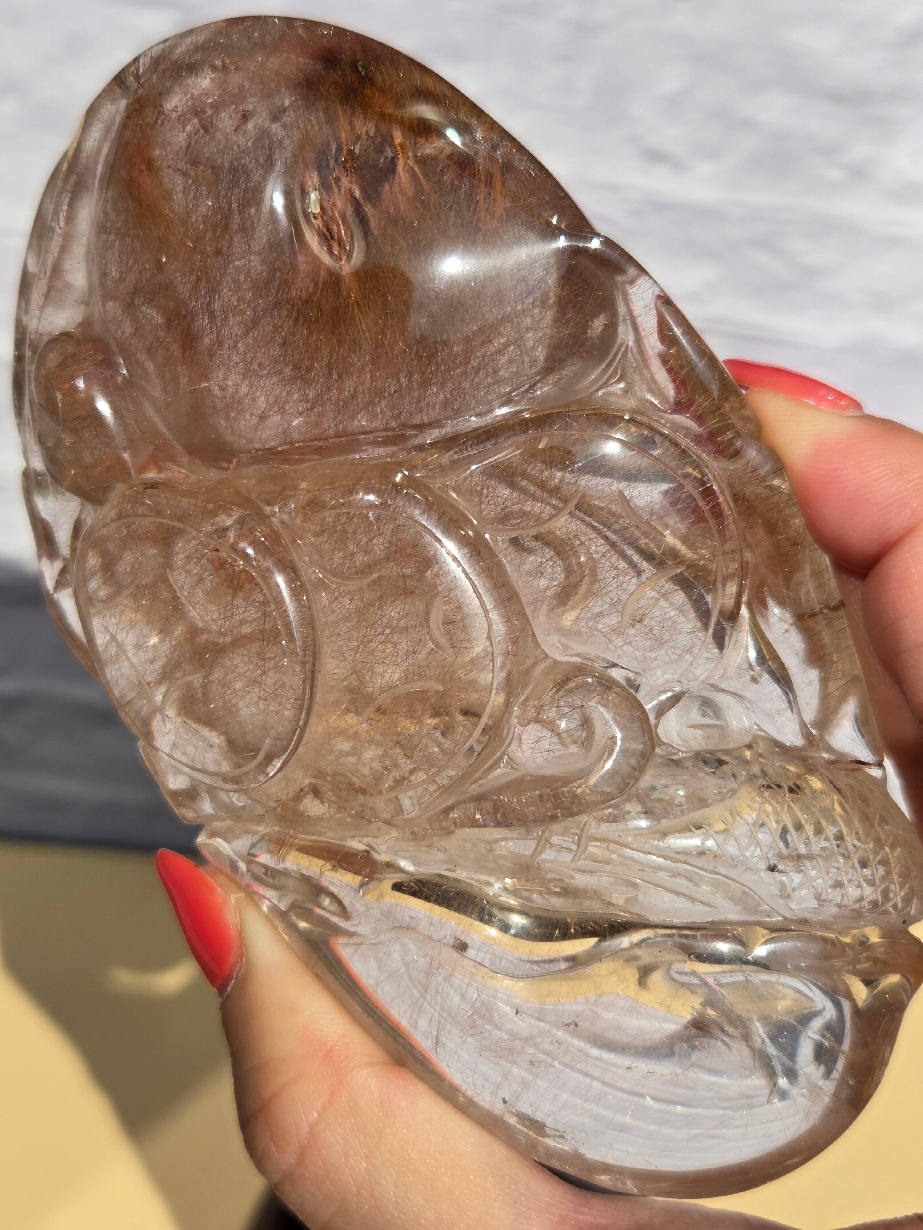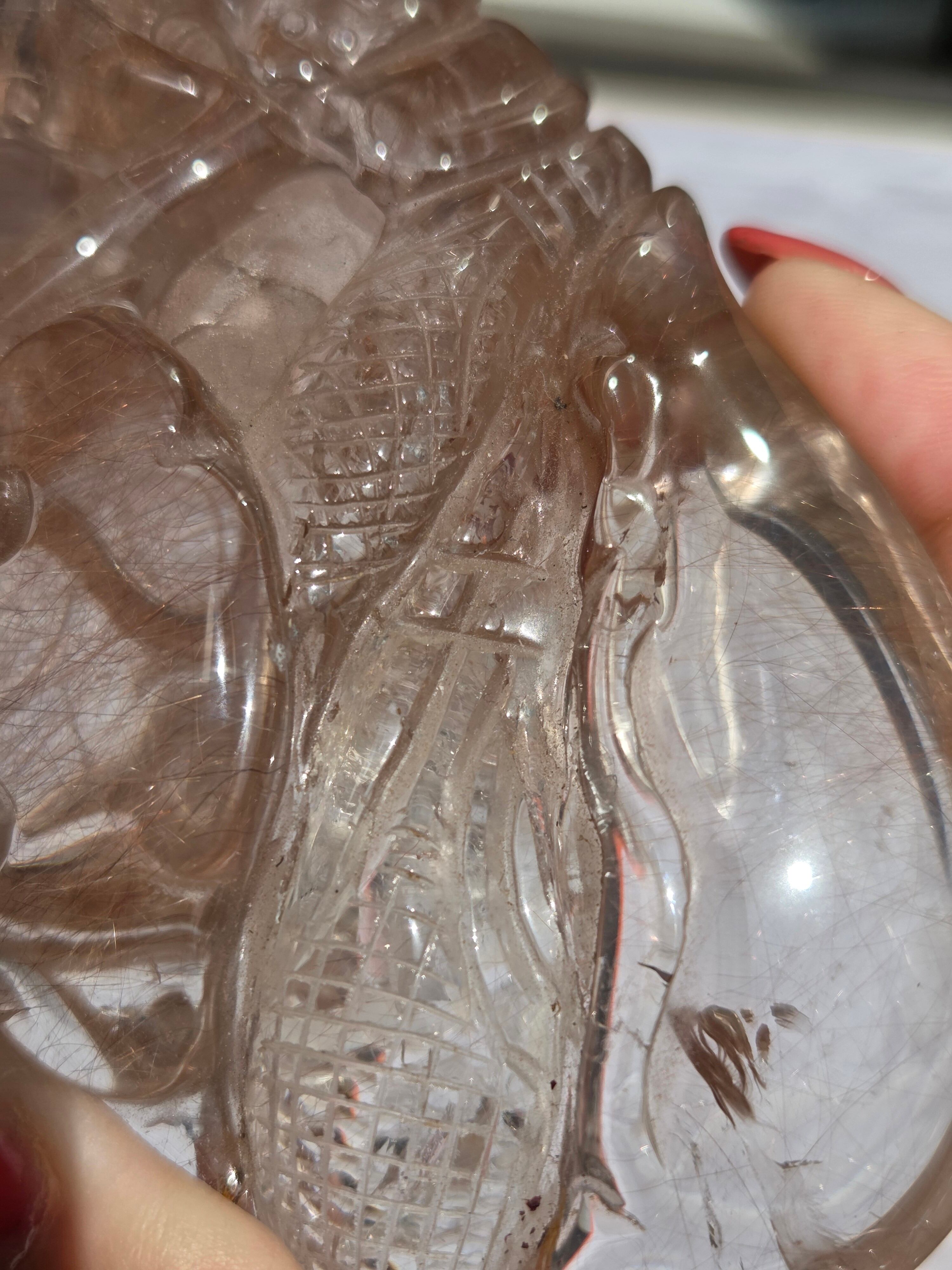 ピンクのふわふわラビットファールチルクォーツに、龍亀のイメージ彫をしてある置物です。