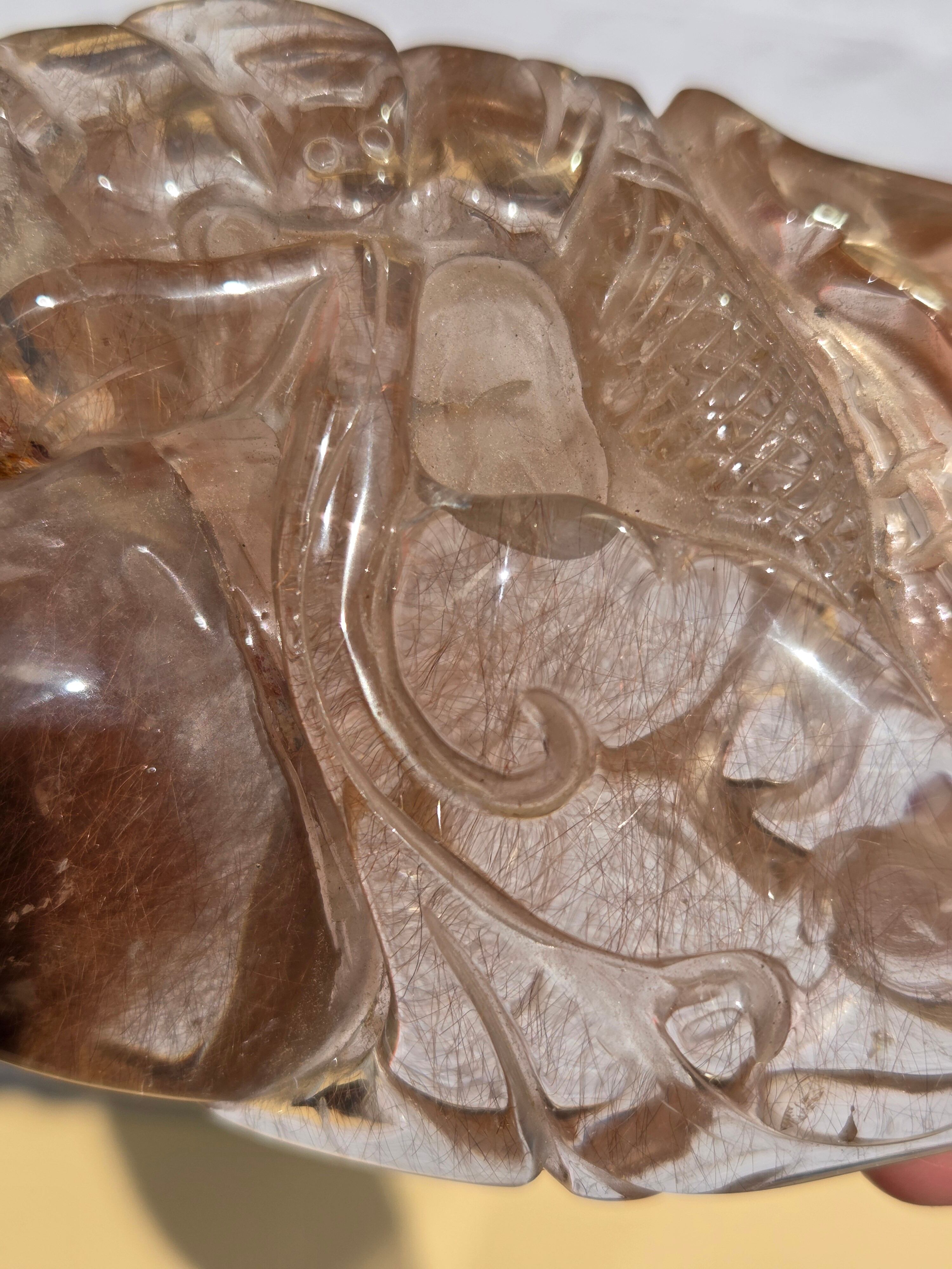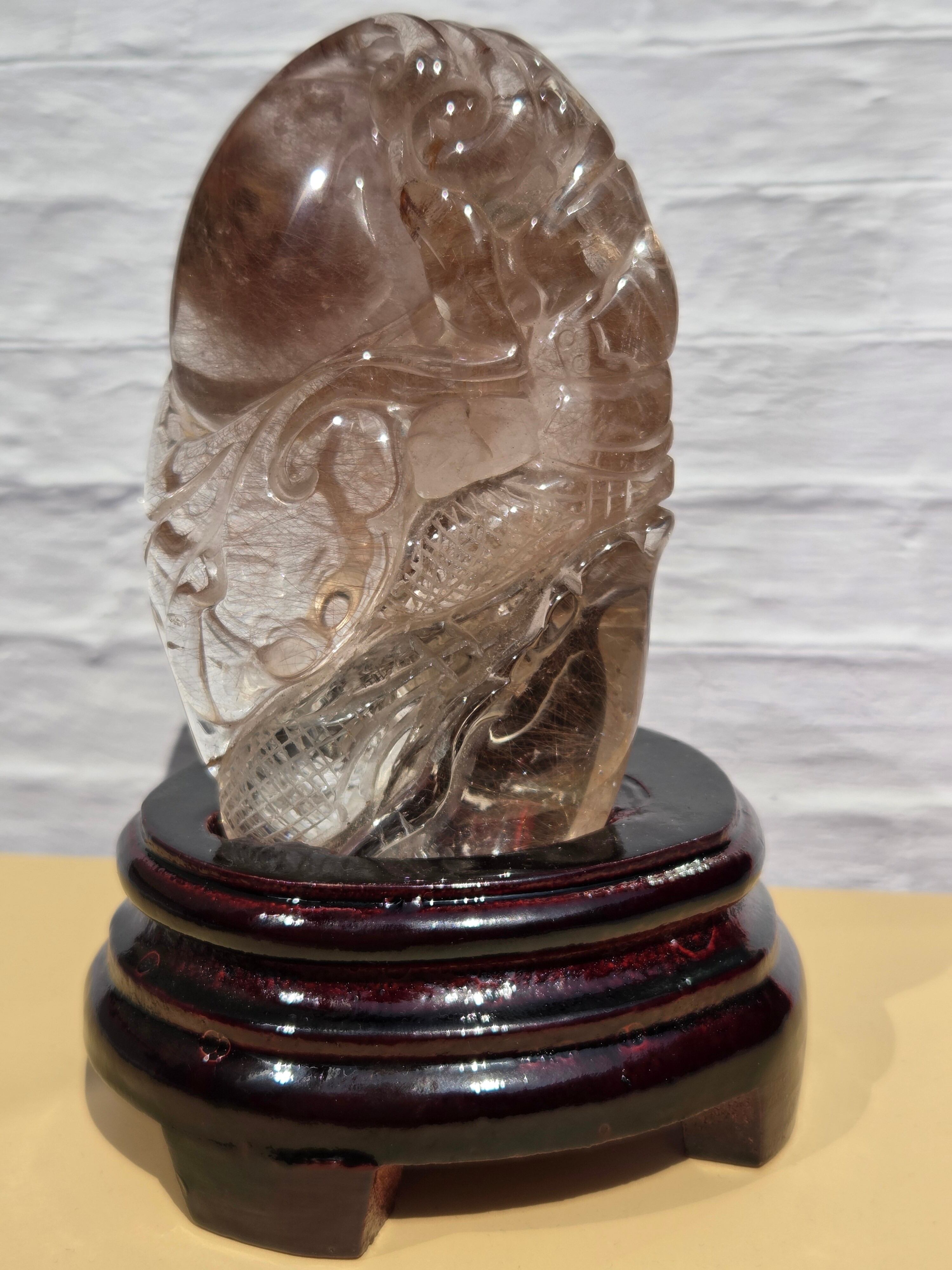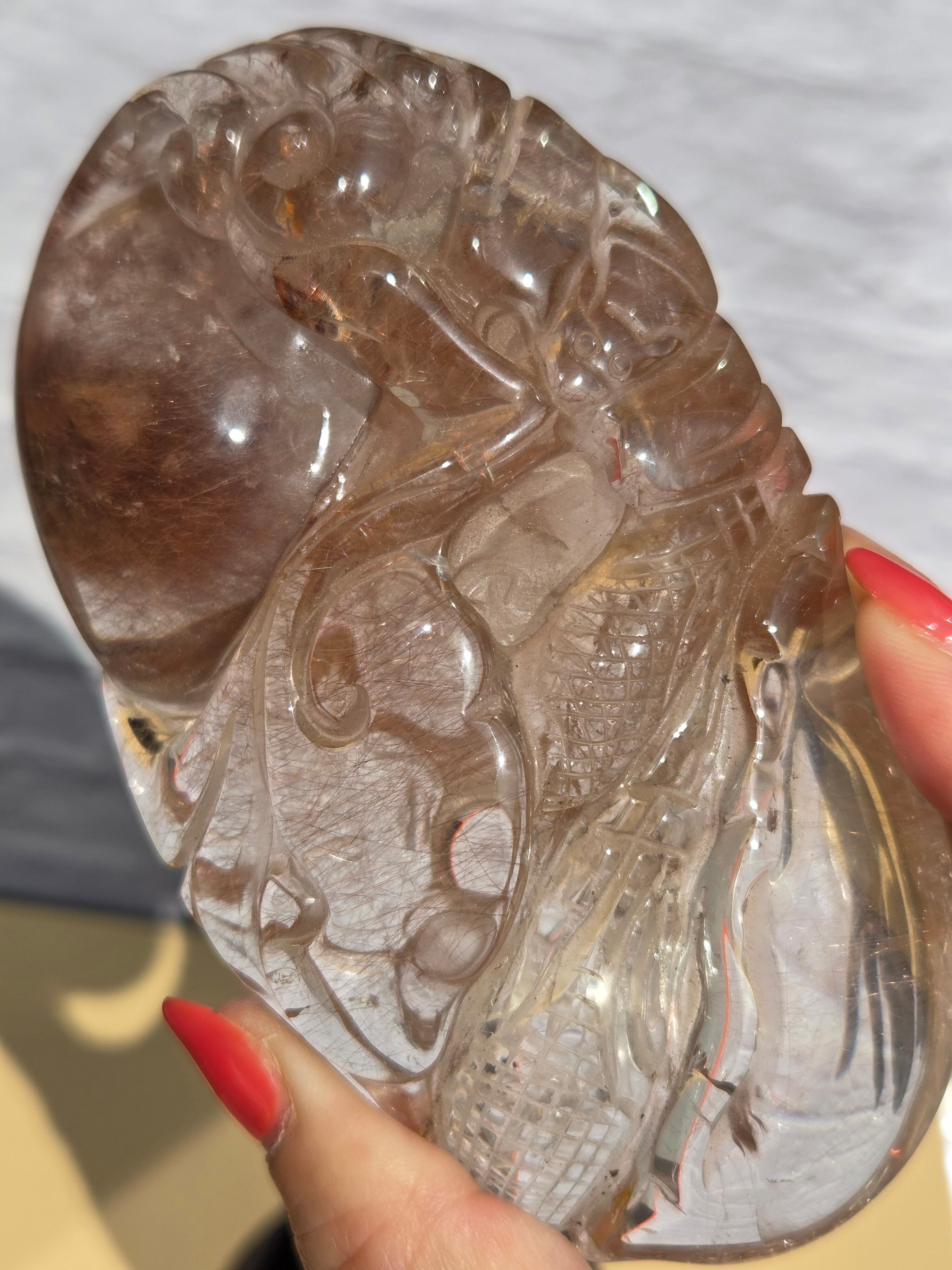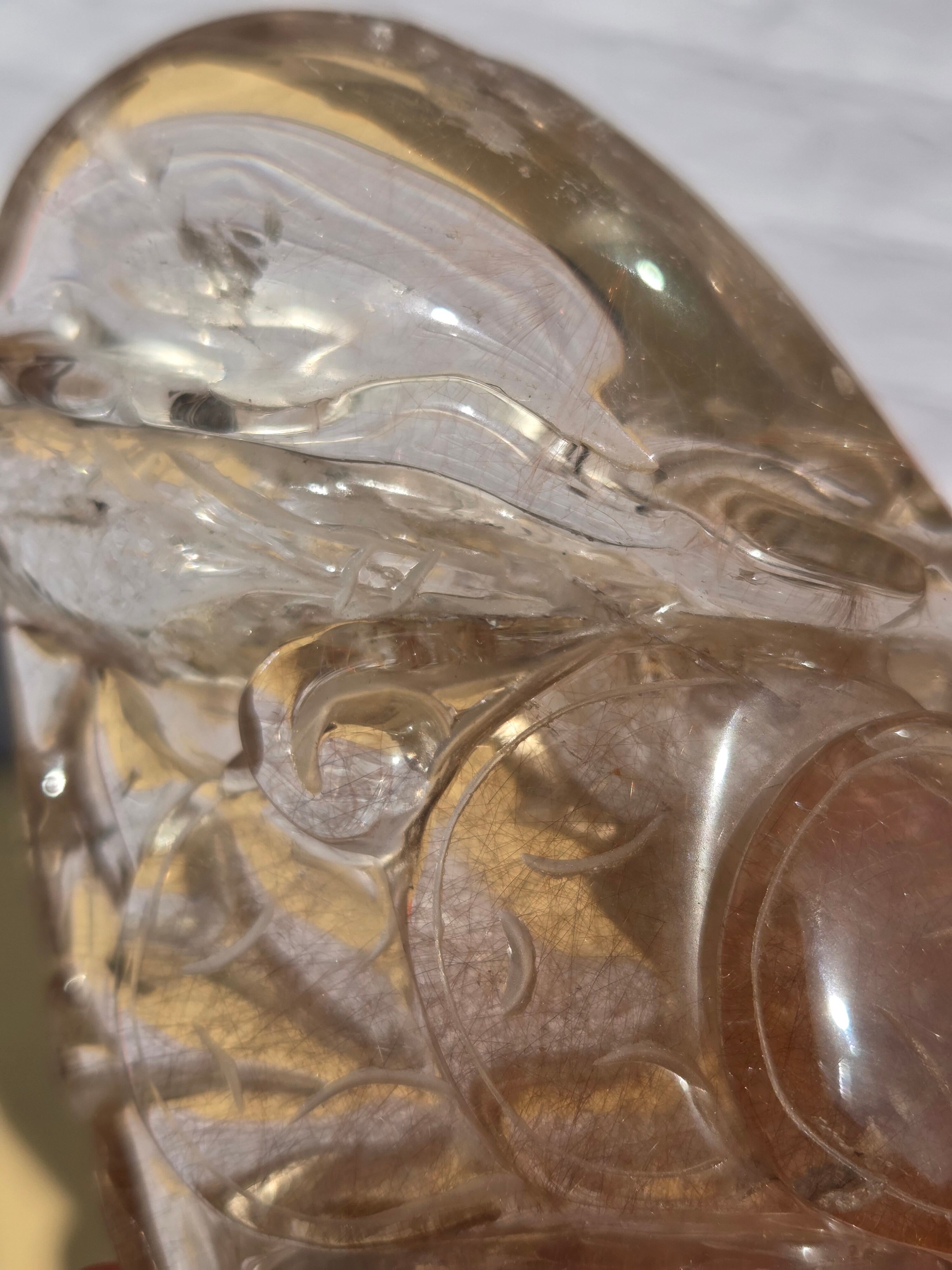 ピンクのふわふわラビットファールチルクォーツに、龍亀のイメージ彫をしてある置物です。