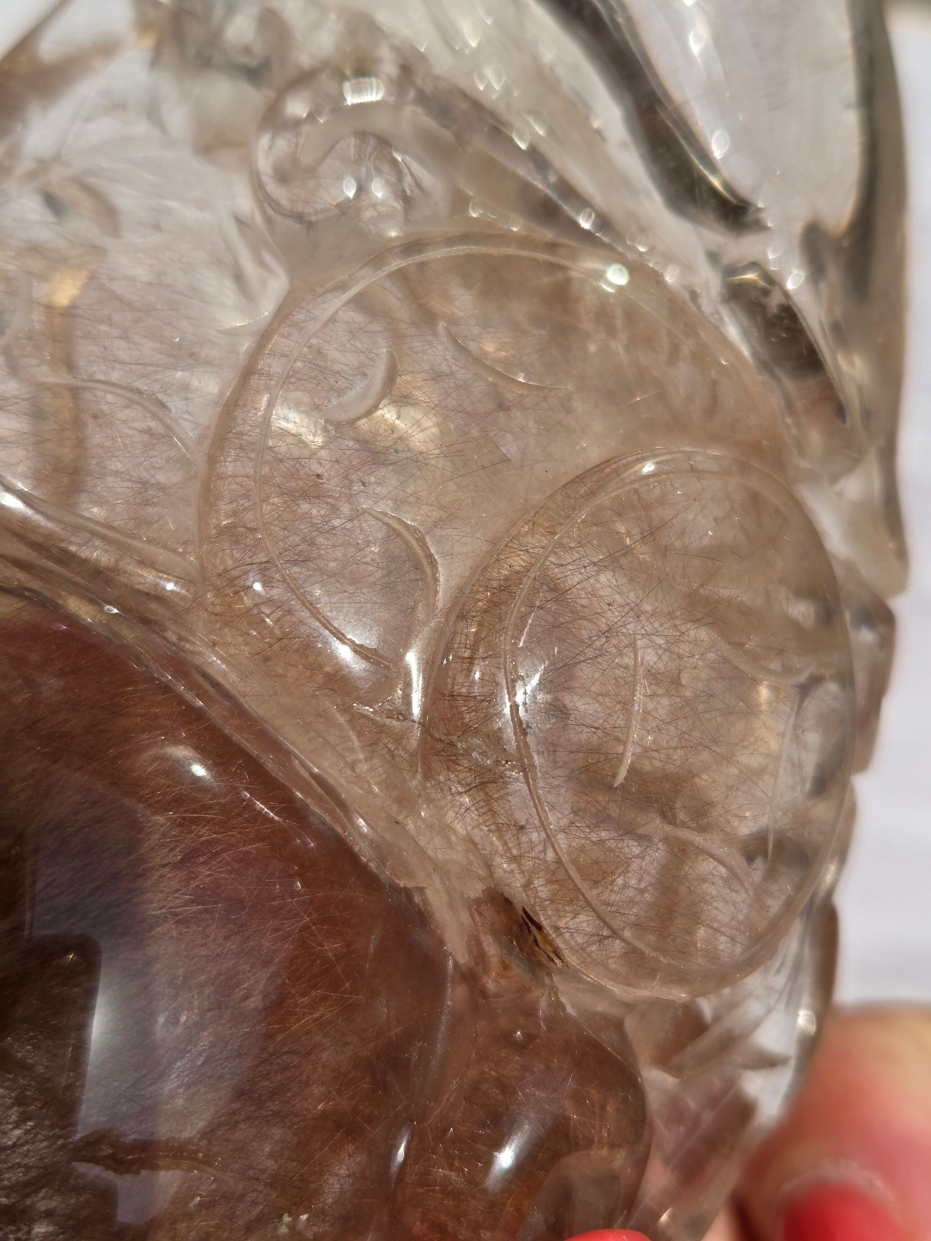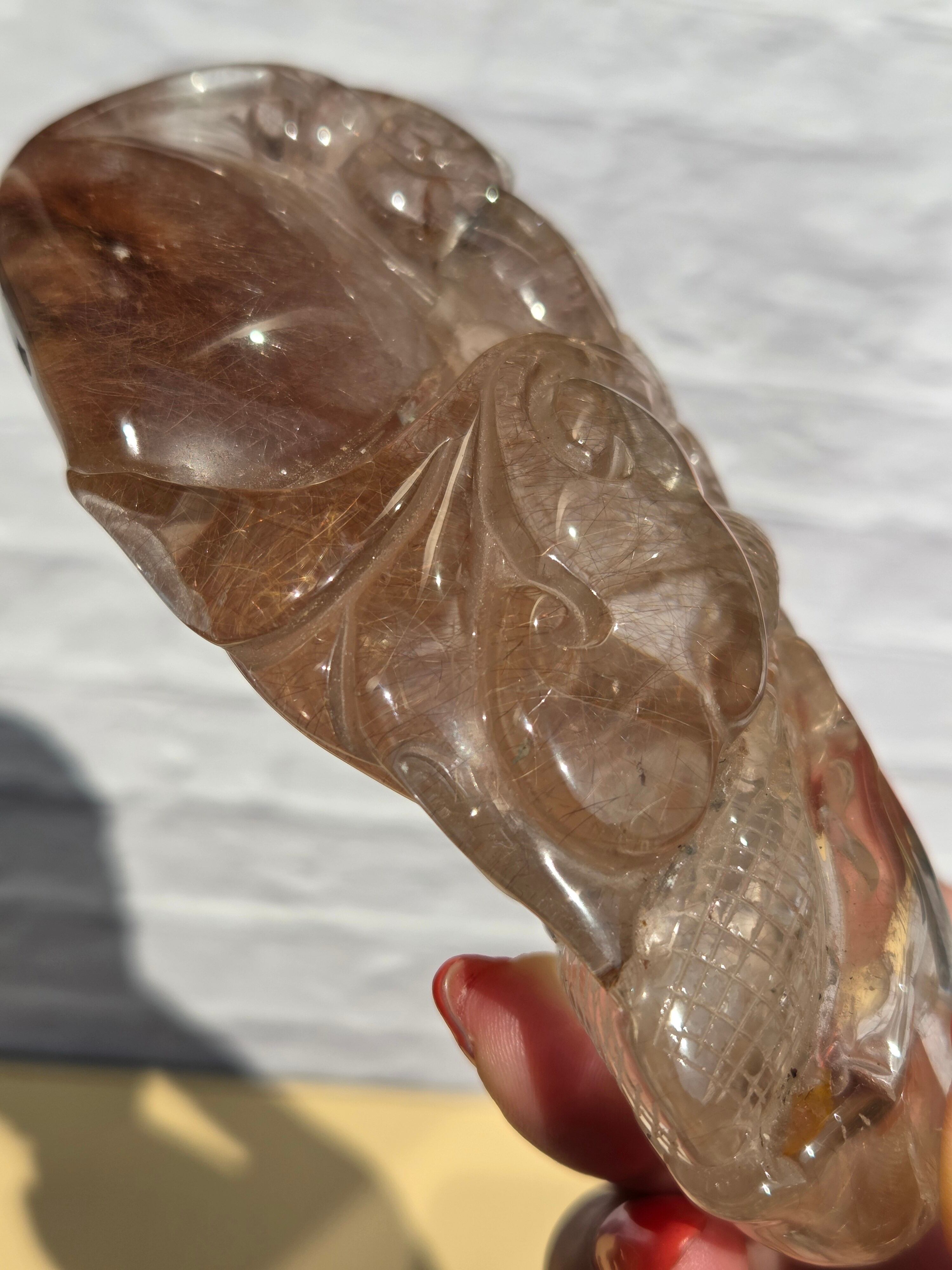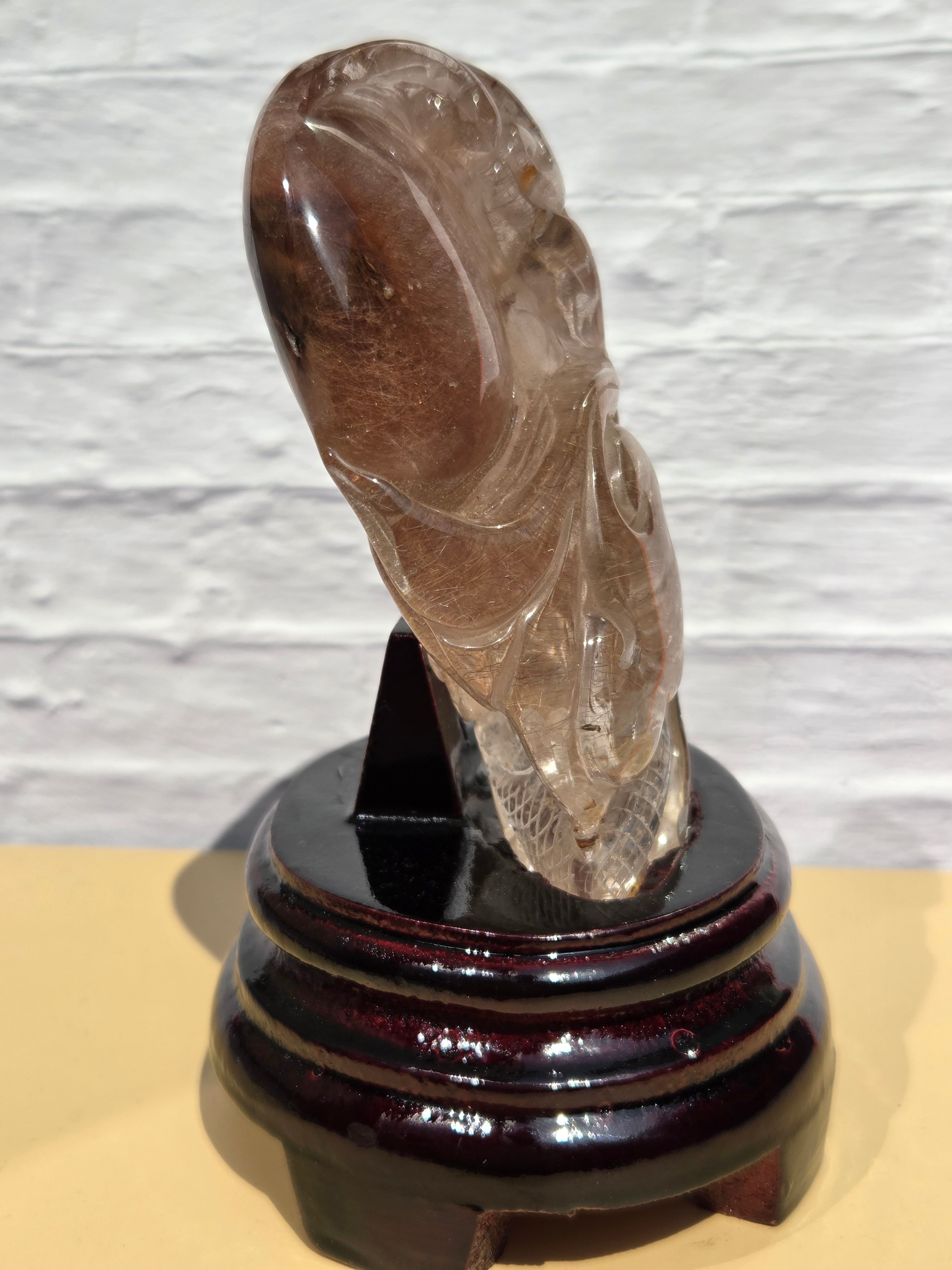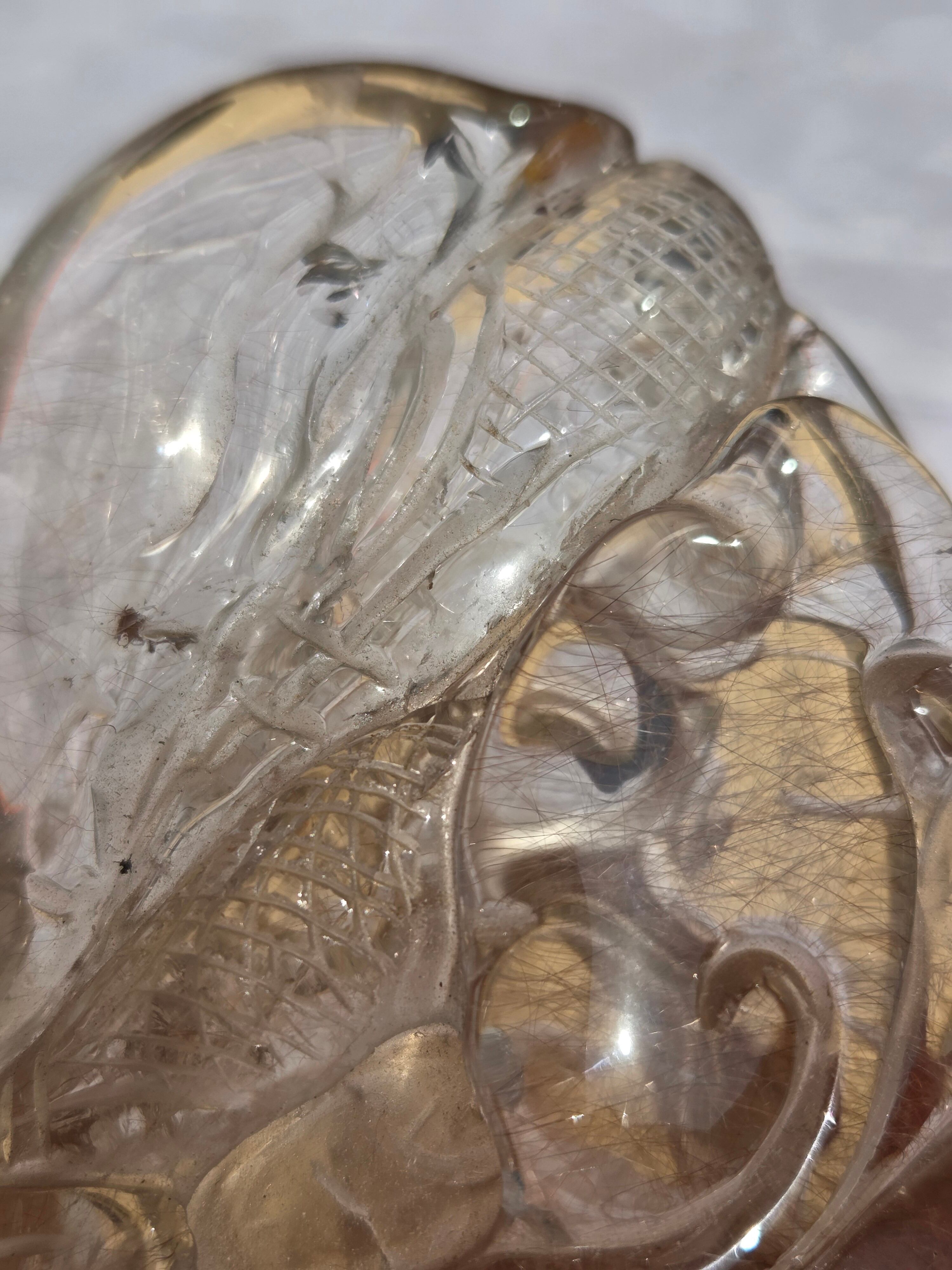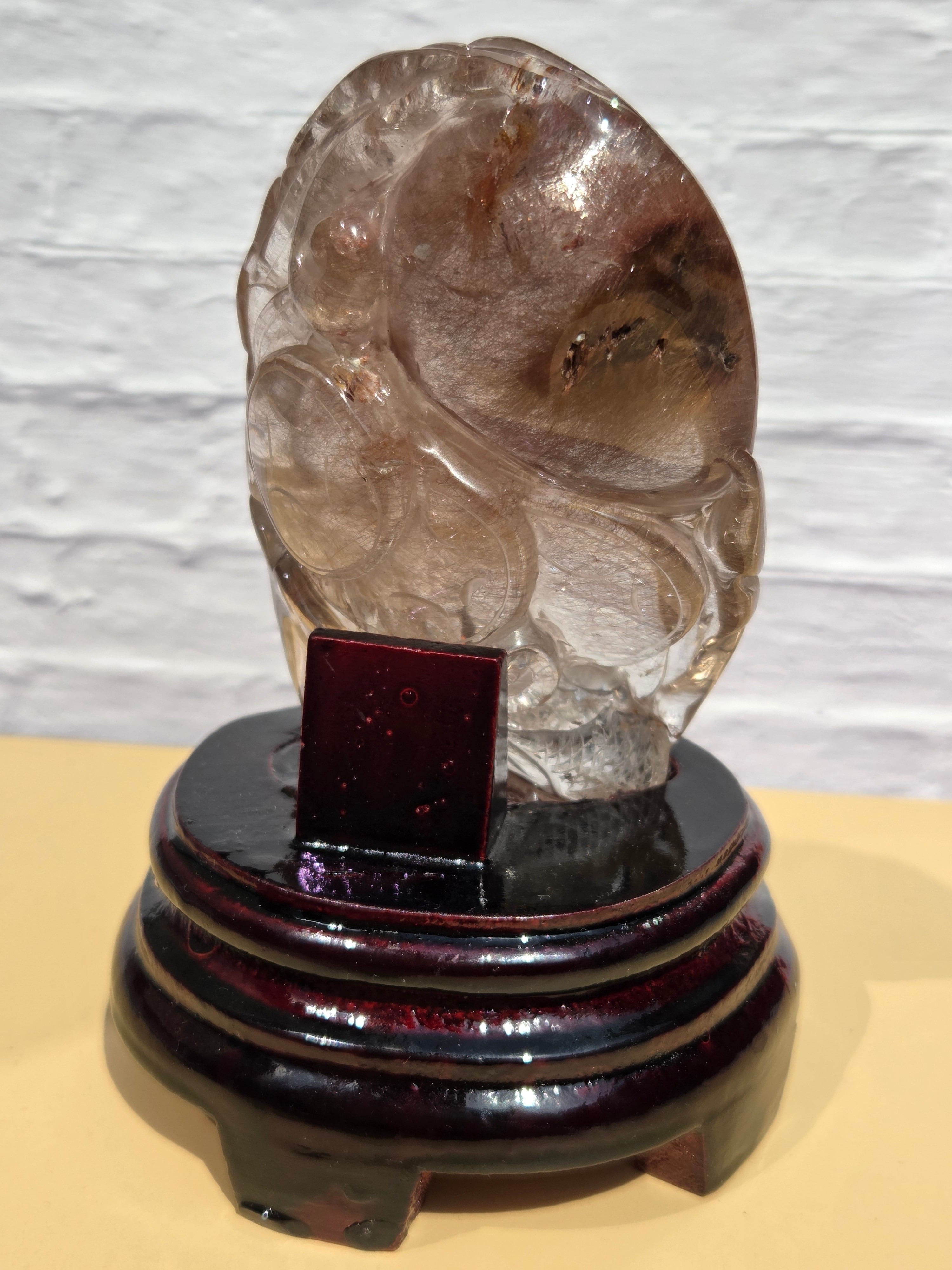 ピンクのふわふわラビットファールチルクォーツに、龍亀のイメージ彫をしてある置物です。