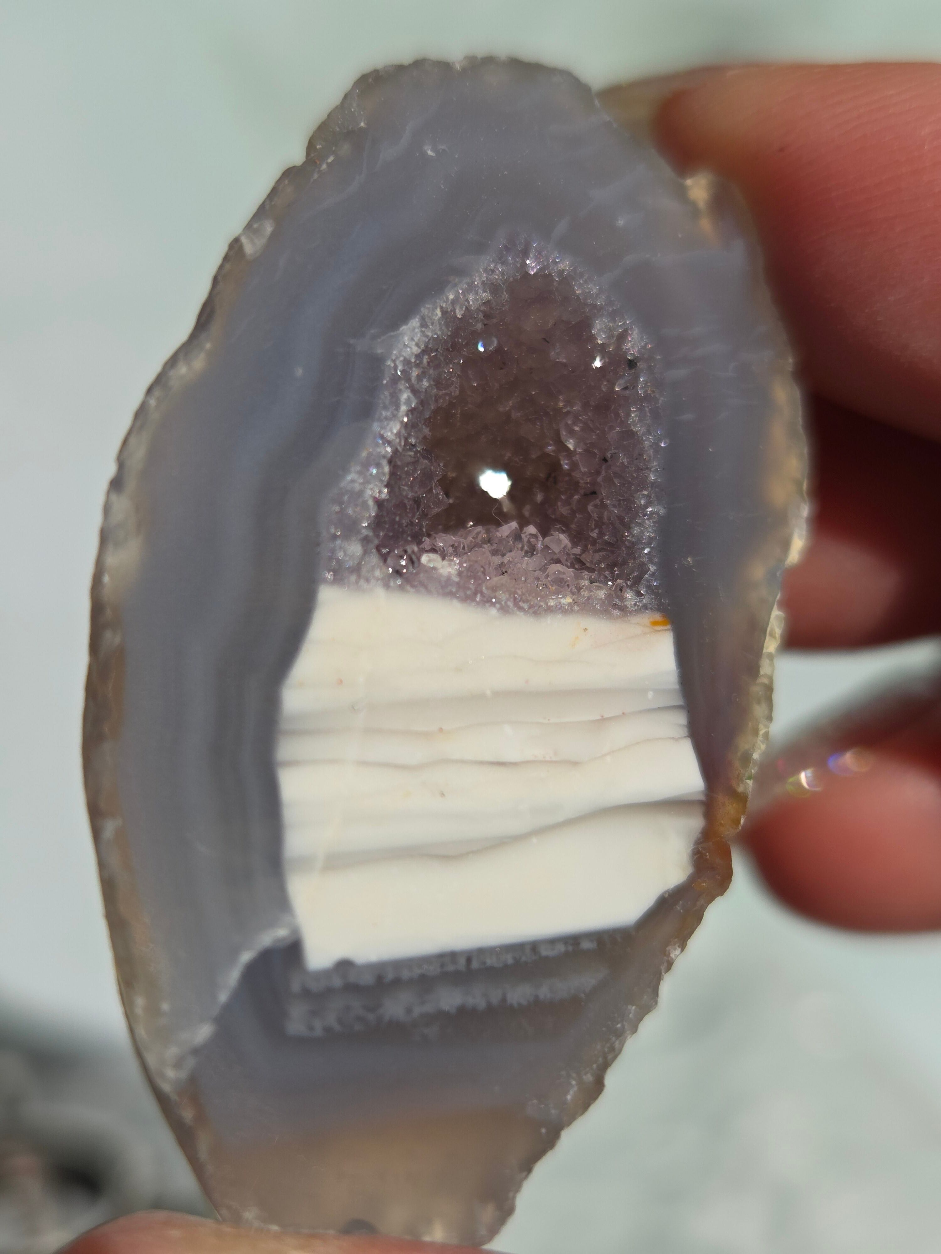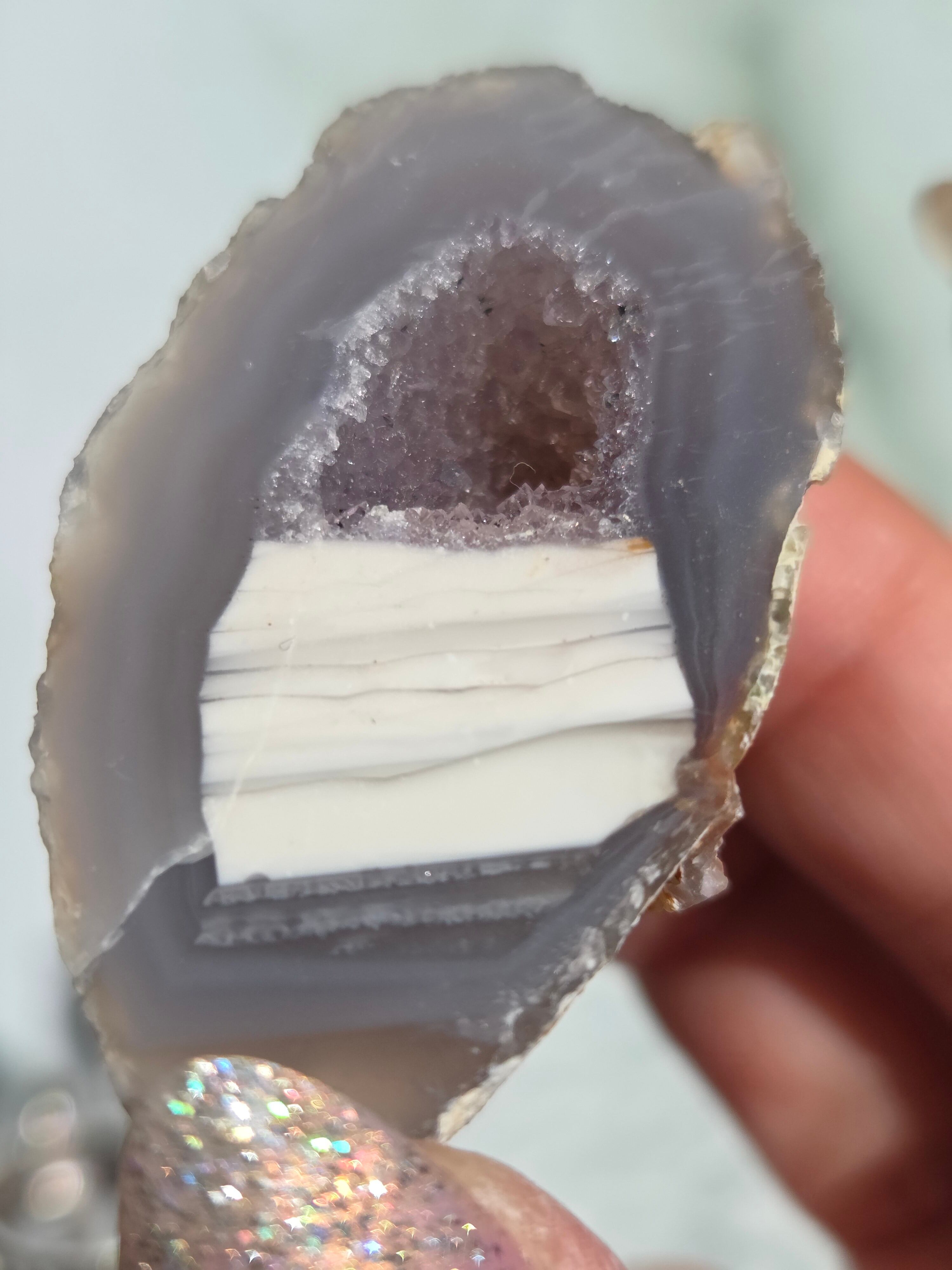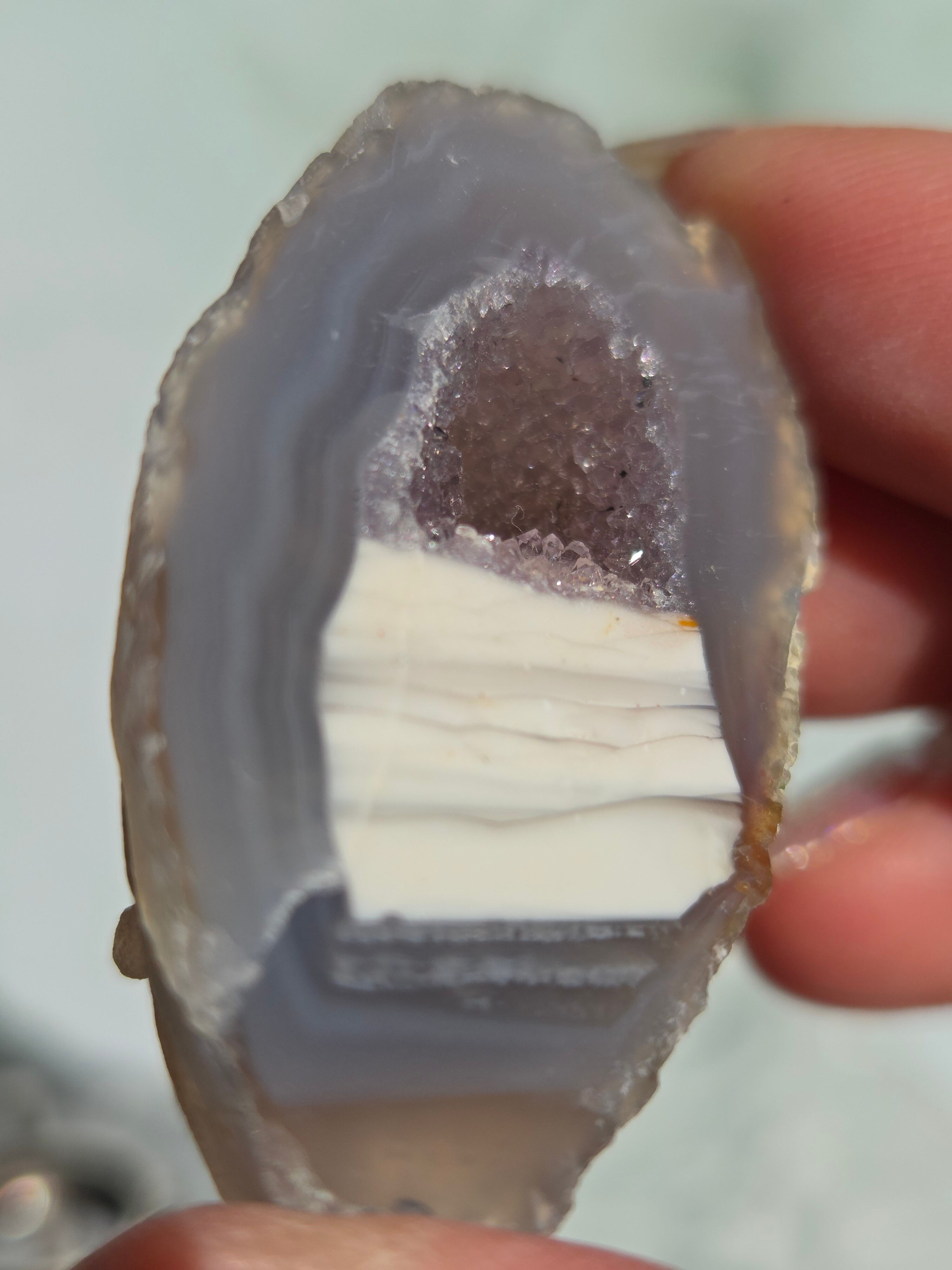 塊状のアゲート(瑪瑙)の原石を2つに切断したものです。 この瑪瑙の中にはジオード(晶洞:Geode)という空洞があり内側へと成長しようとしている結晶が見えます。