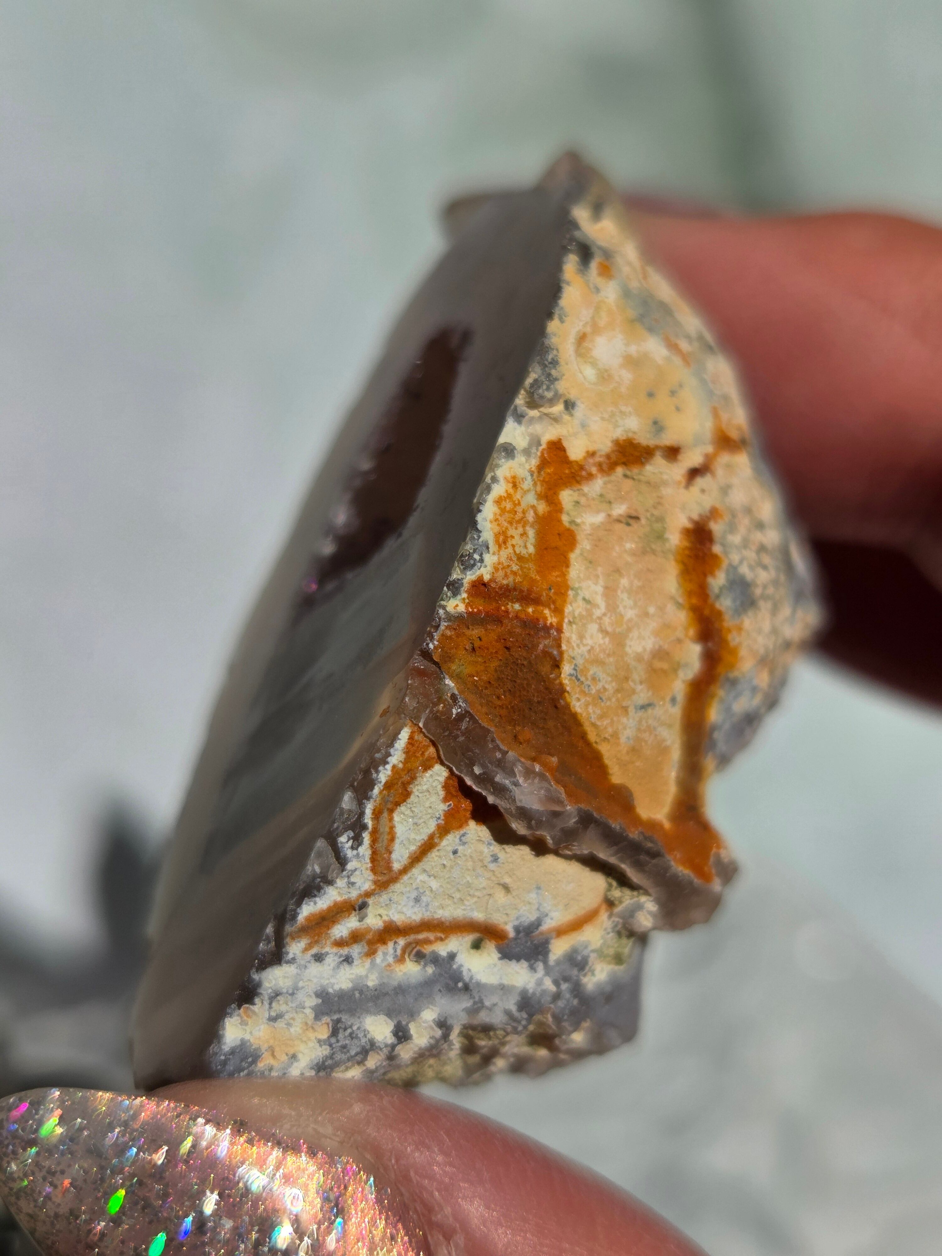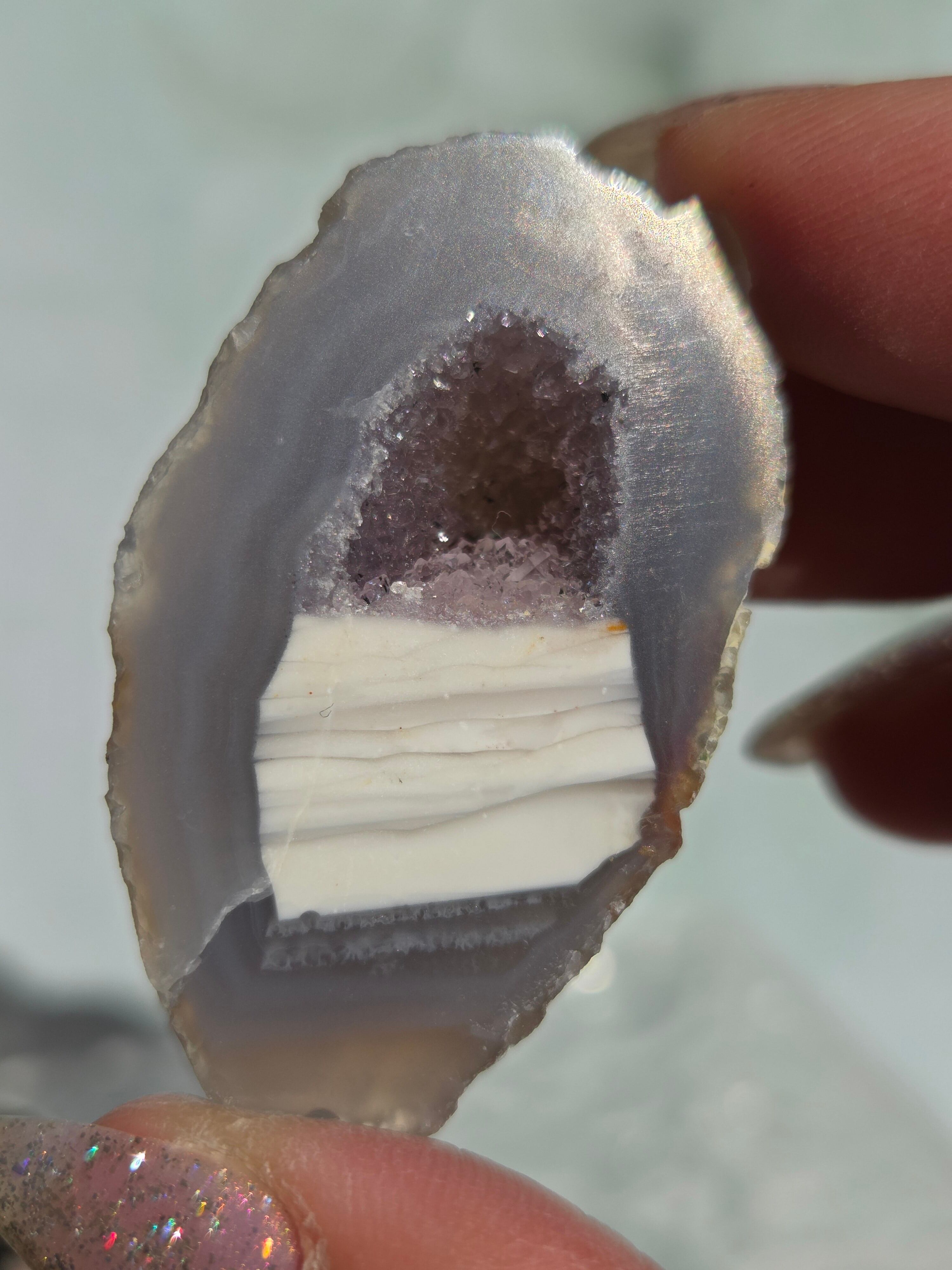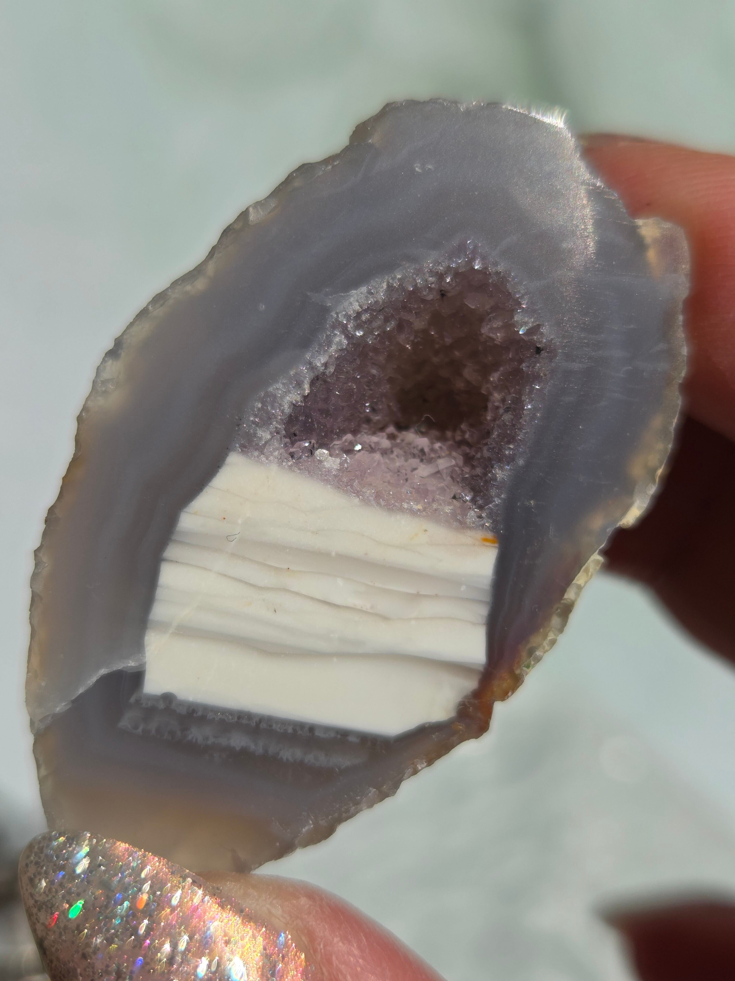 塊状のアゲート(瑪瑙)の原石を2つに切断したものです。 この瑪瑙の中にはジオード(晶洞:Geode)という空洞があり内側へと成長しようとしている結晶が見えます。
