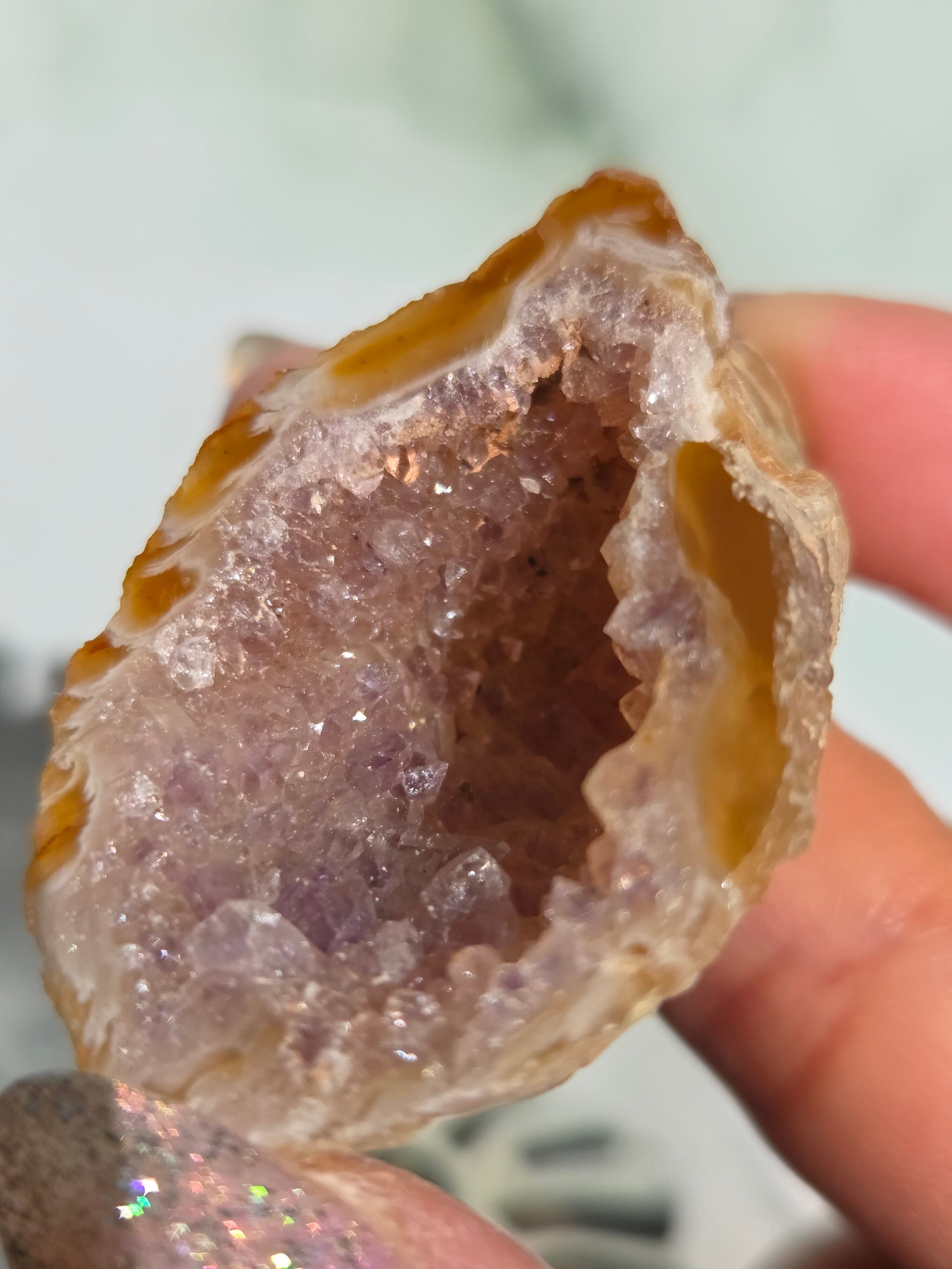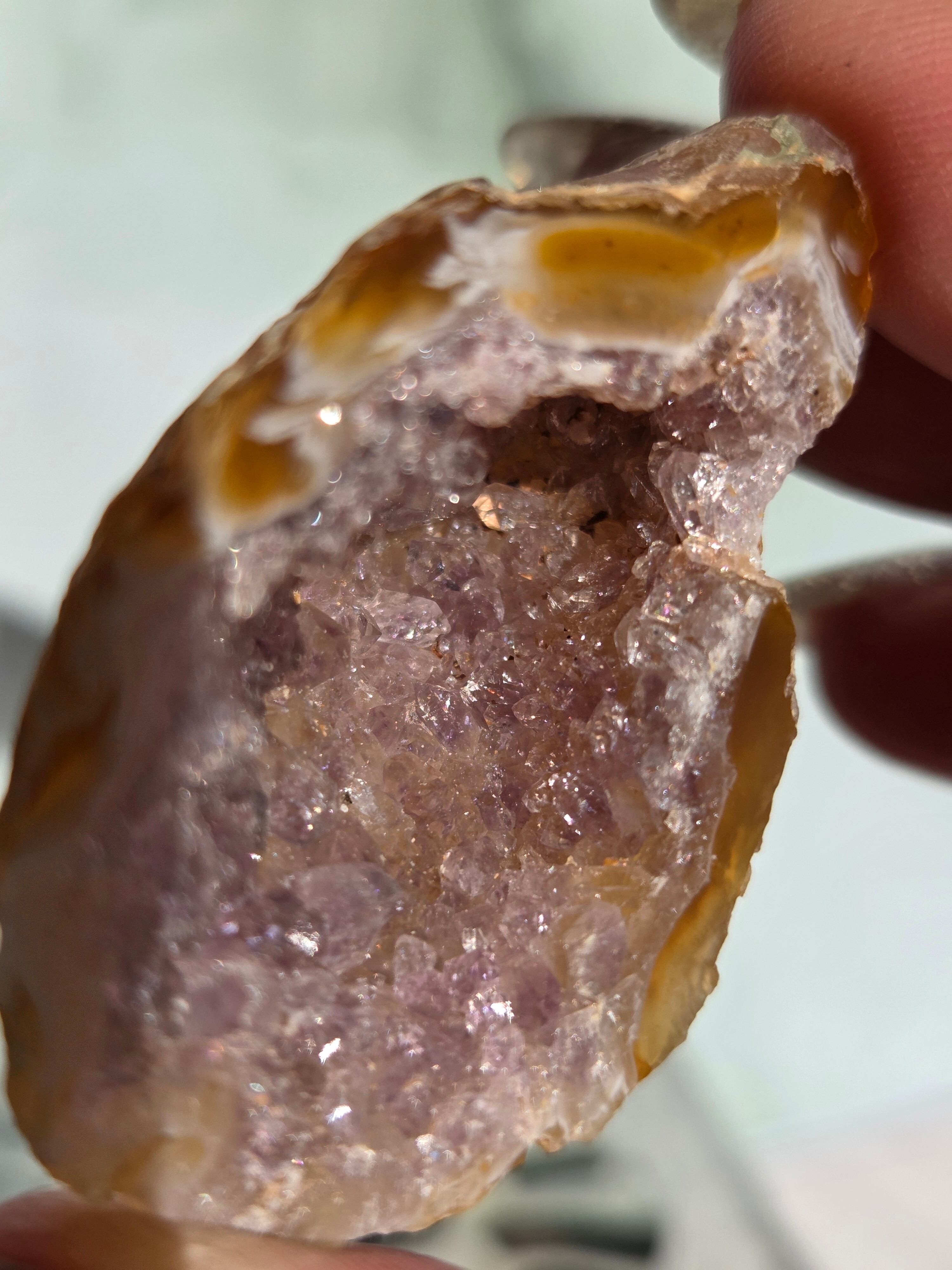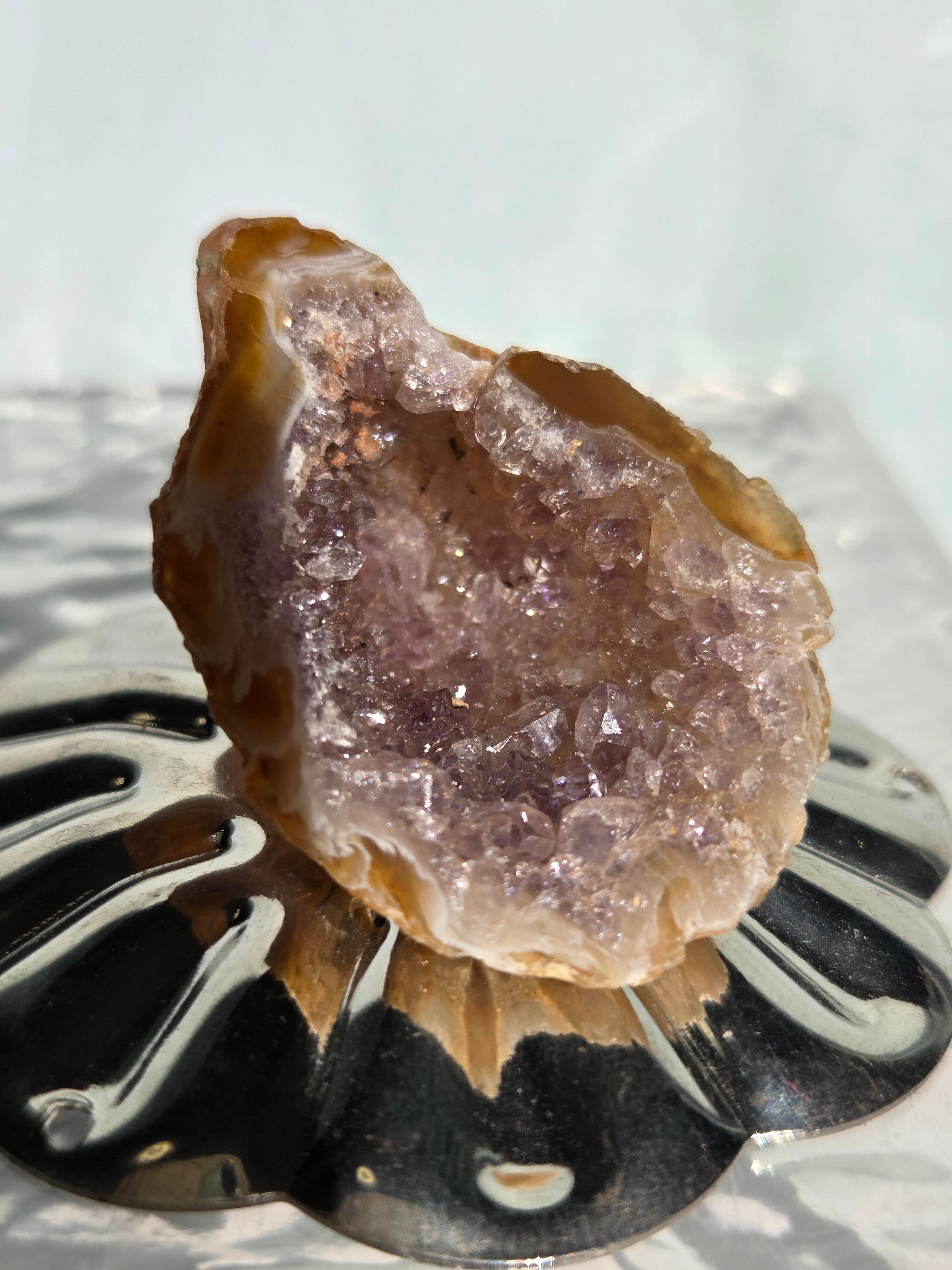 塊状のアゲート(瑪瑙)の原石を2つに切断したものです。 この瑪瑙の中にはジオード(晶洞:Geode)という空洞があり内側へと成長しようとしている結晶が見えます。