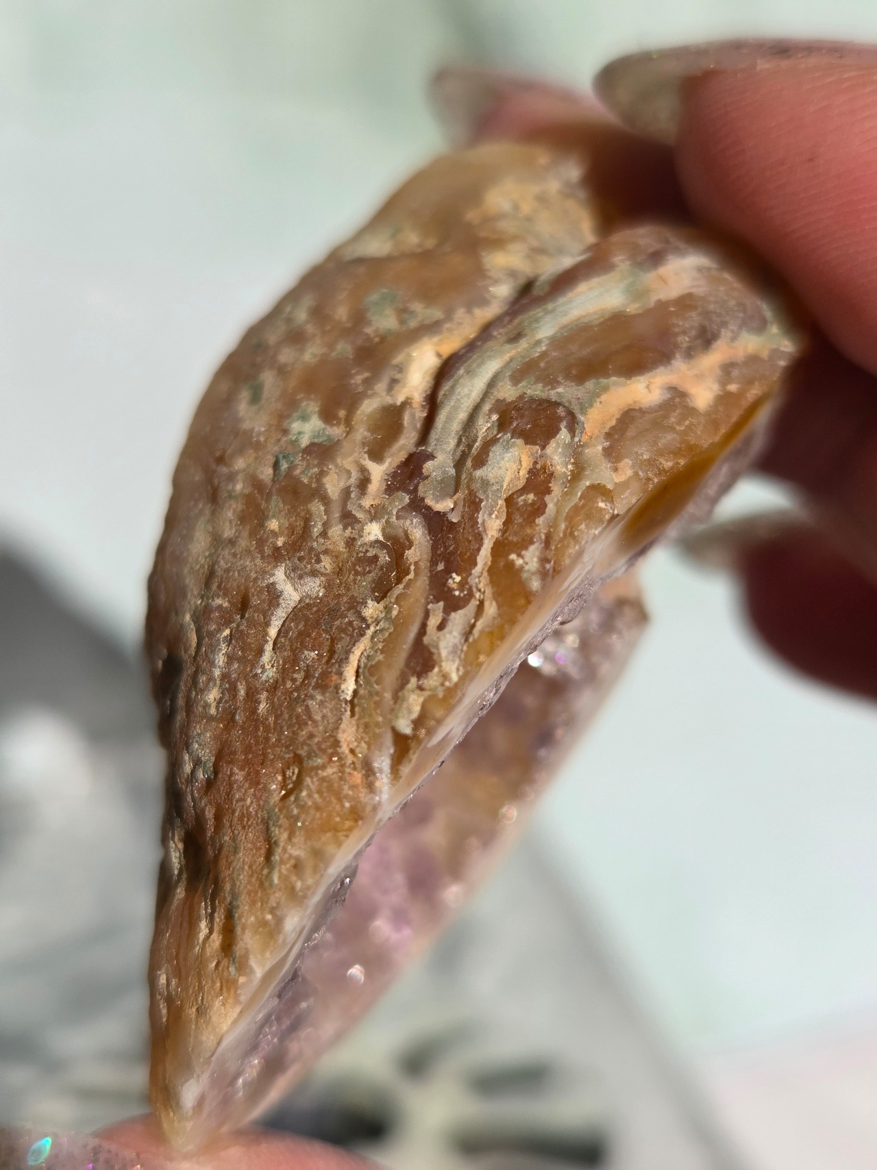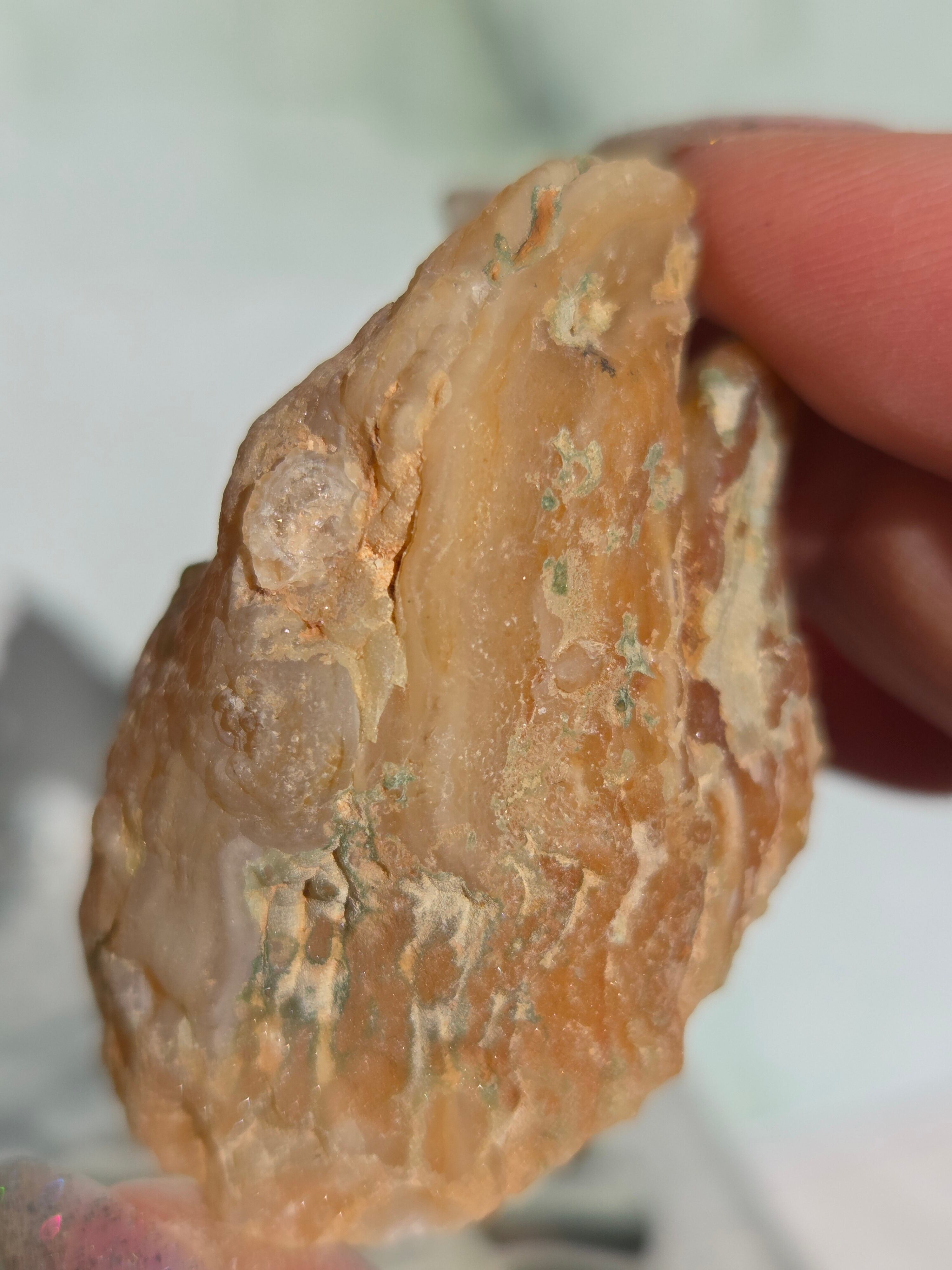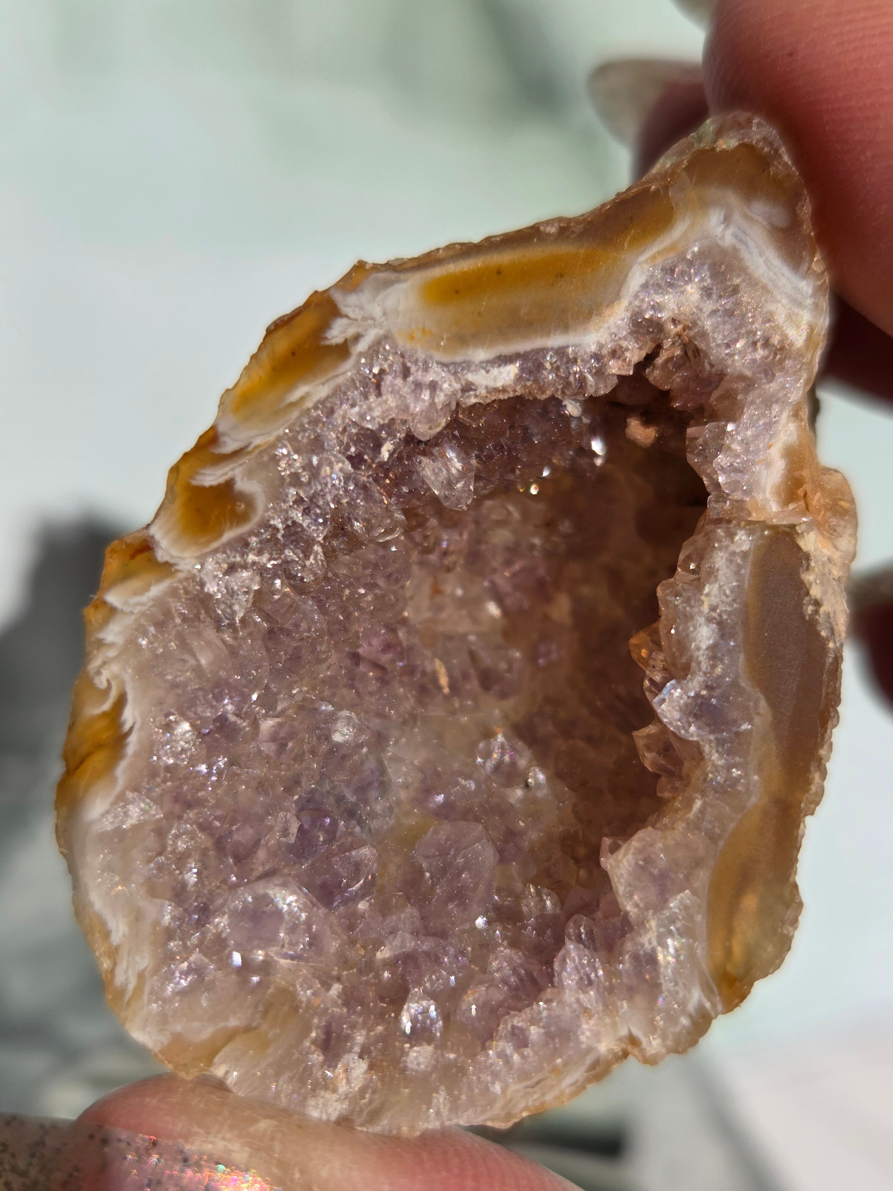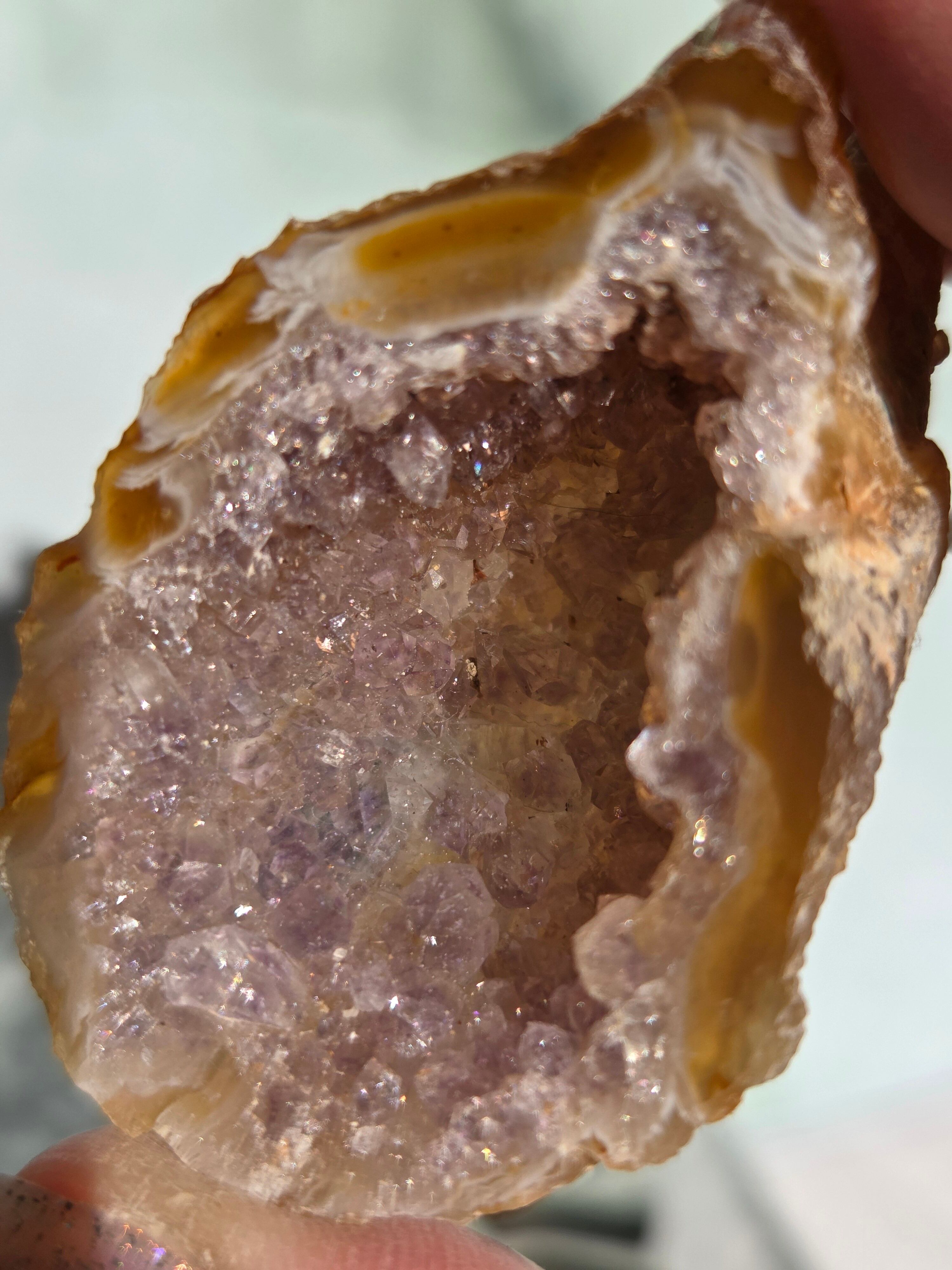 塊状のアゲート(瑪瑙)の原石を2つに切断したものです。 この瑪瑙の中にはジオード(晶洞:Geode)という空洞があり内側へと成長しようとしている結晶が見えます。