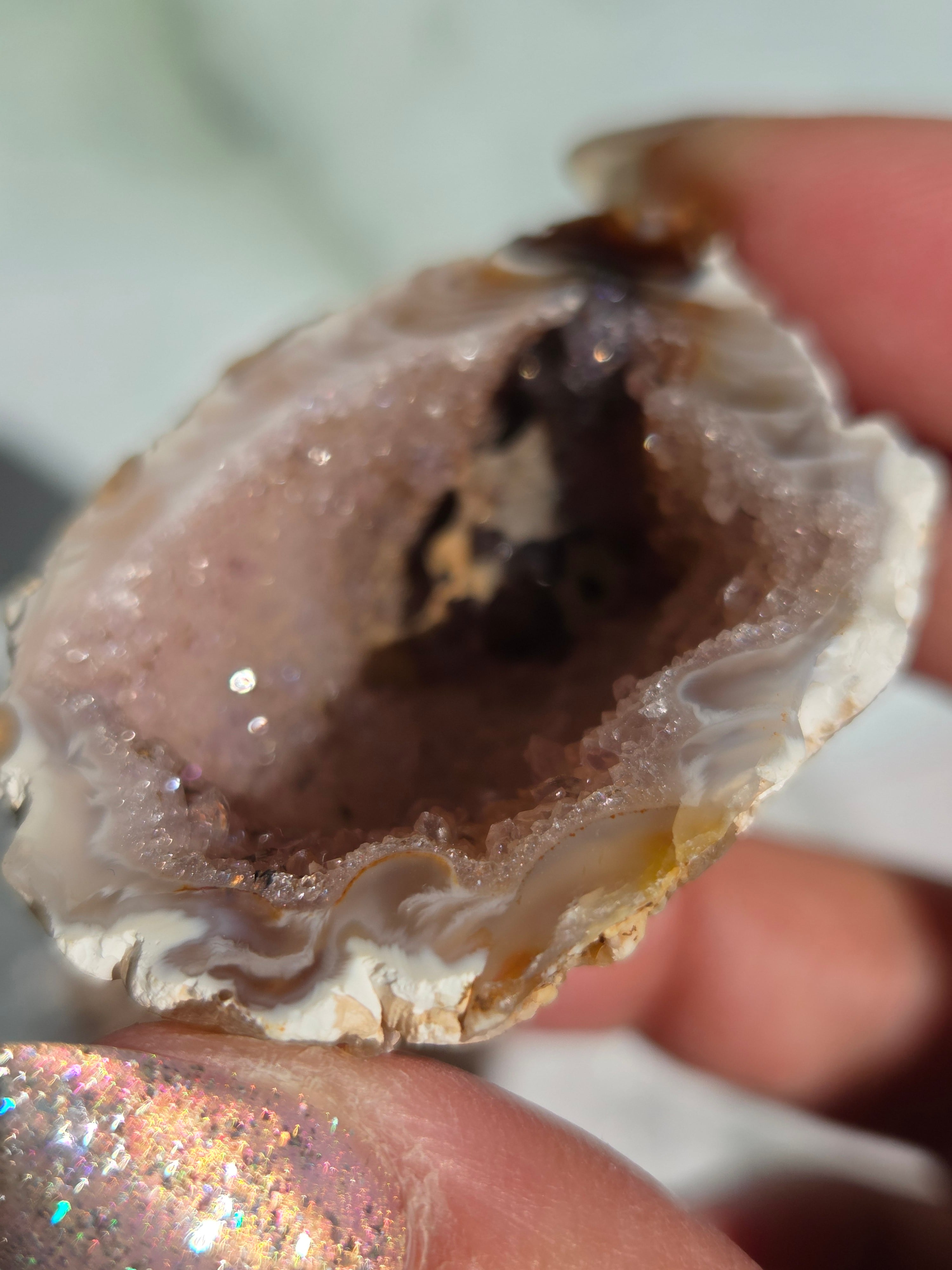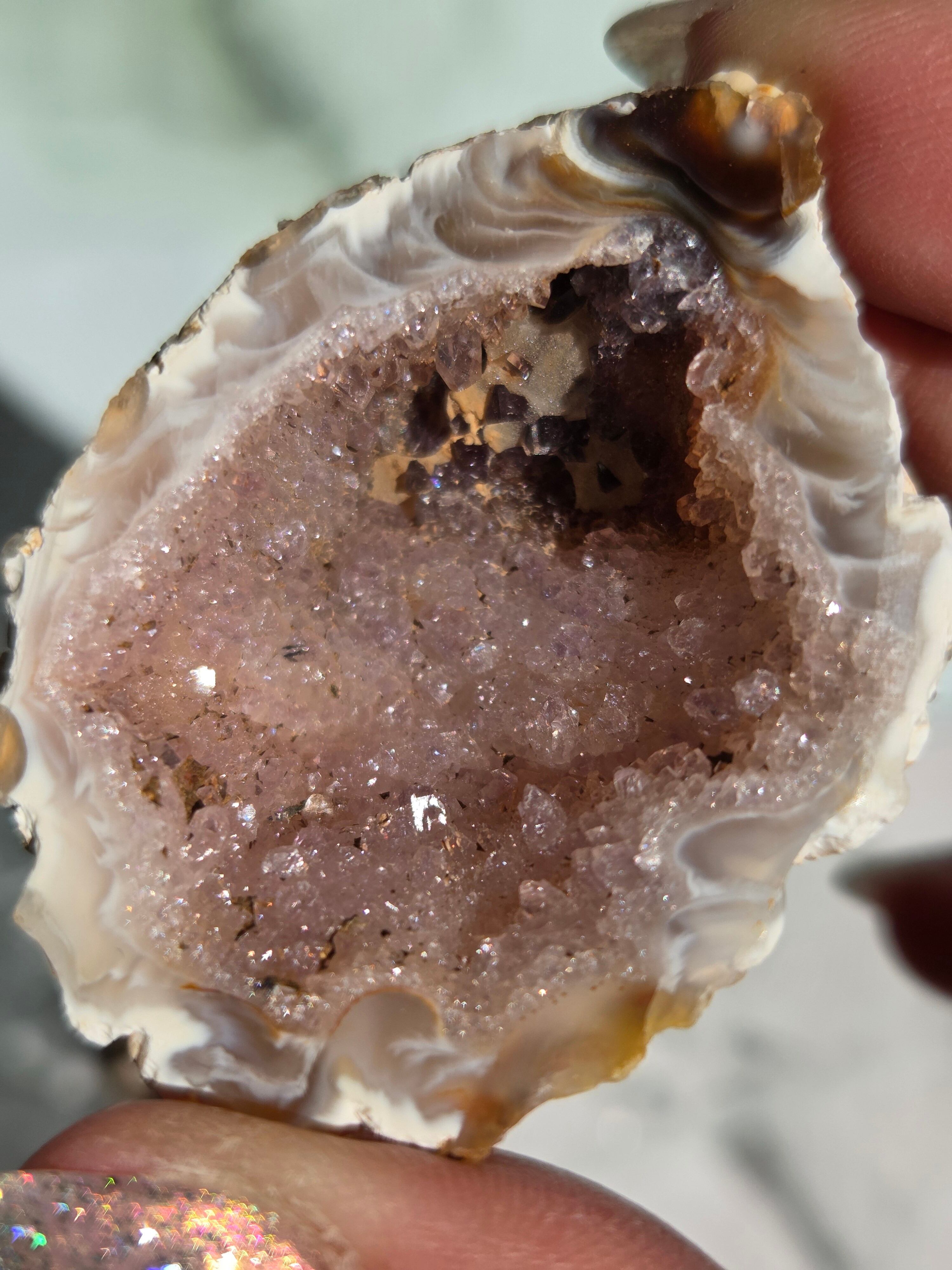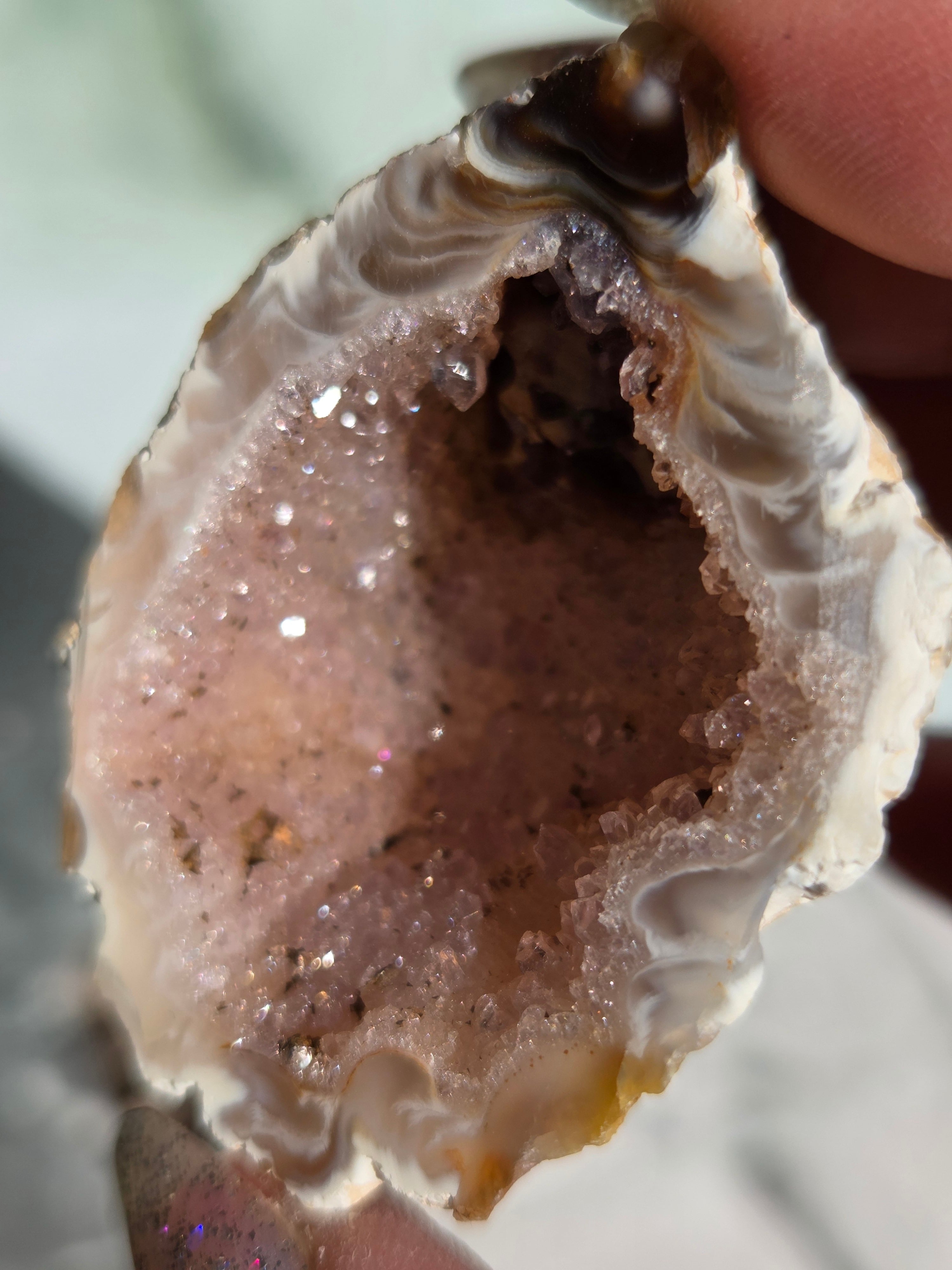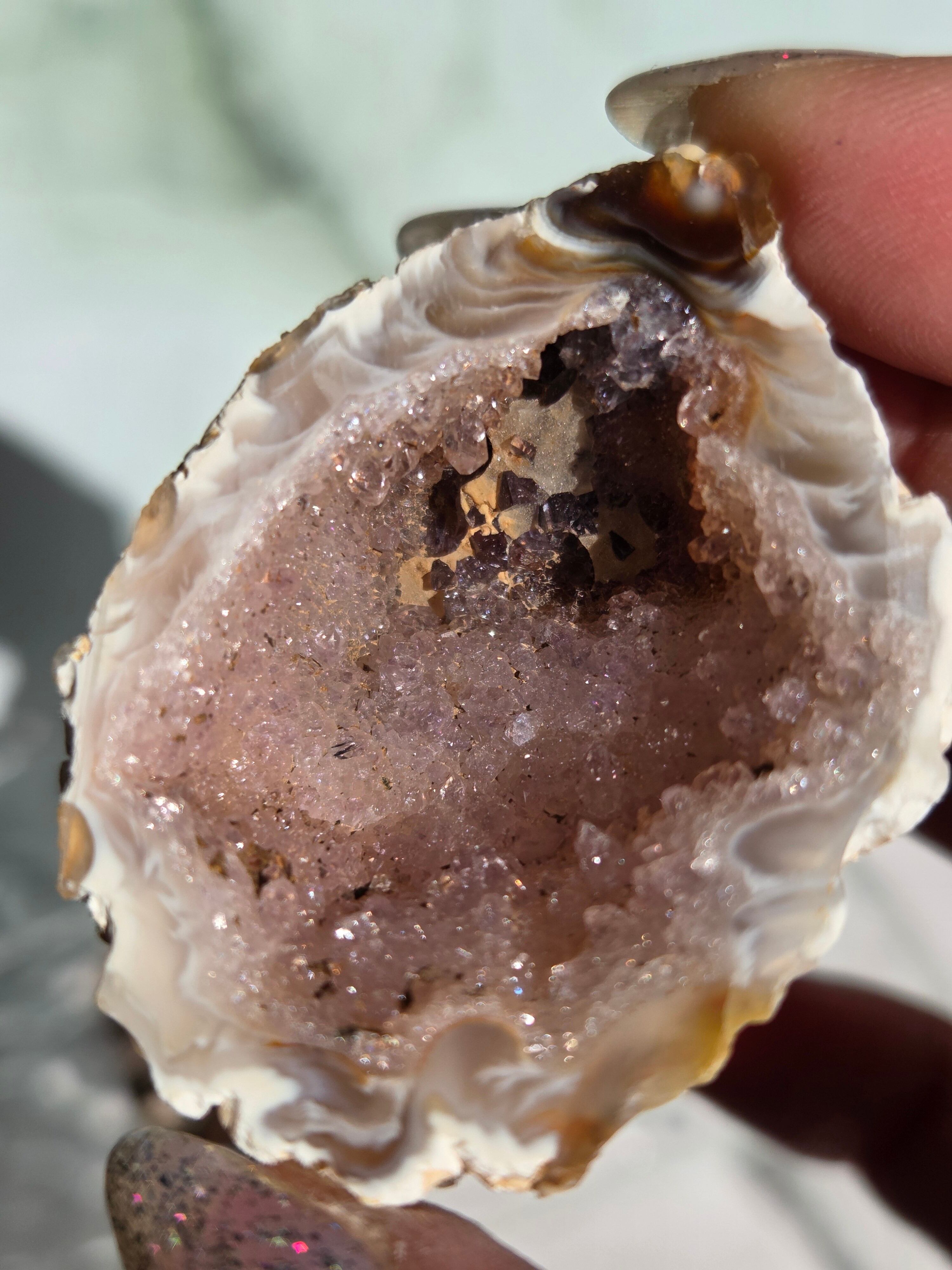 塊状のアゲート(瑪瑙)の原石を2つに切断したものです。 この瑪瑙の中にはジオード(晶洞:Geode)という空洞があり内側へと成長しようとしている結晶が見えます。