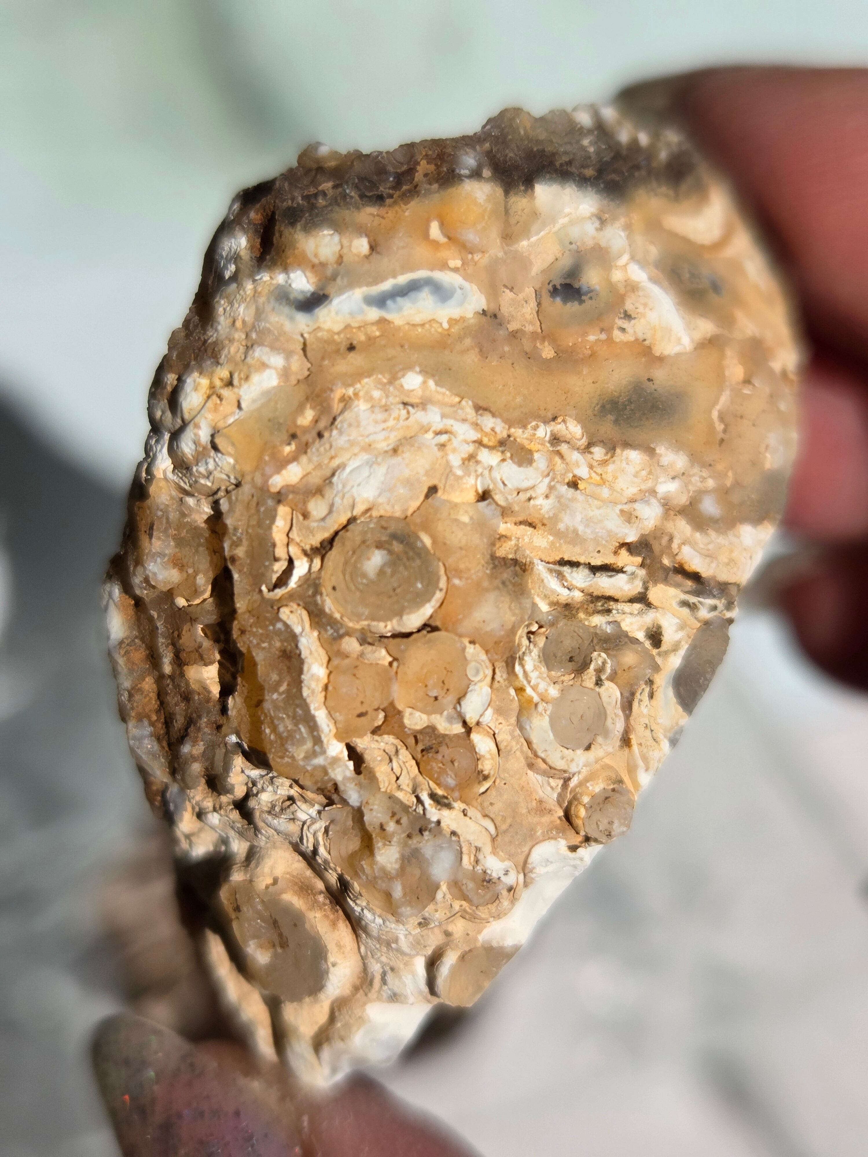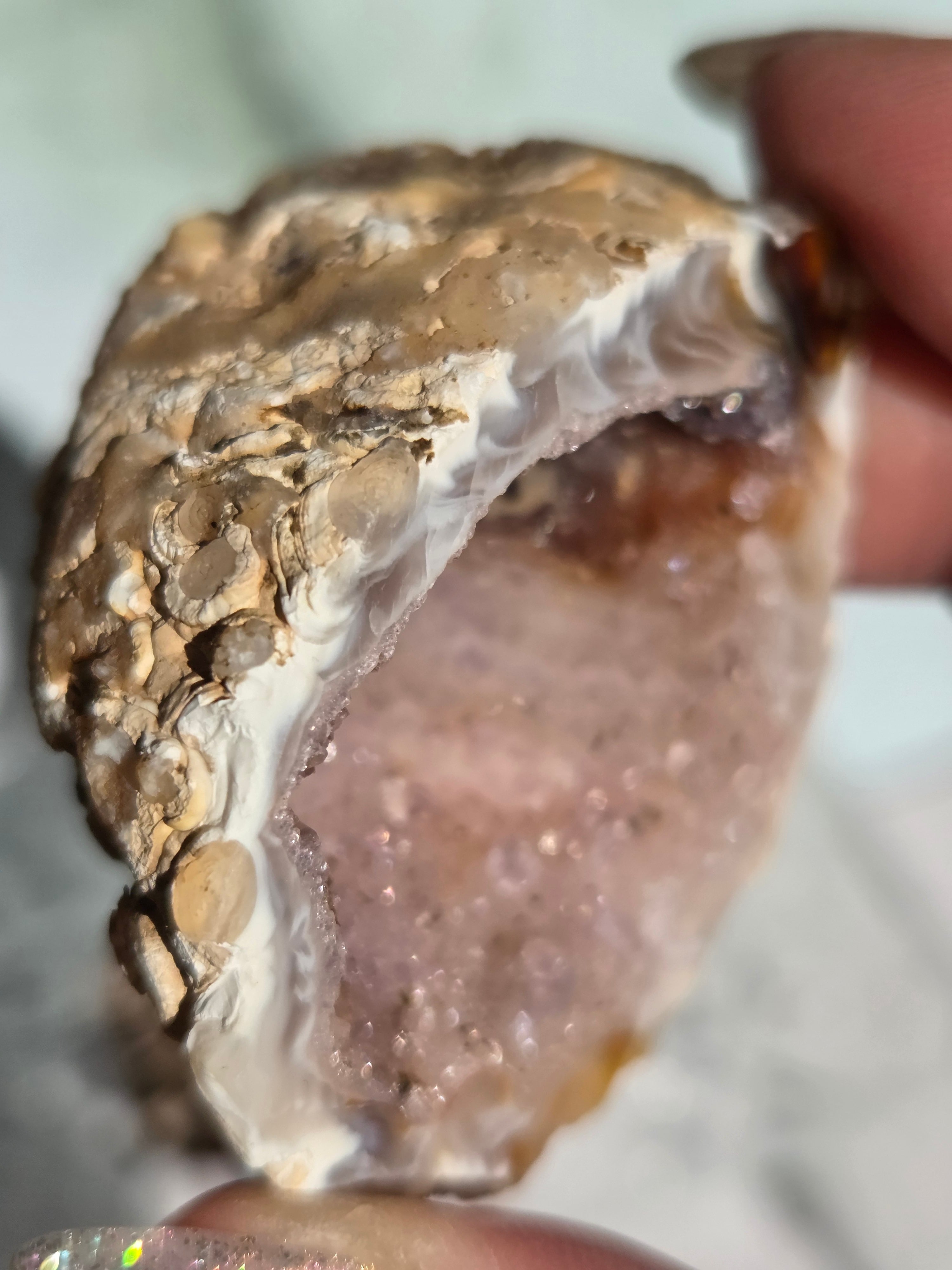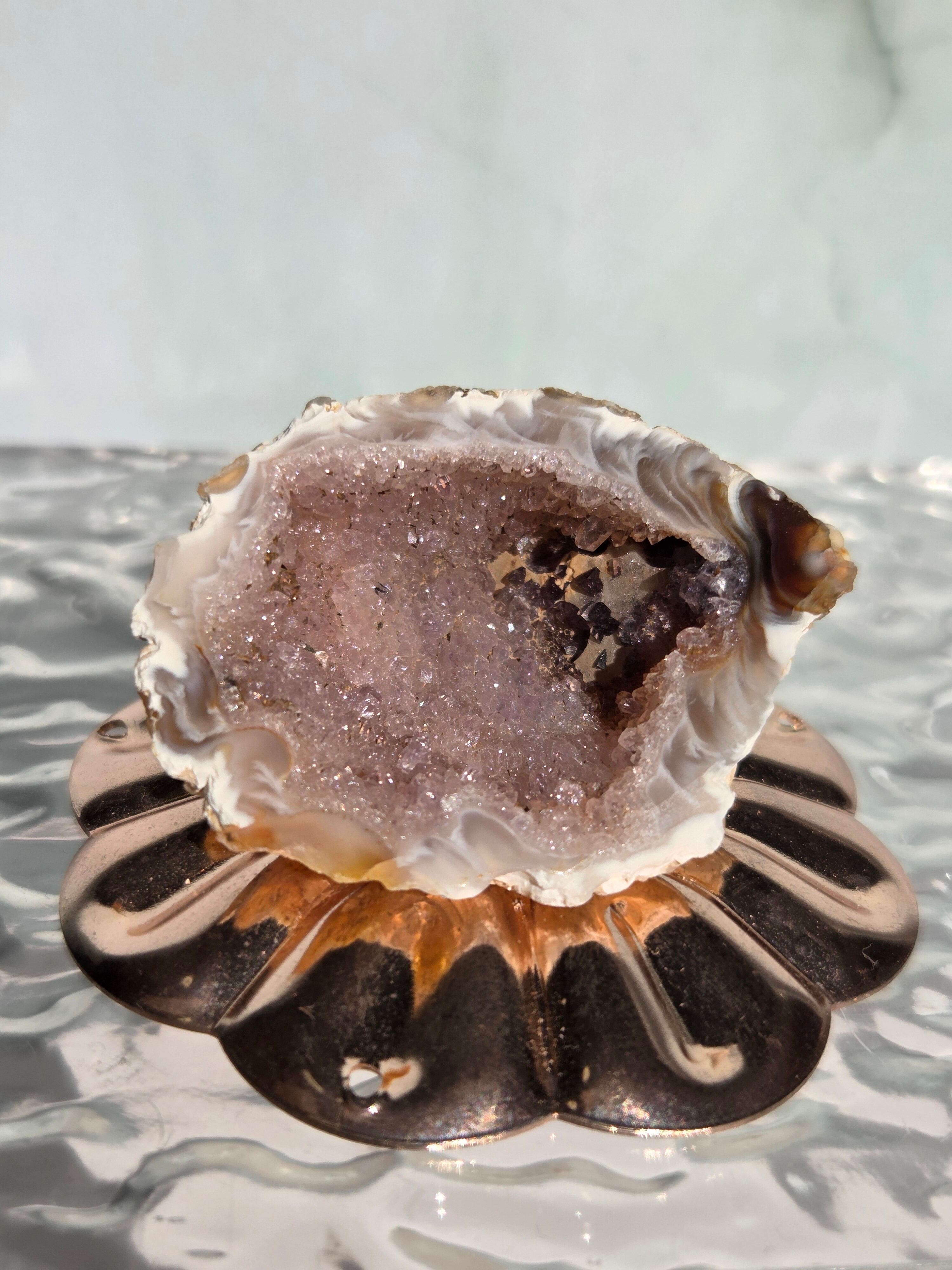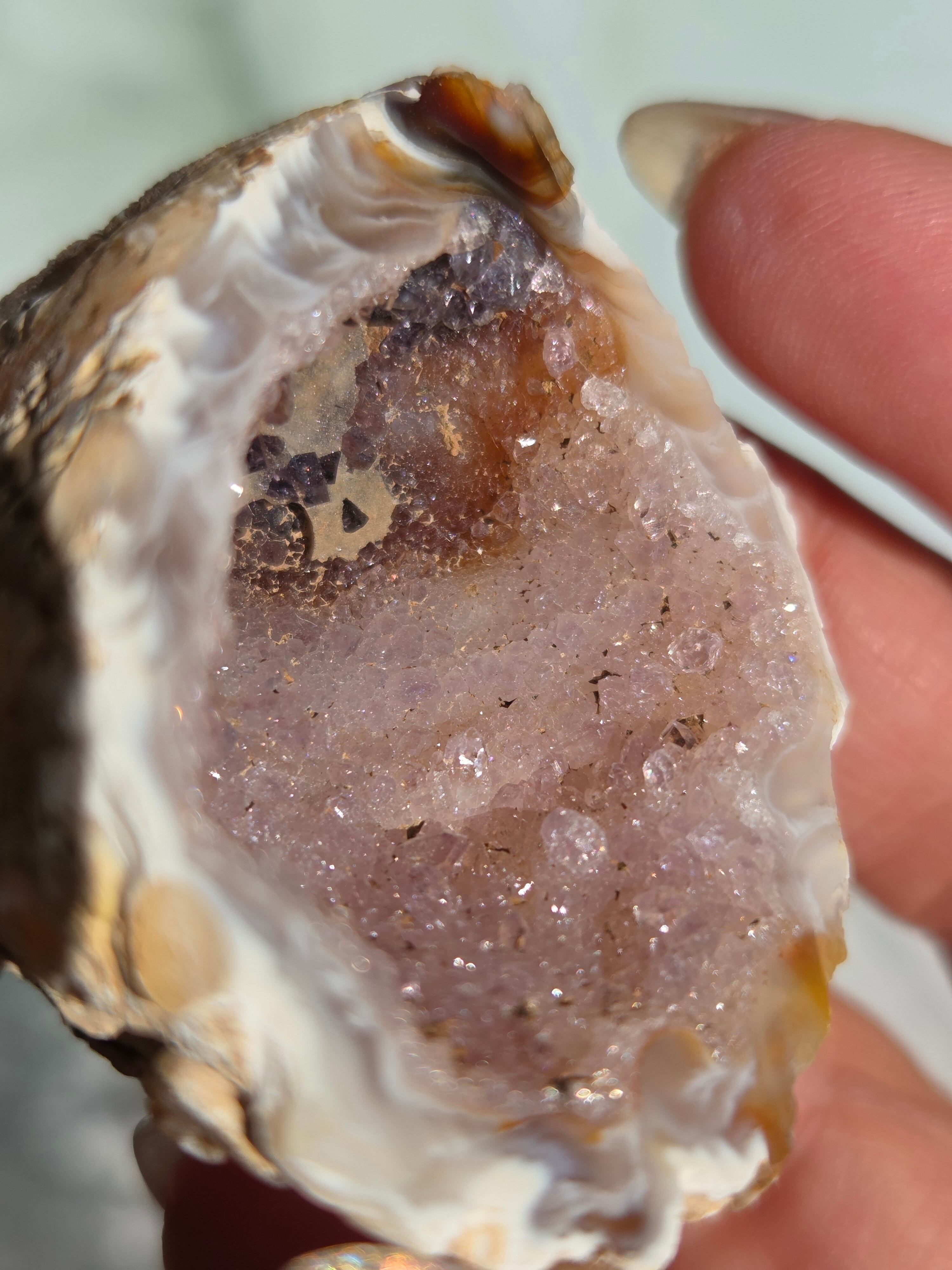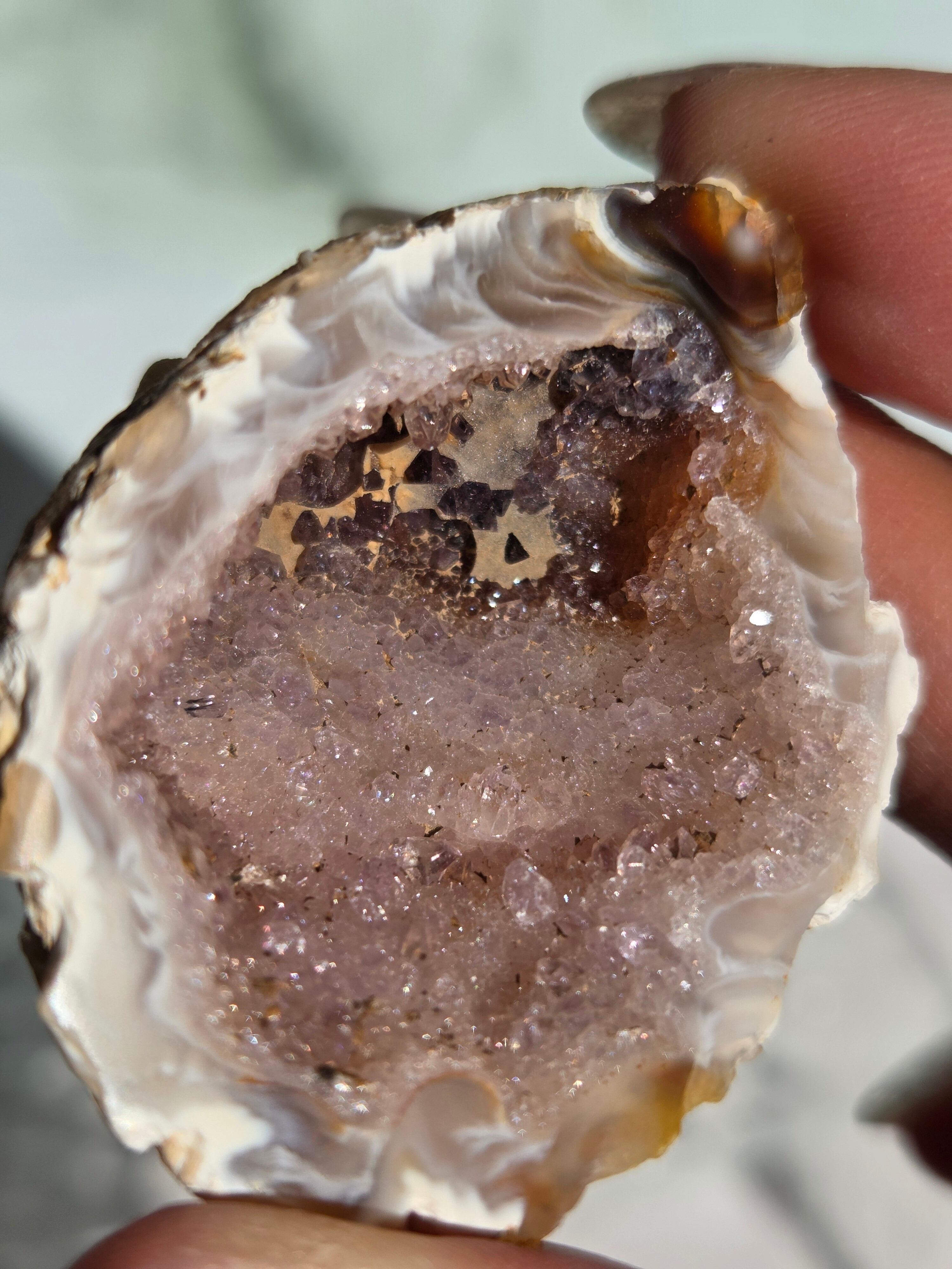 塊状のアゲート(瑪瑙)の原石を2つに切断したものです。 この瑪瑙の中にはジオード(晶洞:Geode)という空洞があり内側へと成長しようとしている結晶が見えます。
