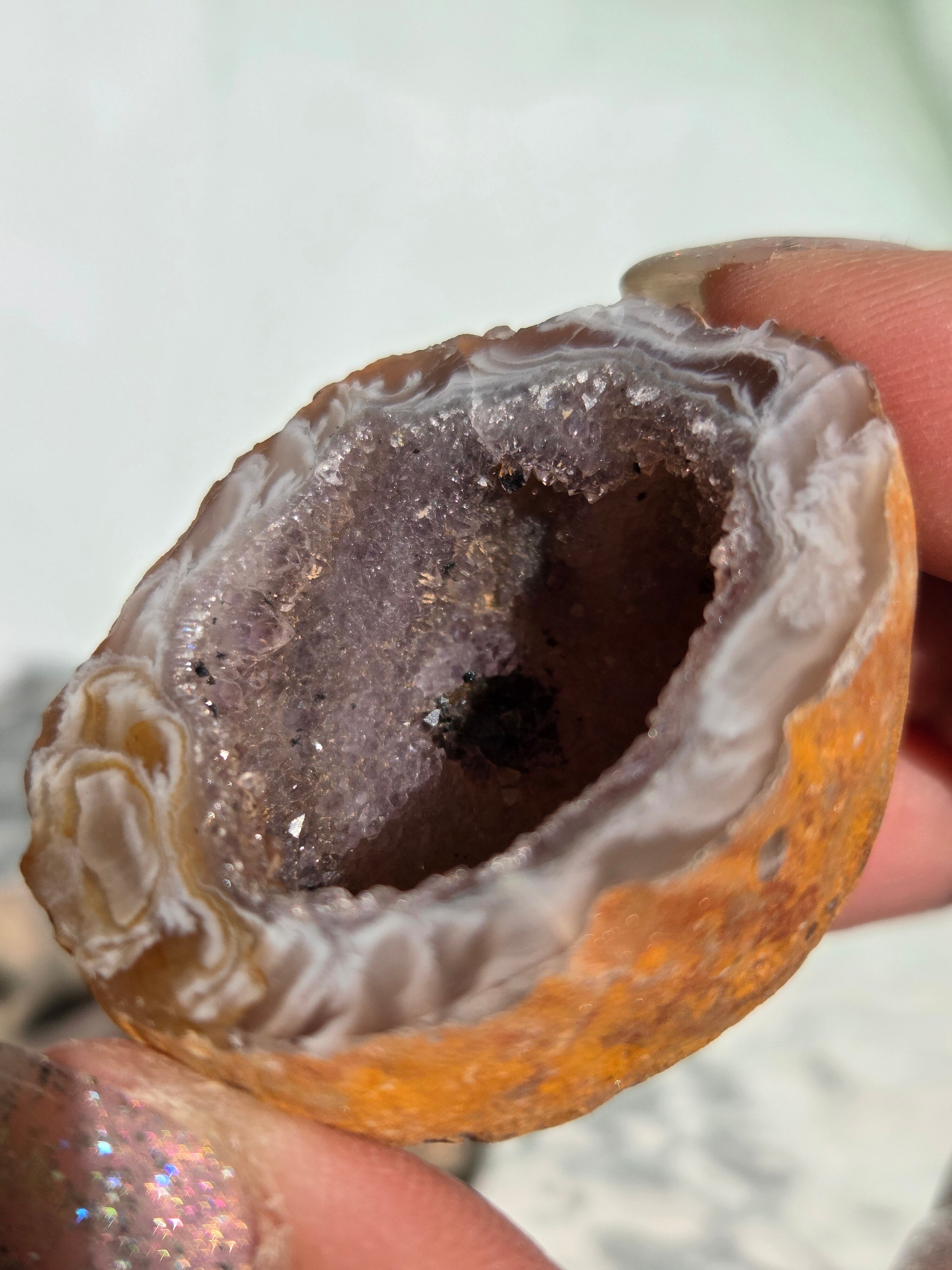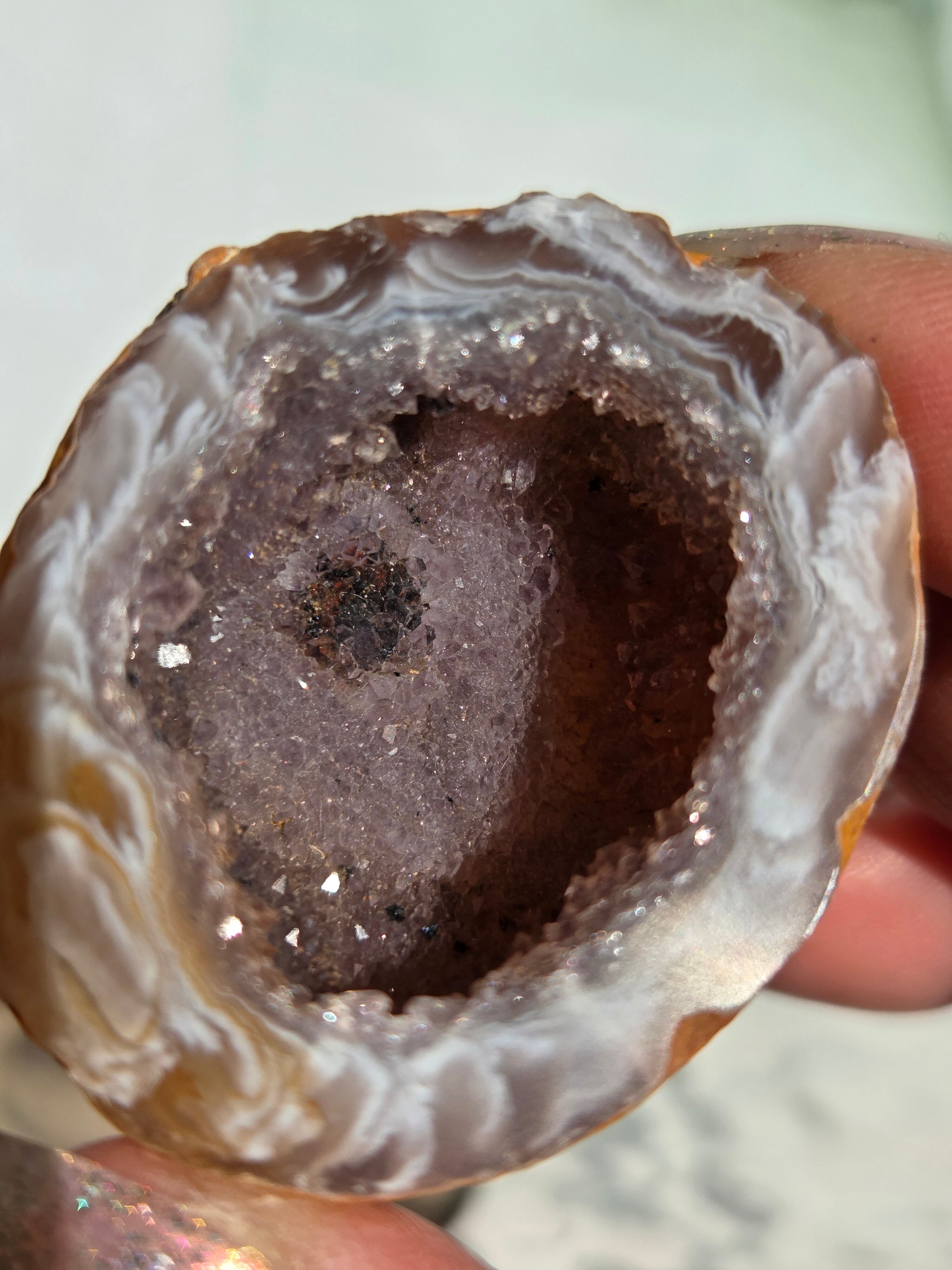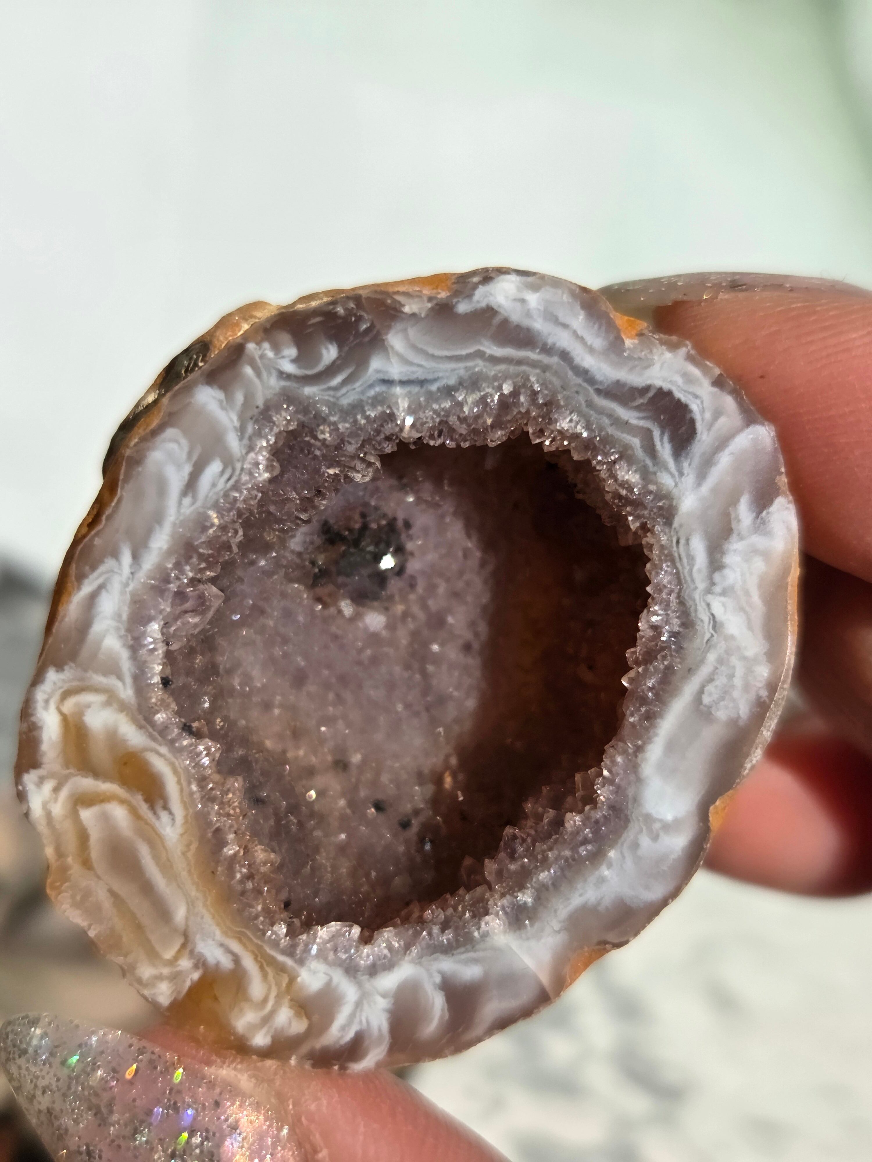 塊状のアゲート(瑪瑙)の原石を2つに切断したものです。 この瑪瑙の中にはジオード(晶洞:Geode)という空洞があり内側へと成長しようとしている結晶が見えます。
