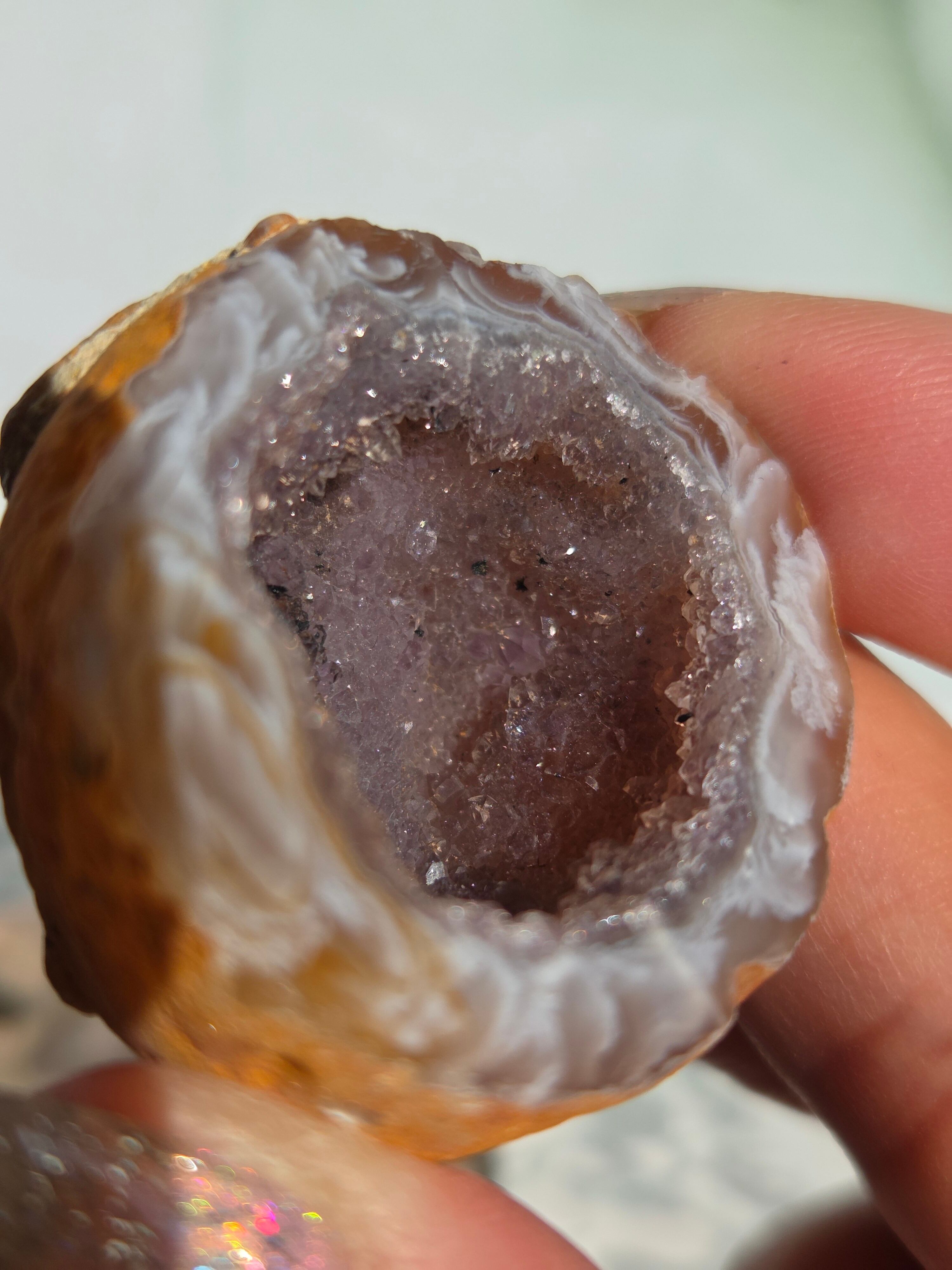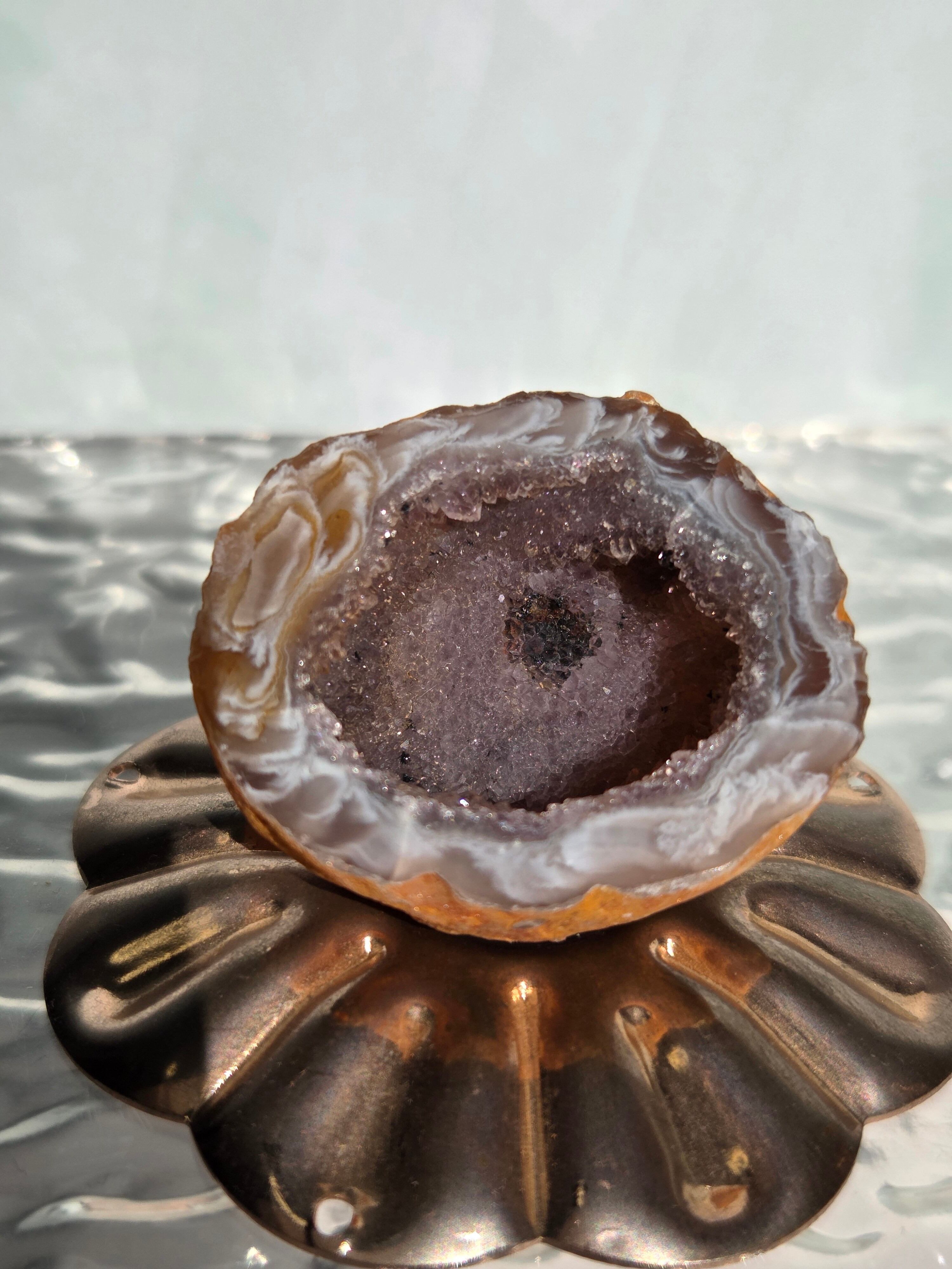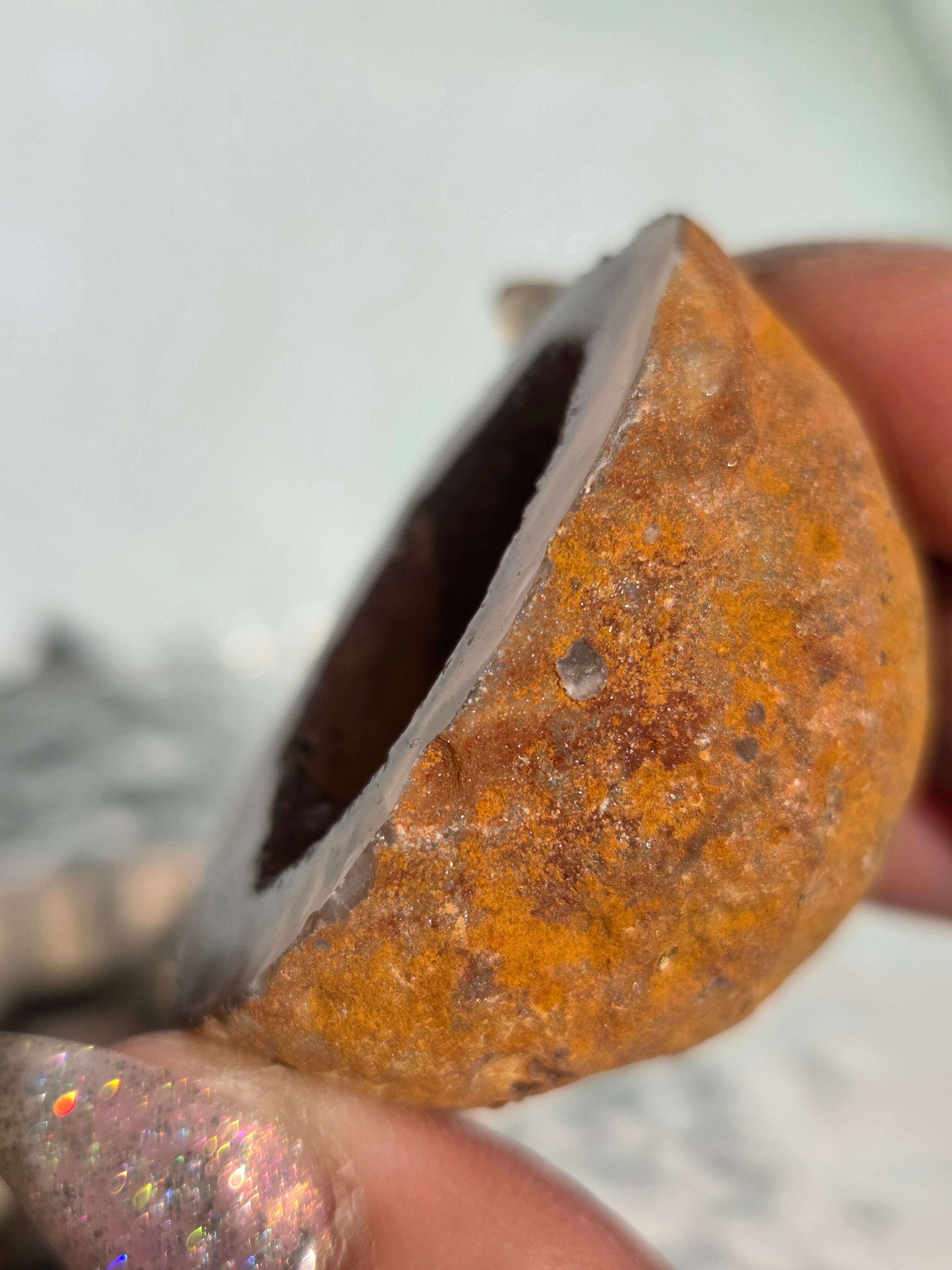 塊状のアゲート(瑪瑙)の原石を2つに切断したものです。 この瑪瑙の中にはジオード(晶洞:Geode)という空洞があり内側へと成長しようとしている結晶が見えます。