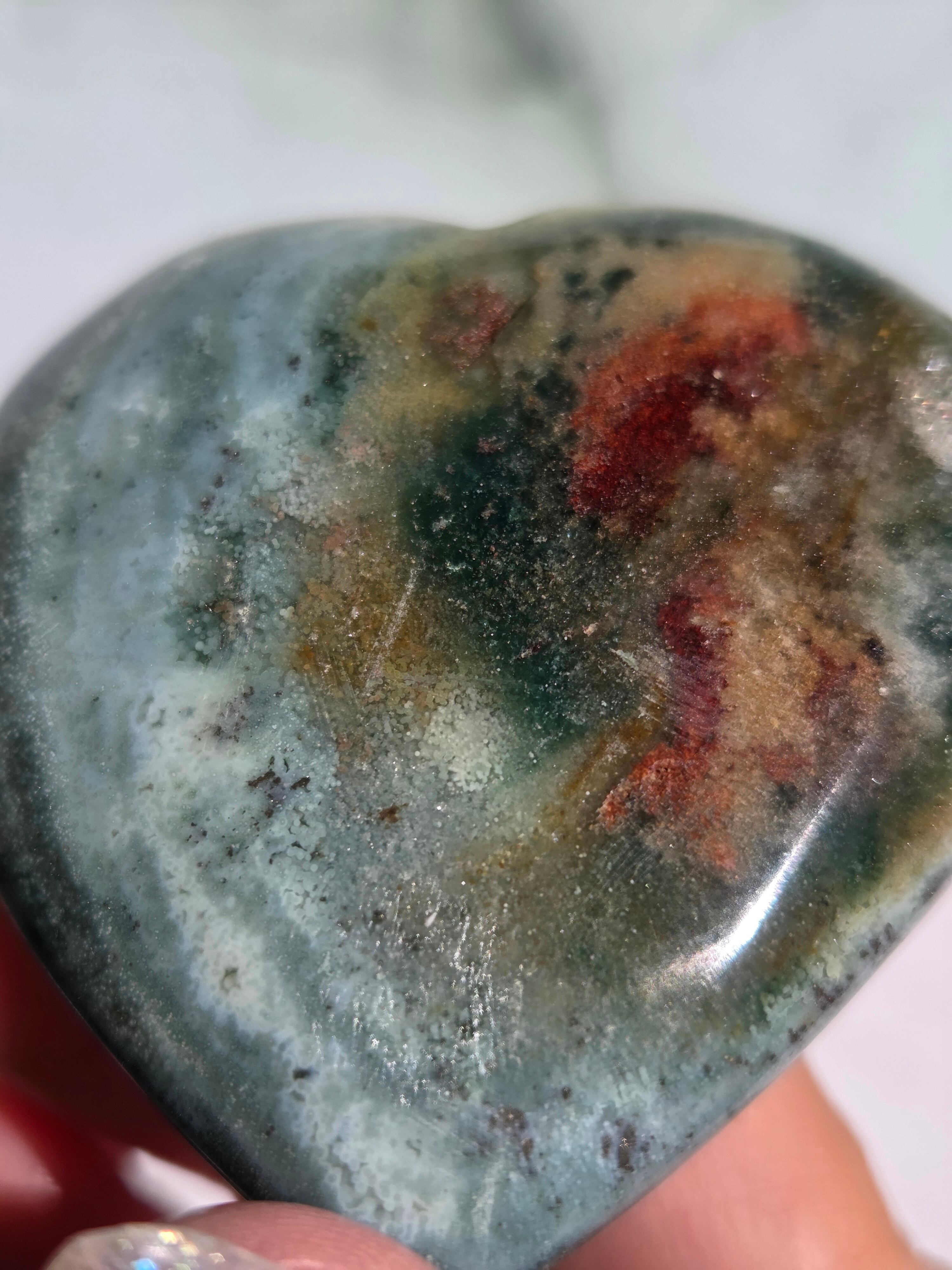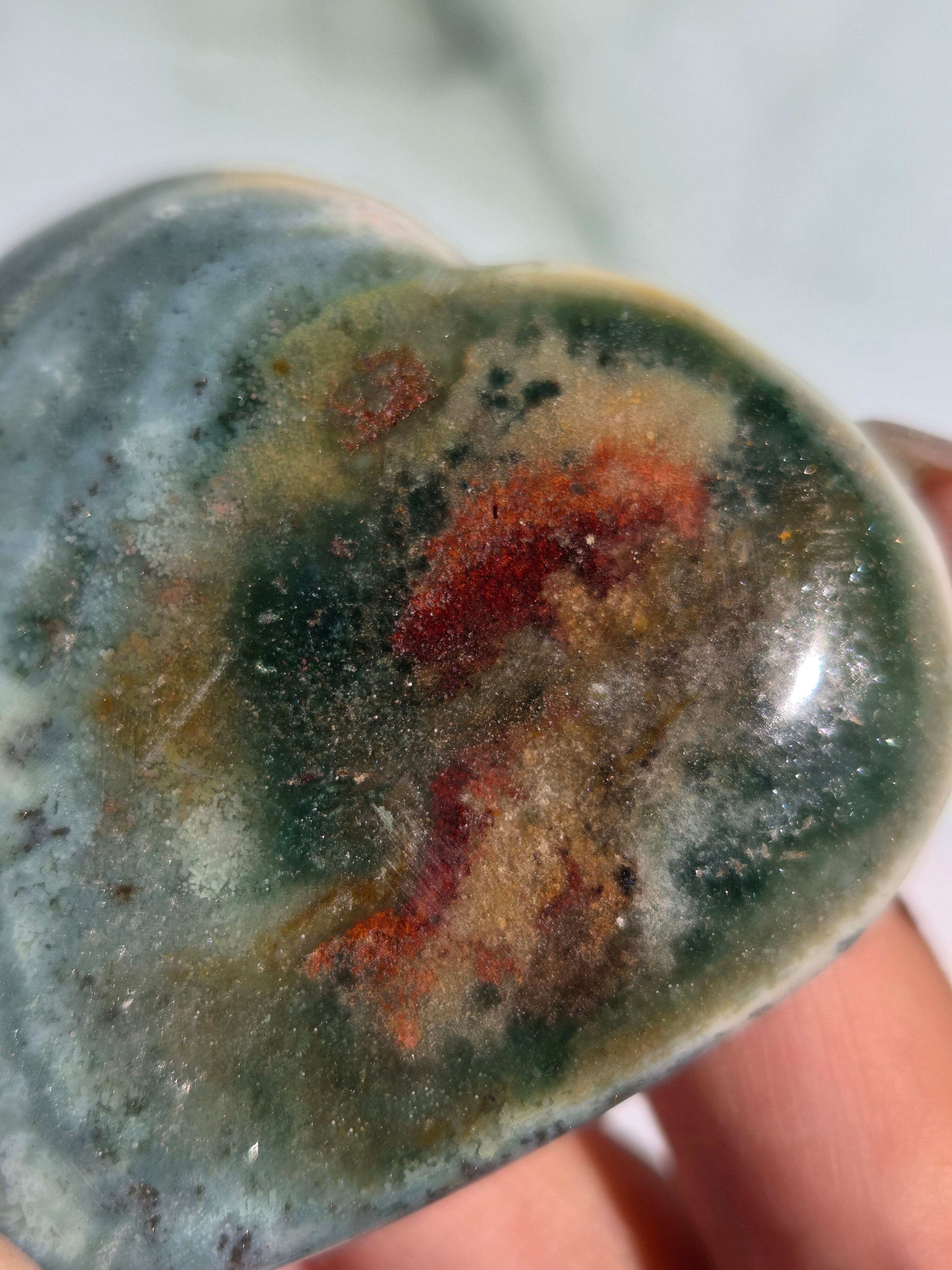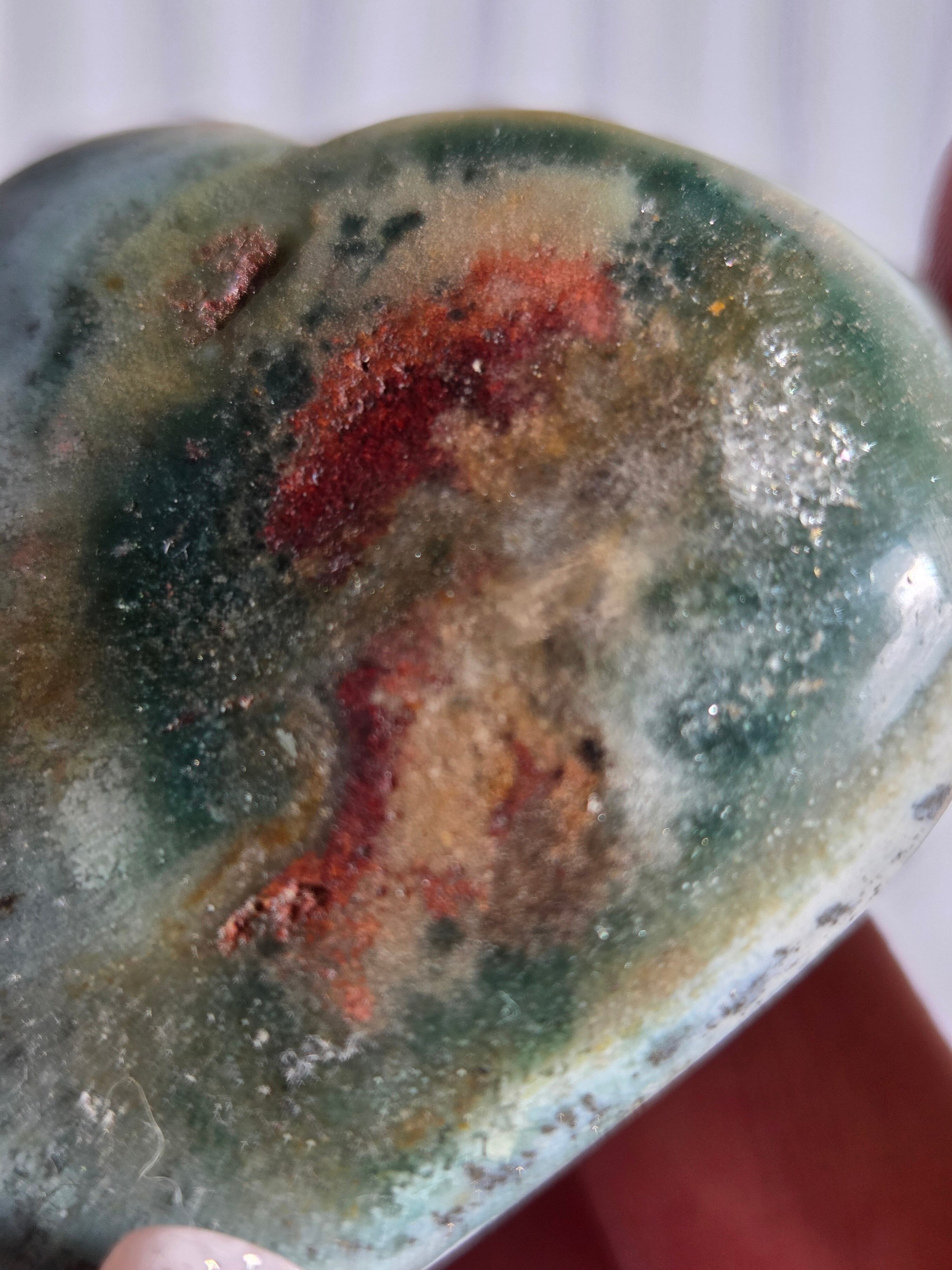 オーシャンジャスパーには高いヒーリング効果があると言われ、精神的な安心感や安定感をもたらし、悩みや問題などの解決へと導いてくれます。 包容力や奉仕の精神を養ってくれる石でもあります。 また、隠れた魅力・才能を引き出してくれる石でもあります。