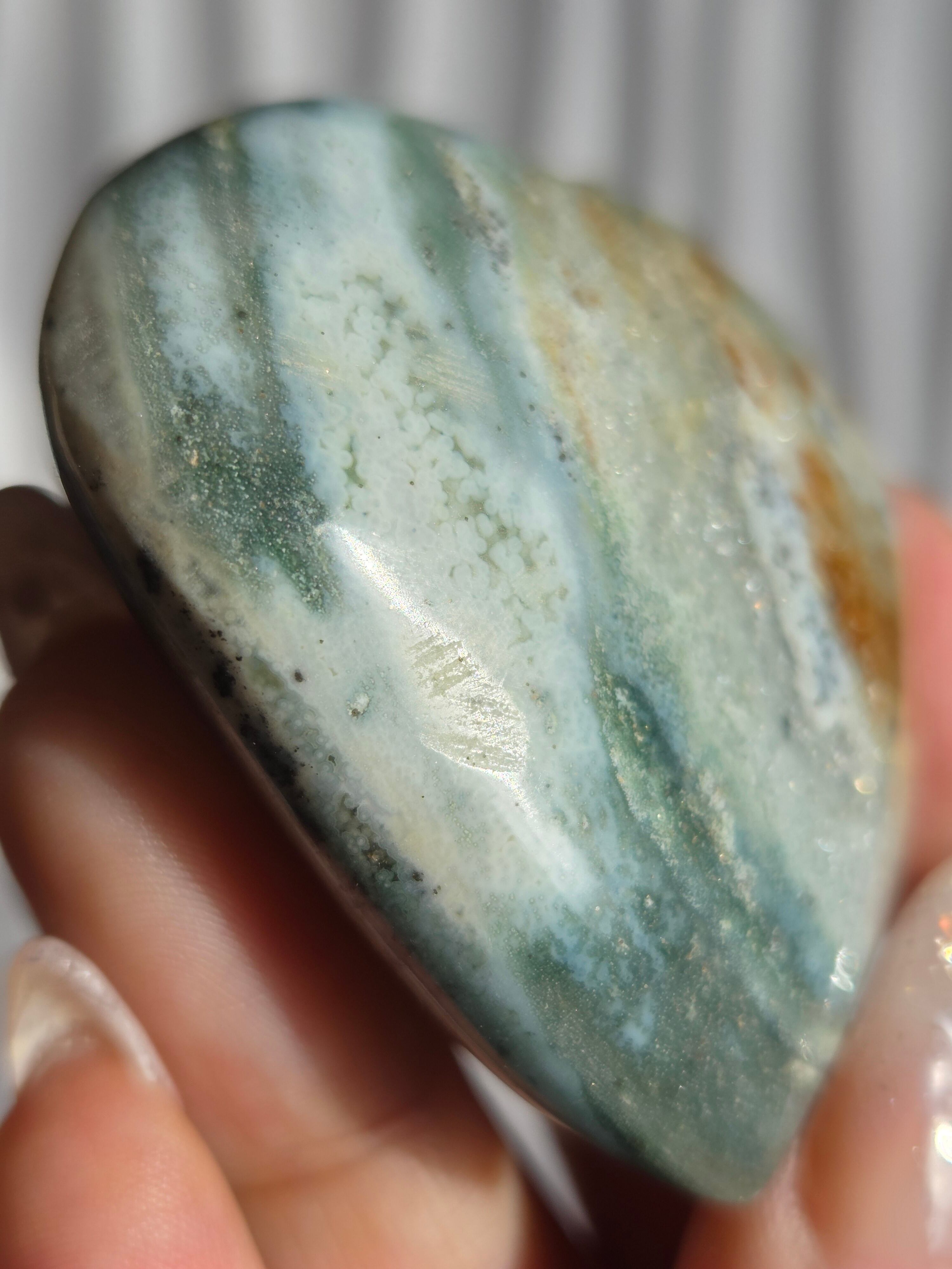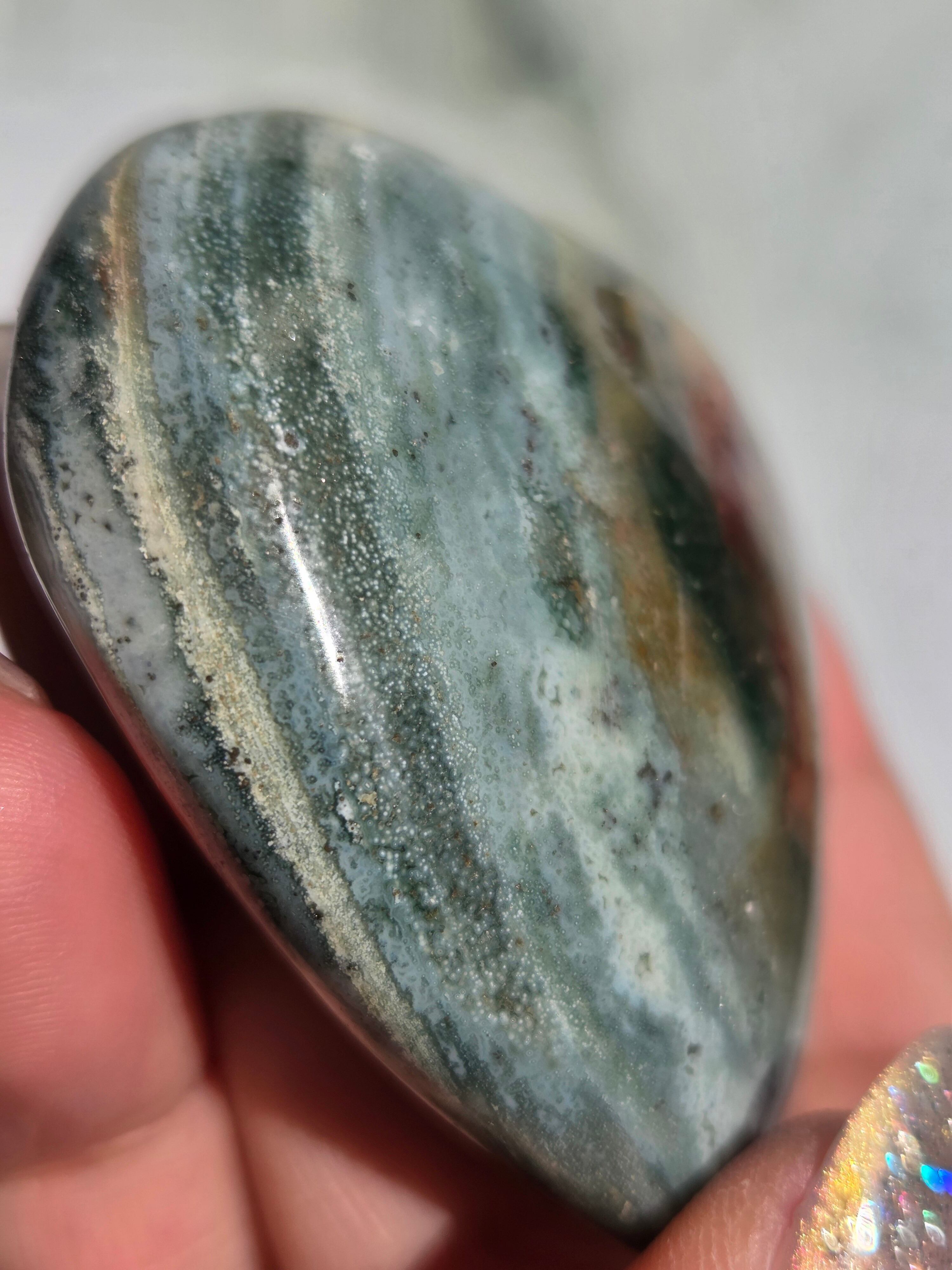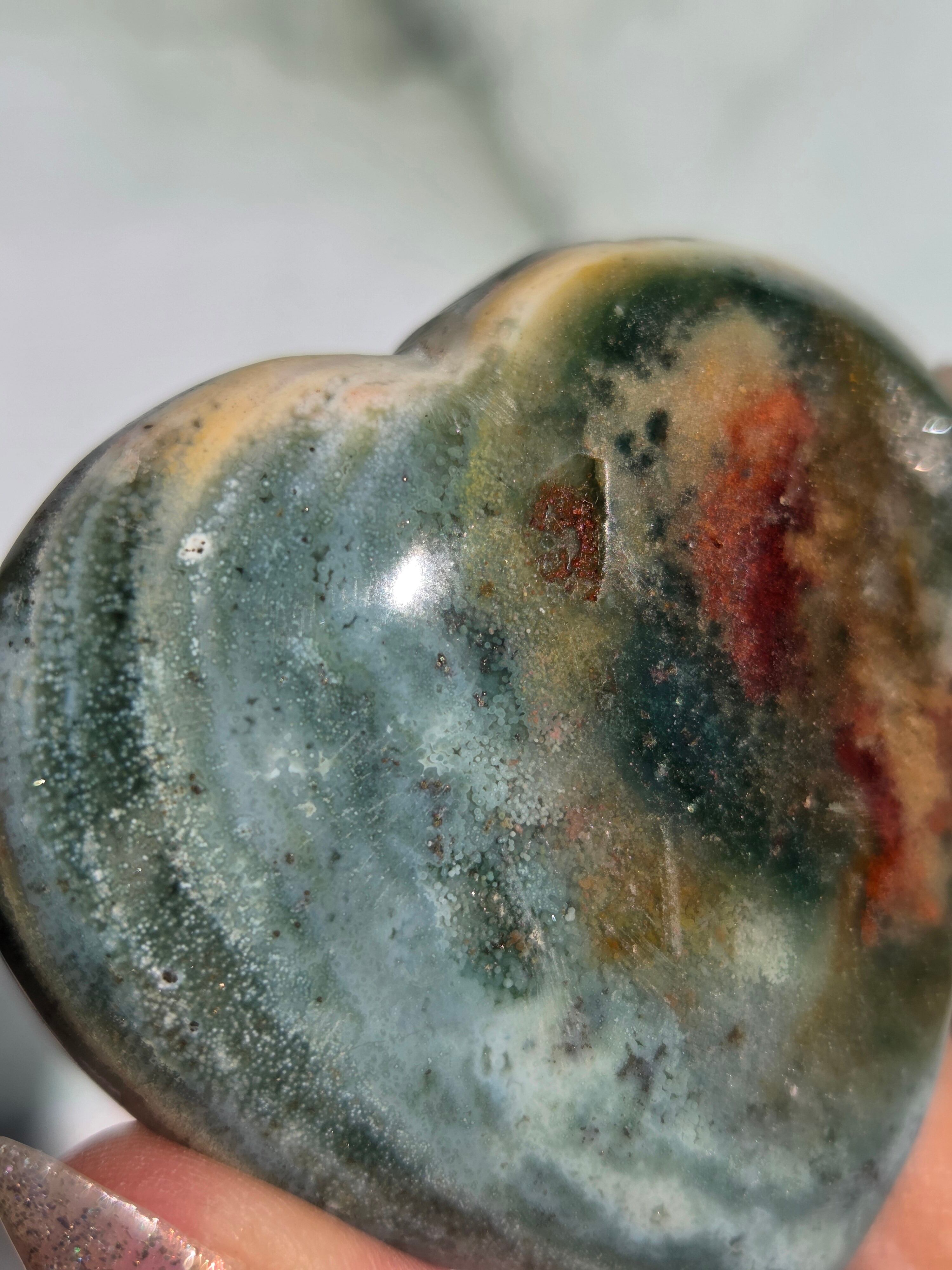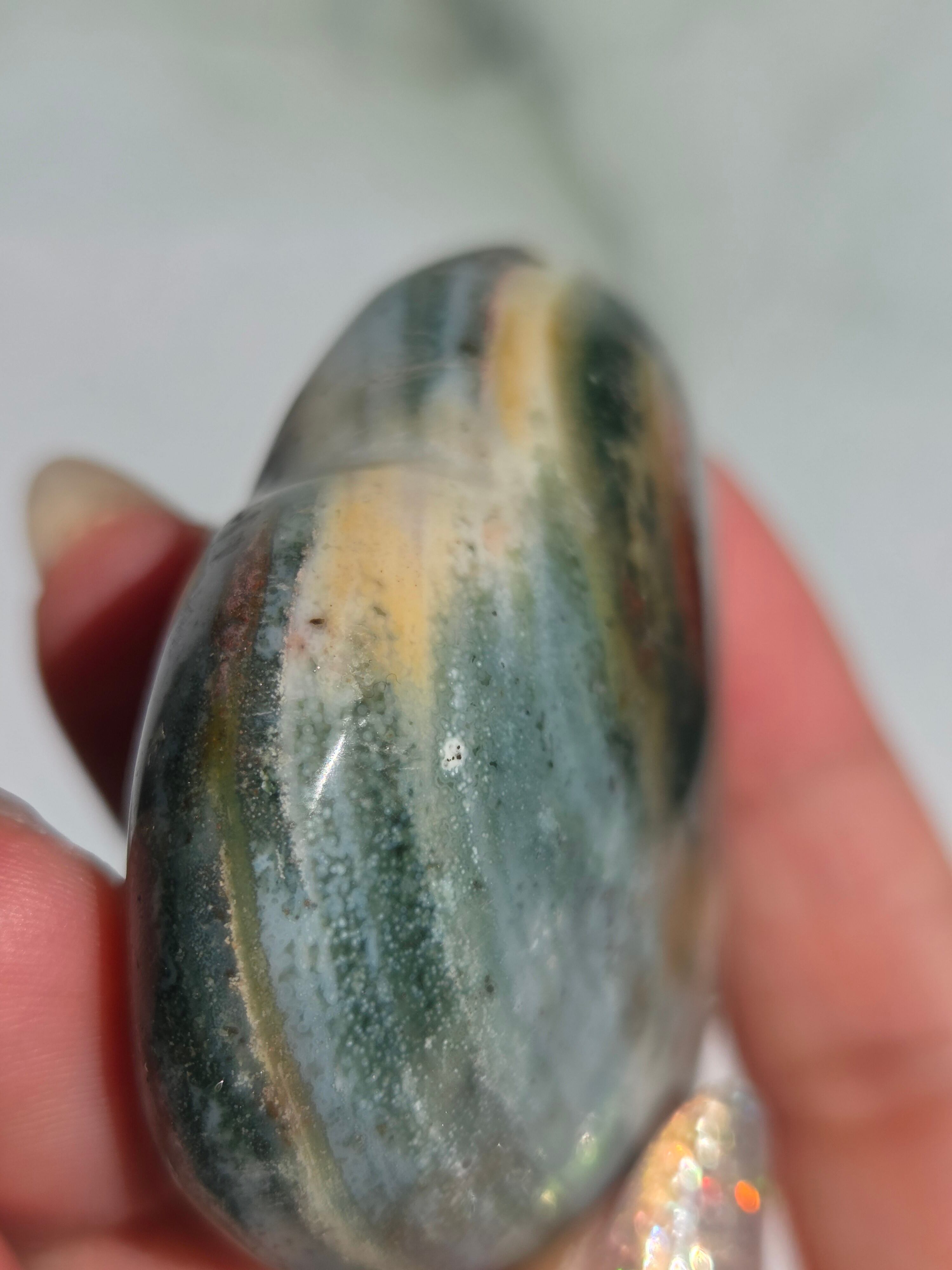 オーシャンジャスパーには高いヒーリング効果があると言われ、精神的な安心感や安定感をもたらし、悩みや問題などの解決へと導いてくれます。 包容力や奉仕の精神を養ってくれる石でもあります。 また、隠れた魅力・才能を引き出してくれる石でもあります。