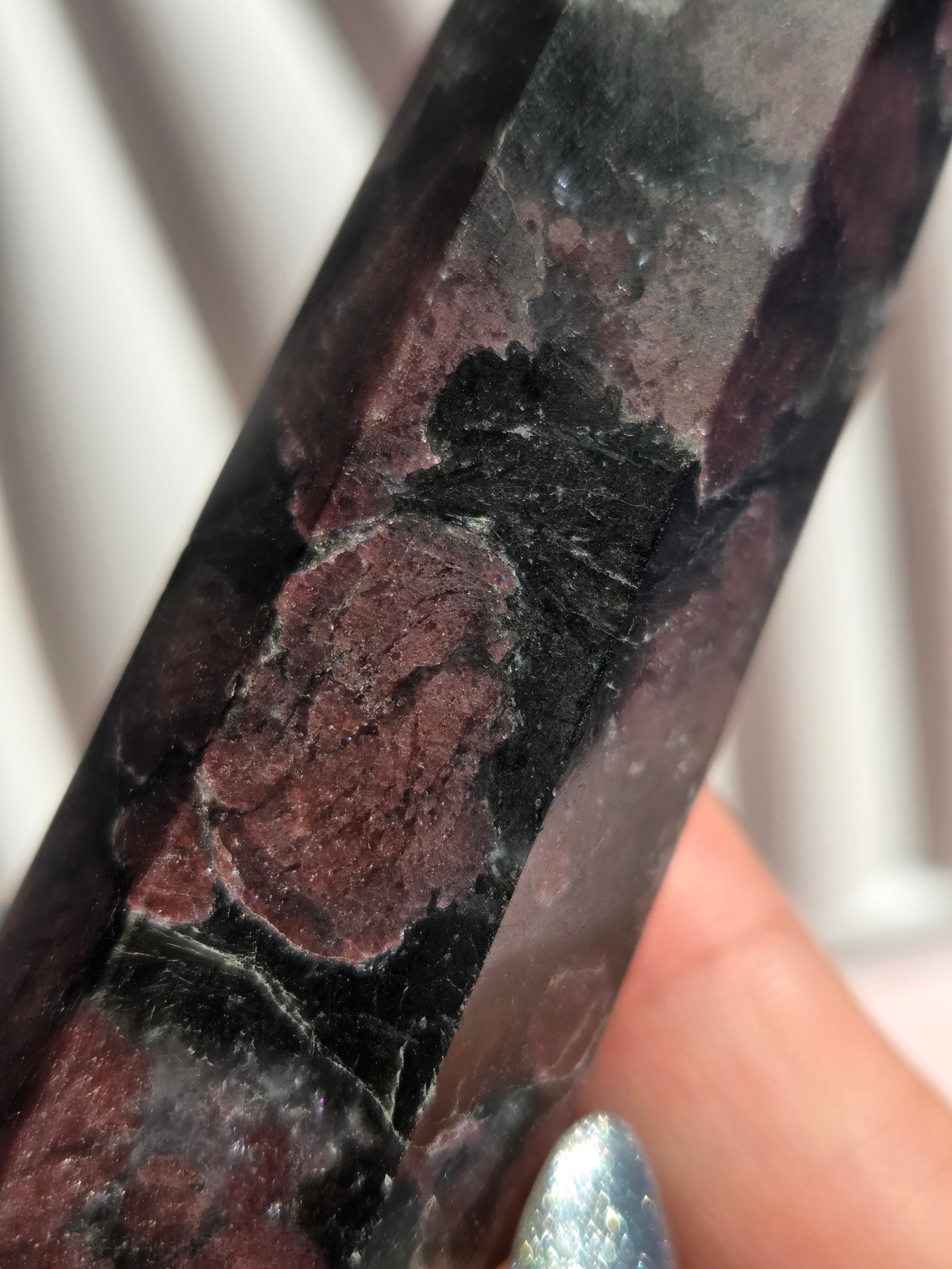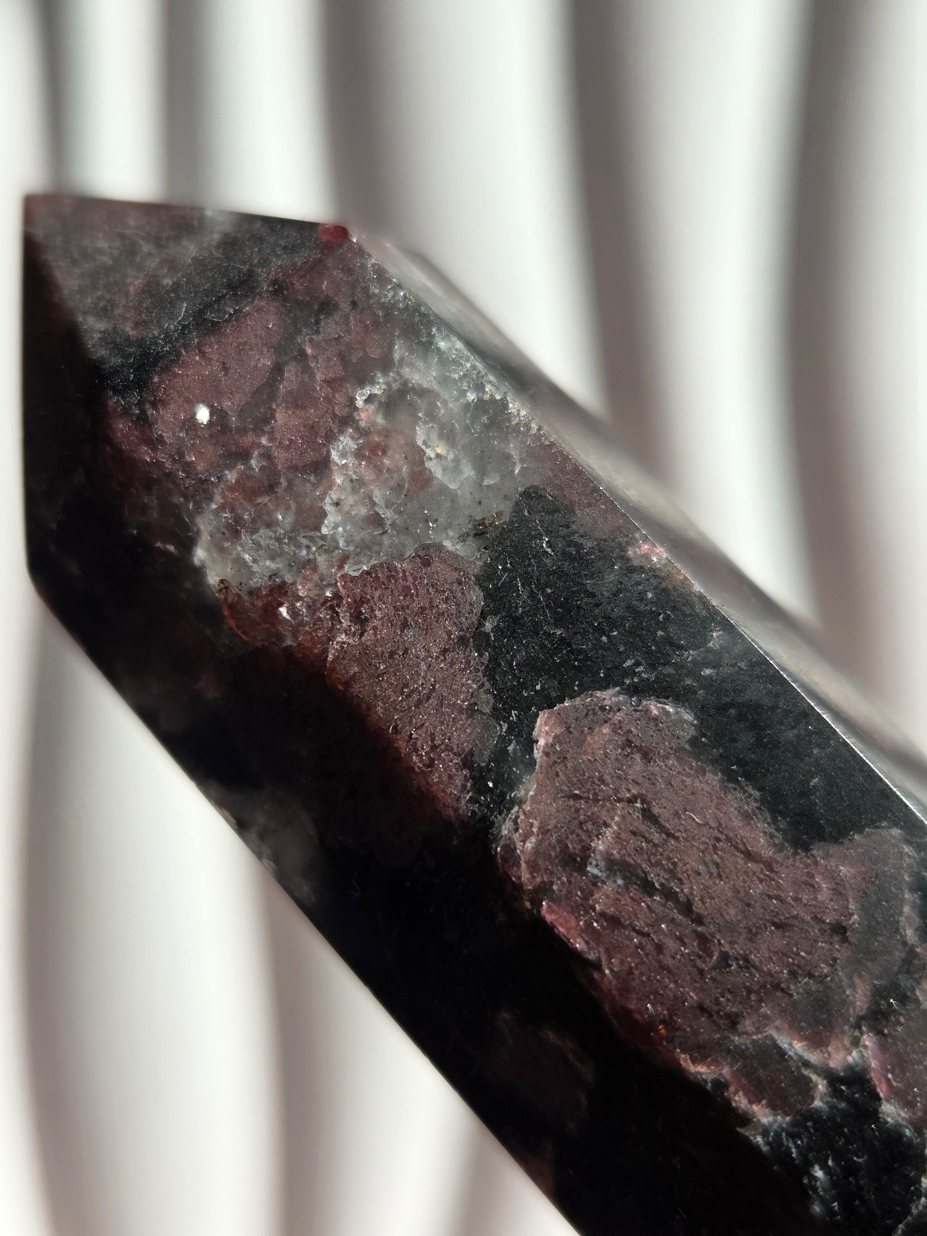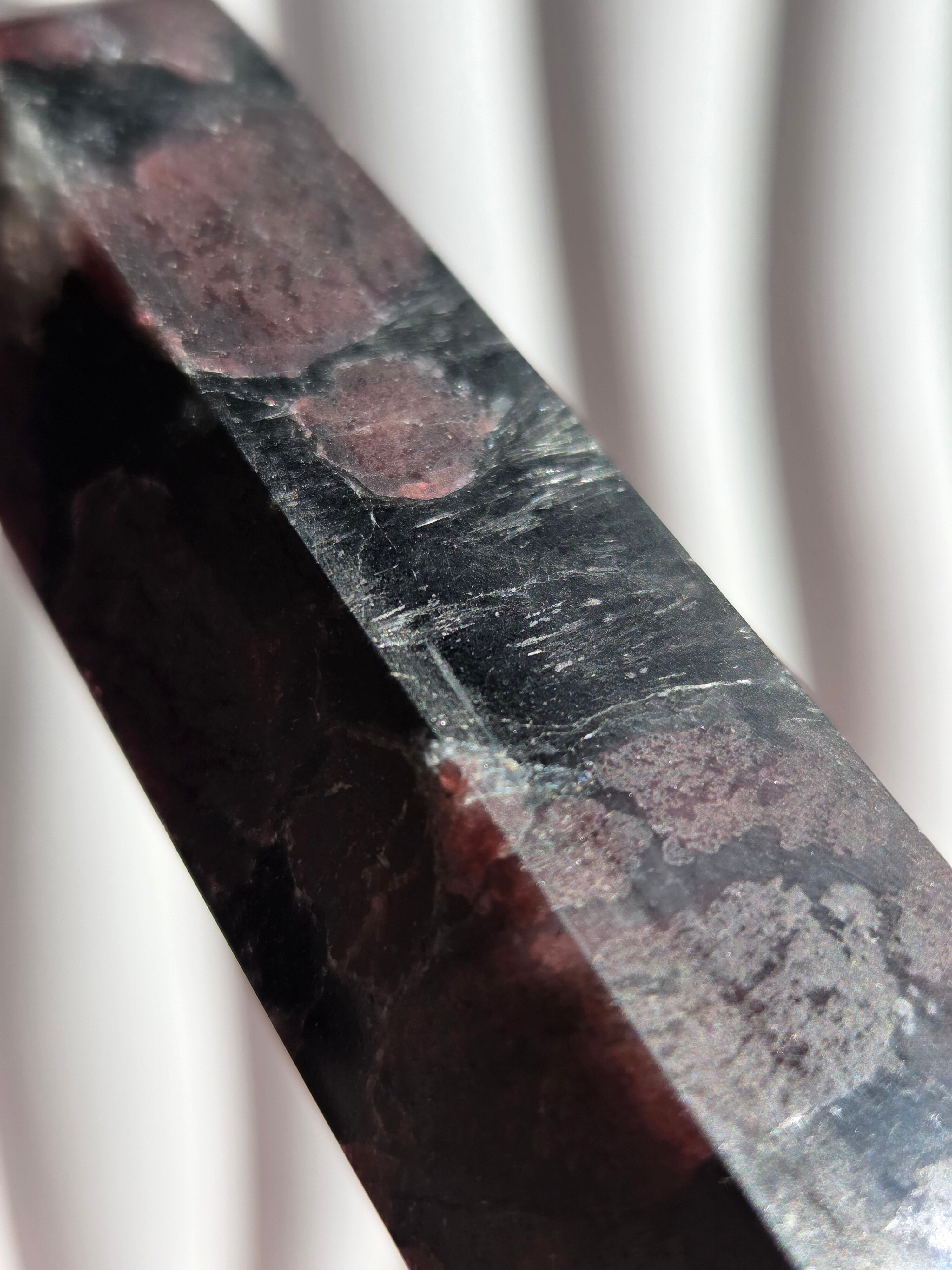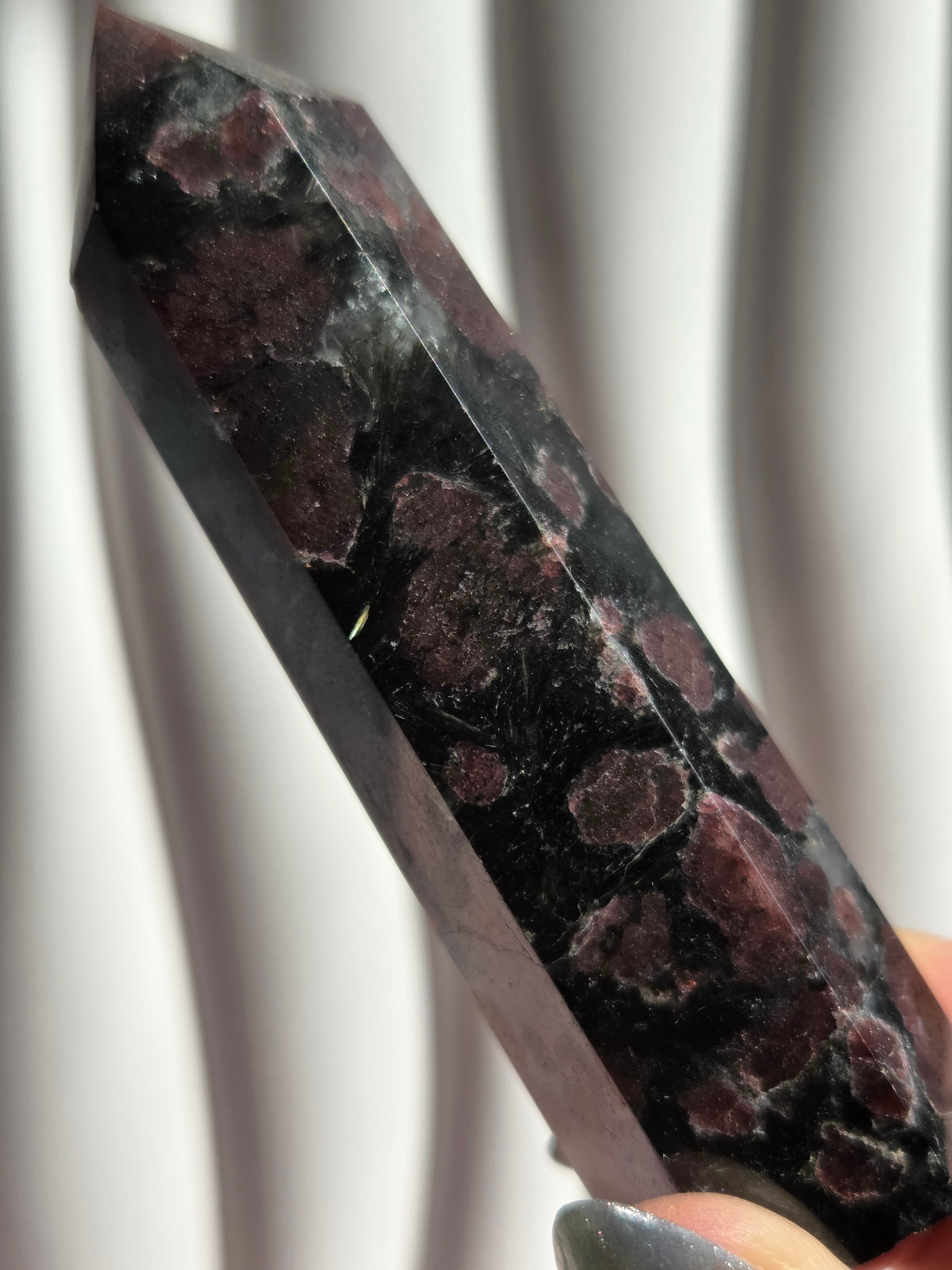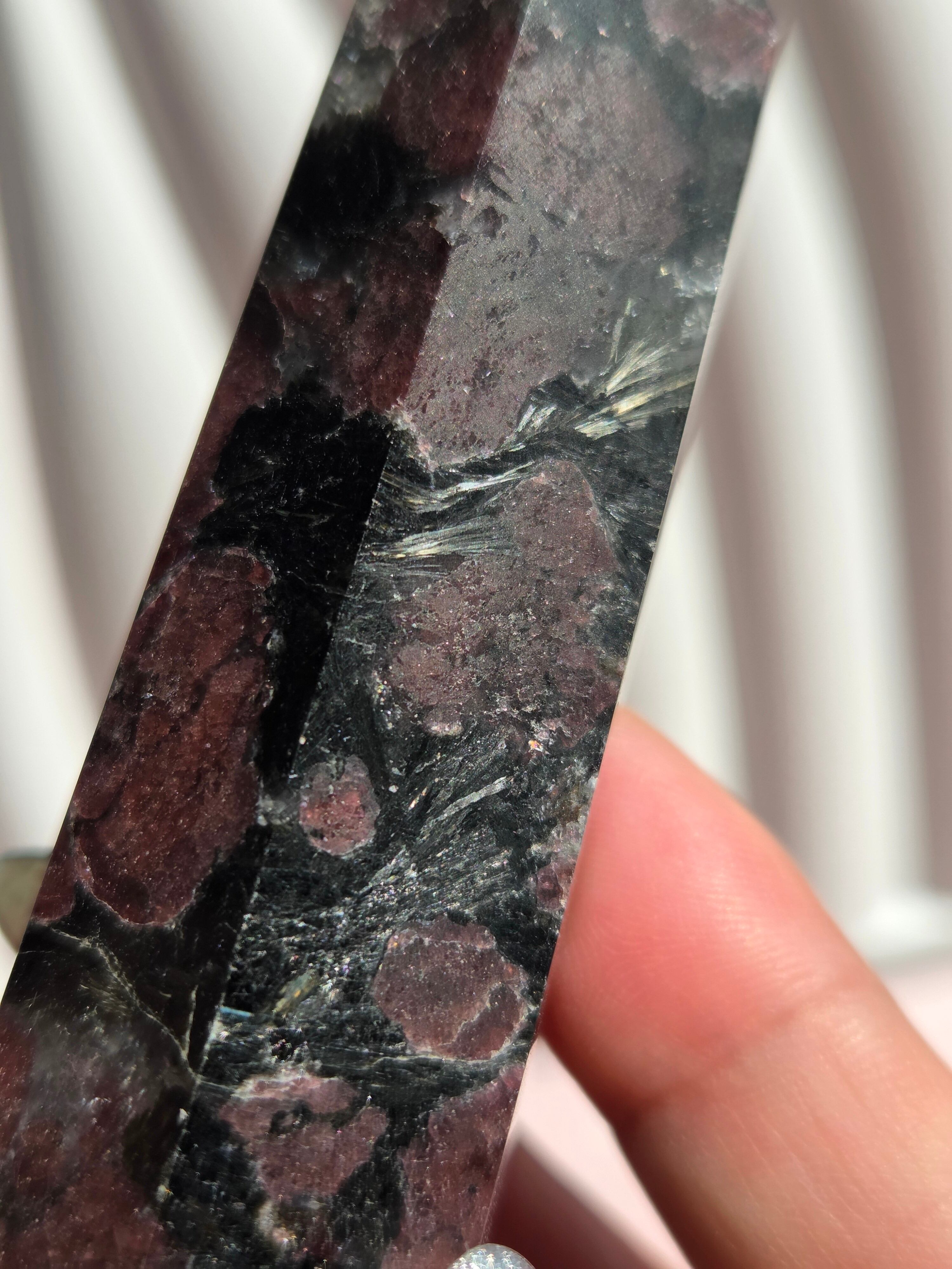 ガーネットの深い赤色に、黒色の部分ヌーマイトの特徴の、羽のように見える、ルチルのような輝きが、キラキラで圧巻のスフィアです。