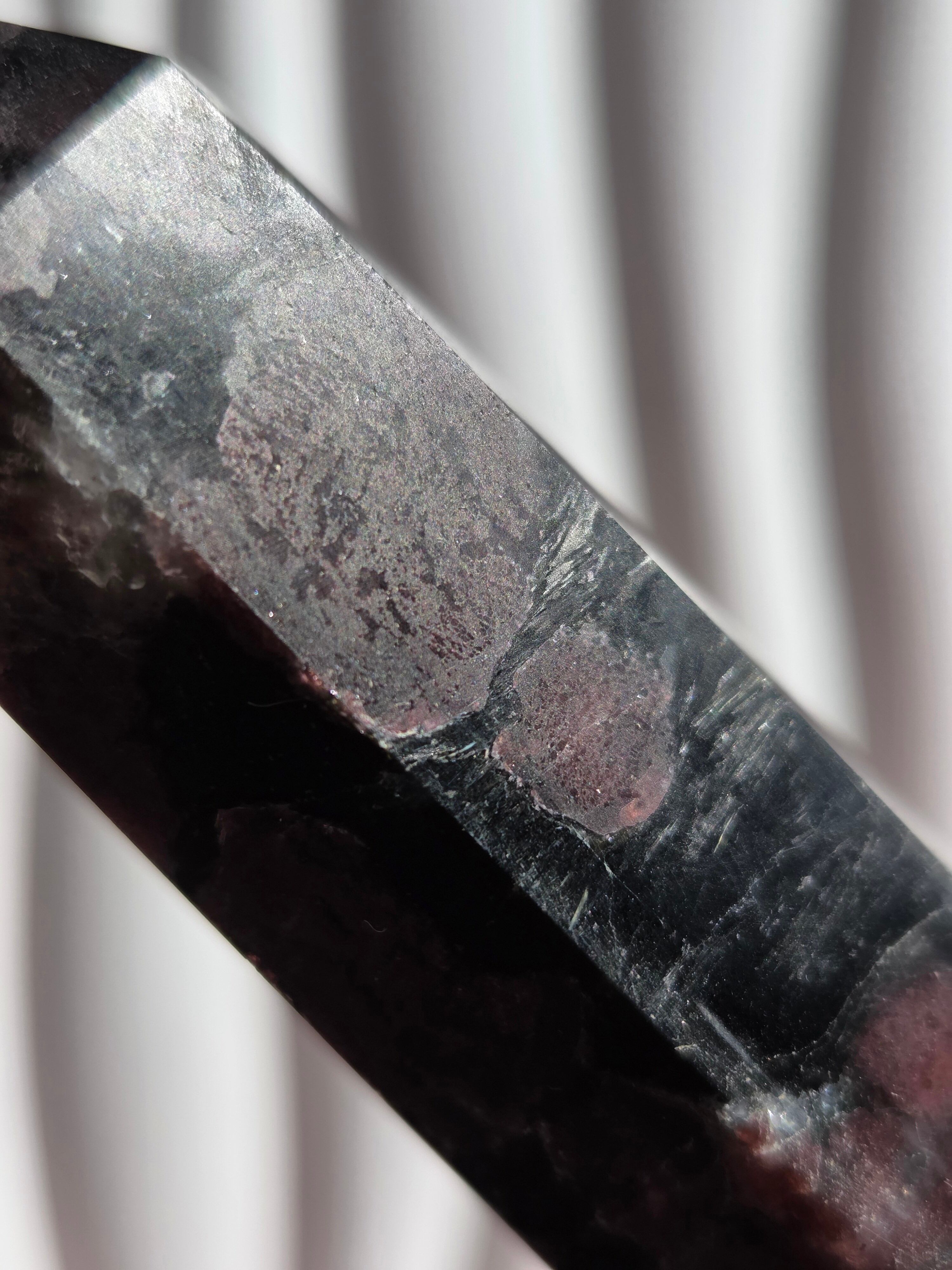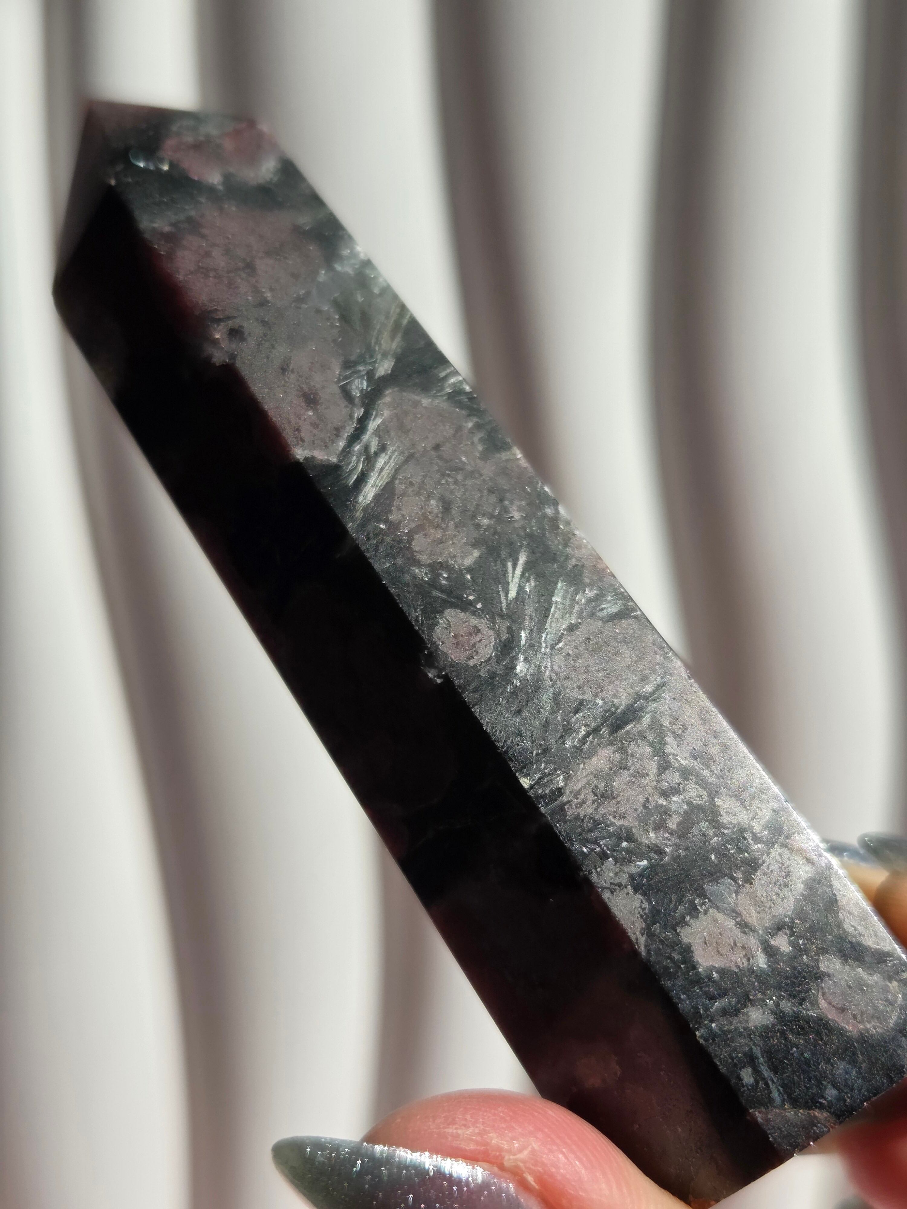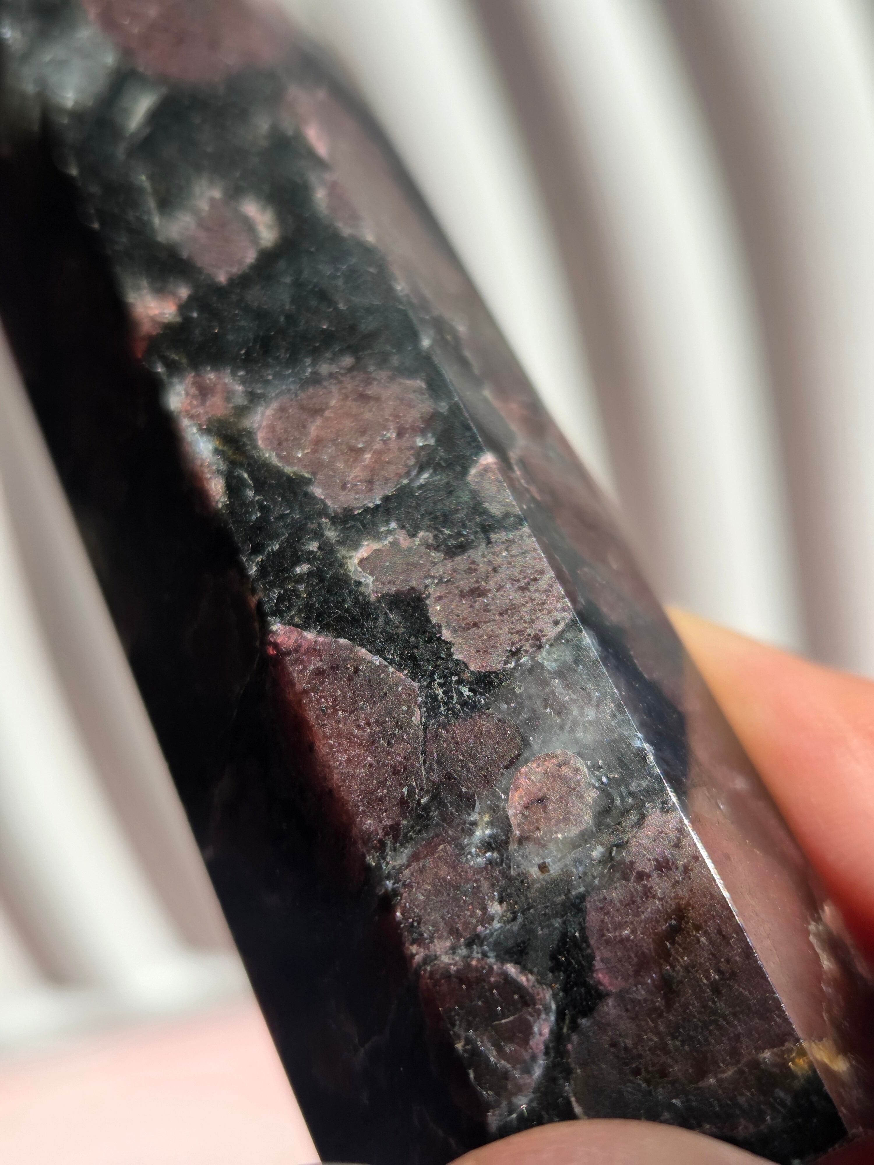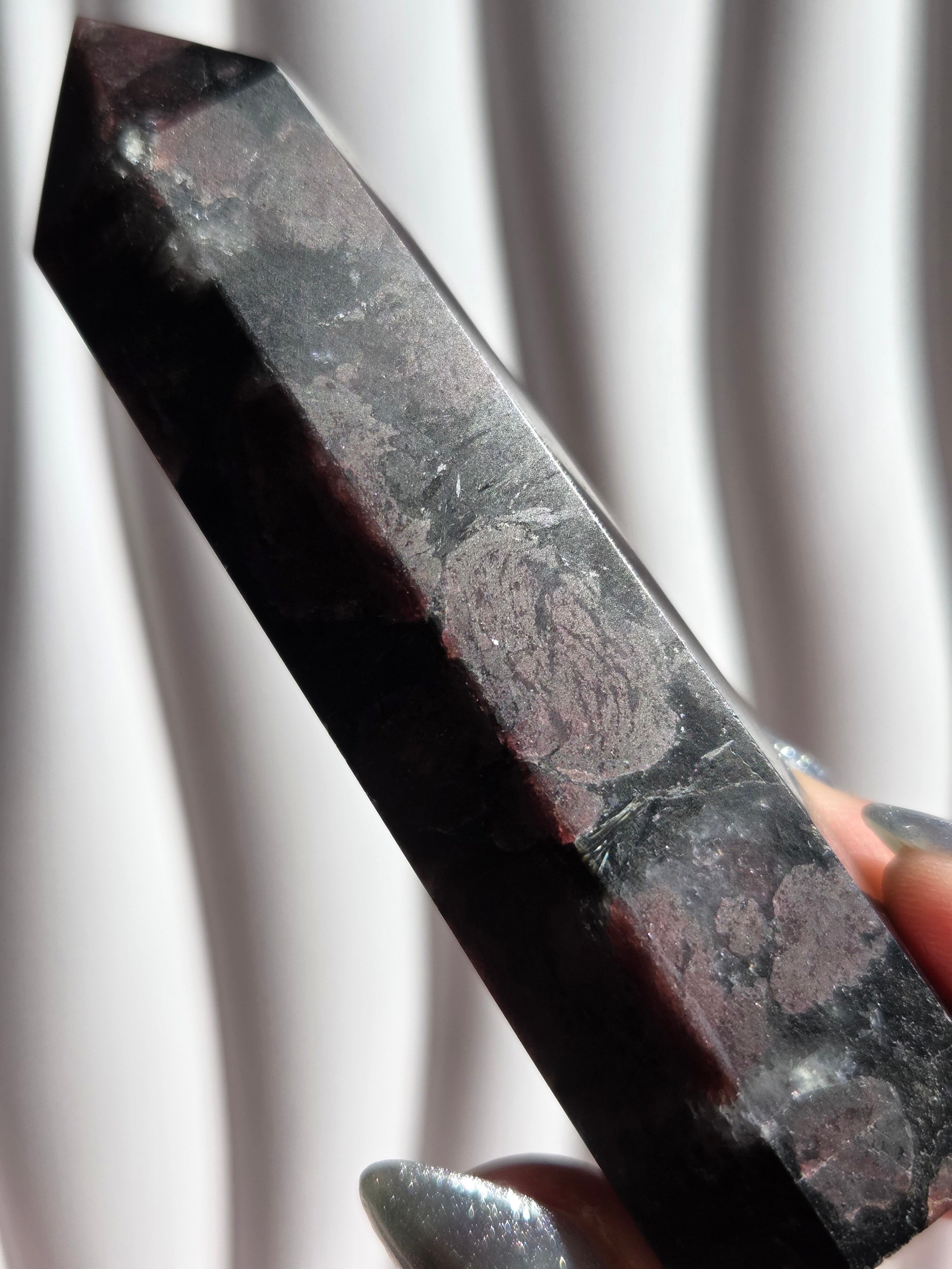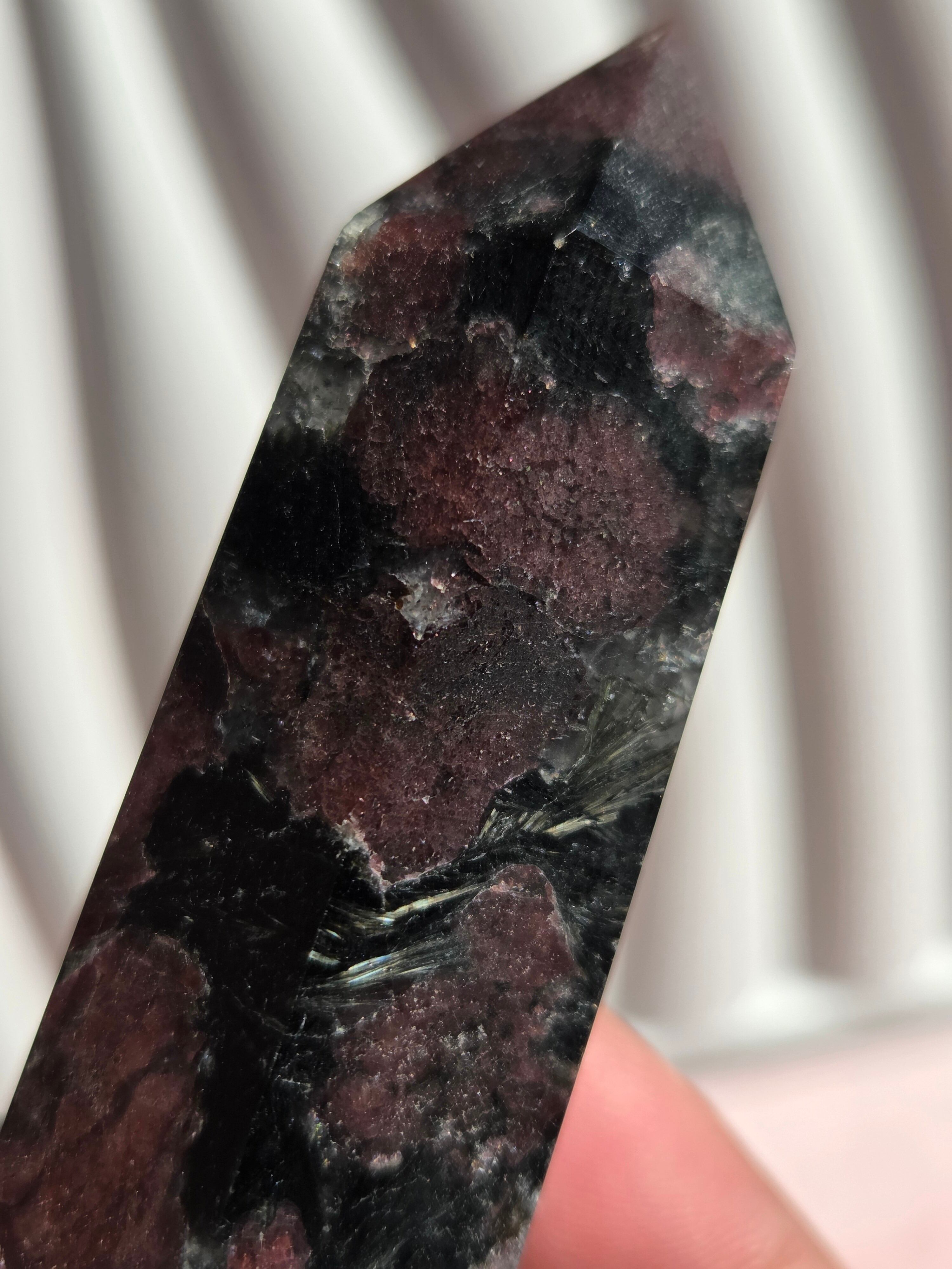 ガーネットの深い赤色に、黒色の部分ヌーマイトの特徴の、羽のように見える、ルチルのような輝きが、キラキラで圧巻のスフィアです。
