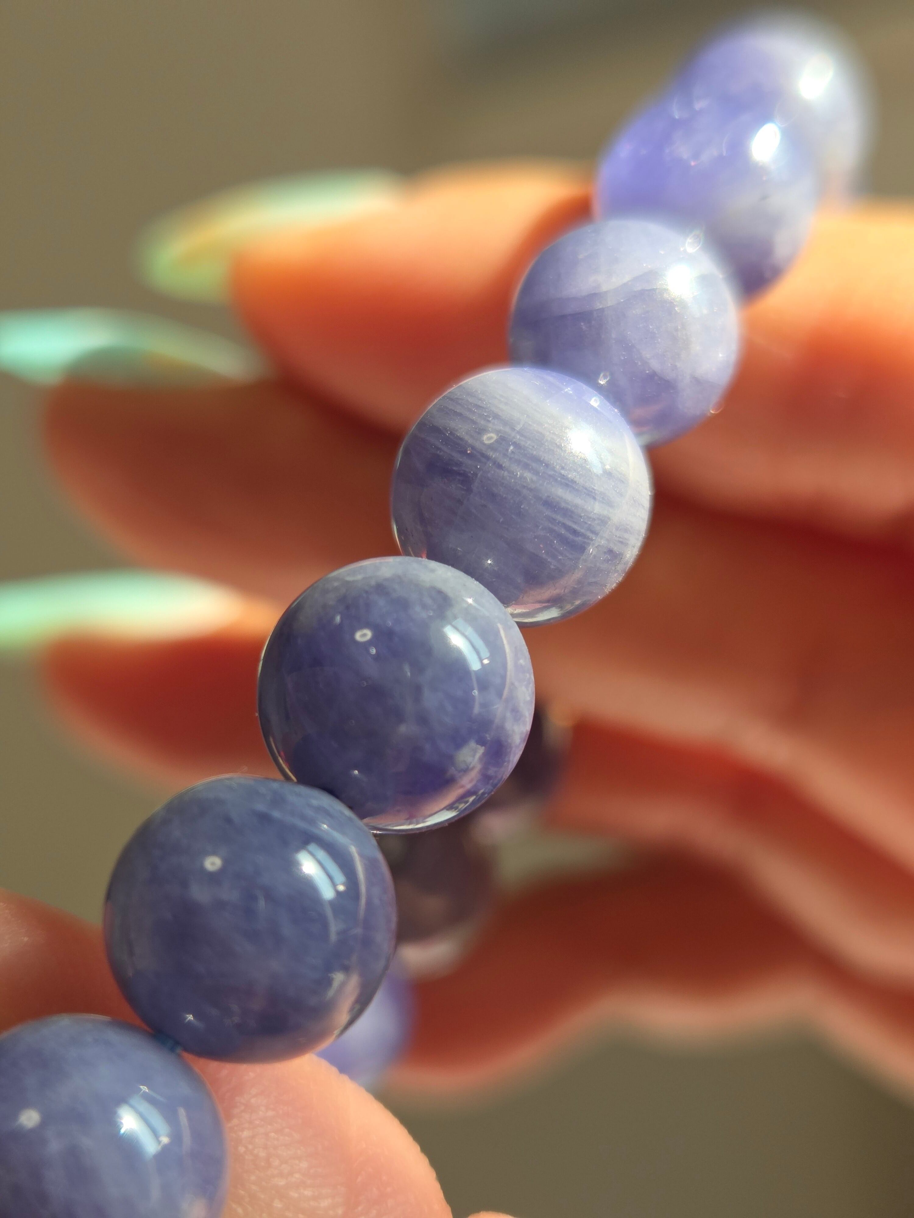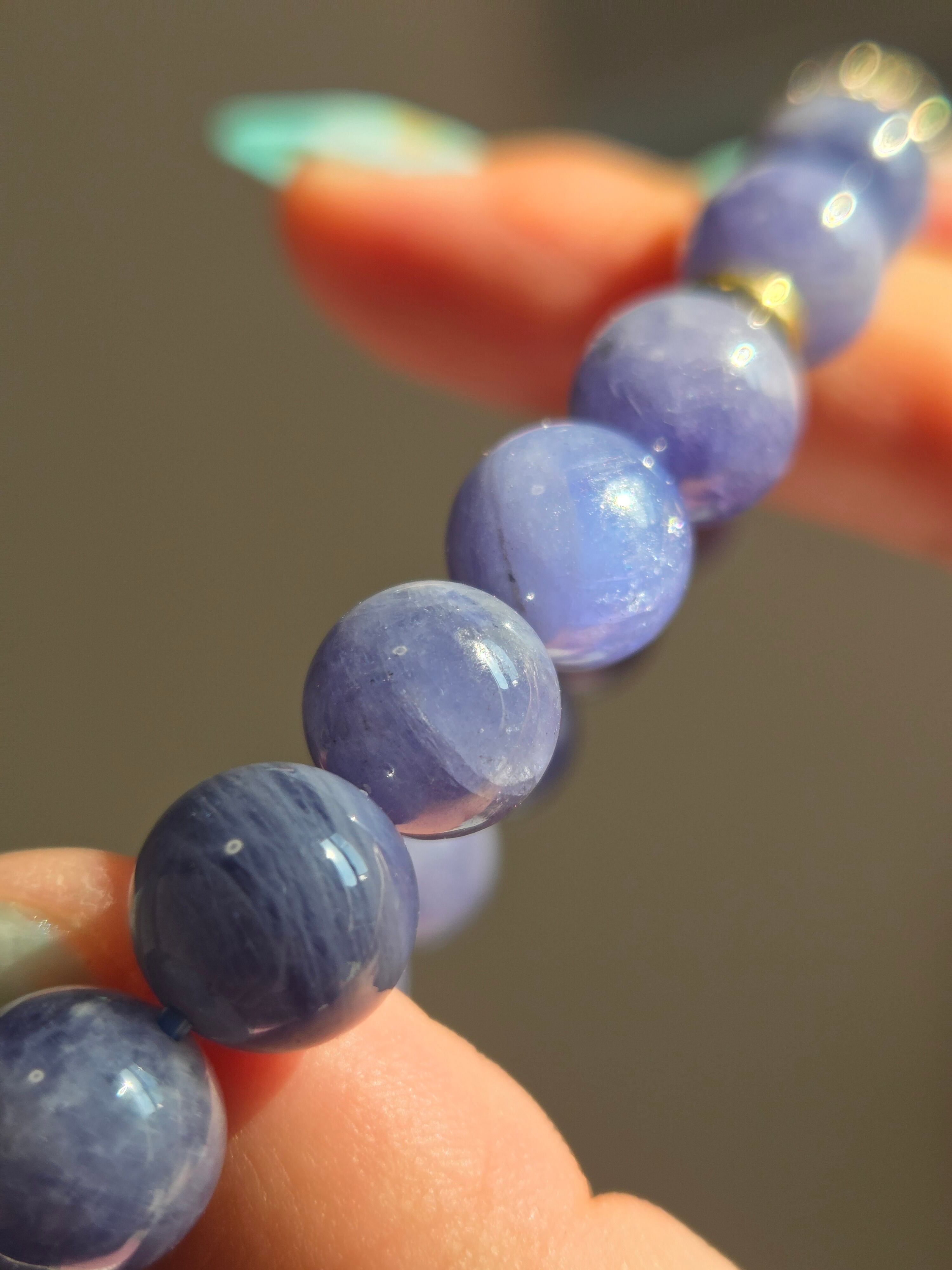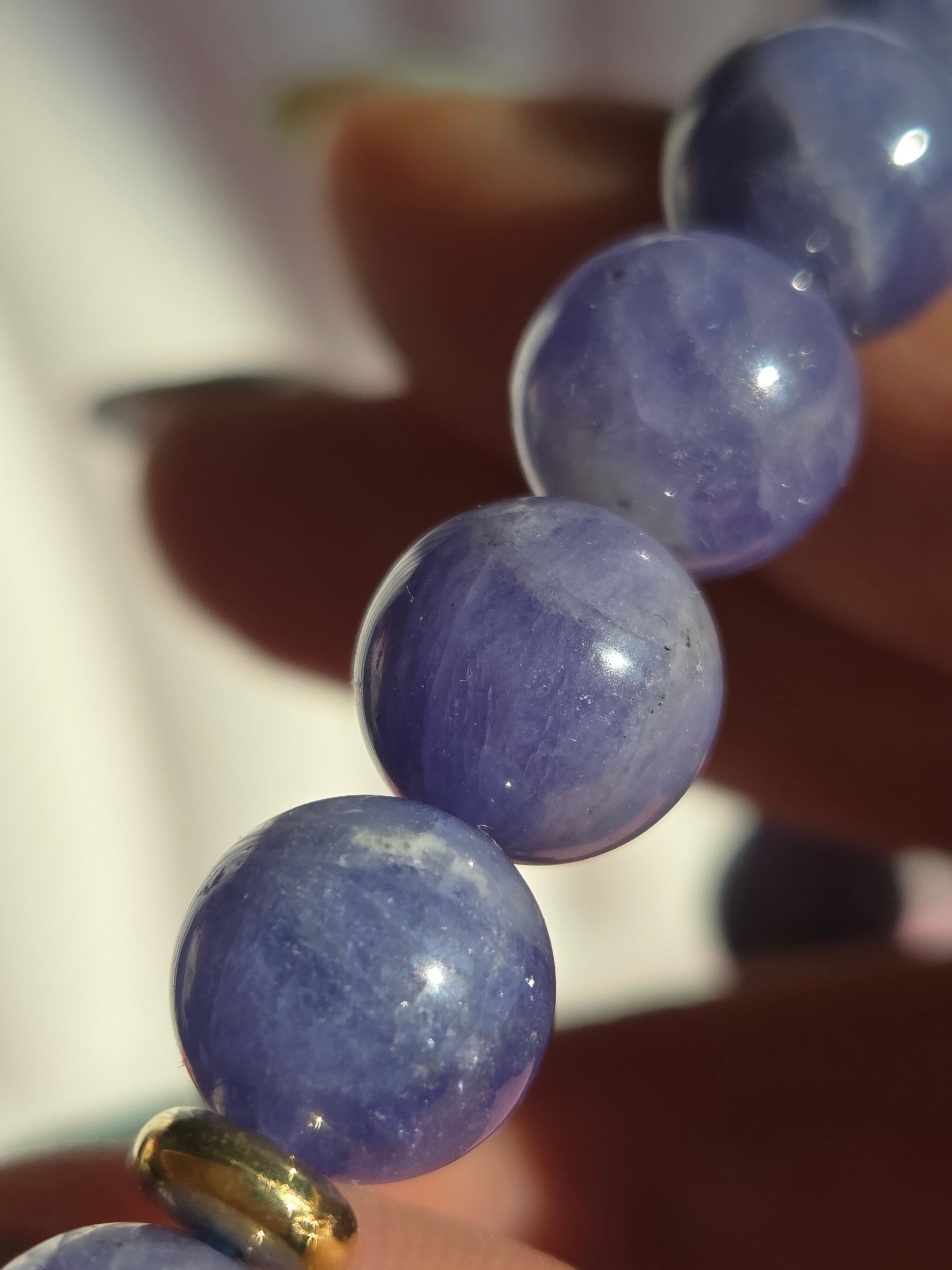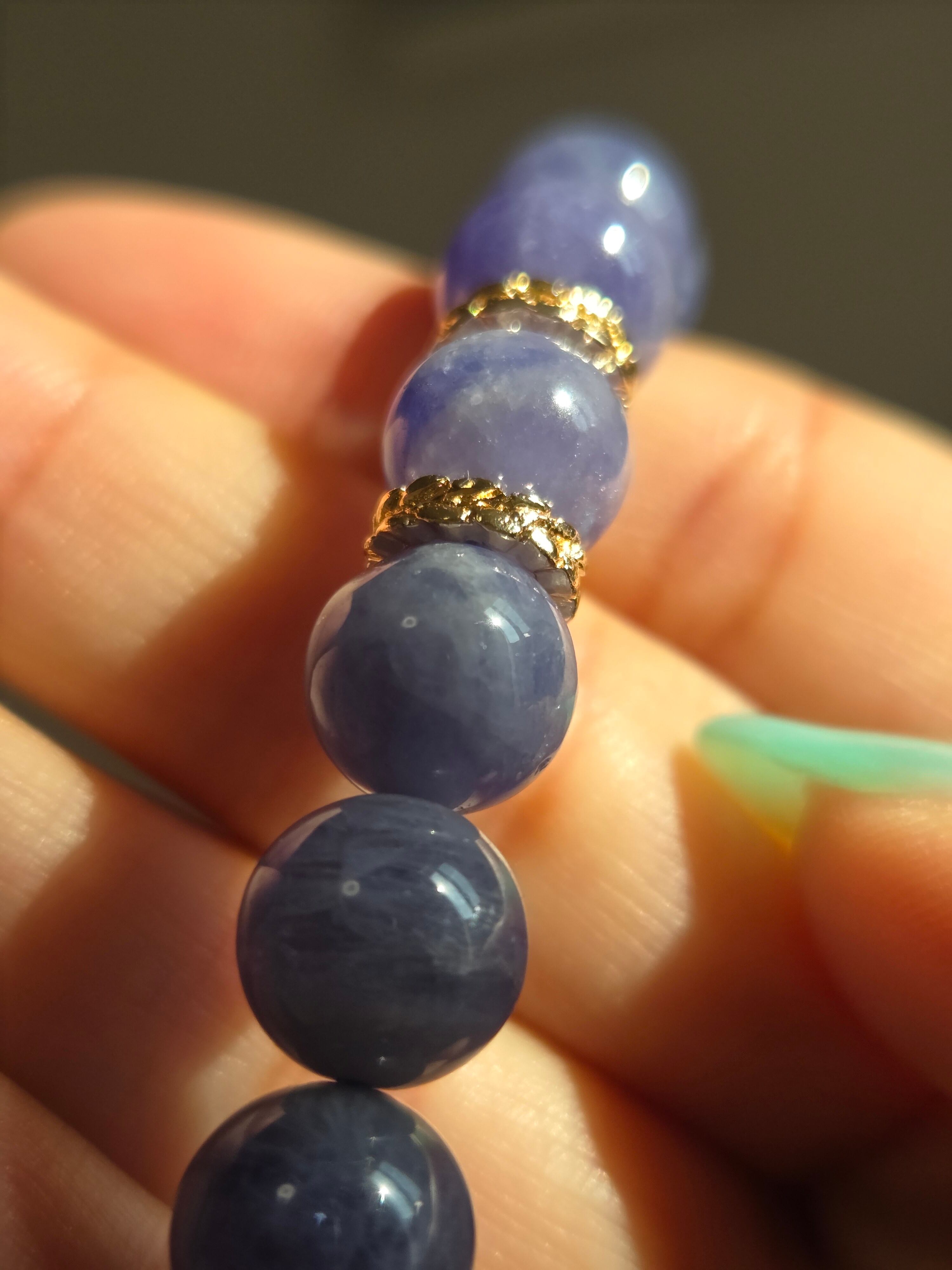 タンザナイトは、紫色を含んだ青色をした神秘的な石です。この青紫色は、微量のバナジウムを含有しているためだとされています。