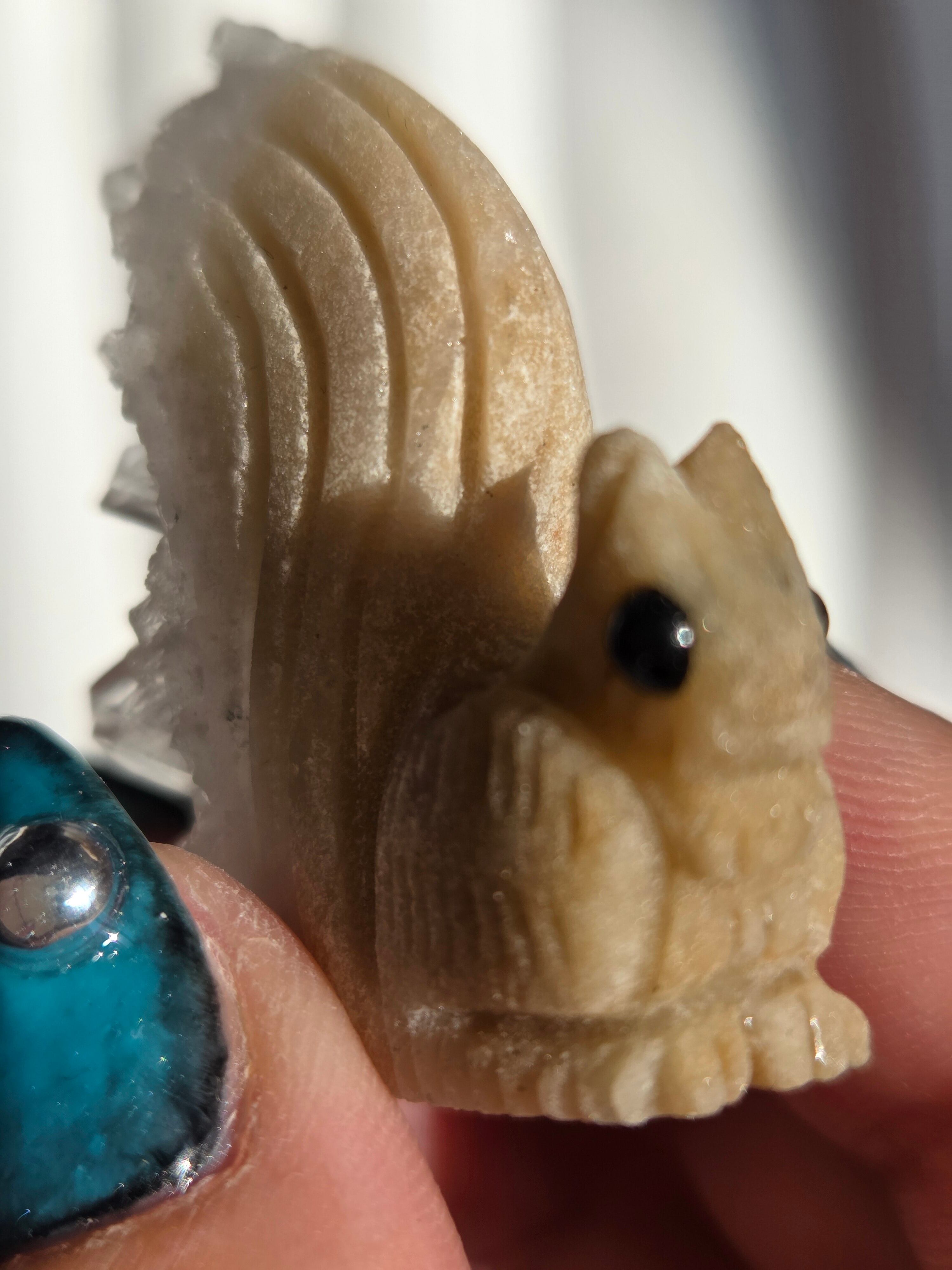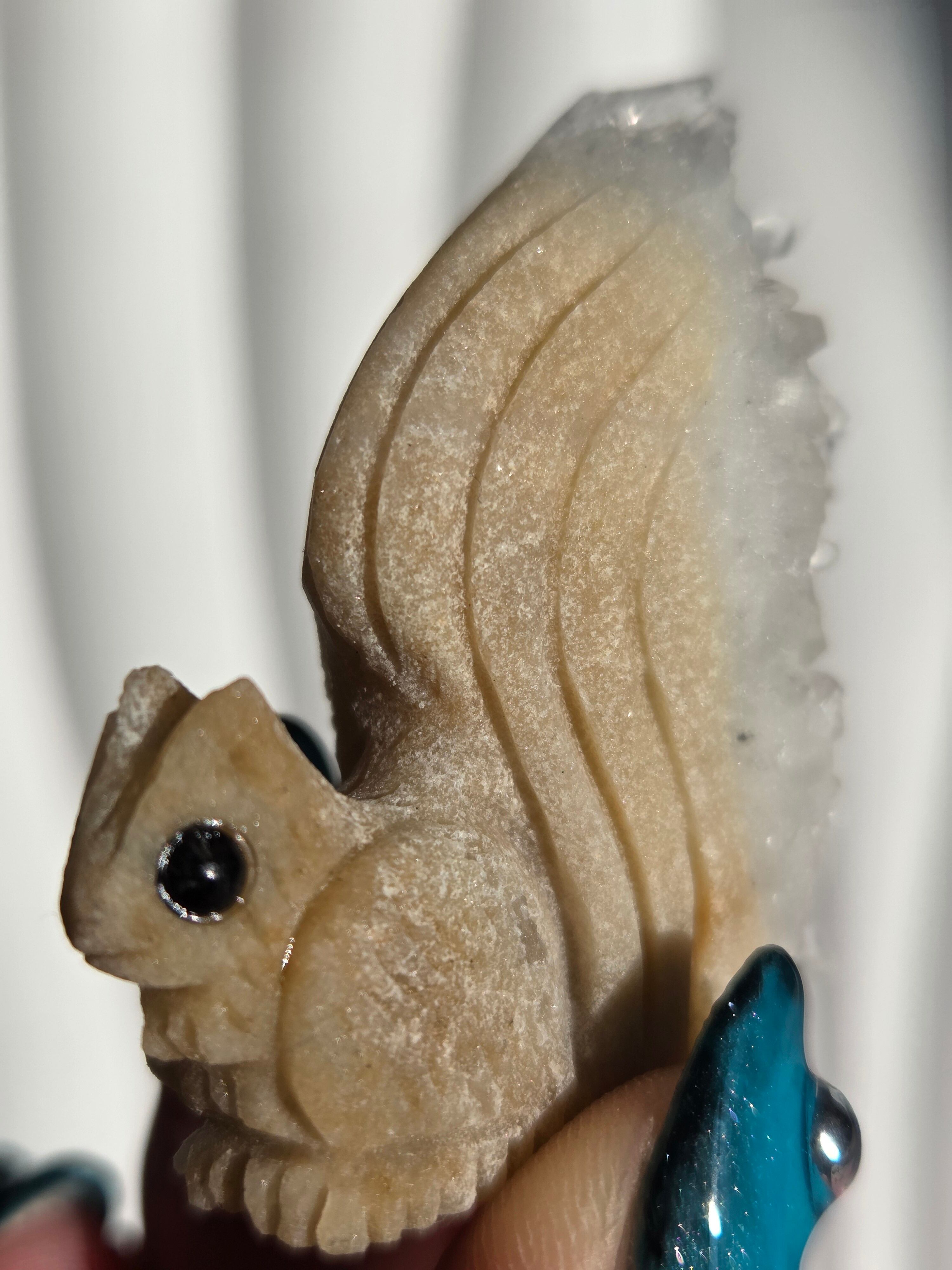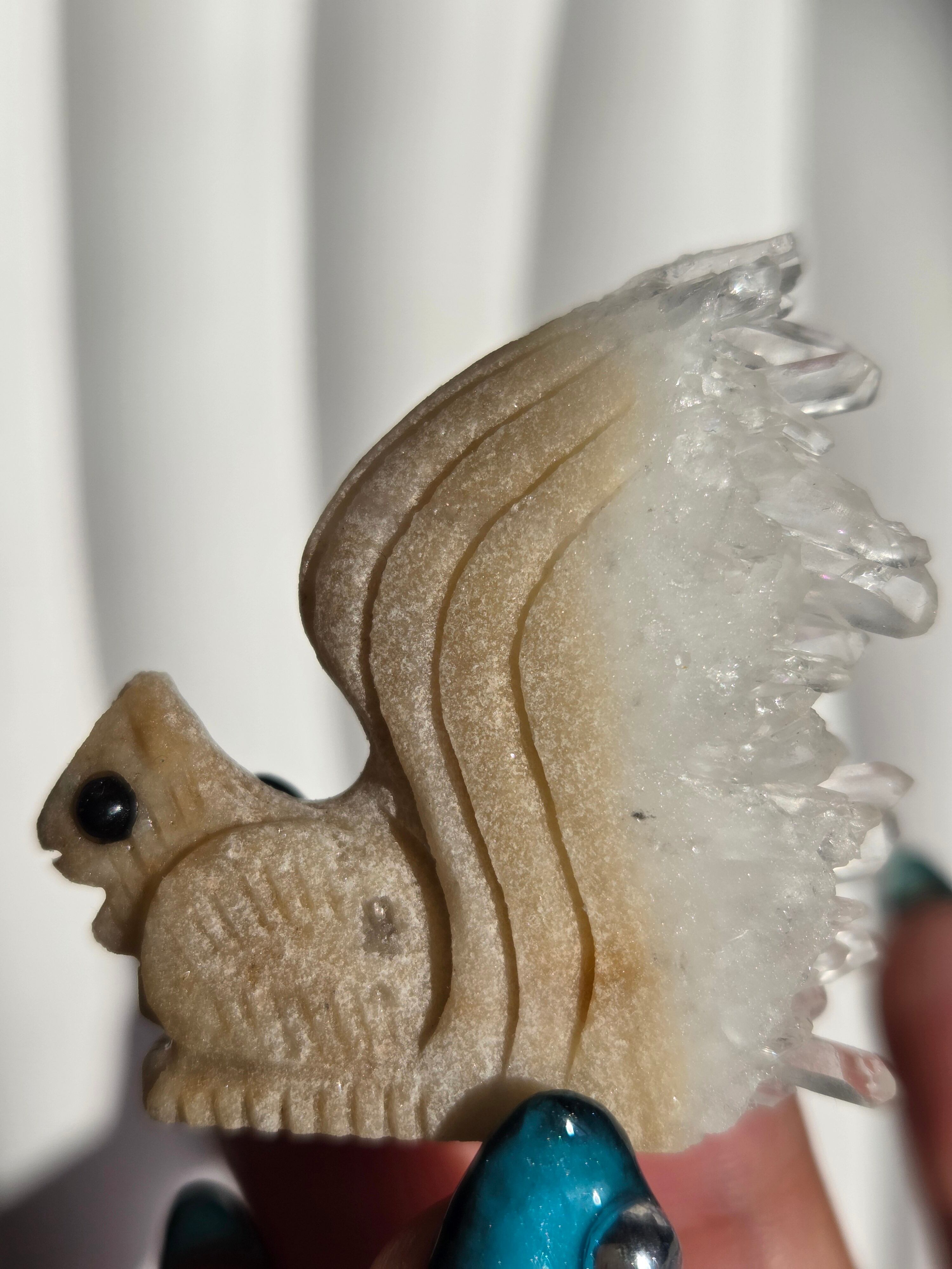 りすのカービングで、尻尾部分は水晶クラスターになった可愛い置物です。