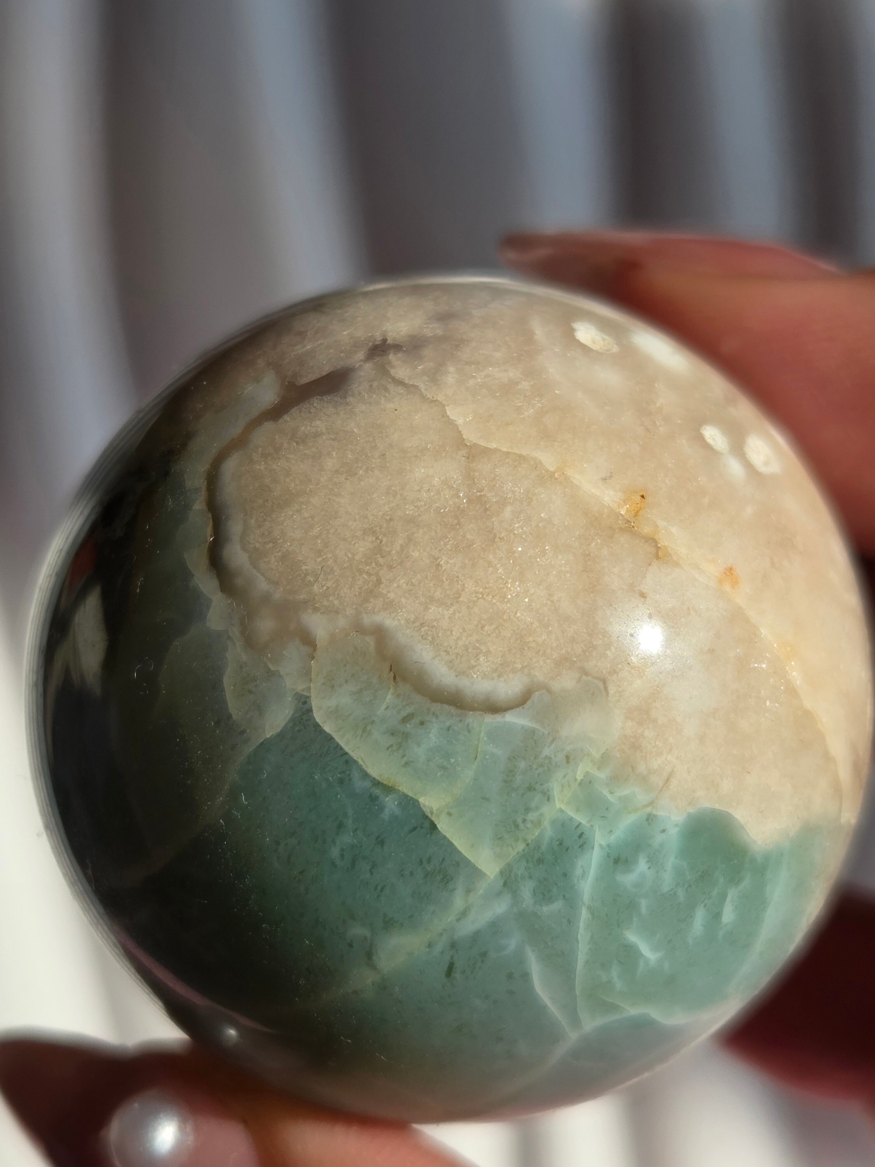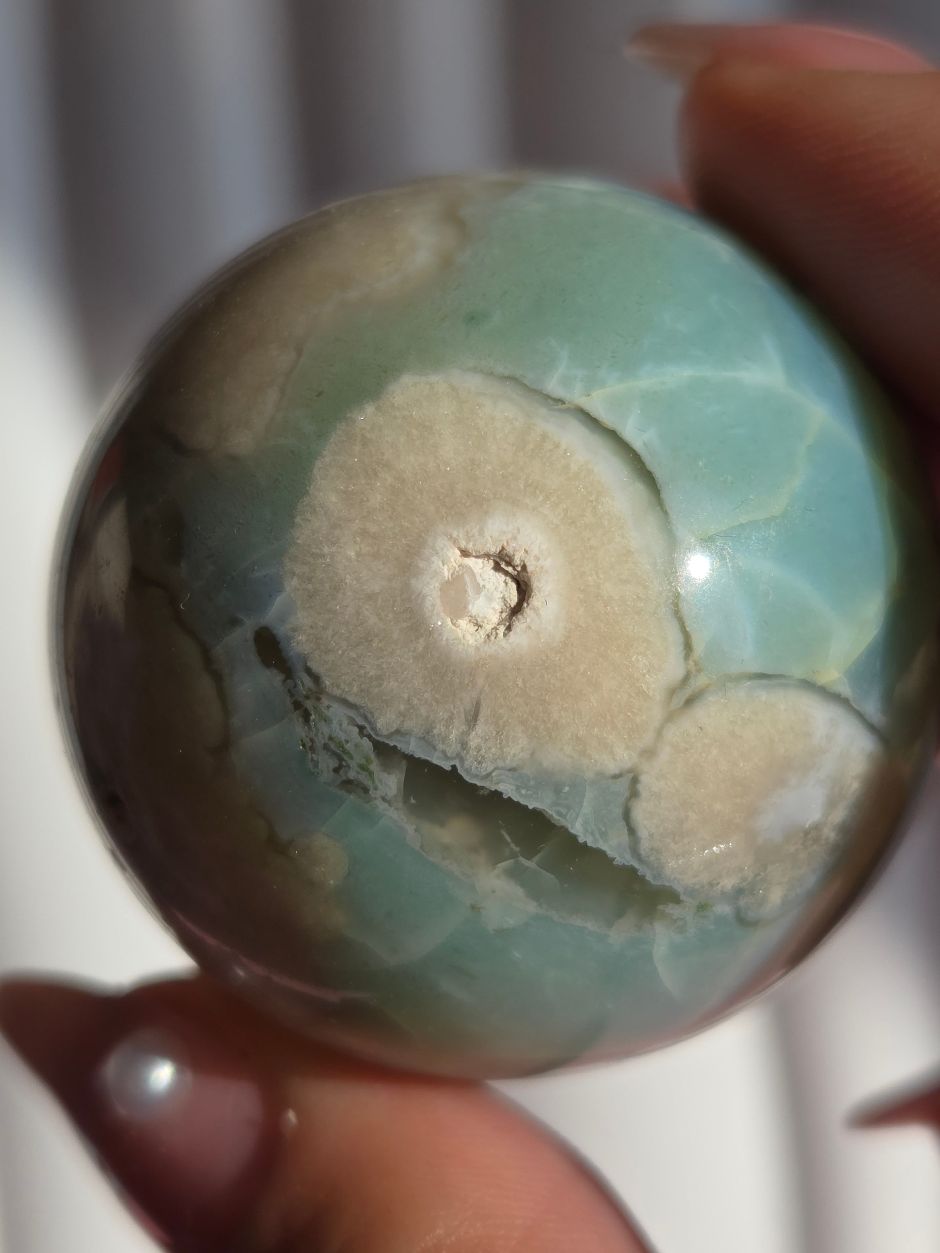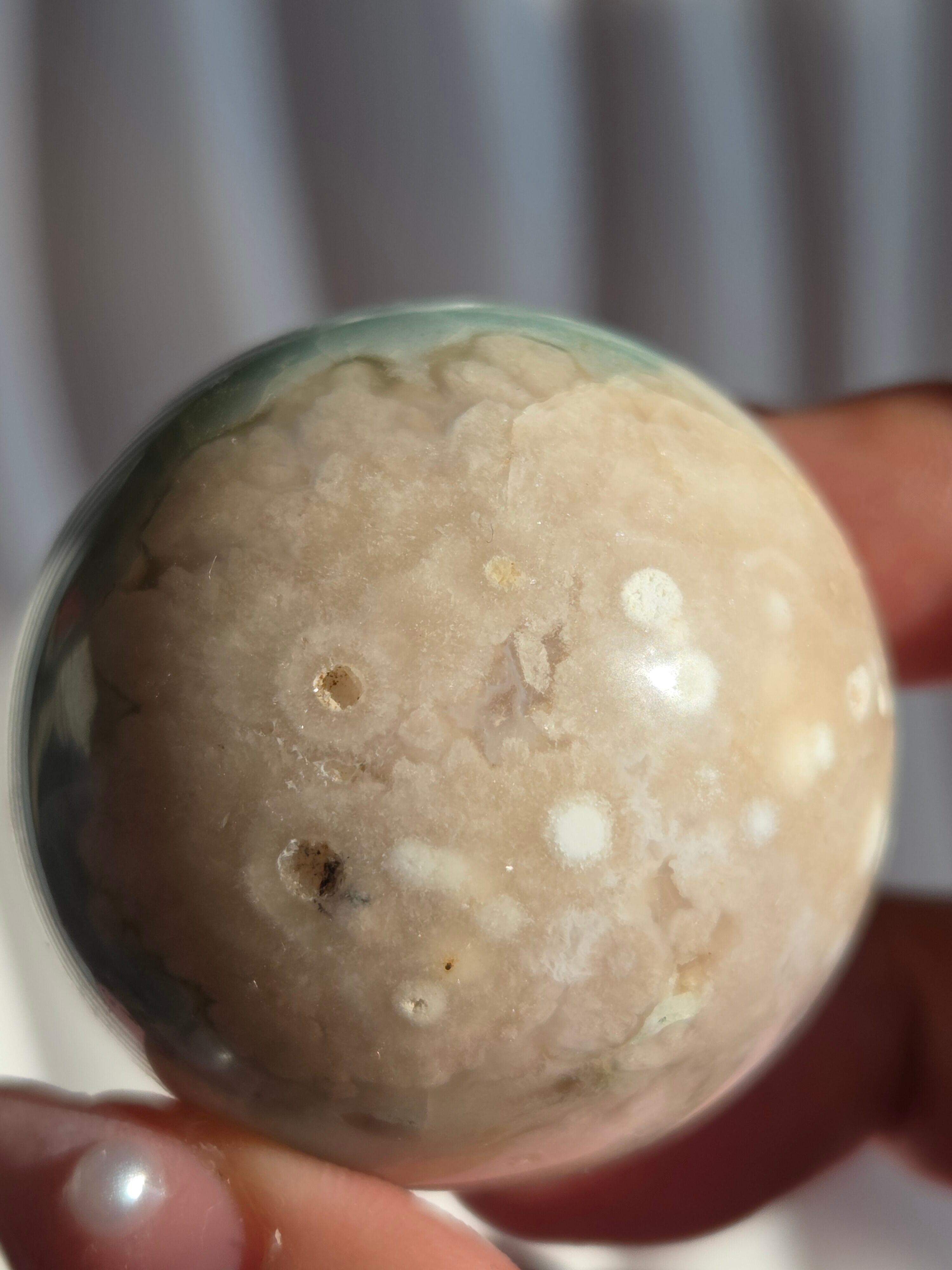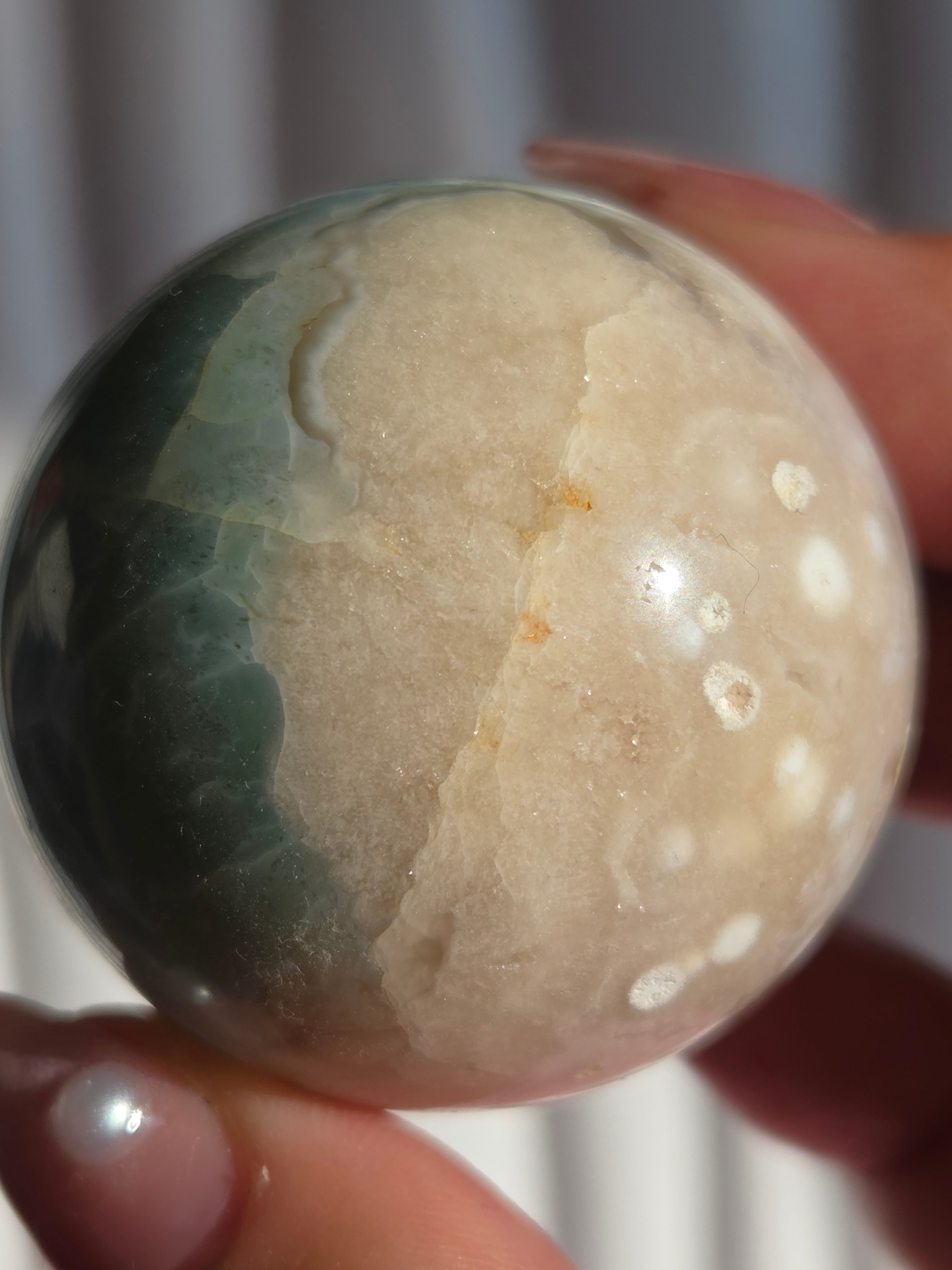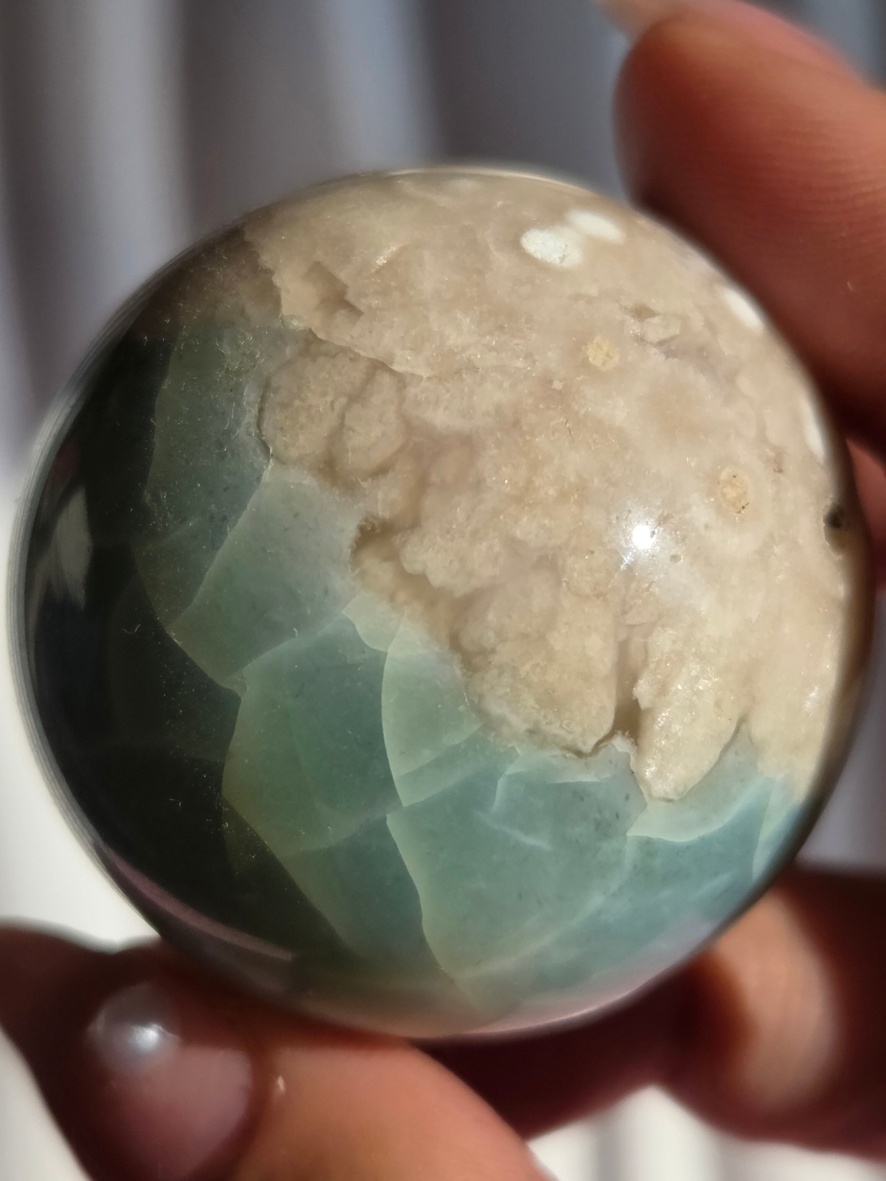 グリーンフラワーアゲート(緑桜瑪瑙)スフィアです。パステルグリーンをメインに、お花柄が散りばめられた素敵なスフィア。