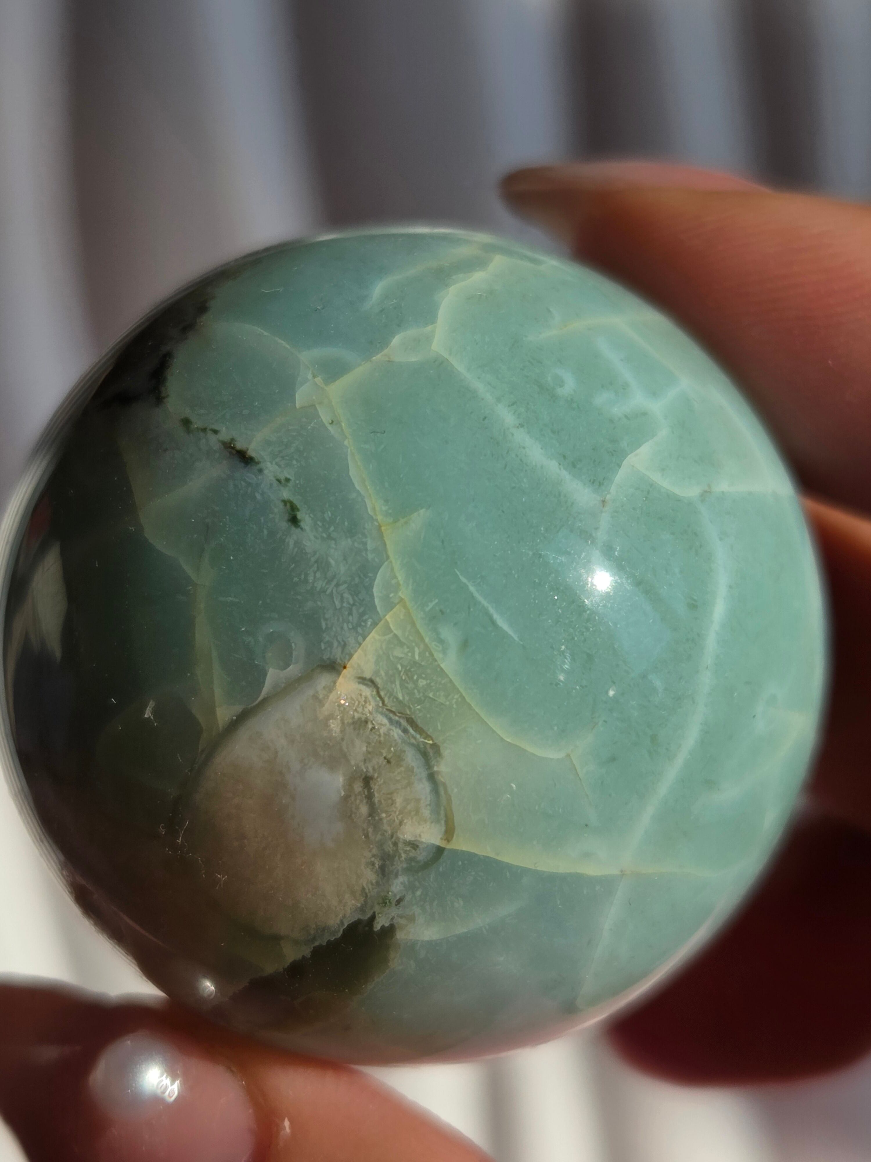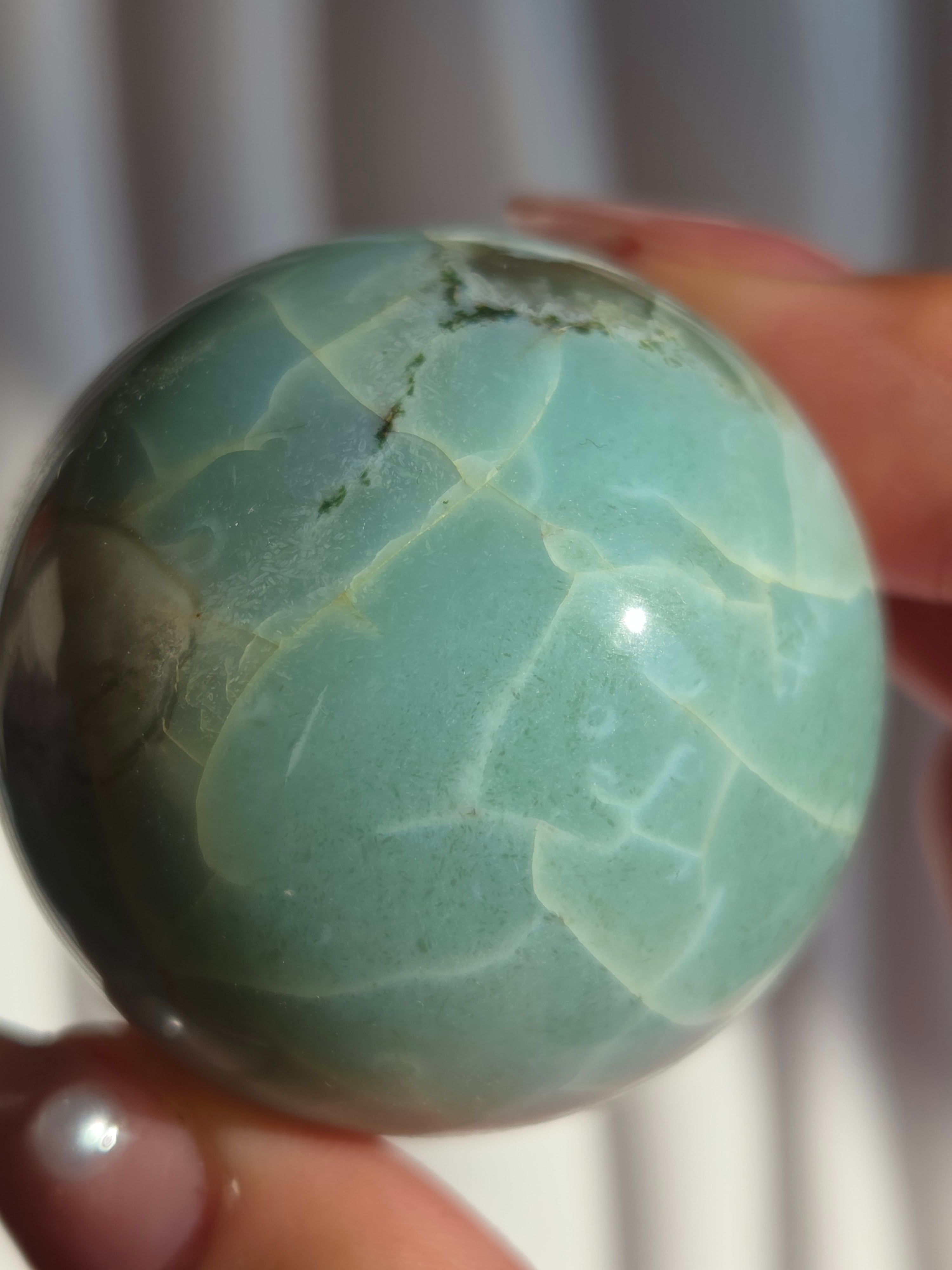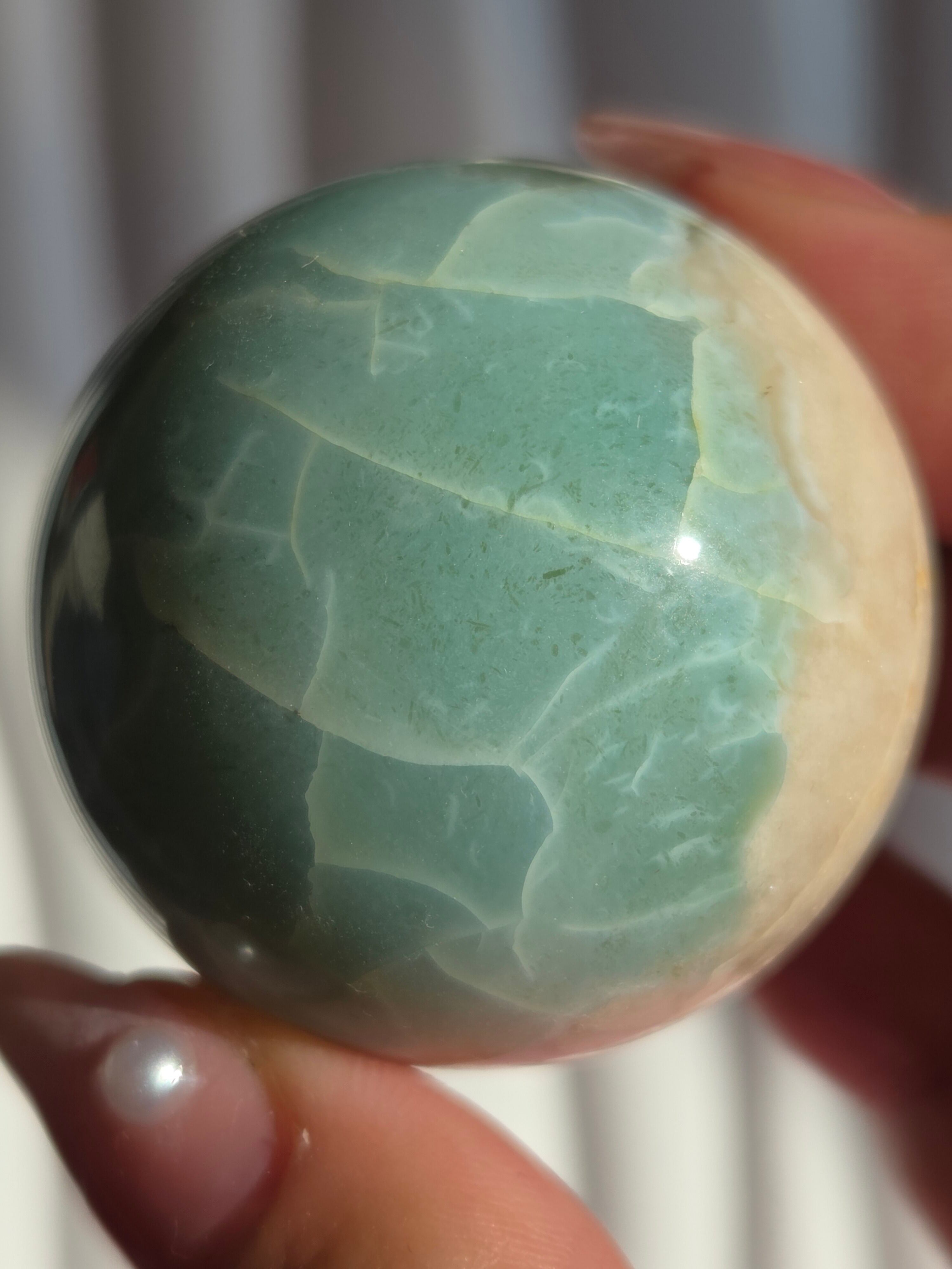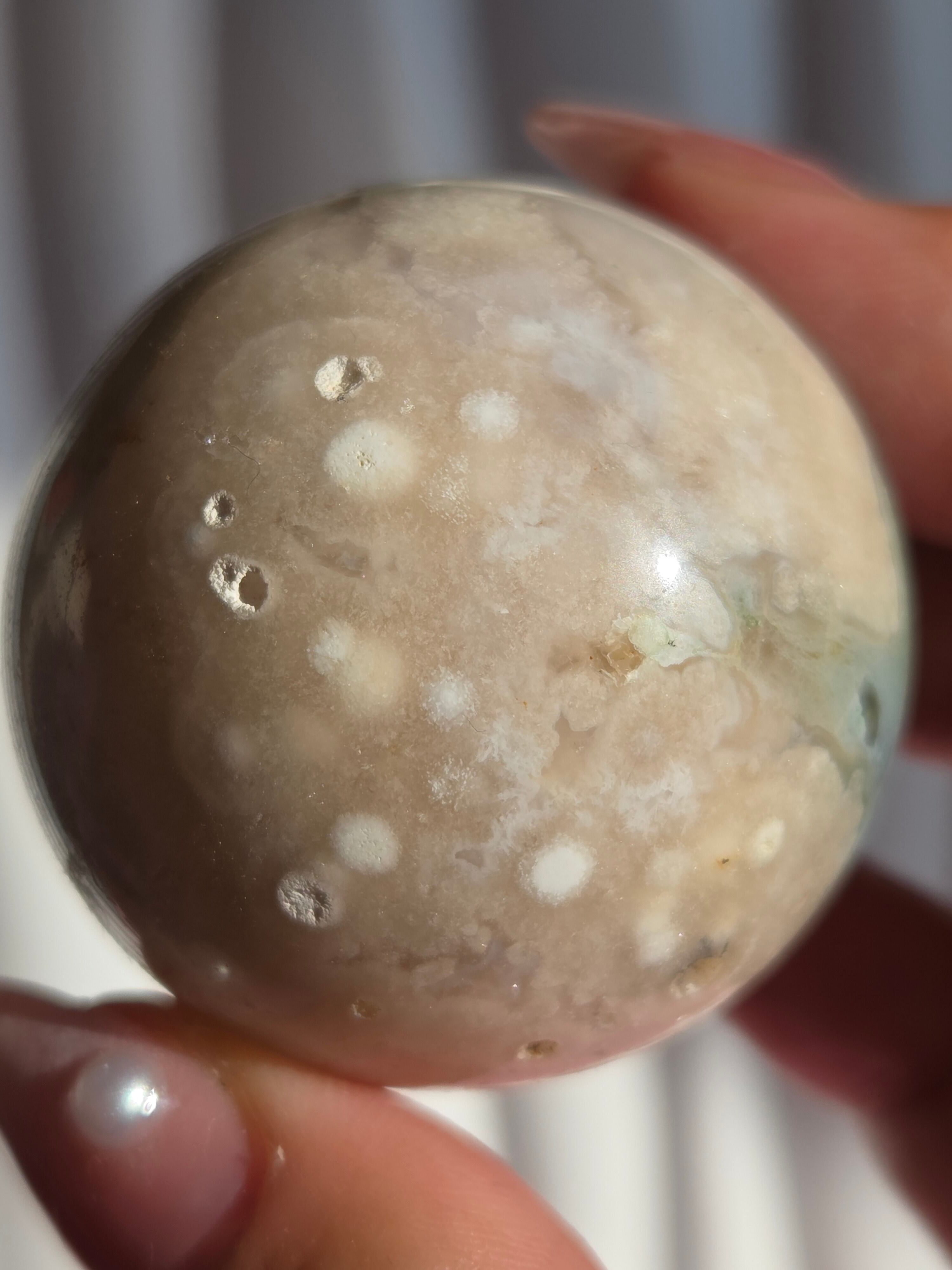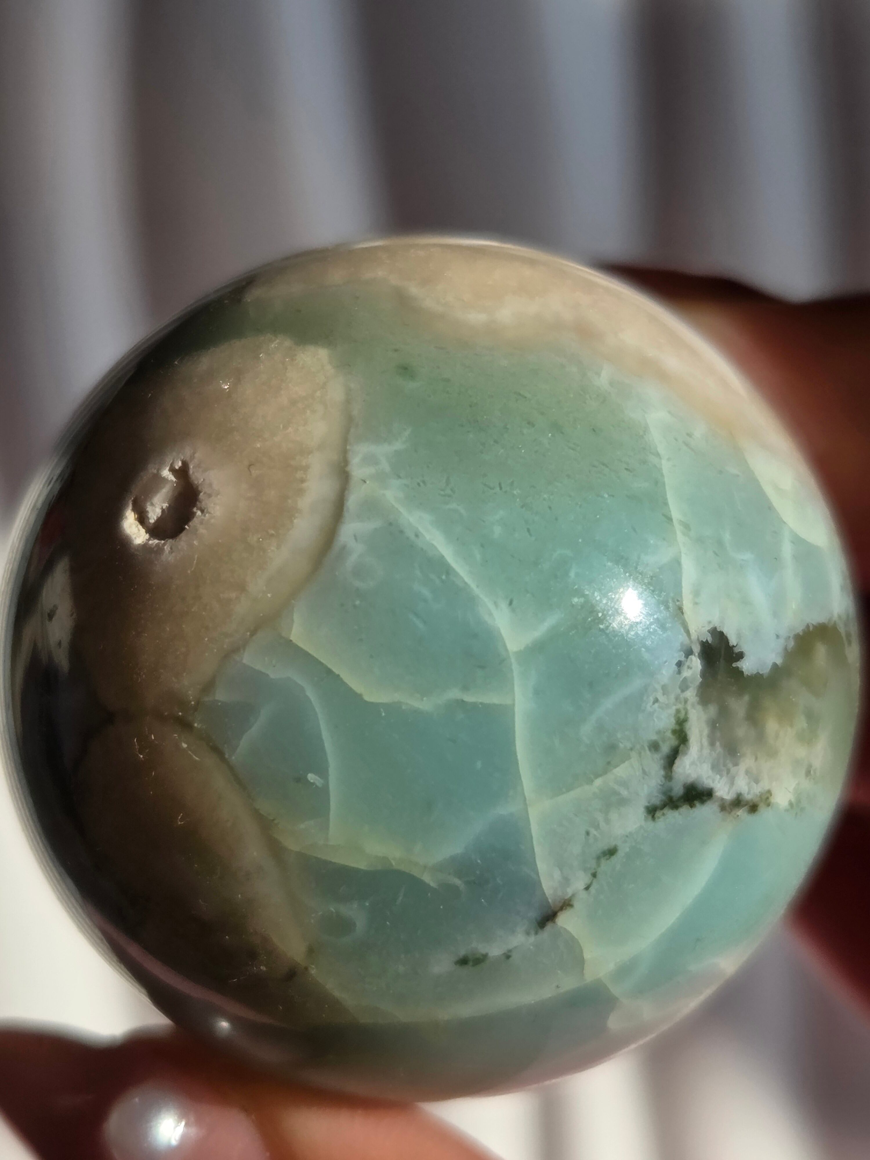 グリーンフラワーアゲート(緑桜瑪瑙)スフィアです。パステルグリーンをメインに、お花柄が散りばめられた素敵なスフィア。