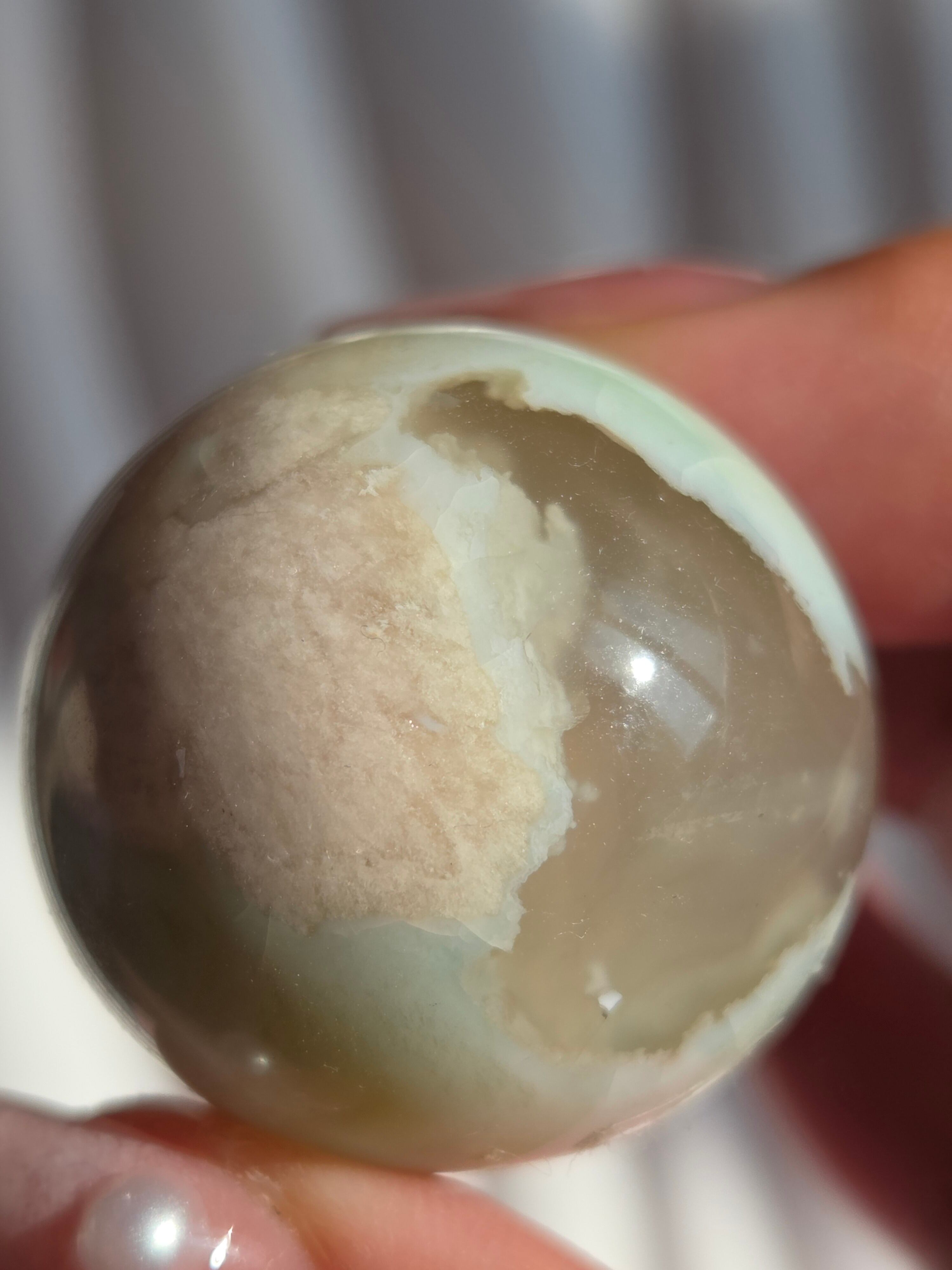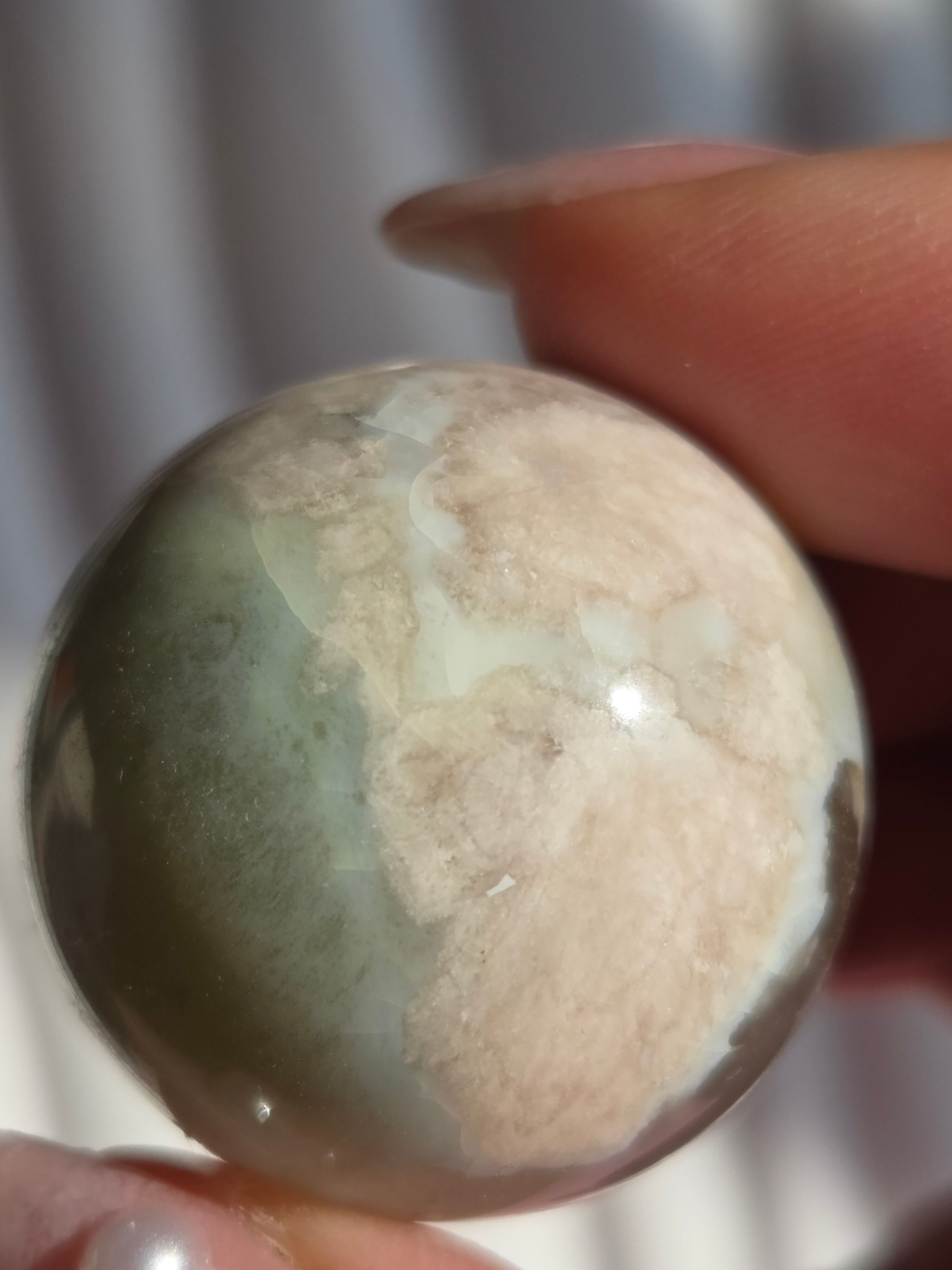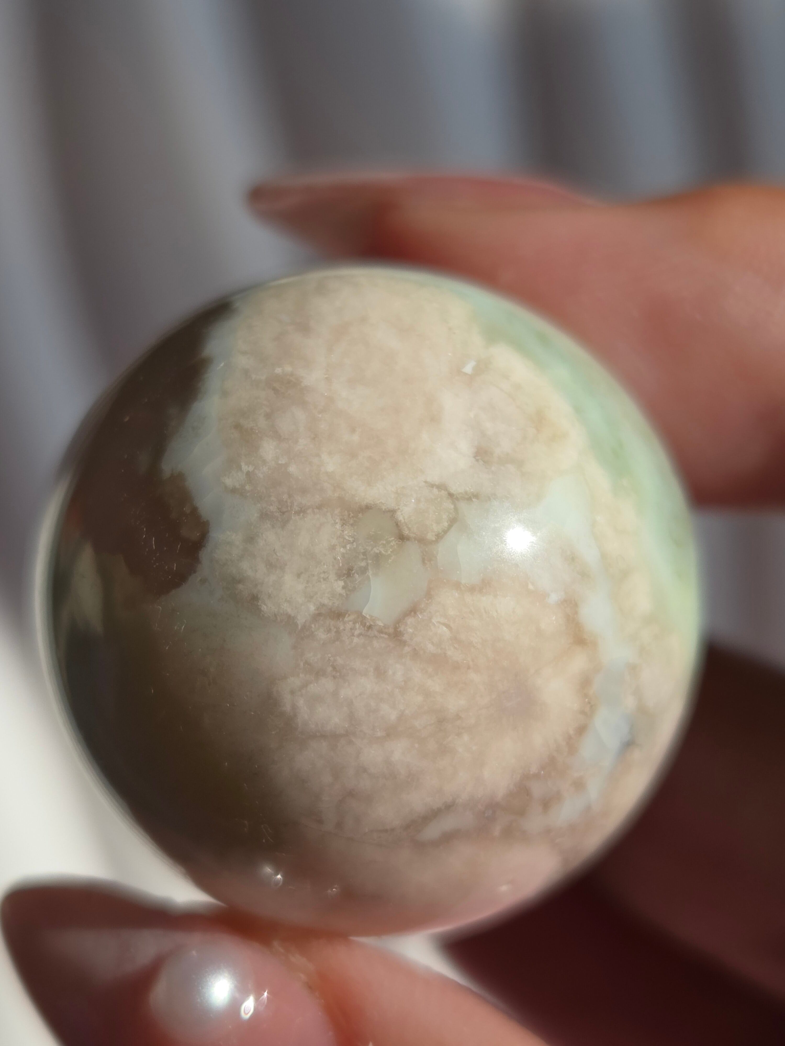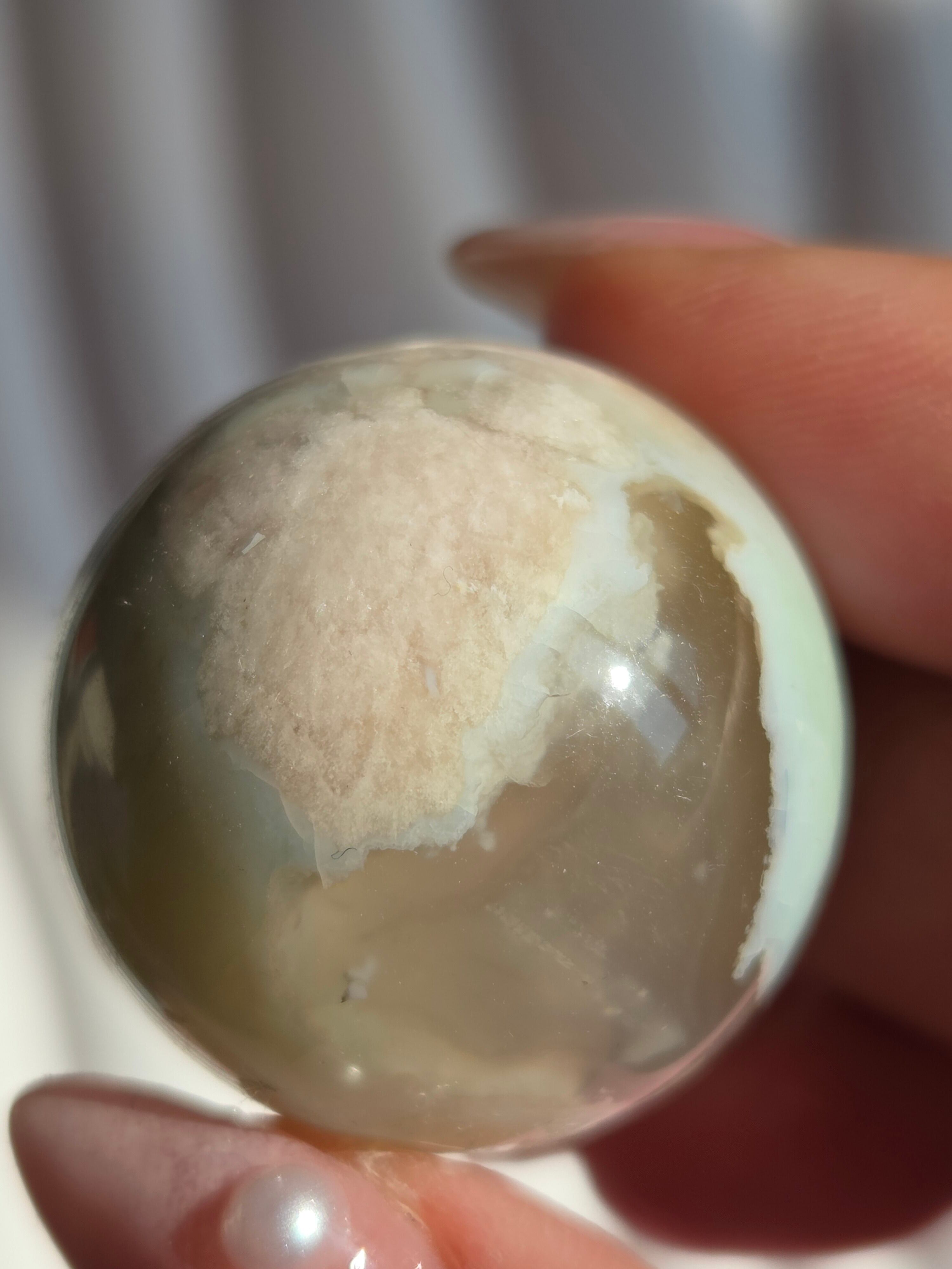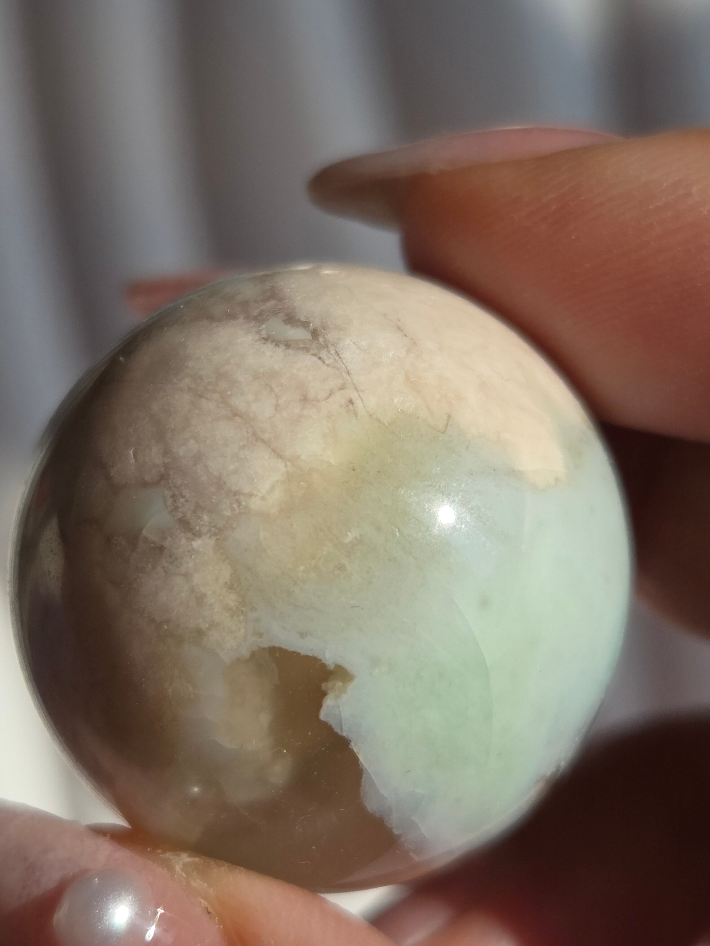 グリーンフラワーアゲート(緑桜瑪瑙)スフィアです。パステルグリーンをメインに、お花柄が散りばめられた素敵なスフィア。