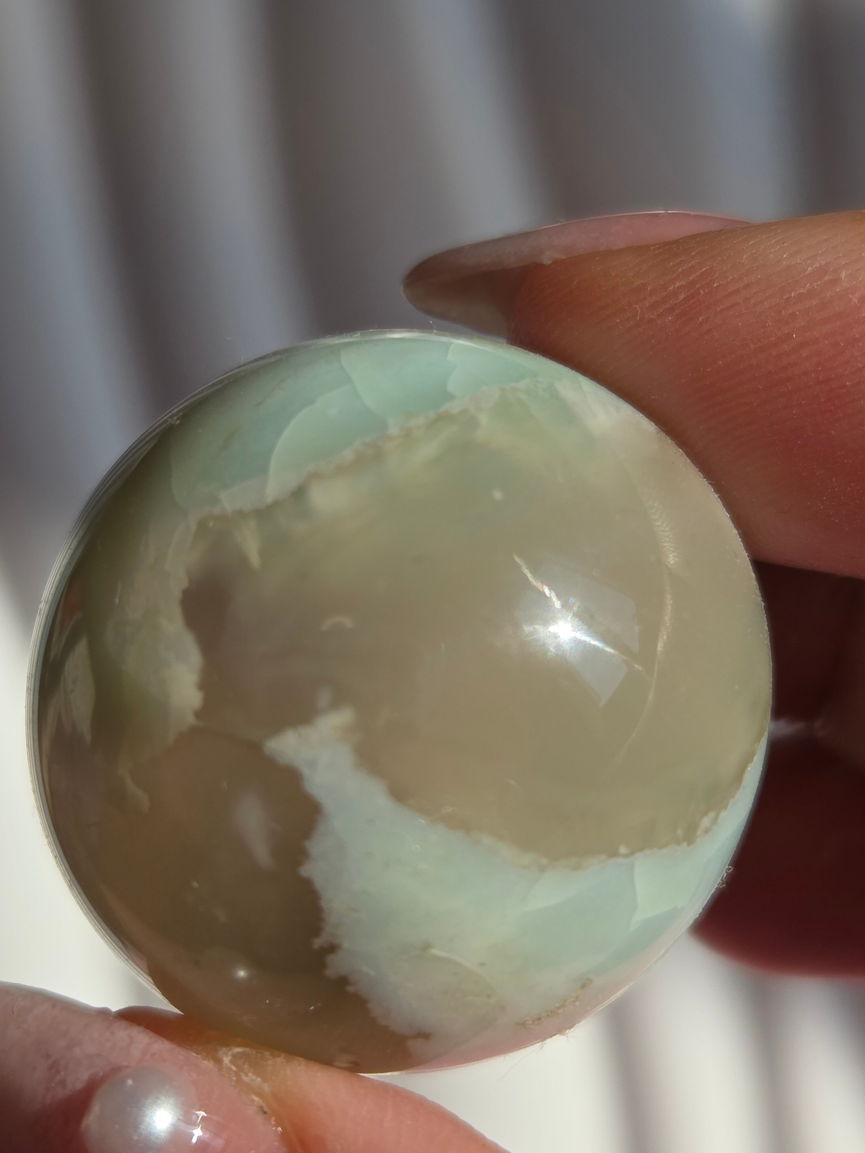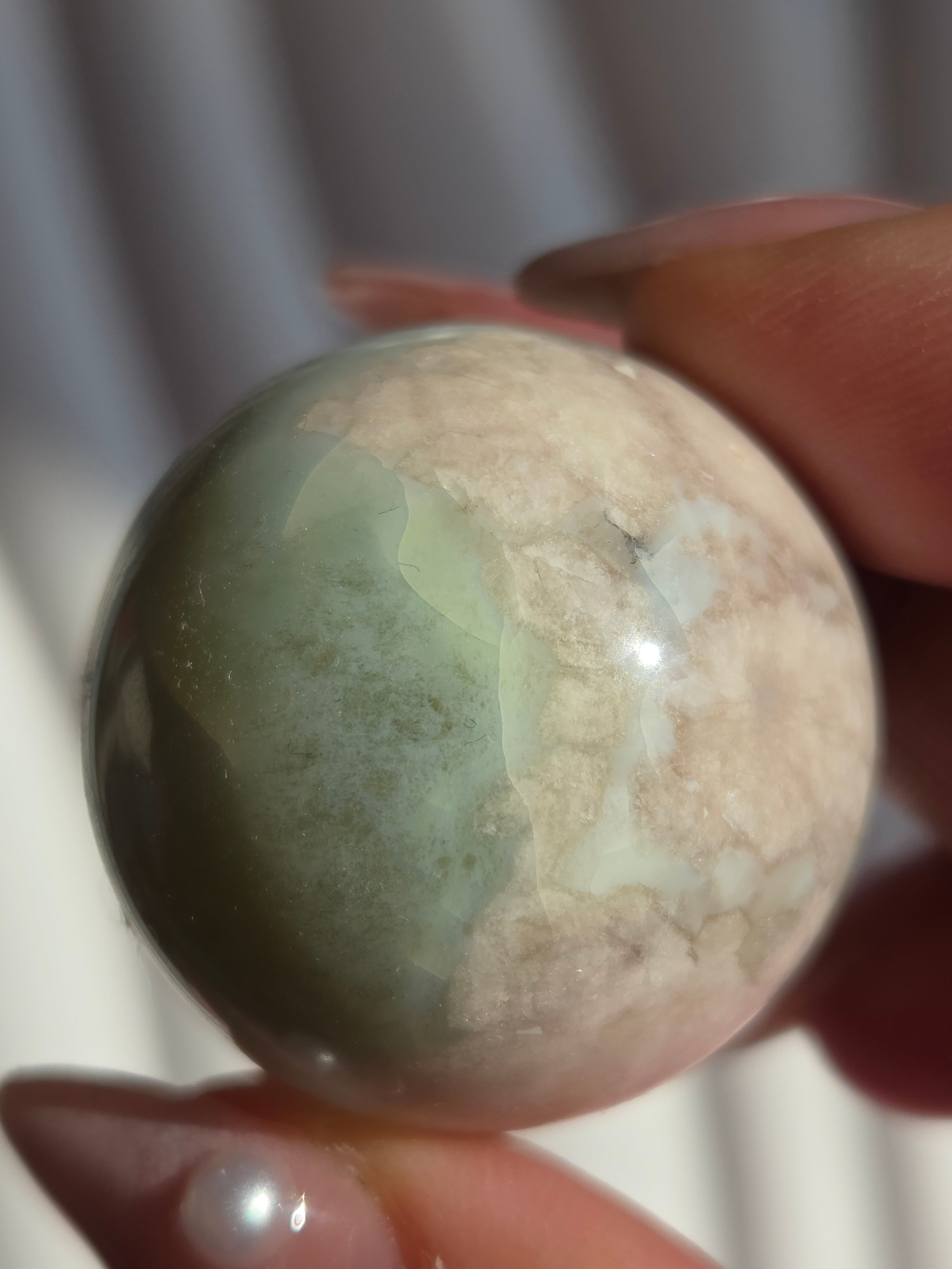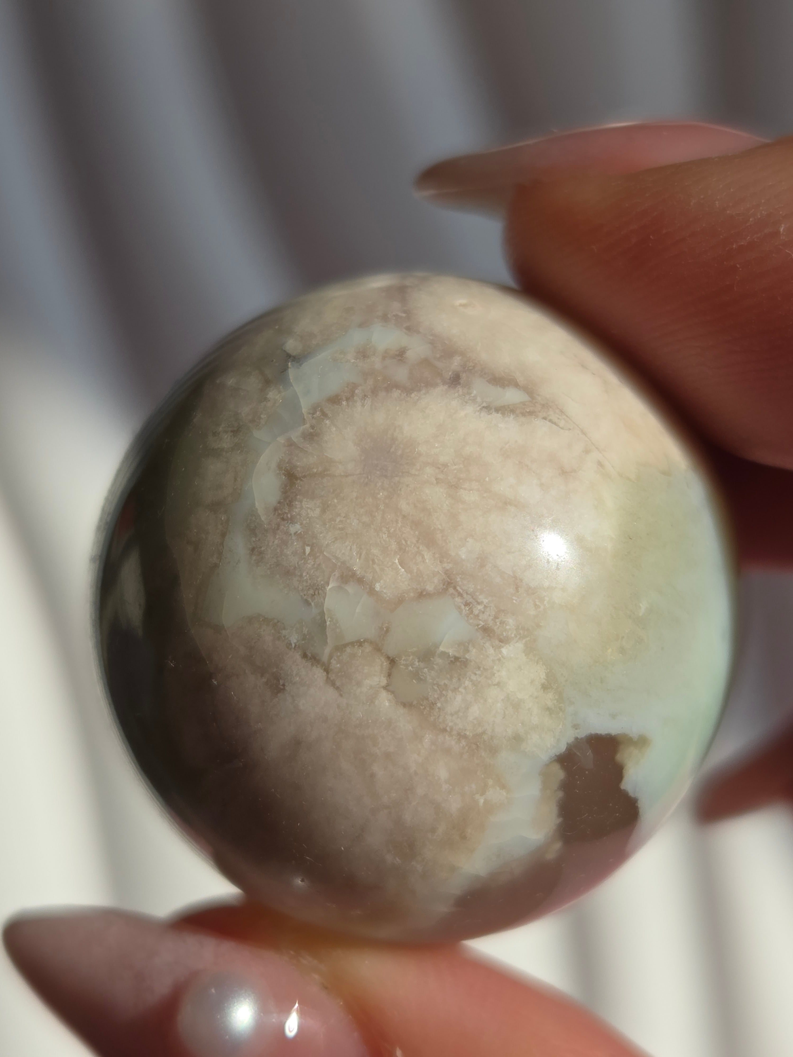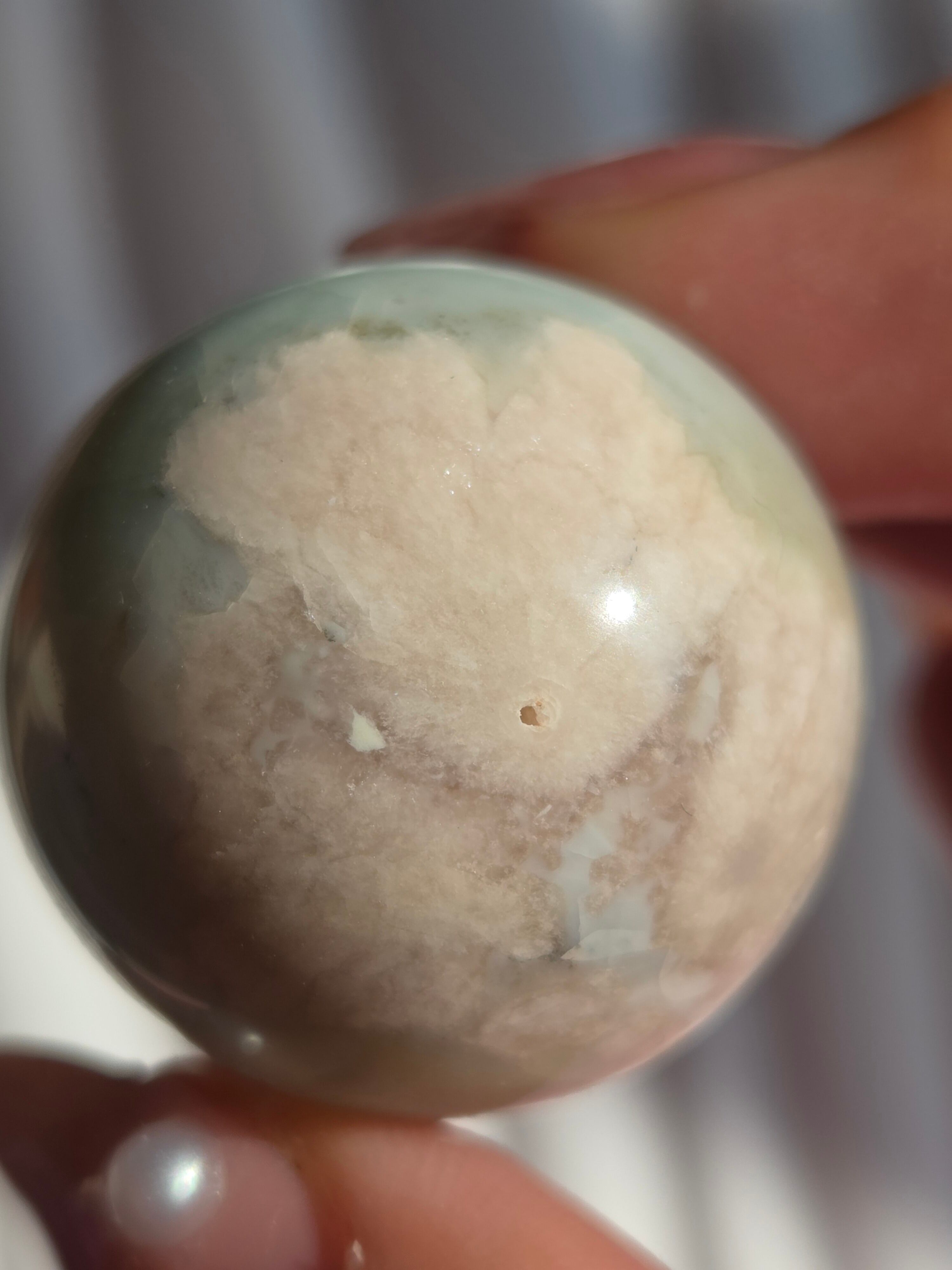 グリーンフラワーアゲート(緑桜瑪瑙)スフィアです。パステルグリーンをメインに、お花柄が散りばめられた素敵なスフィア。