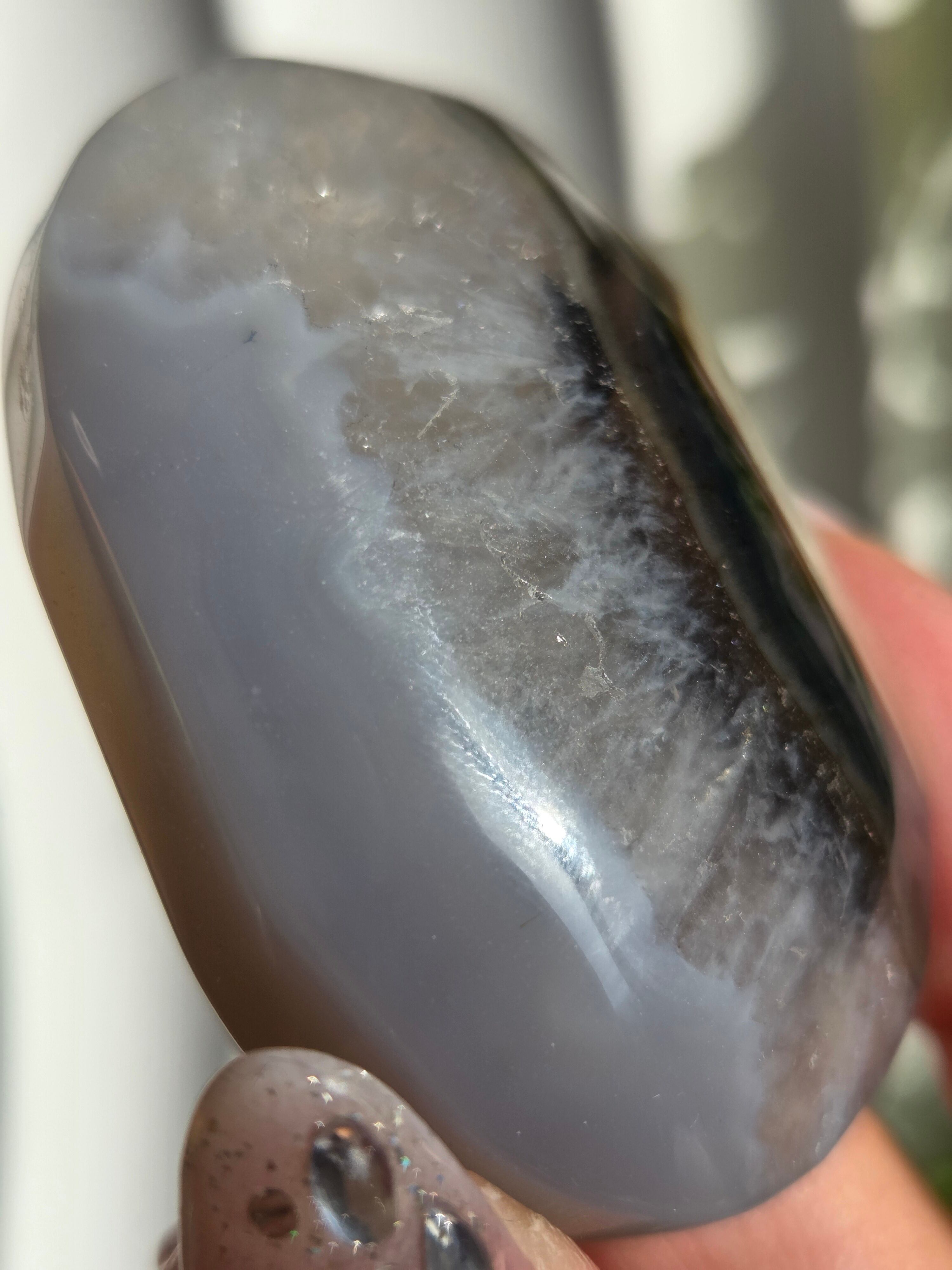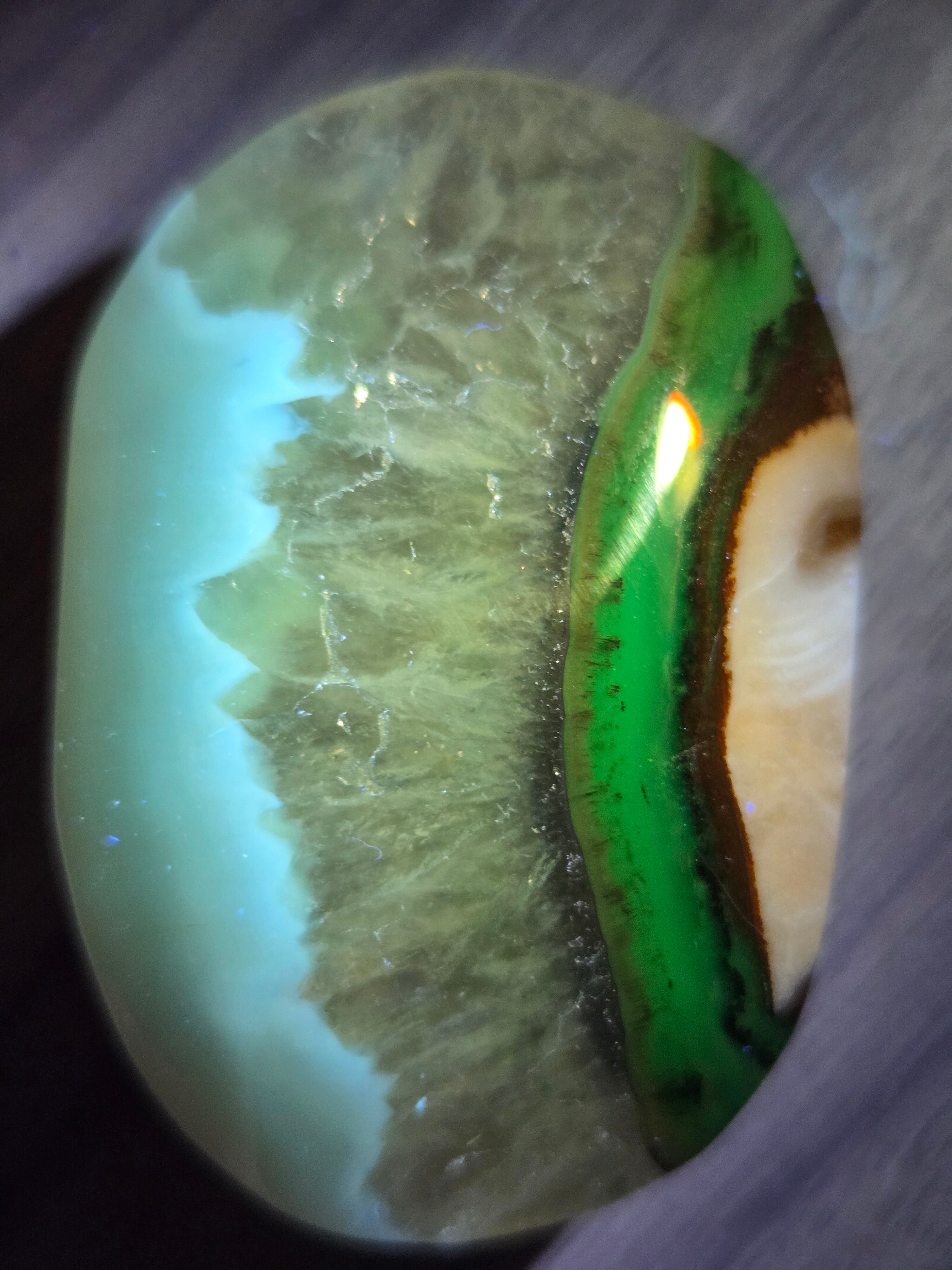 ボルケーノアゲート(火山瑪瑙)は、火山地帯で形成されたアゲート(瑪瑙)の一種で、ブラックやダークグレーのモノトーンカラーに、ブラックライト(UV光)を当てるとグリーンに蛍光する特徴を持つ珍しい天然石です。その名の通り火山で生まれたことから「ボルケーノ」と名付けられ、神秘的な模様が魅力で、パワーストーンとして「内なる情熱を呼び覚まし、自分らしさを輝かせる力がある」とされています。