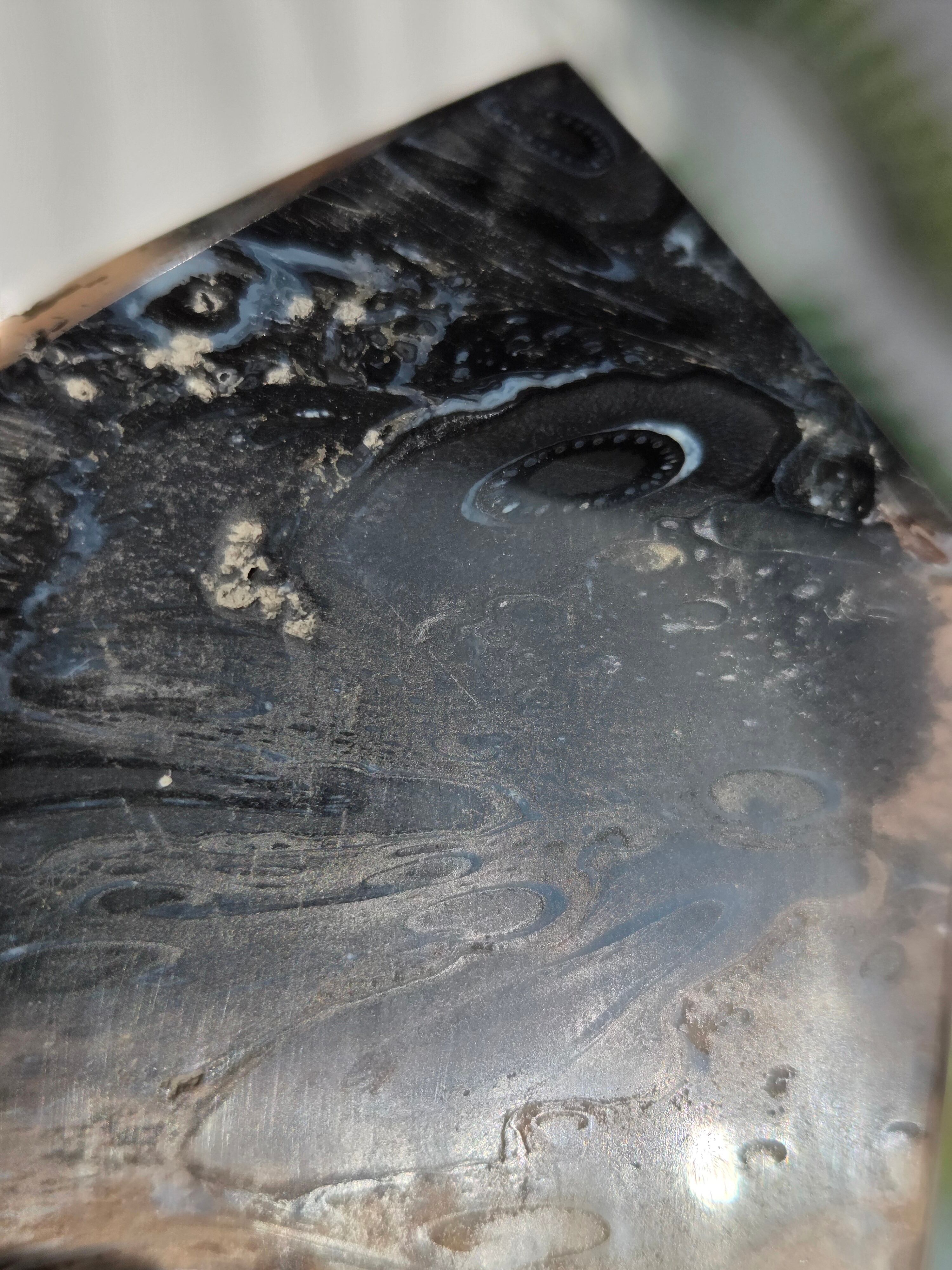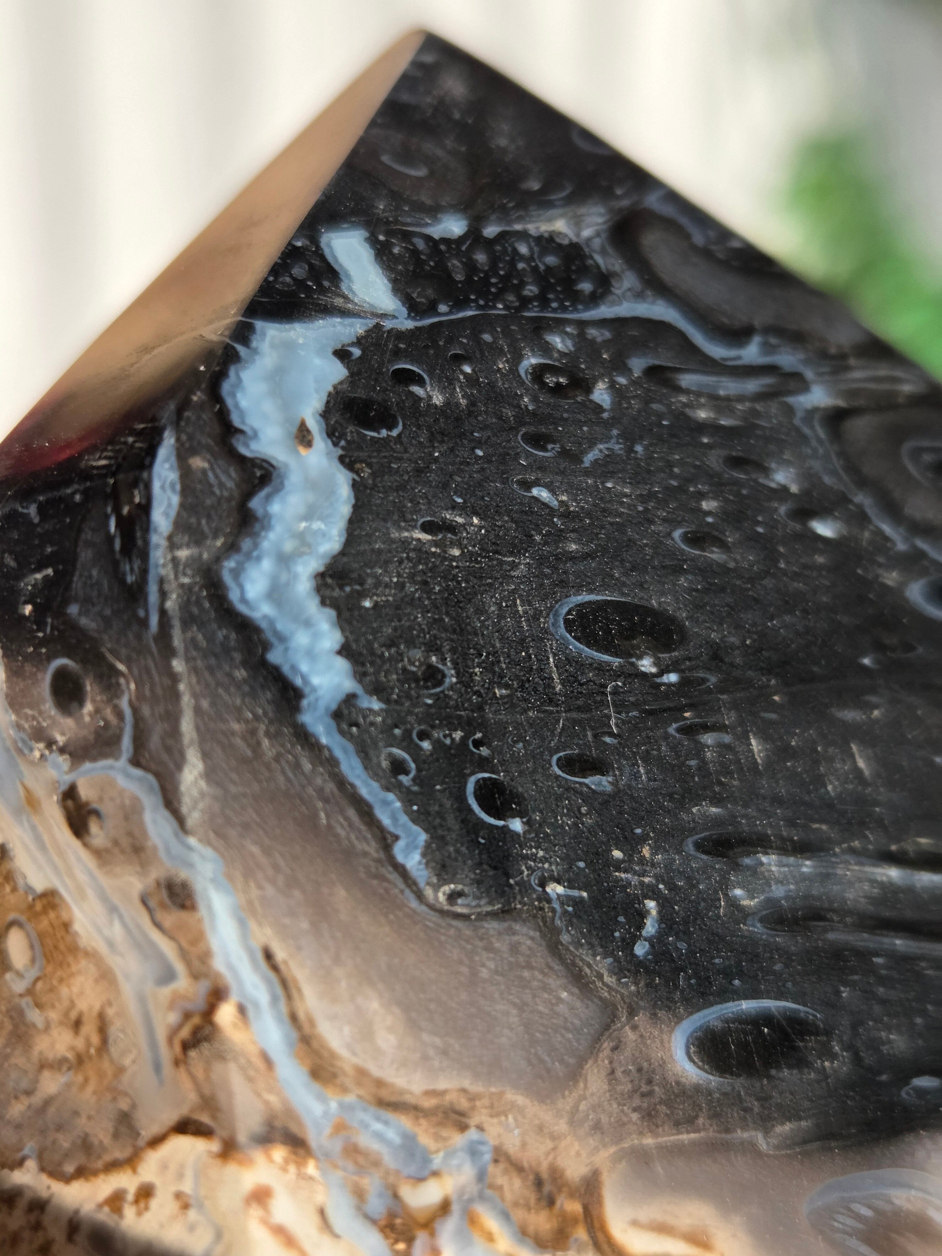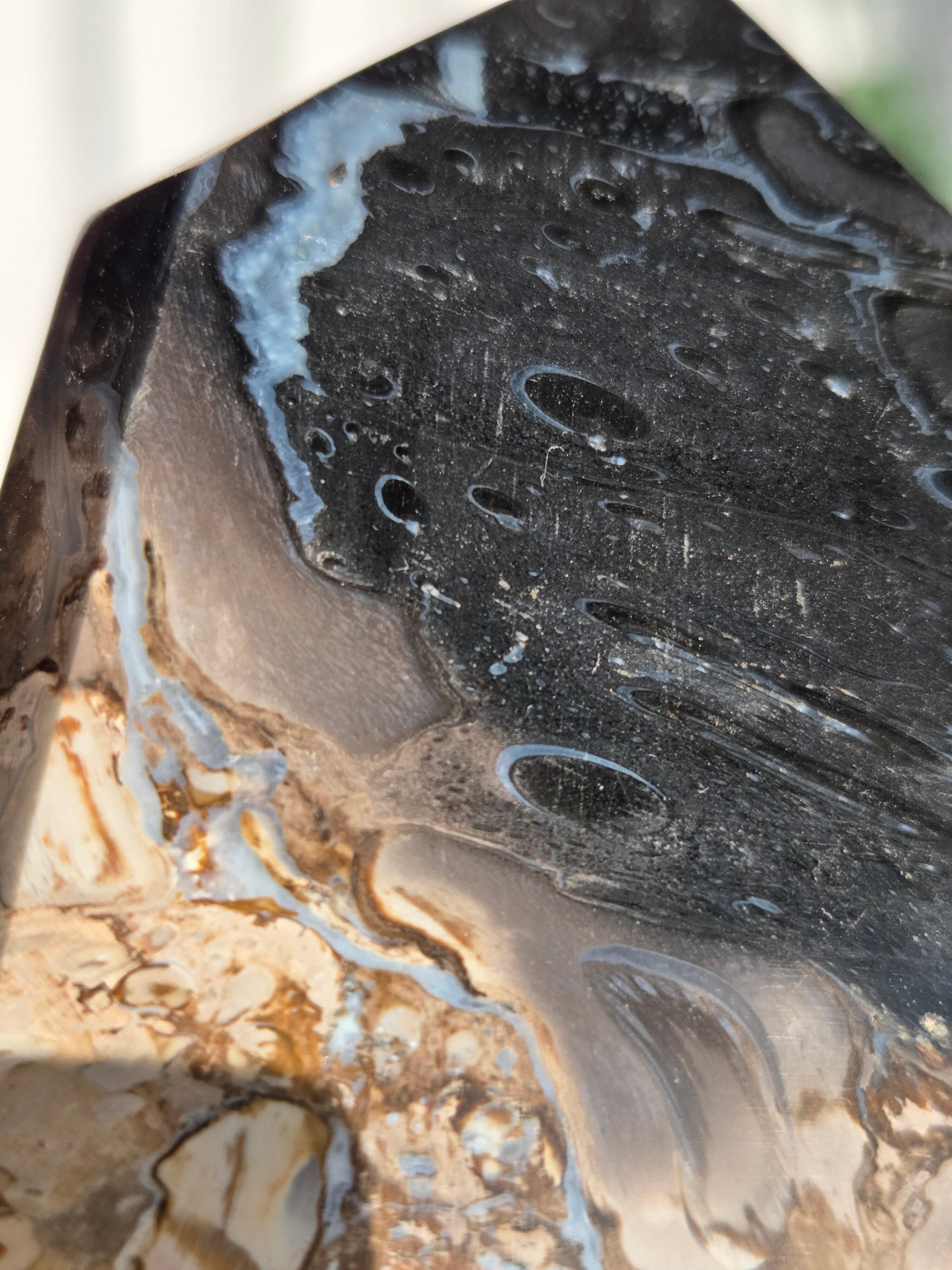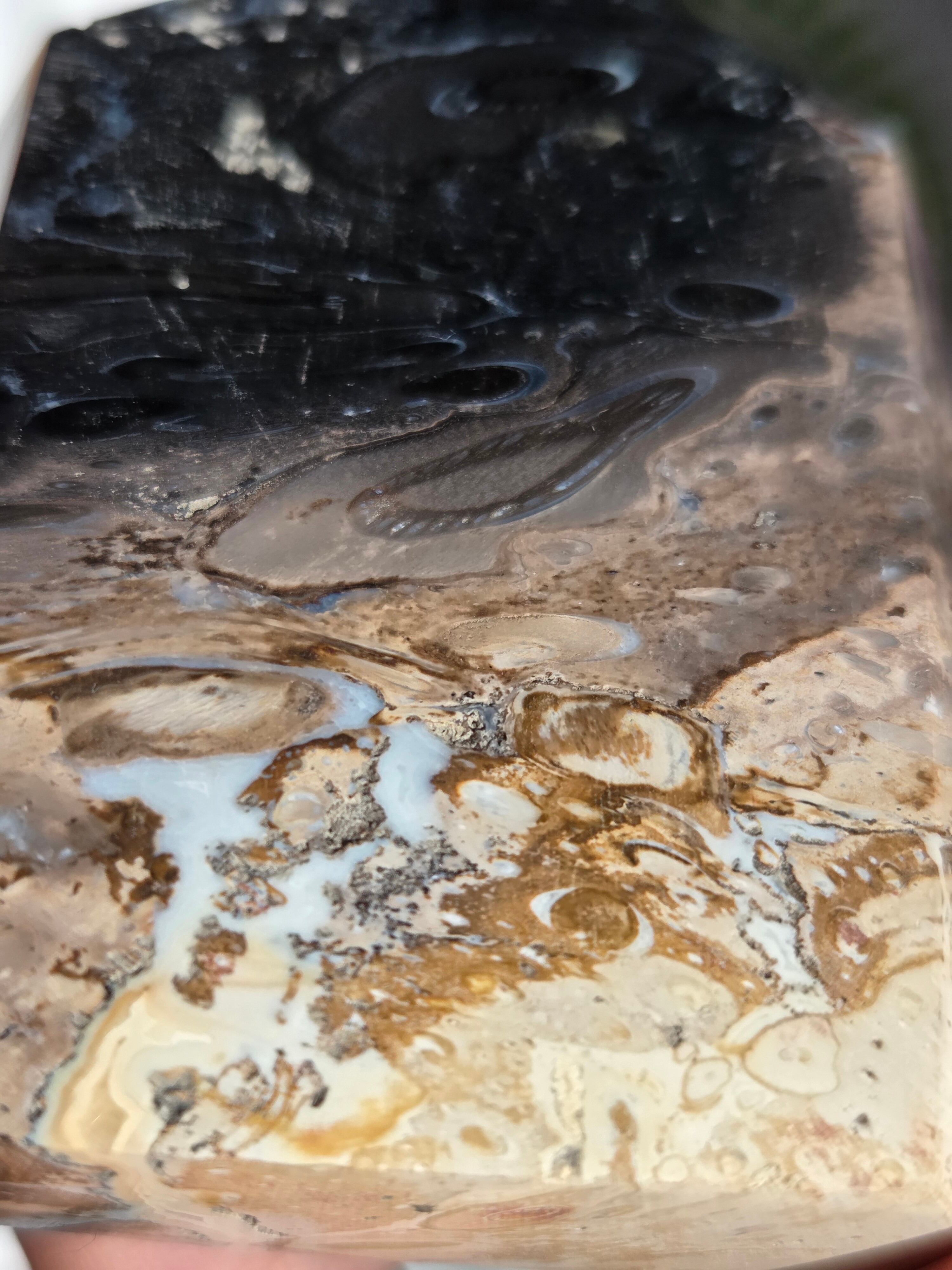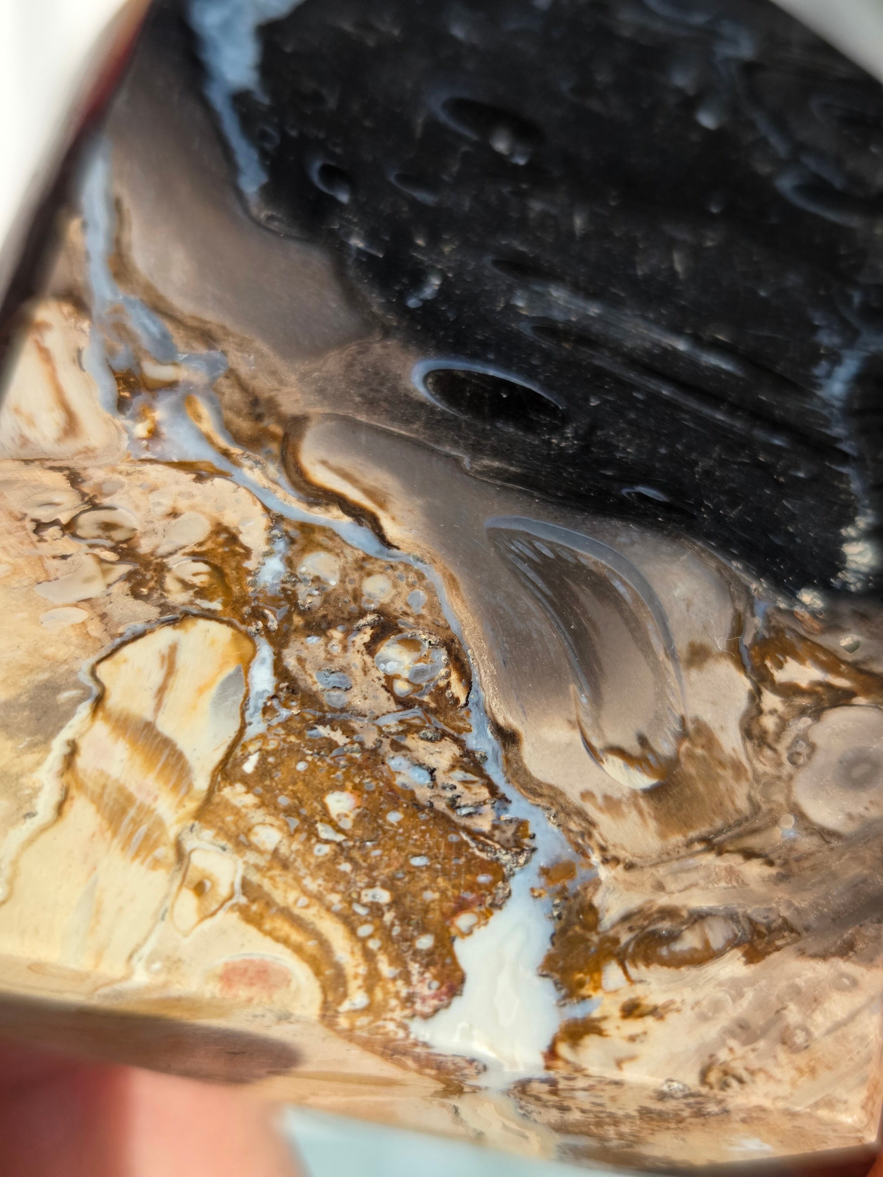 パームルートとは、約2億5千万年前から6500万年前にかけて、ヤシの木の根がアゲートや水晶などの鉱物を取り込みながら長い年月をかけて化石化した天然石(珪化木、ペトリファイドウッド)です。炎のように見える独特な黒とベージュの模様が特徴で、一つとして同じ模様がないことから「神秘的な自然の造形美」といわれています。