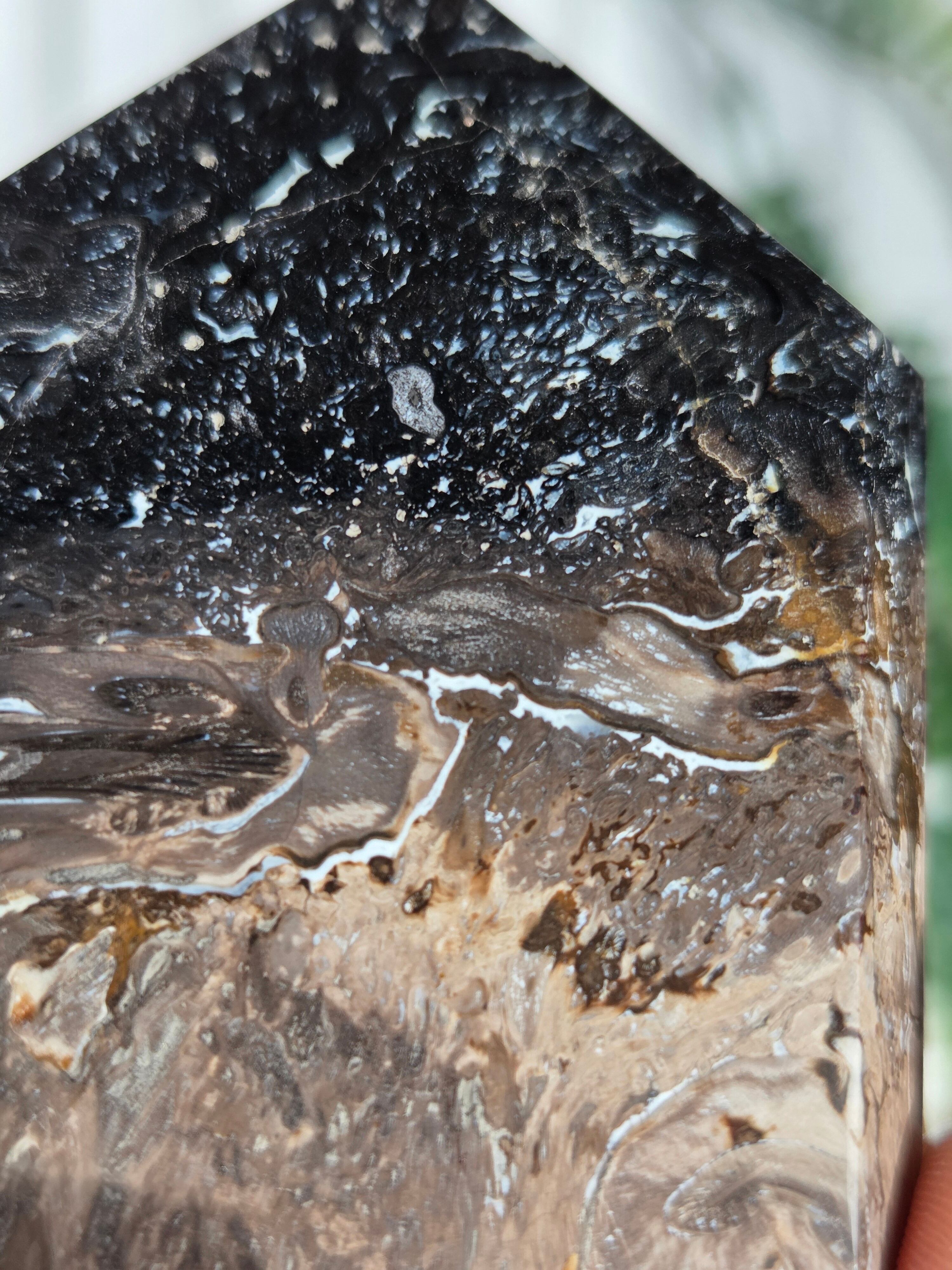 パームルートとは、約2億5千万年前から6500万年前にかけて、ヤシの木の根がアゲートや水晶などの鉱物を取り込みながら長い年月をかけて化石化した天然石(珪化木、ペトリファイドウッド)です。炎のように見える独特な黒とベージュの模様が特徴で、一つとして同じ模様がないことから「神秘的な自然の造形美」といわれています。