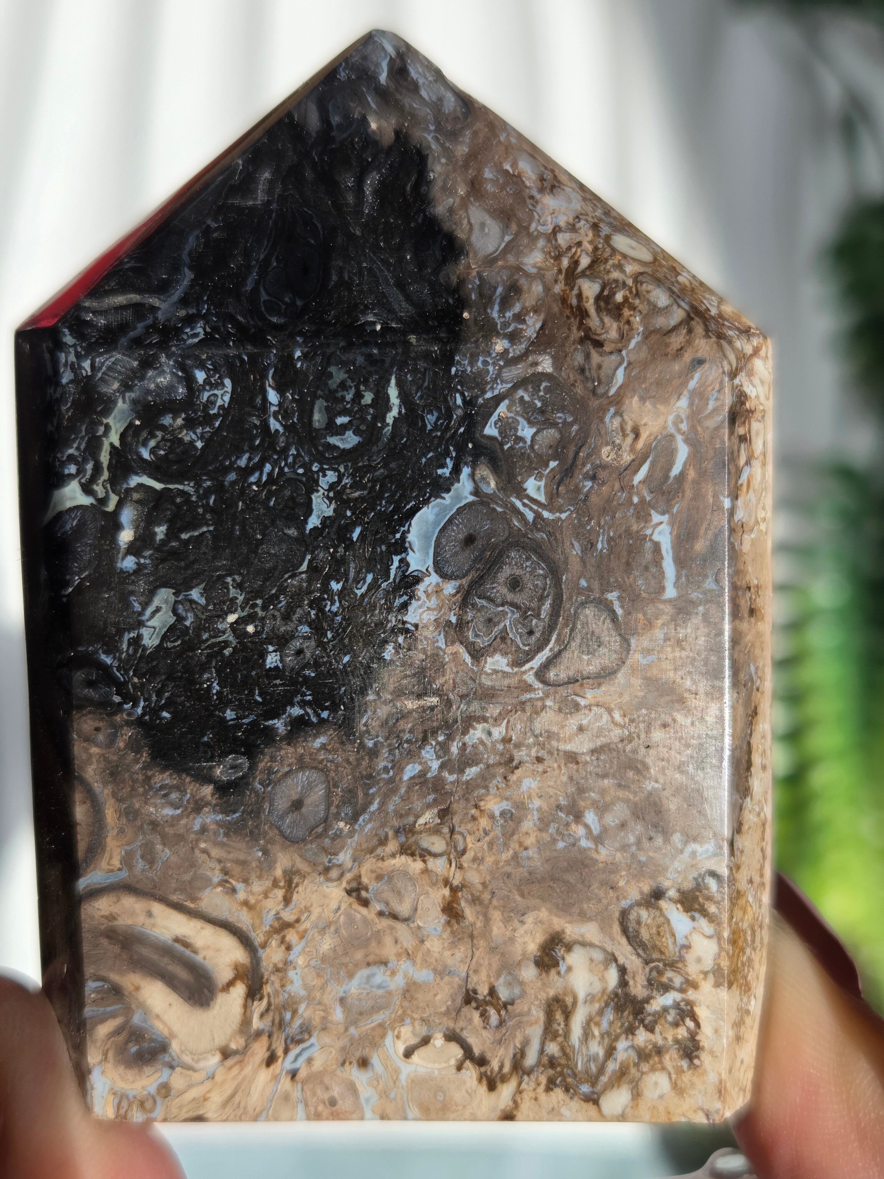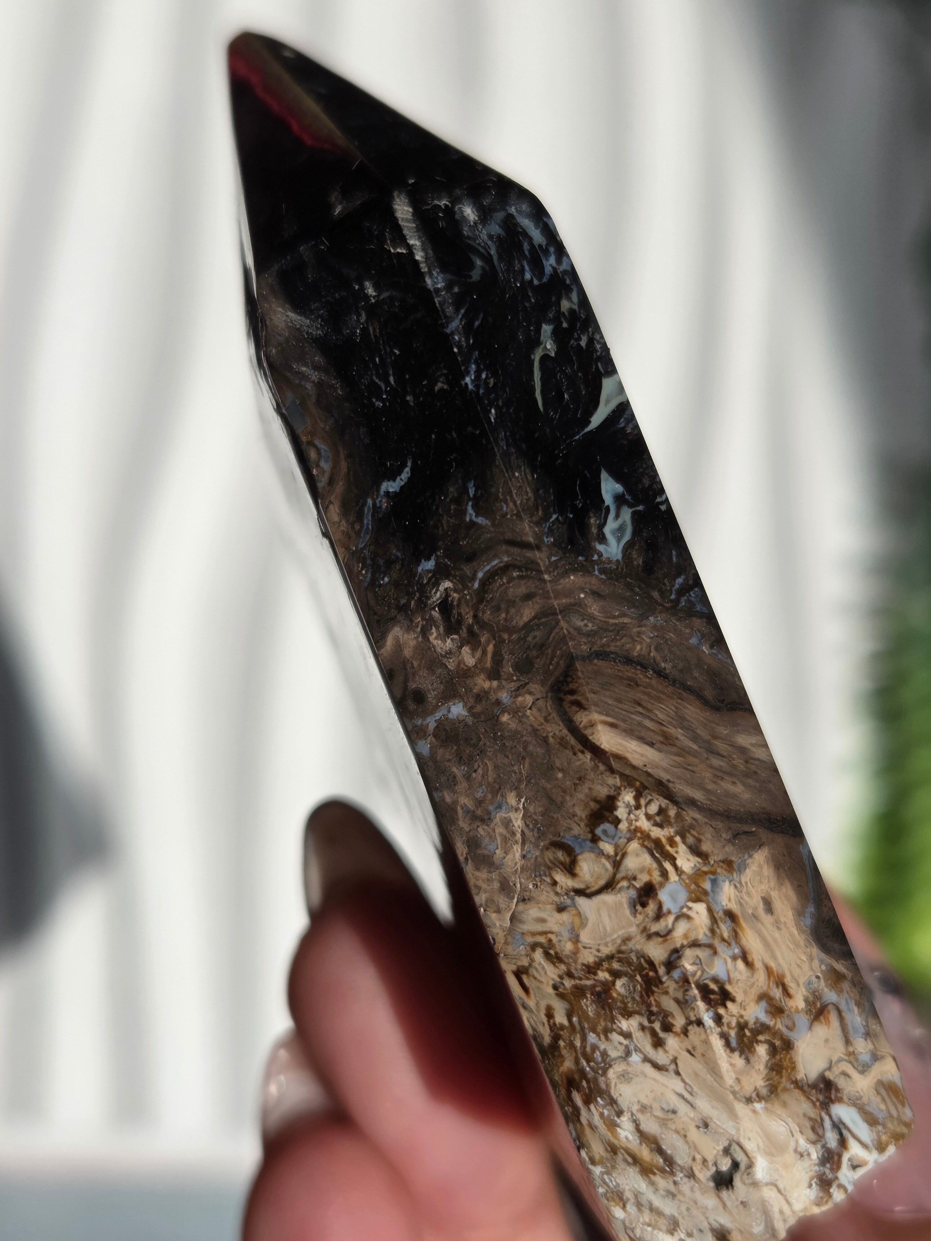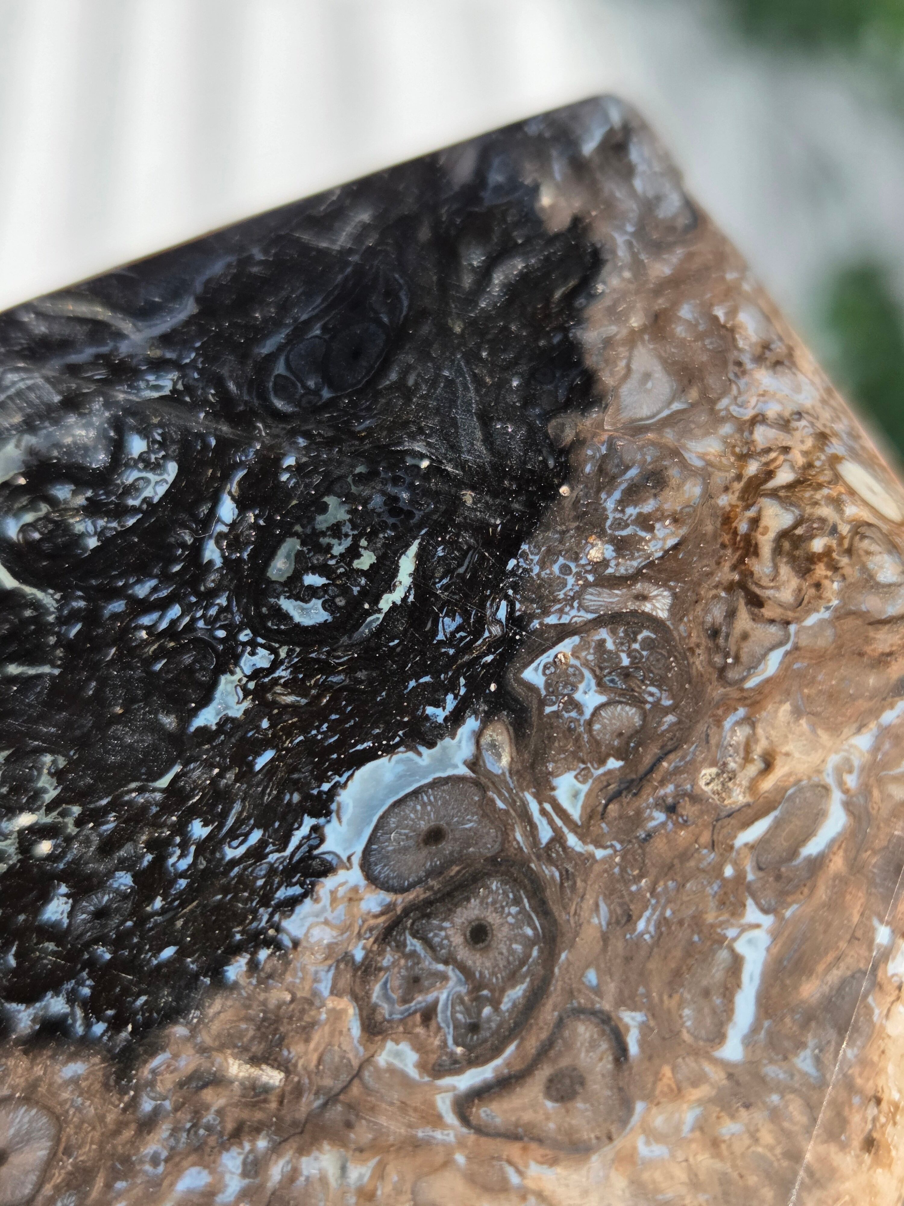 パームルートとは、約2億5千万年前から6500万年前にかけて、ヤシの木の根がアゲートや水晶などの鉱物を取り込みながら長い年月をかけて化石化した天然石(珪化木、ペトリファイドウッド)です。炎のように見える独特な黒とベージュの模様が特徴で、一つとして同じ模様がないことから「神秘的な自然の造形美」といわれています。