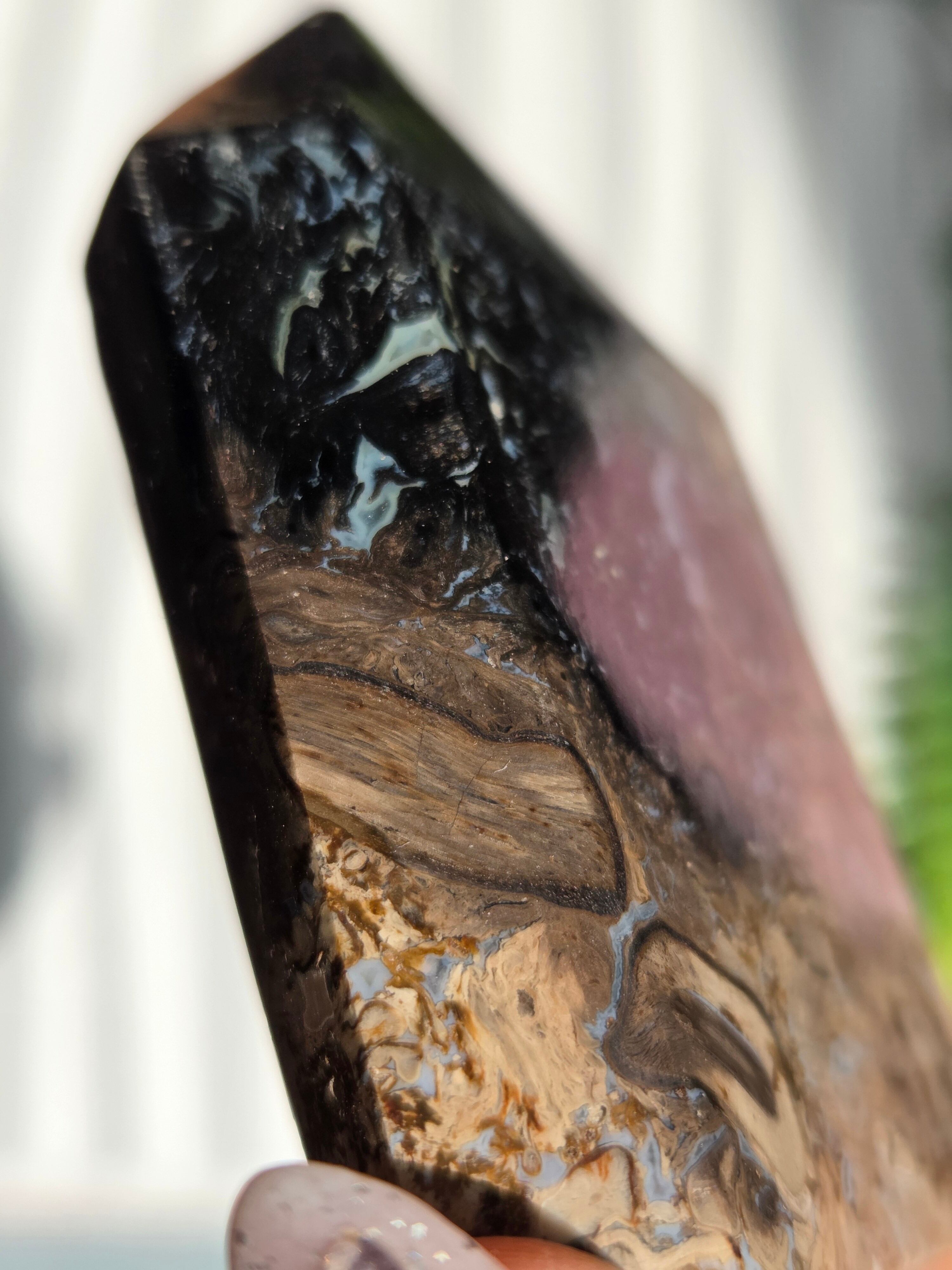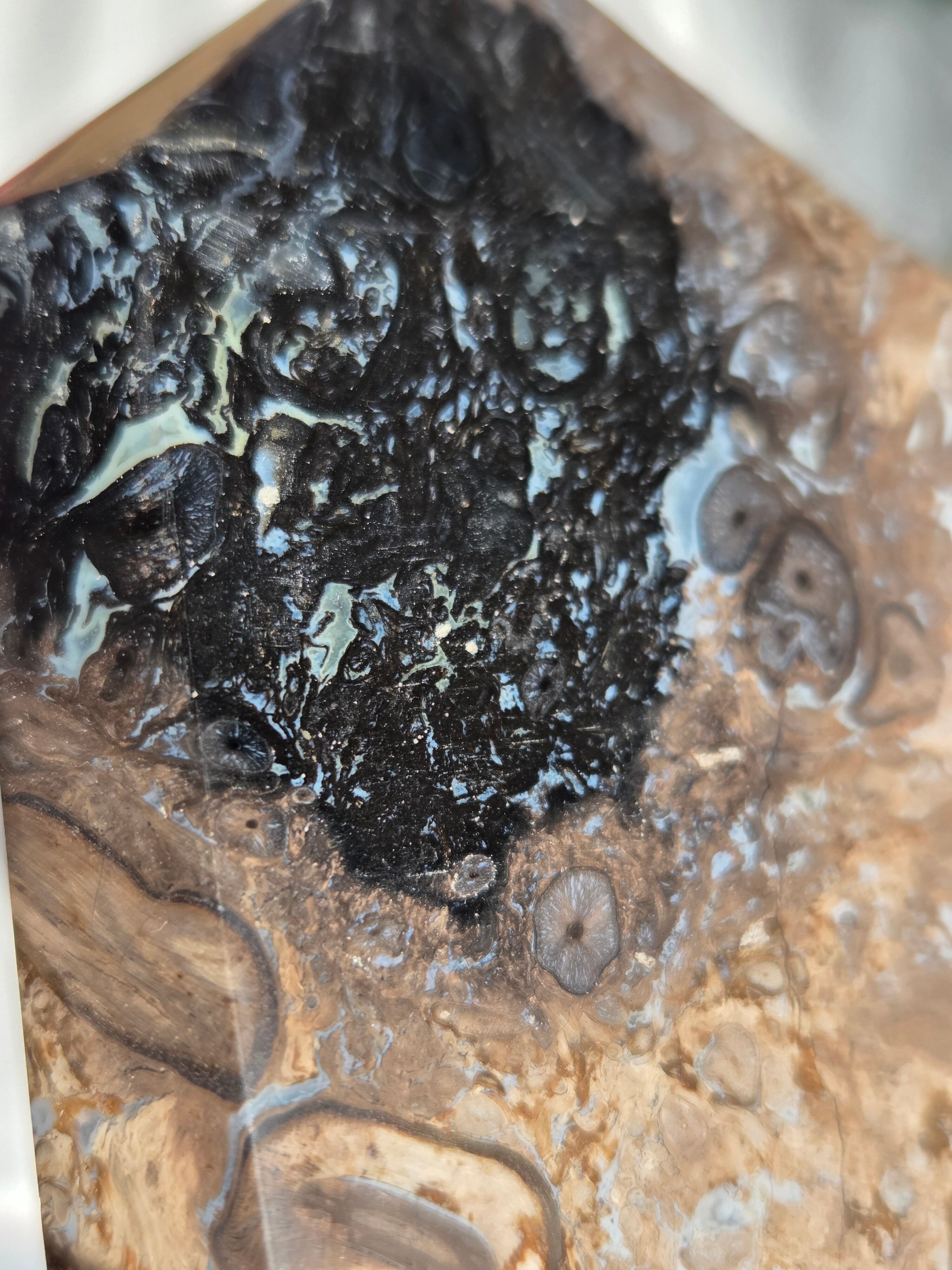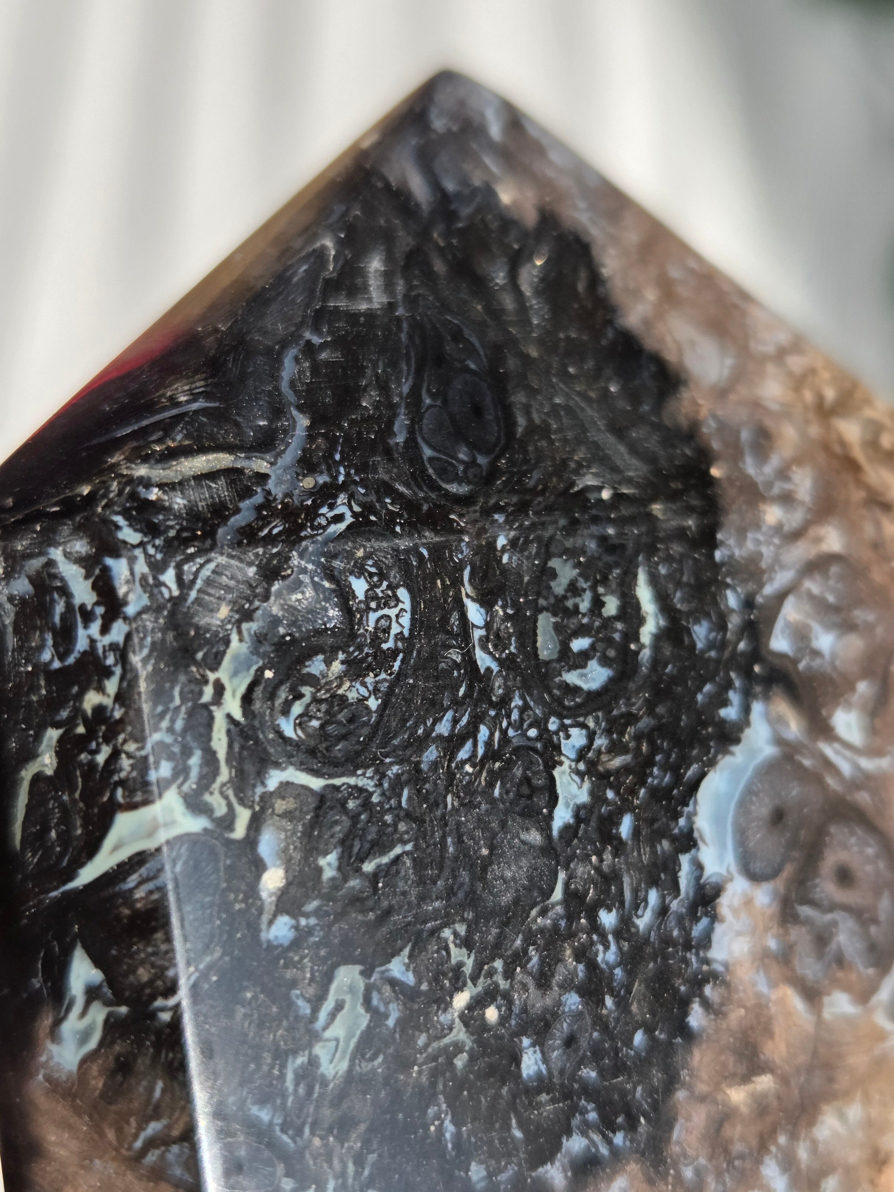 パームルートとは、約2億5千万年前から6500万年前にかけて、ヤシの木の根がアゲートや水晶などの鉱物を取り込みながら長い年月をかけて化石化した天然石(珪化木、ペトリファイドウッド)です。炎のように見える独特な黒とベージュの模様が特徴で、一つとして同じ模様がないことから「神秘的な自然の造形美」といわれています。