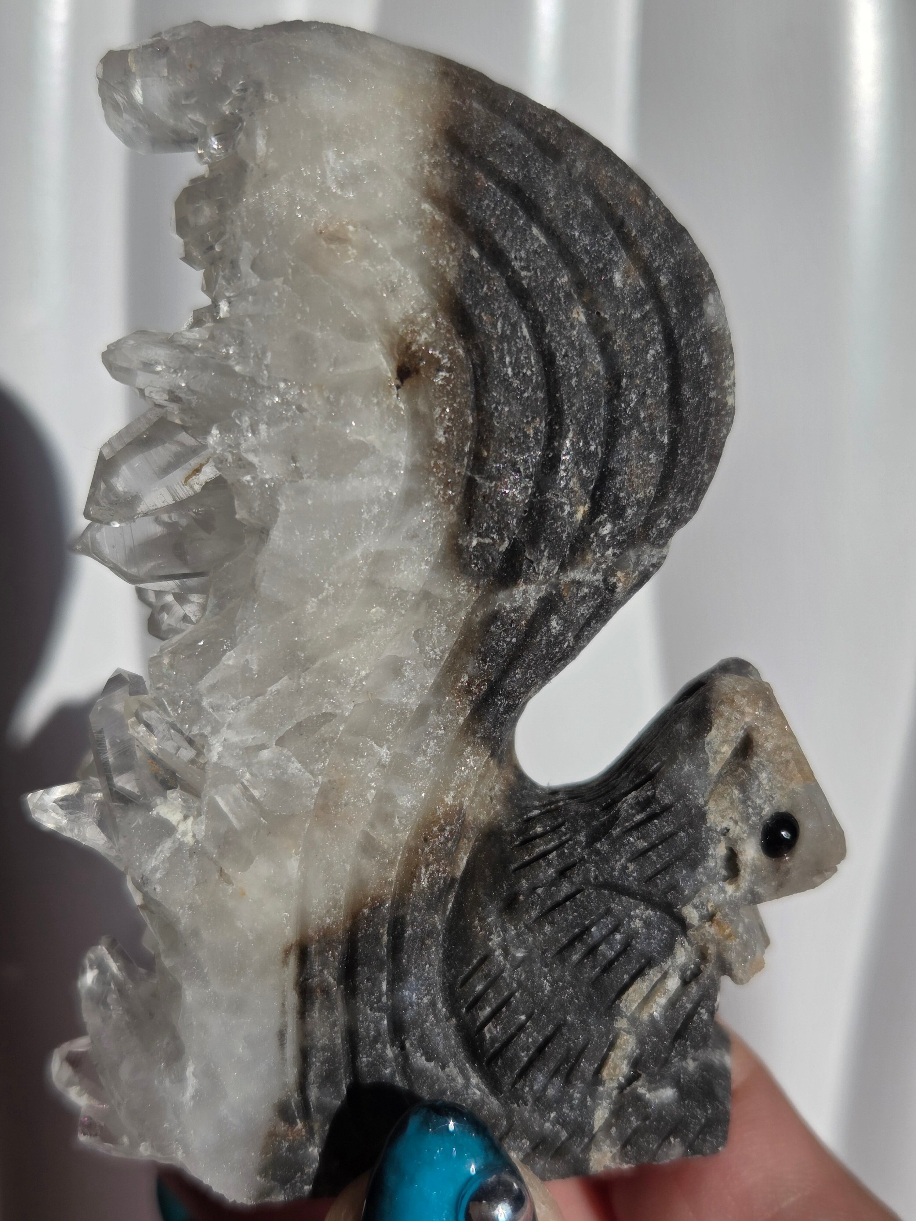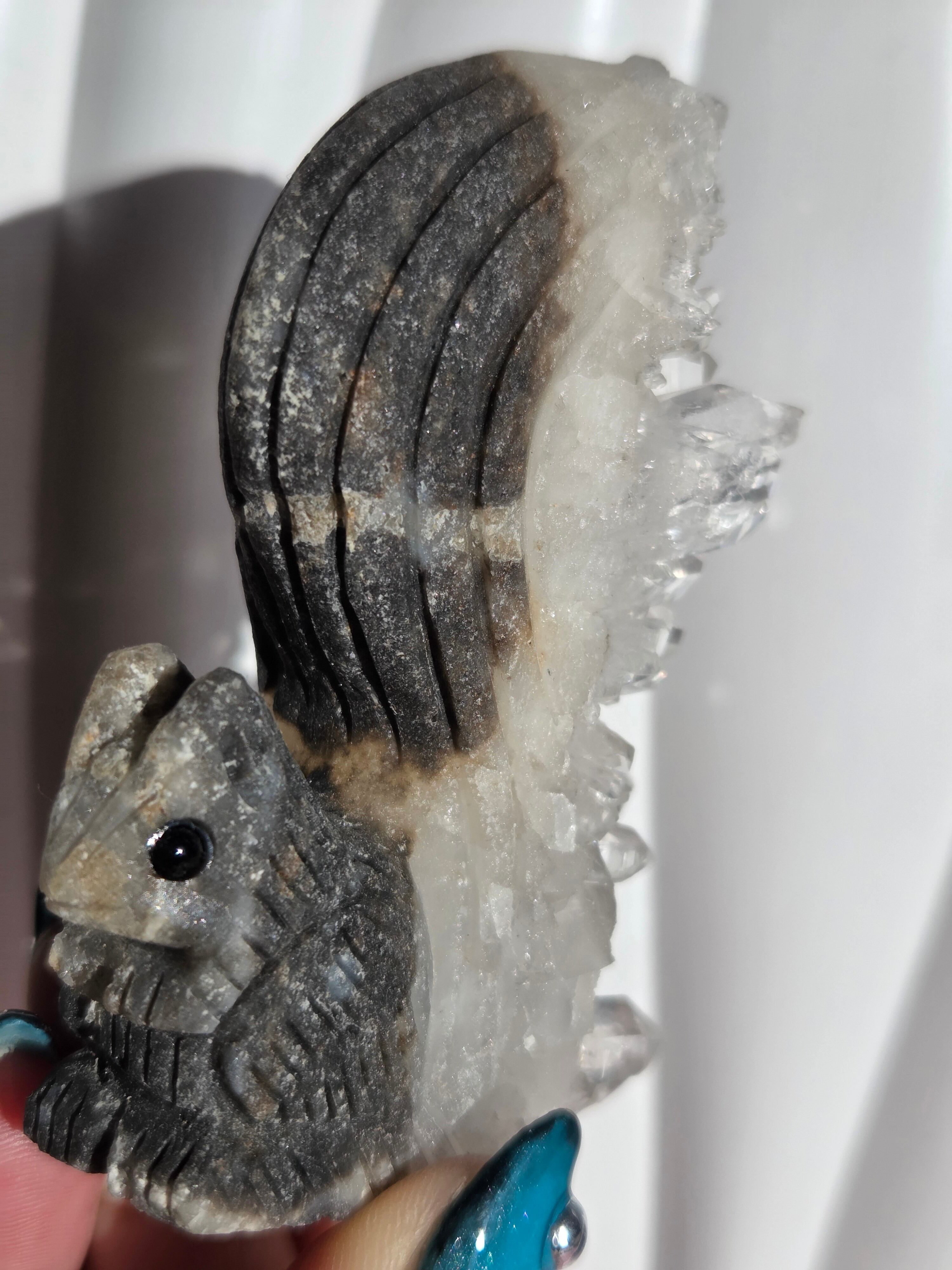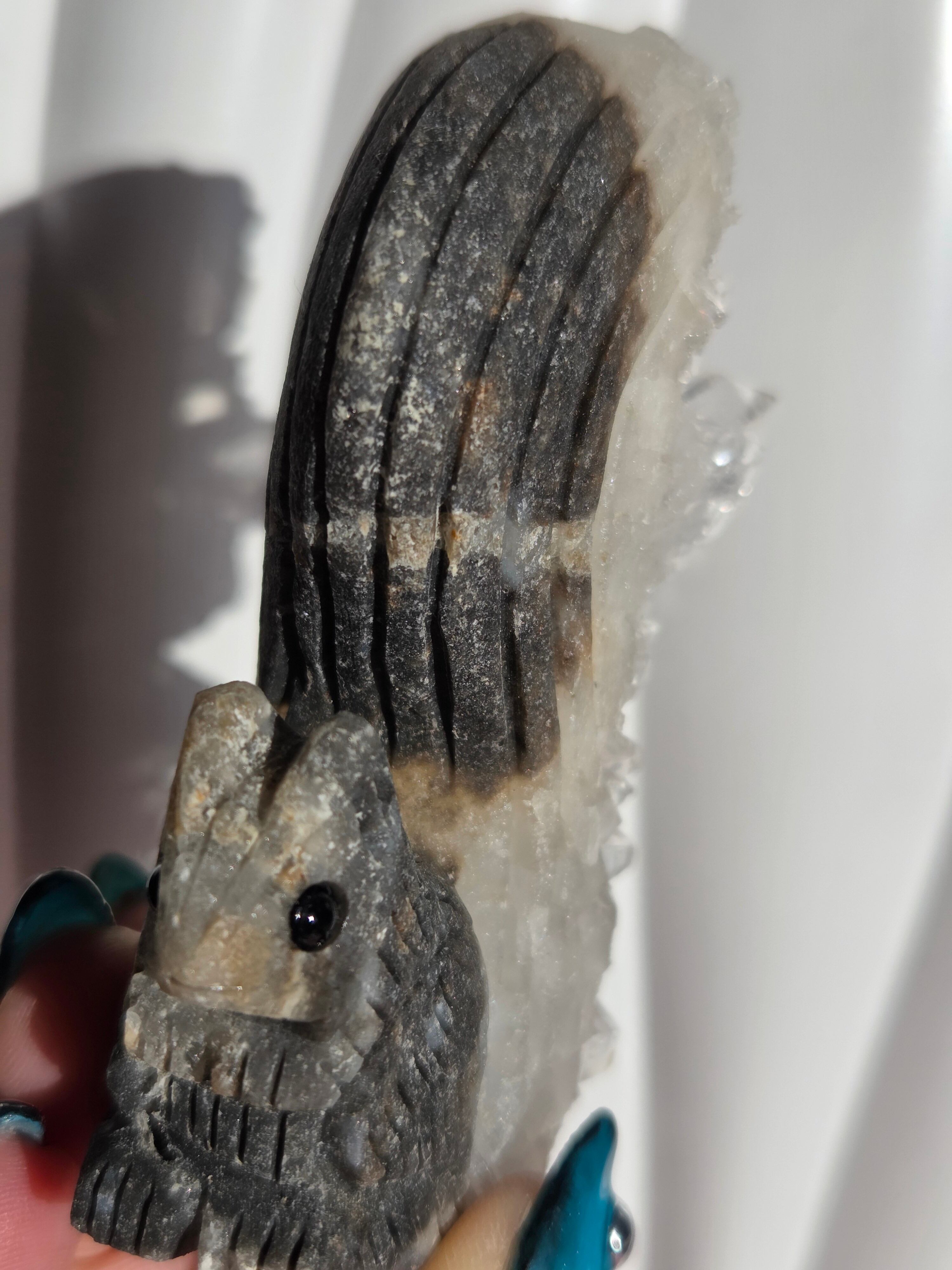 りすのカービングで、尻尾部分は水晶クラスターになった可愛い置物です。