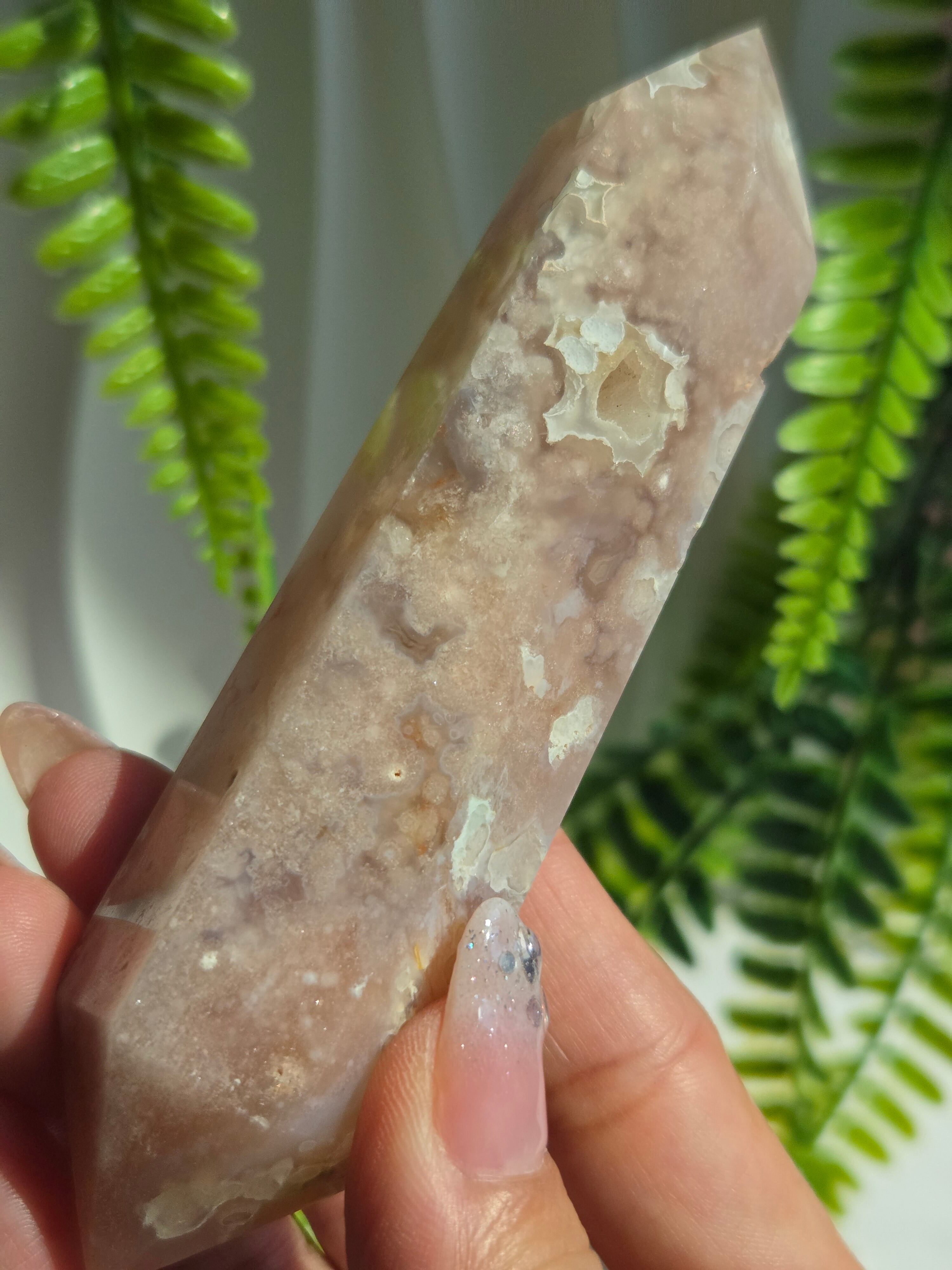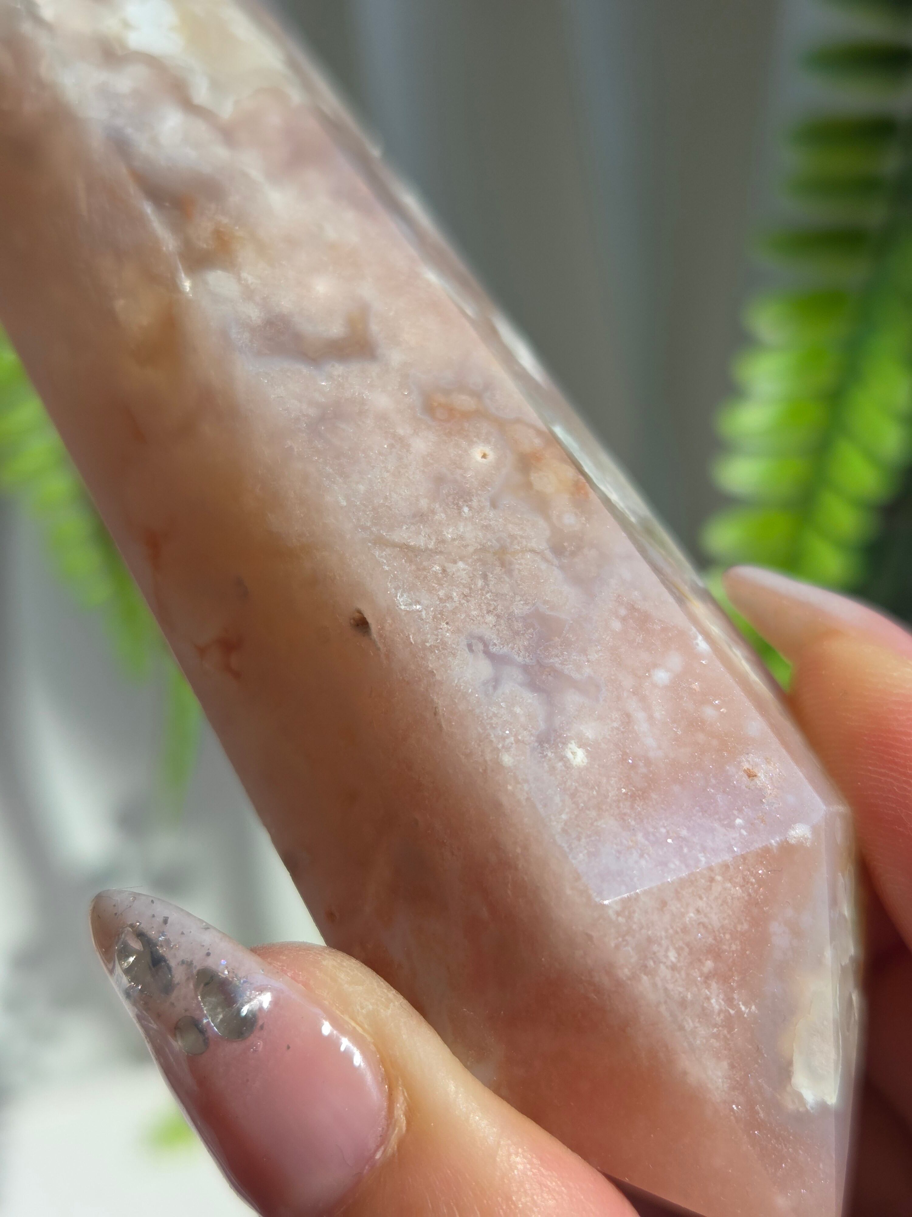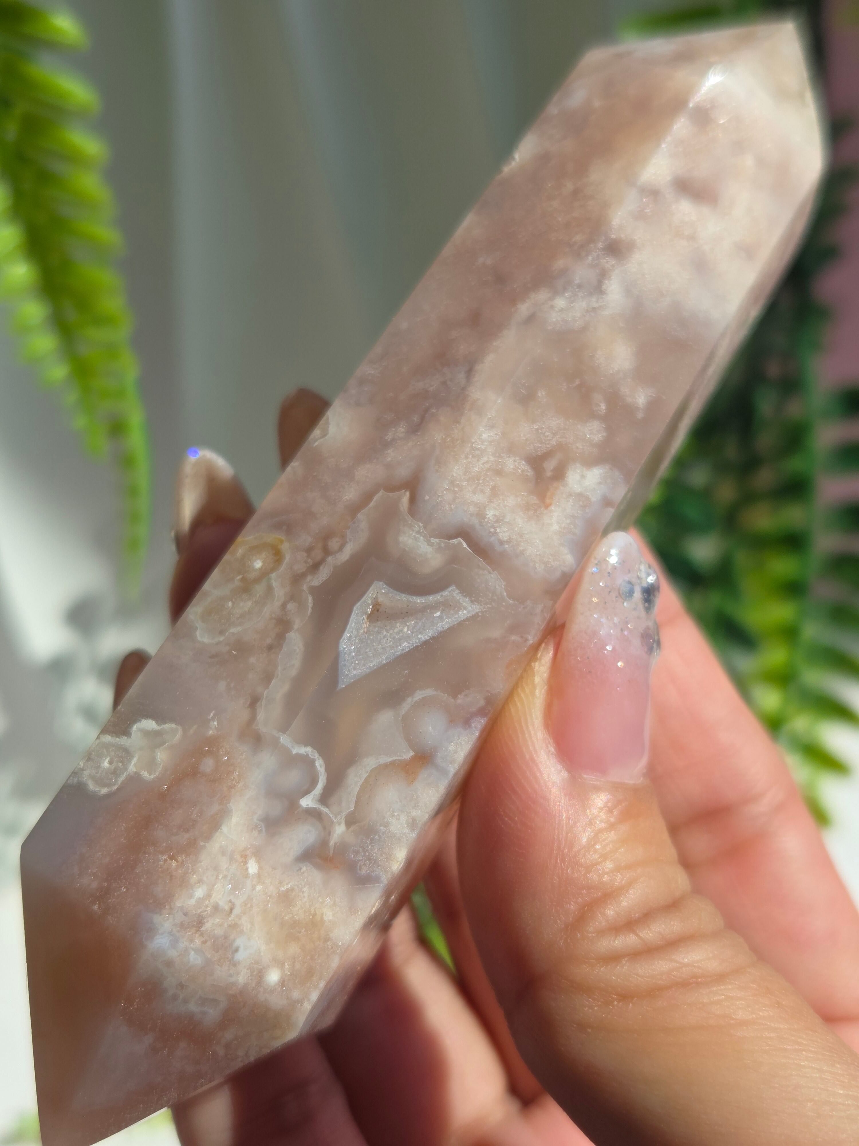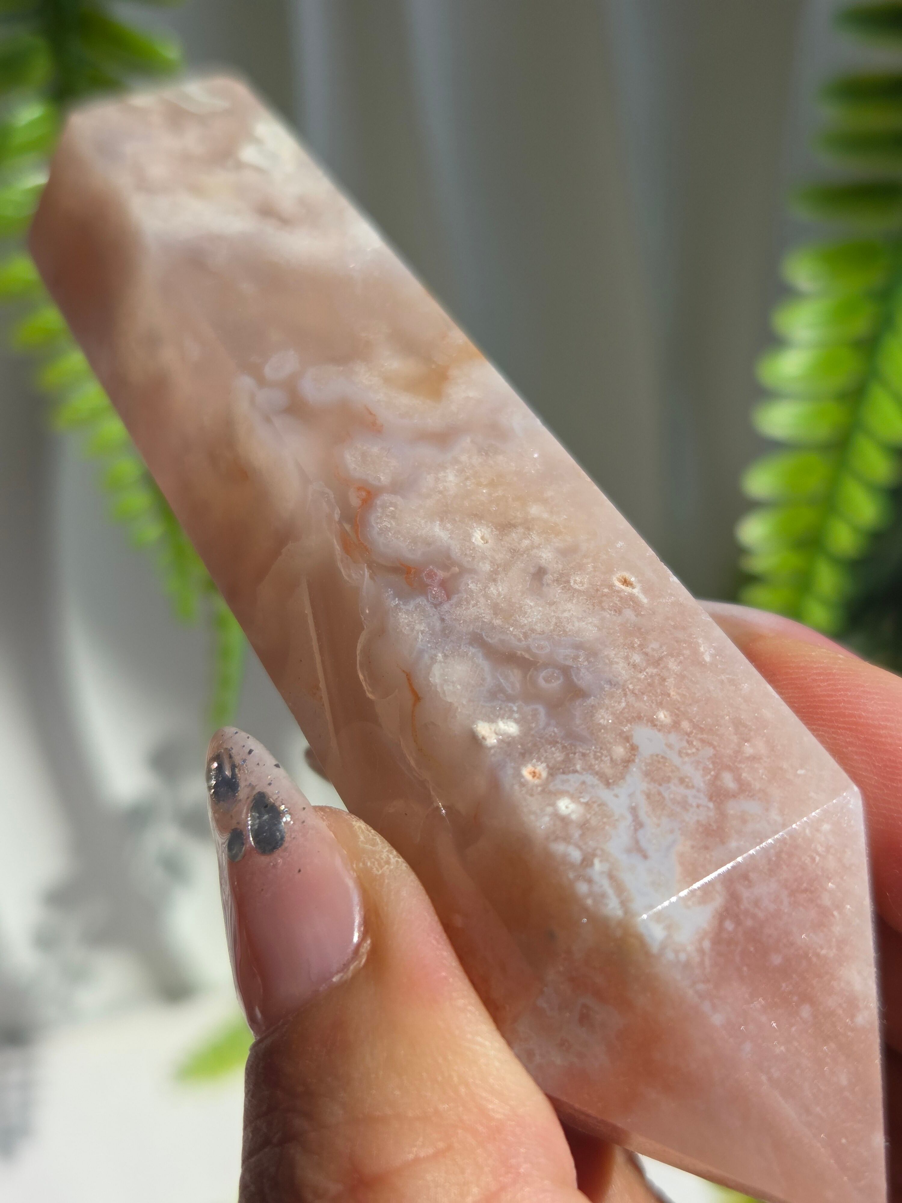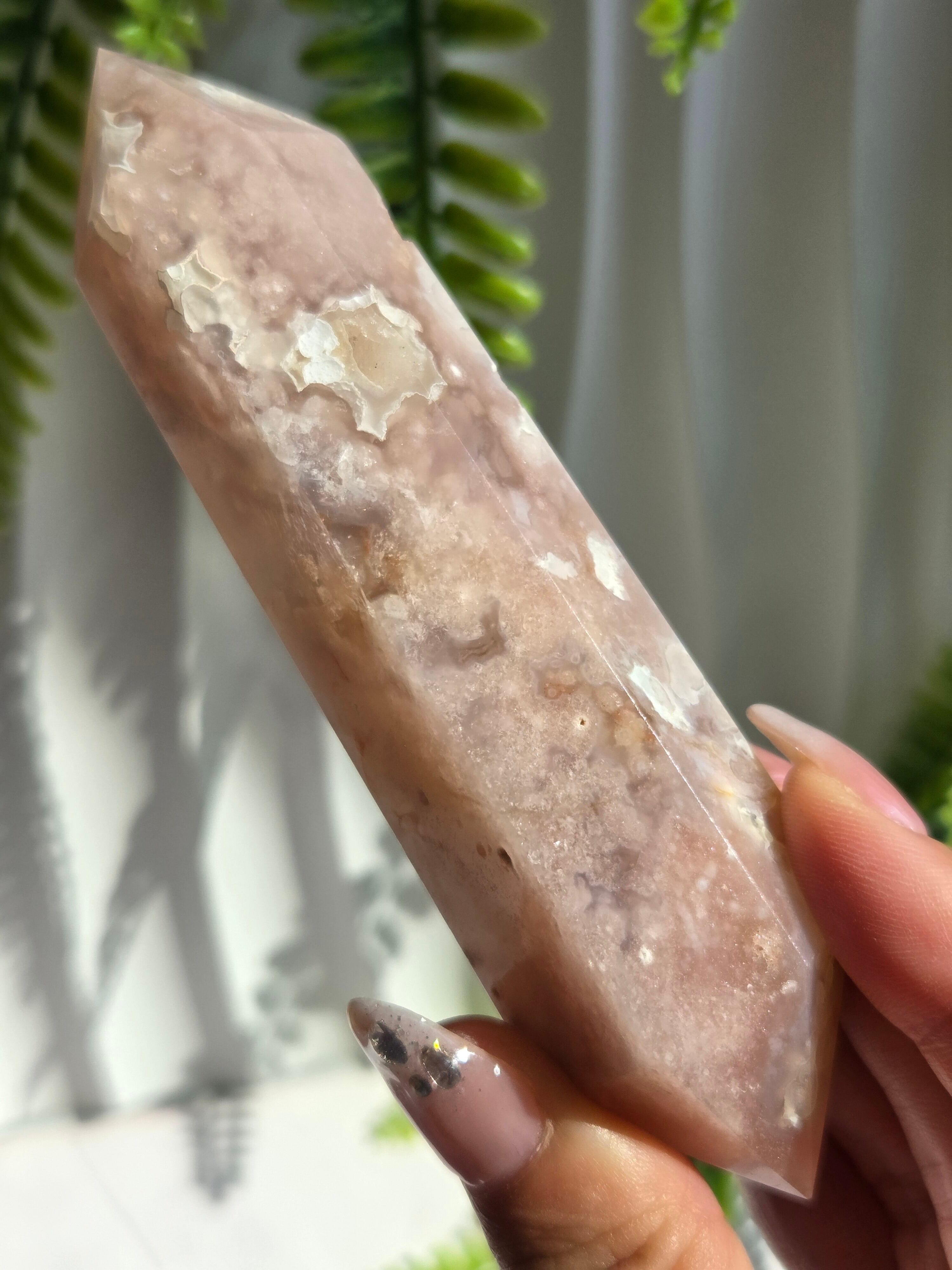 ピンクアメジストに、フラワーアゲートが共生したダブルポイント形