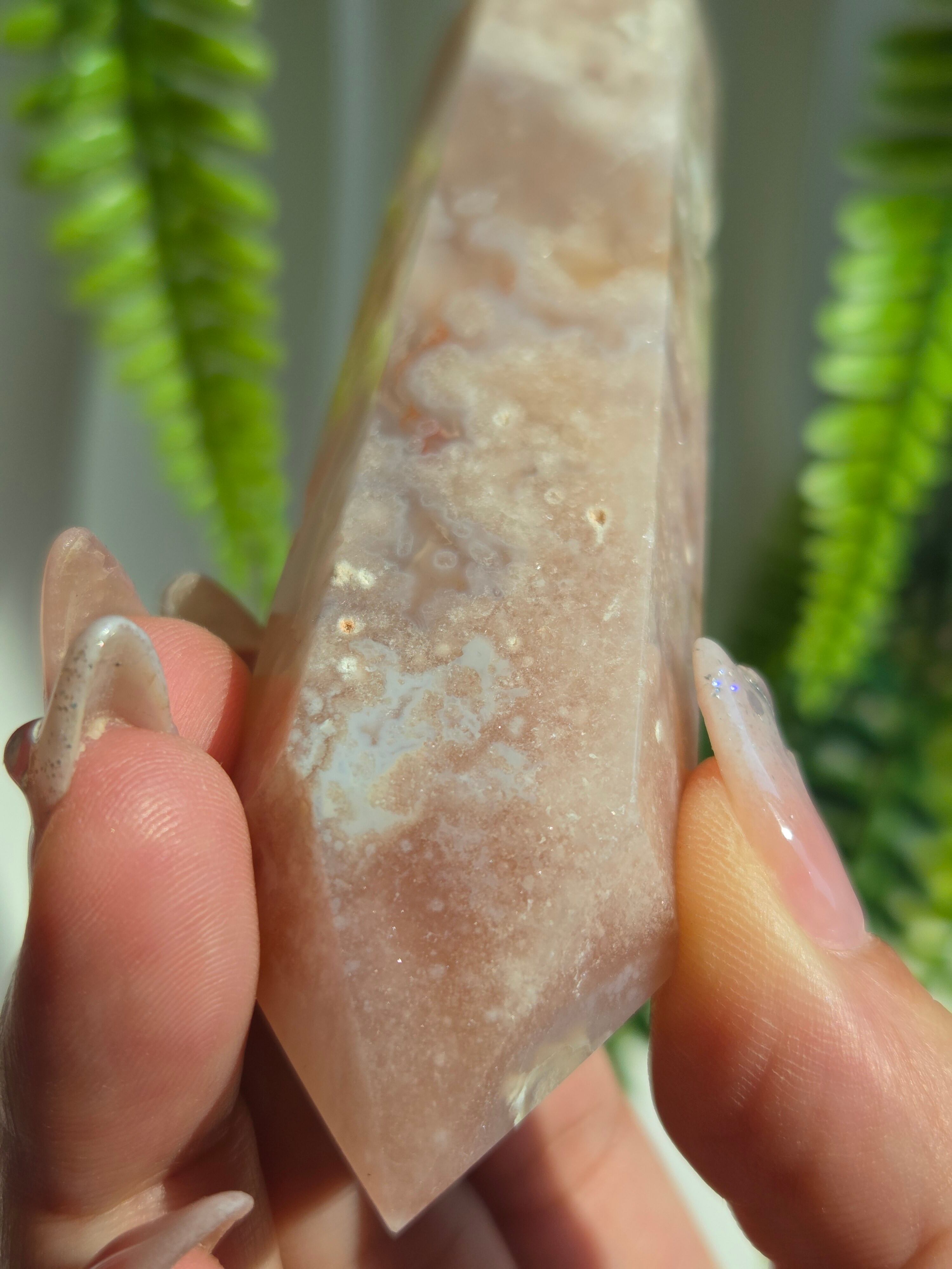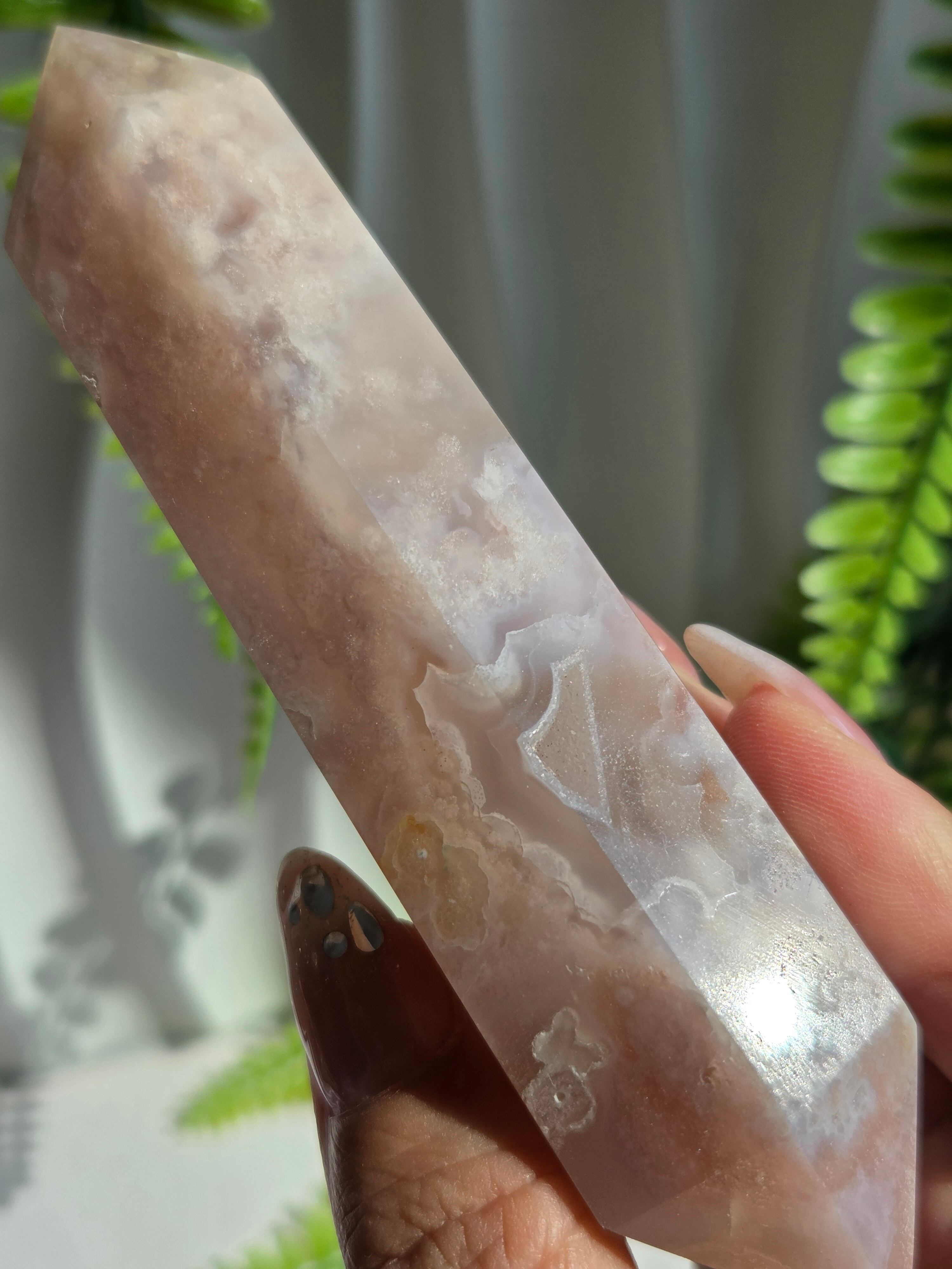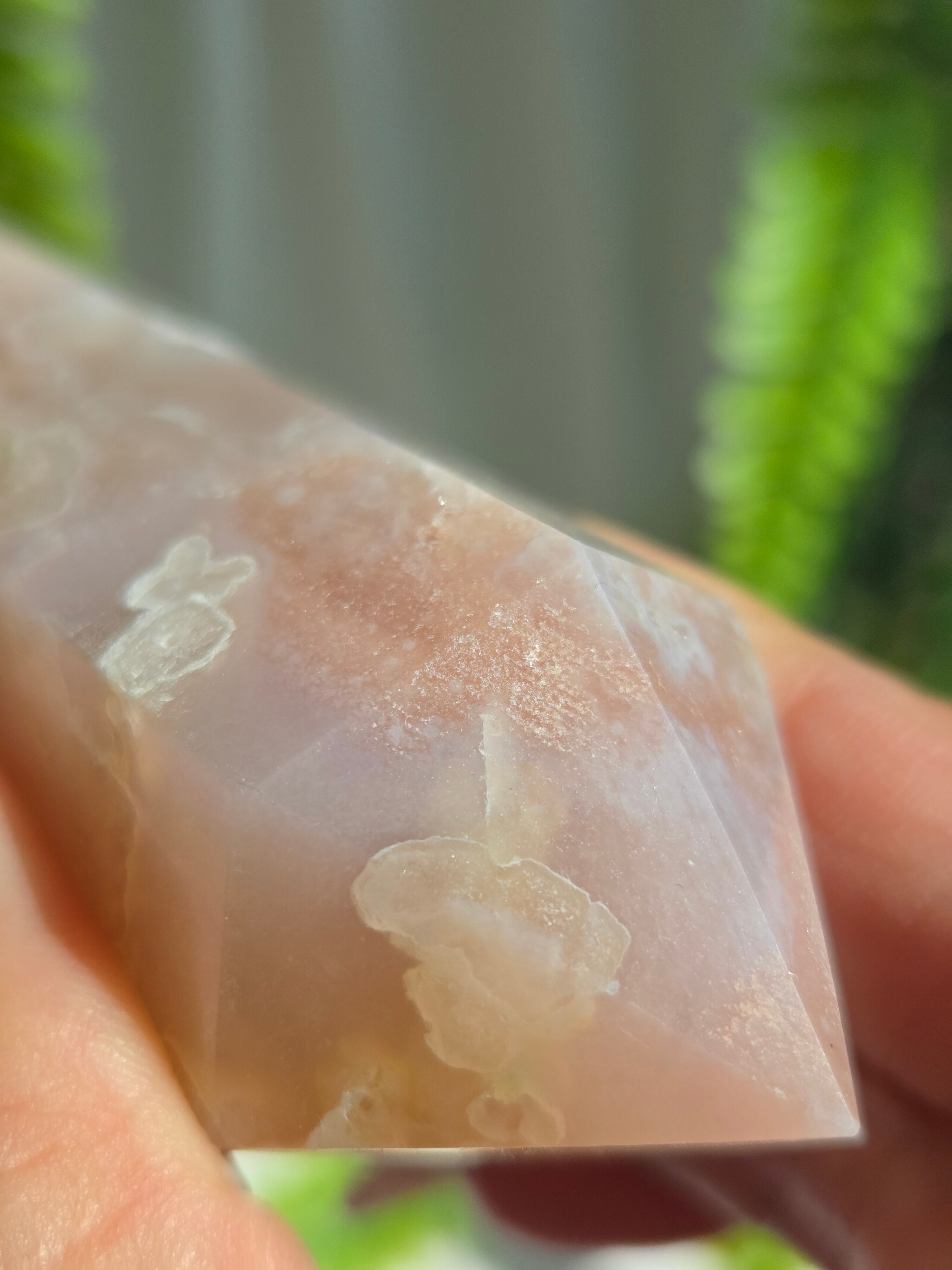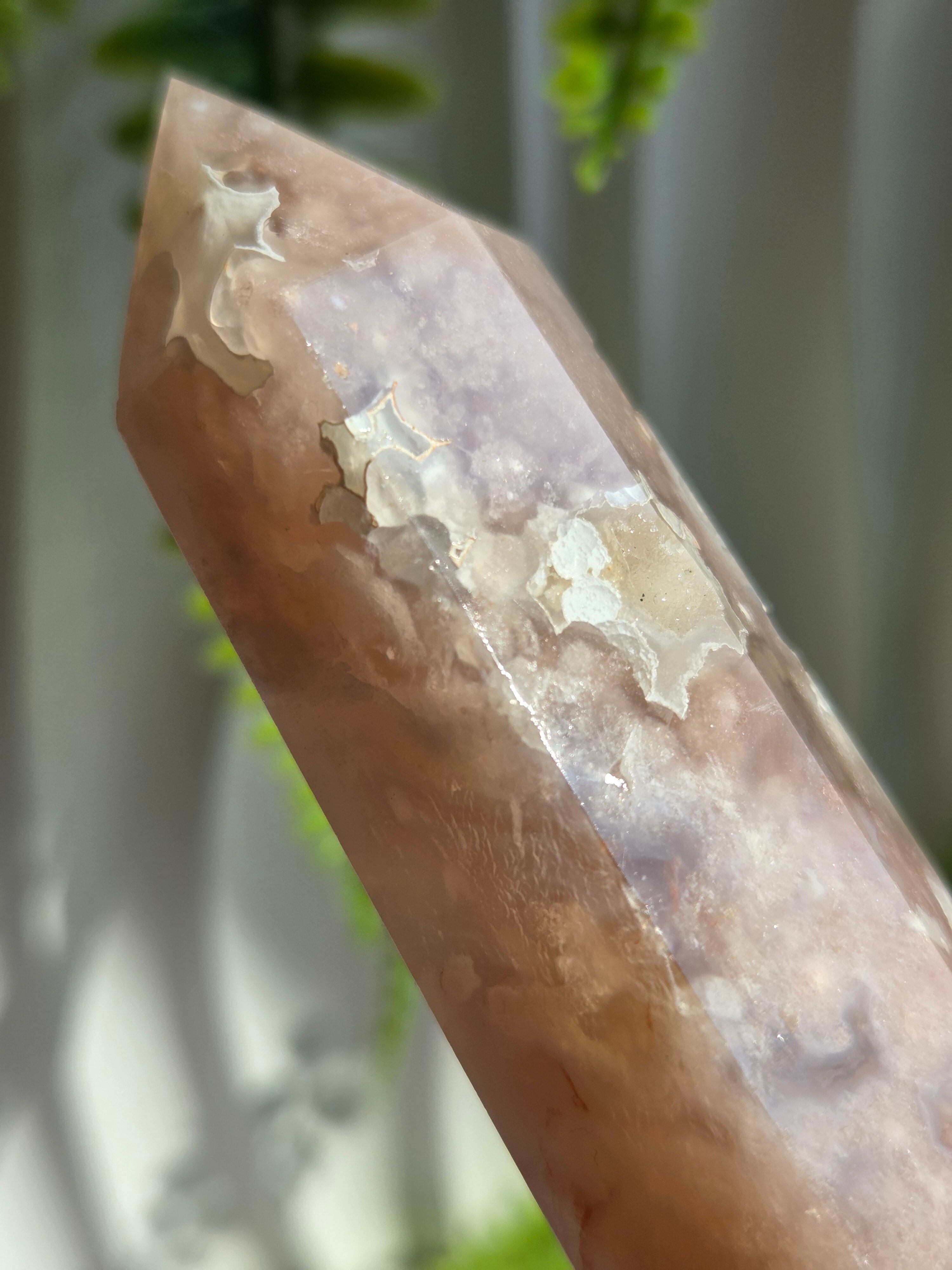 ピンクアメジストに、フラワーアゲートが共生したダブルポイント形