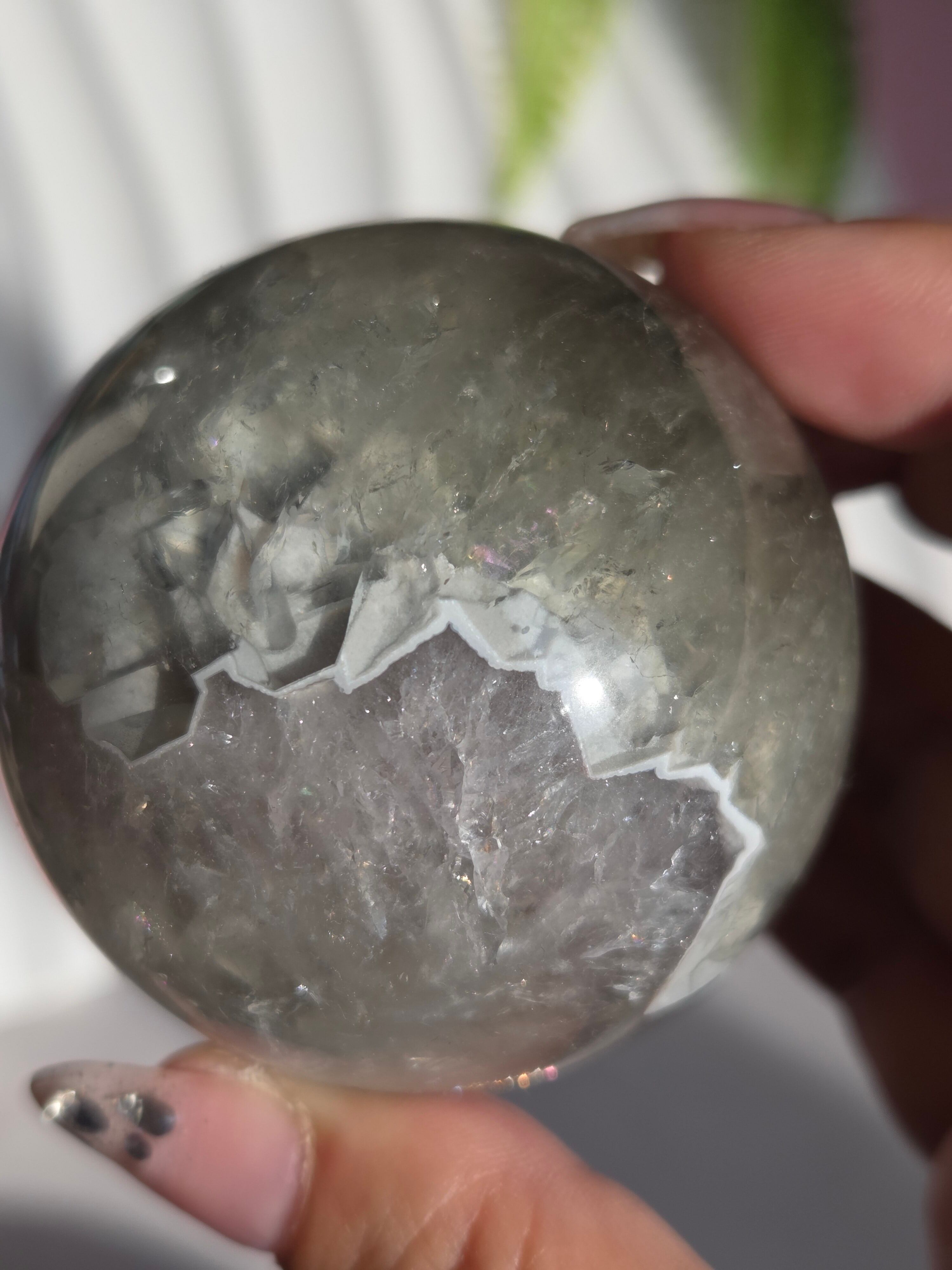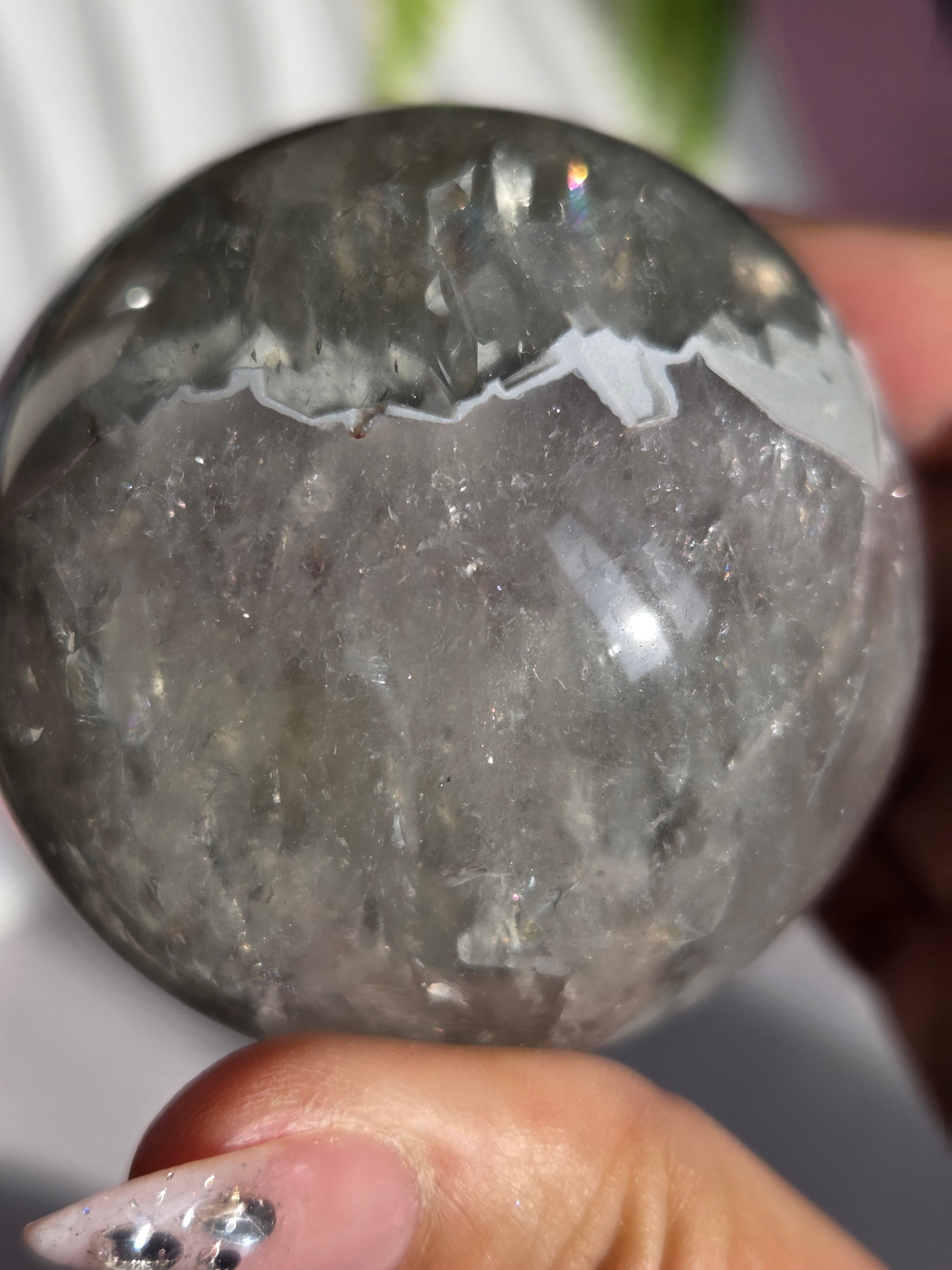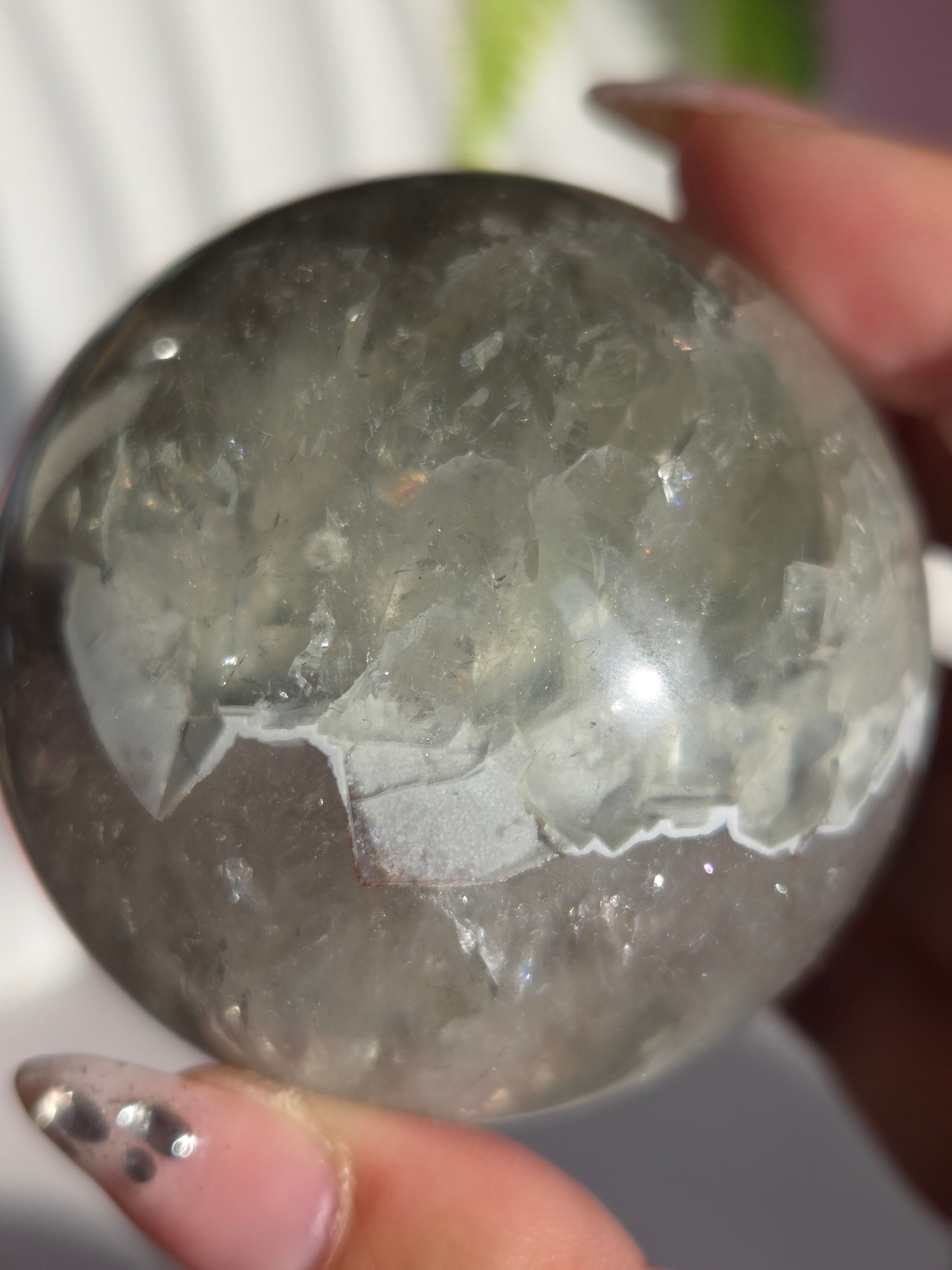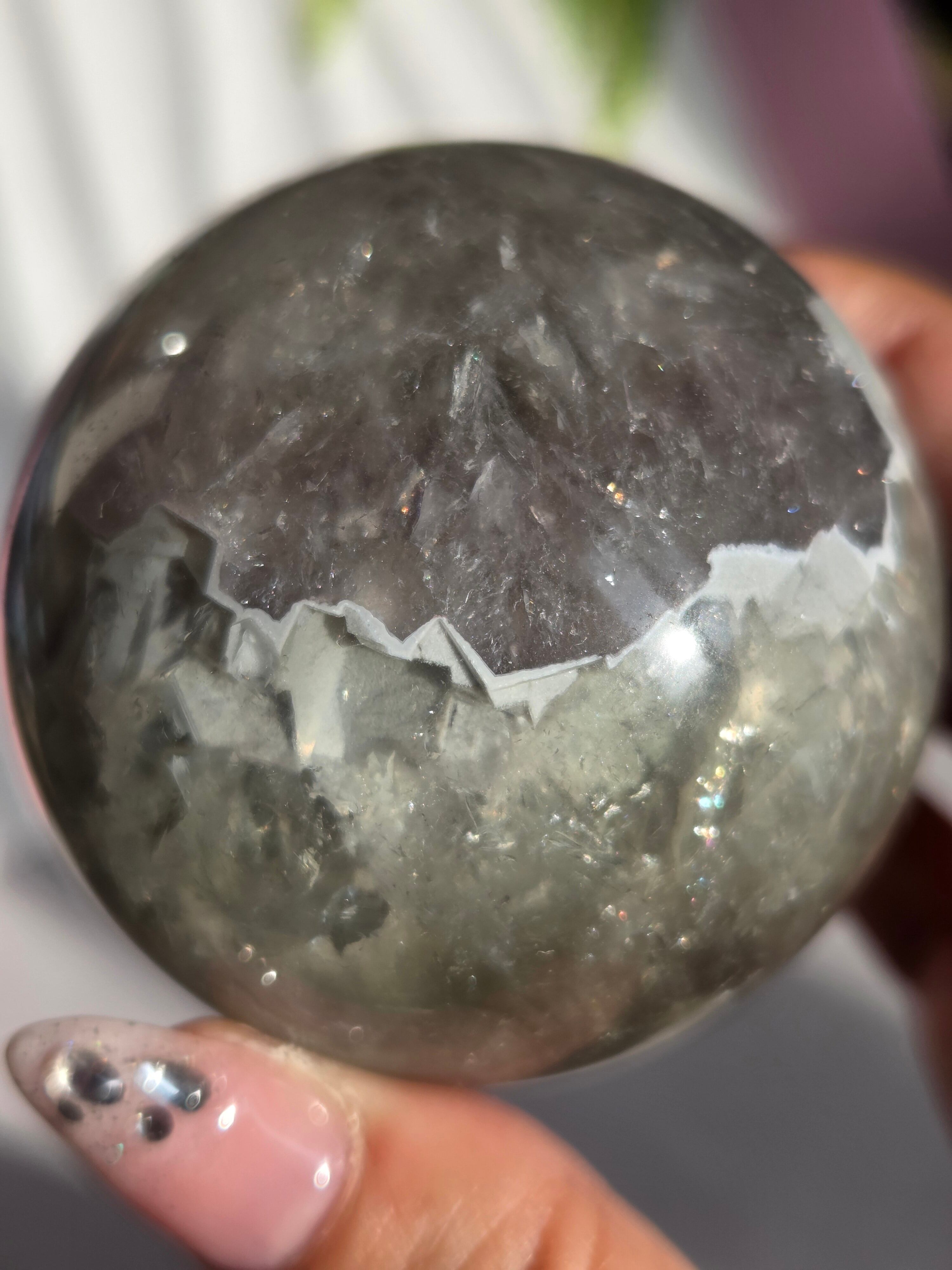 淡いグリーンとパープルの結晶の合間から見える沢山の虹の煌めきが美しいスフィアです。