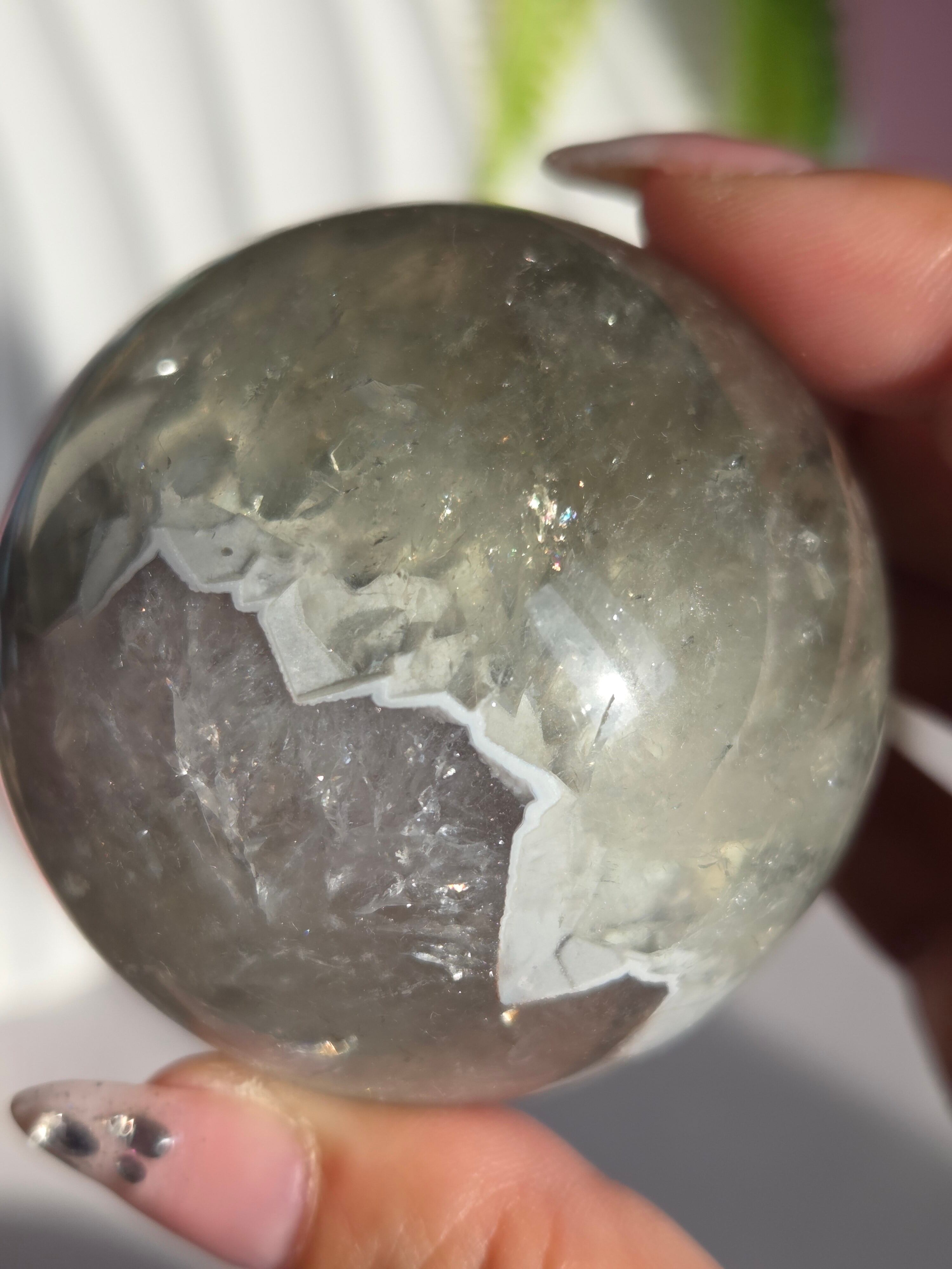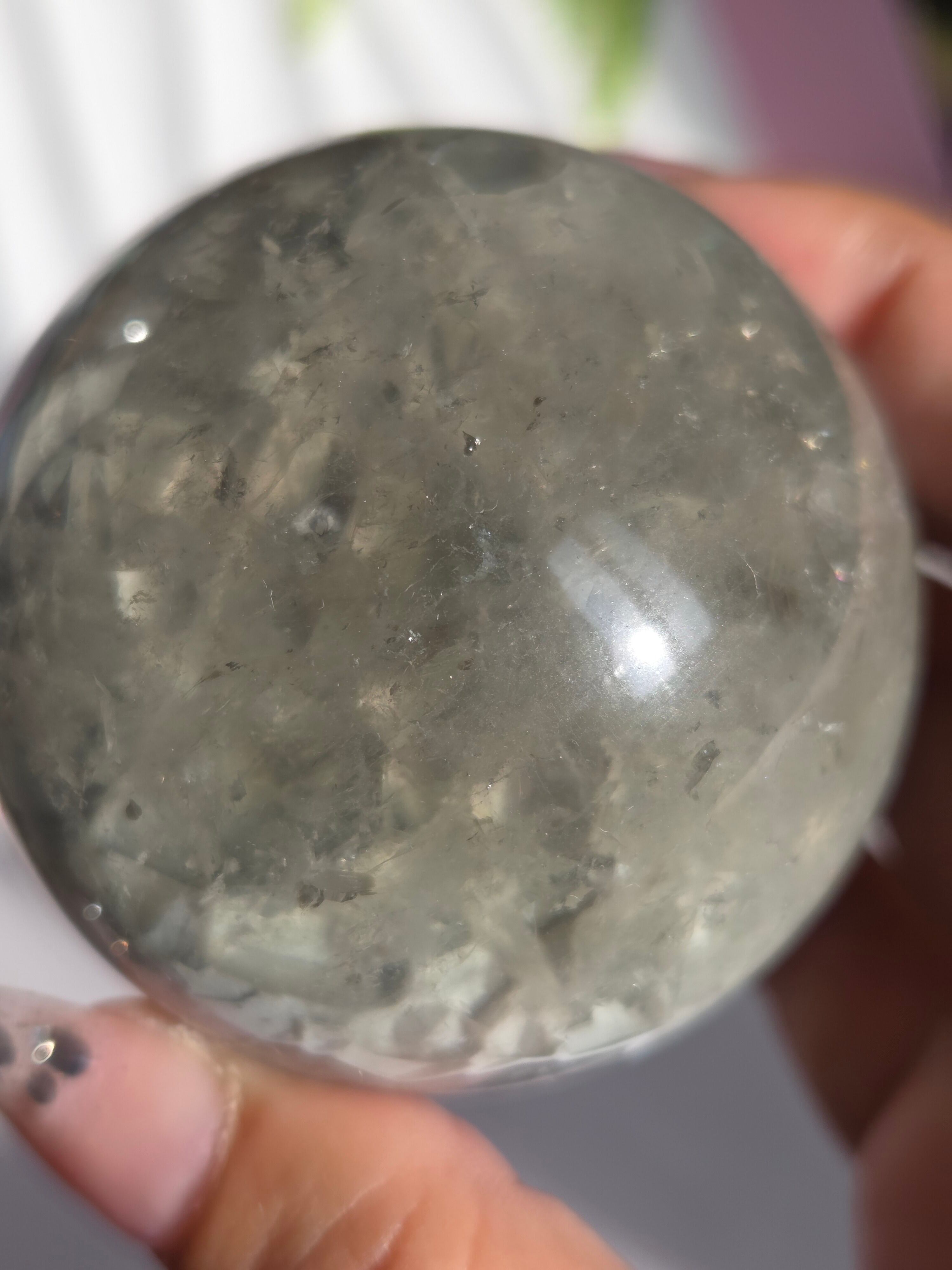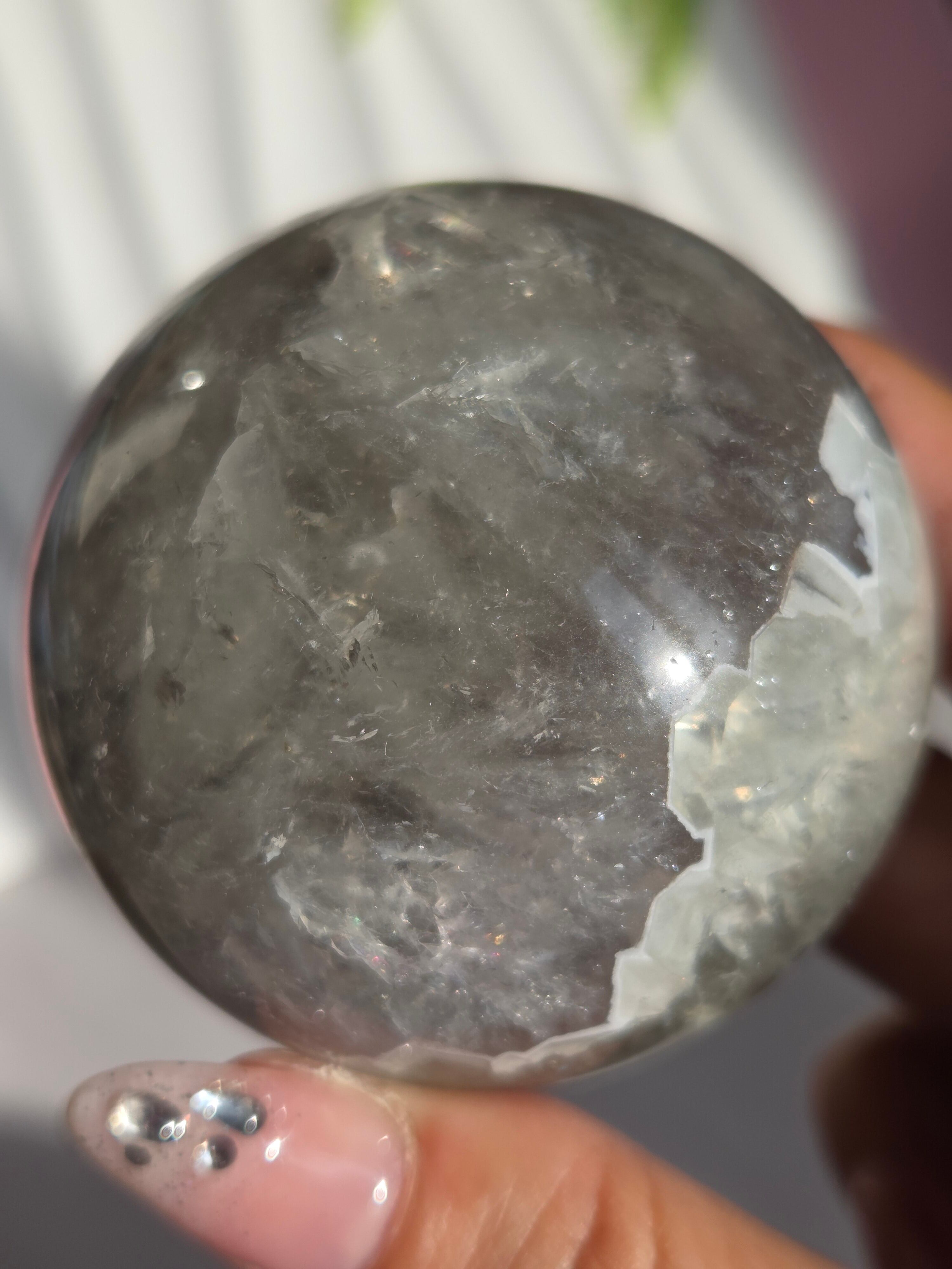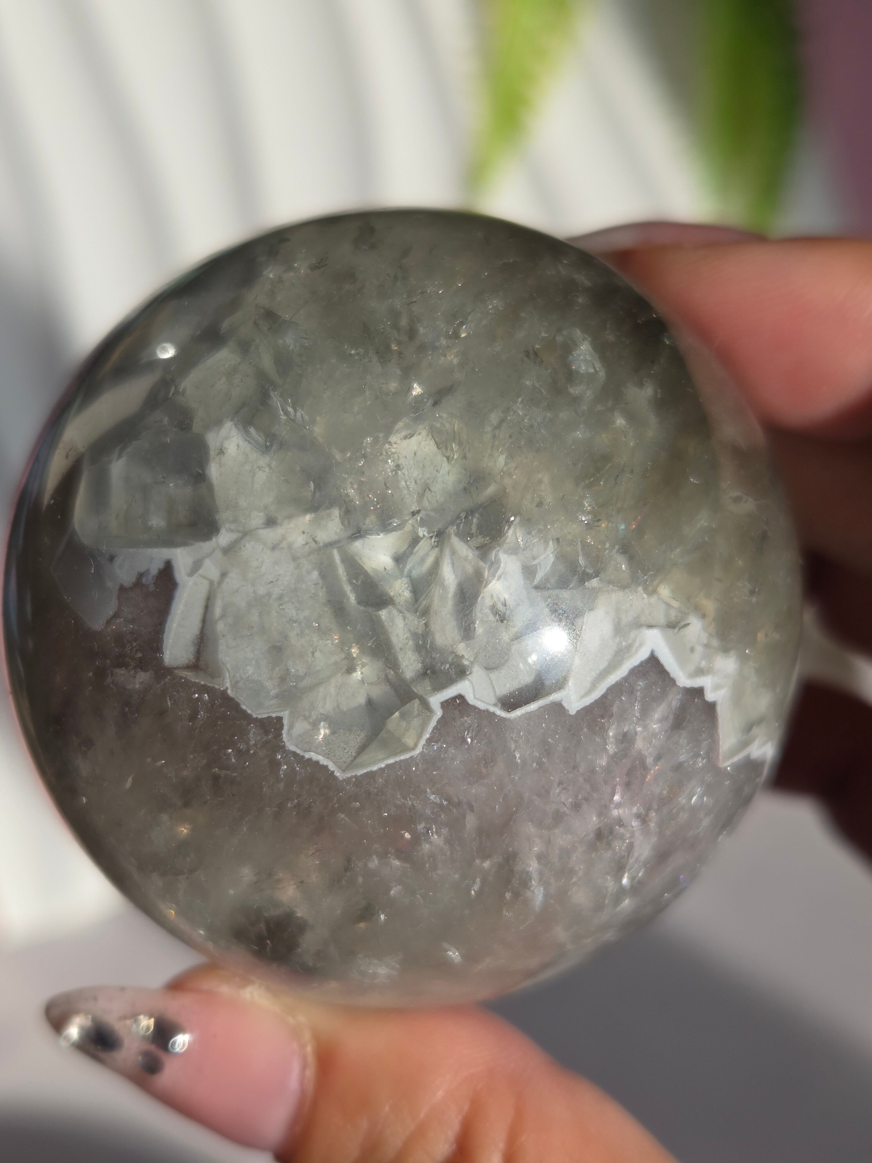 淡いグリーンとパープルの結晶の合間から見える沢山の虹の煌めきが美しいスフィアです。